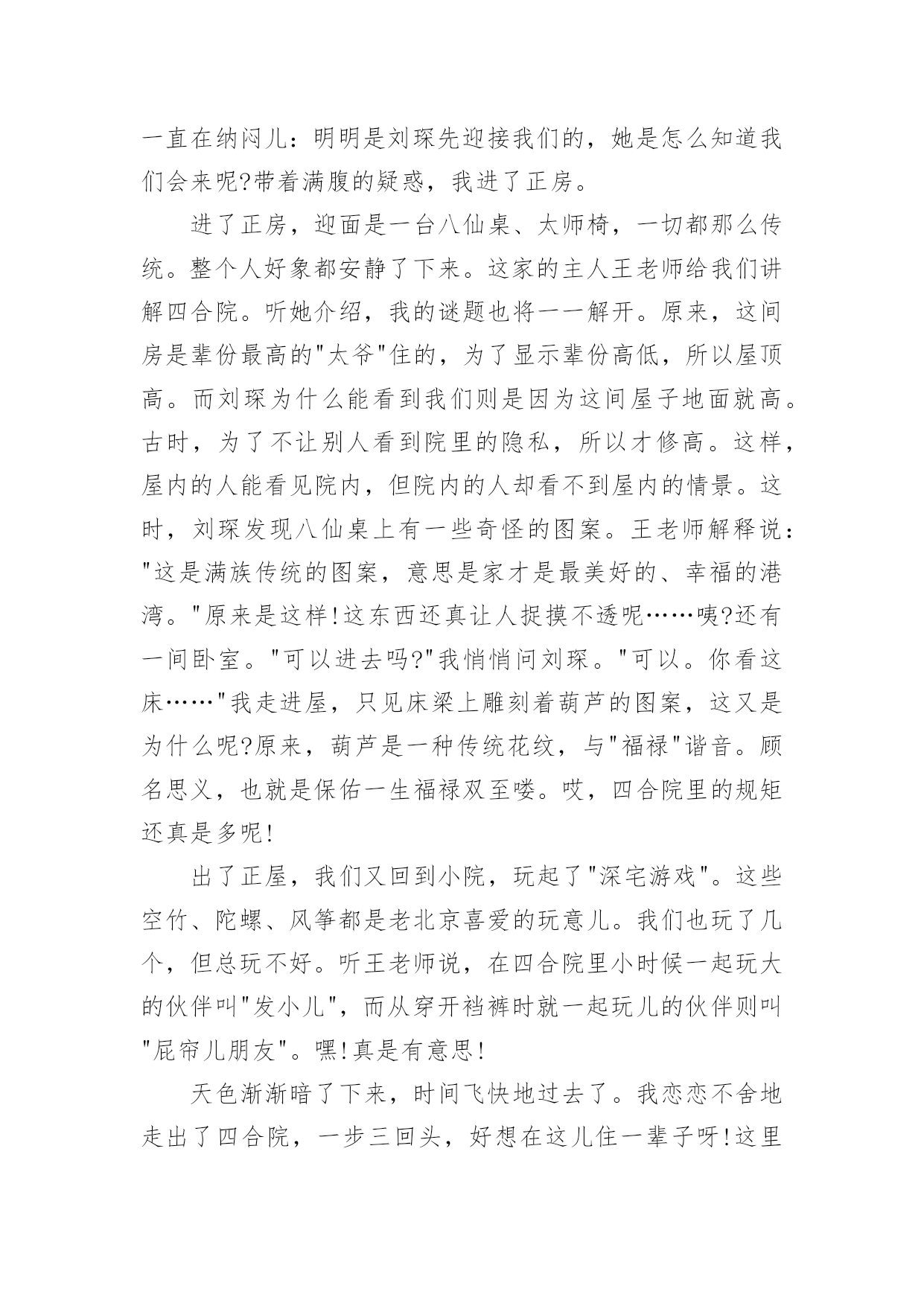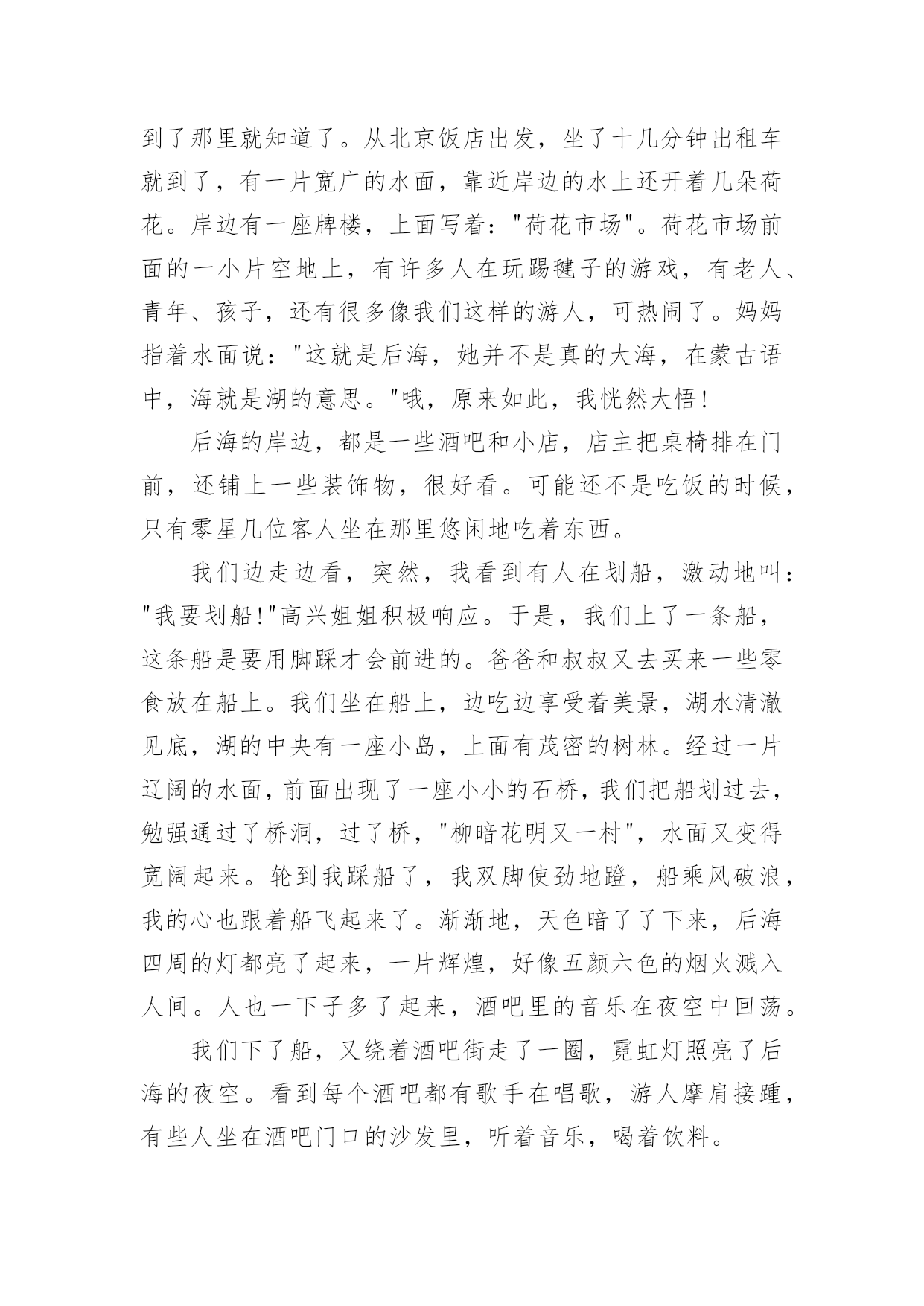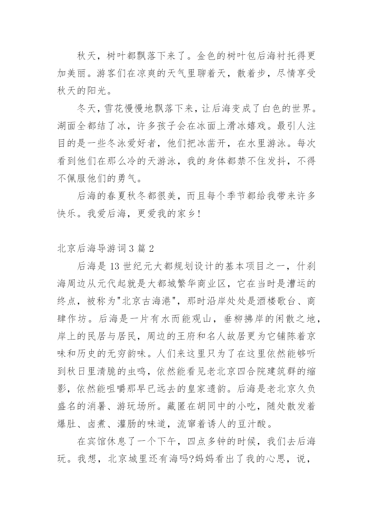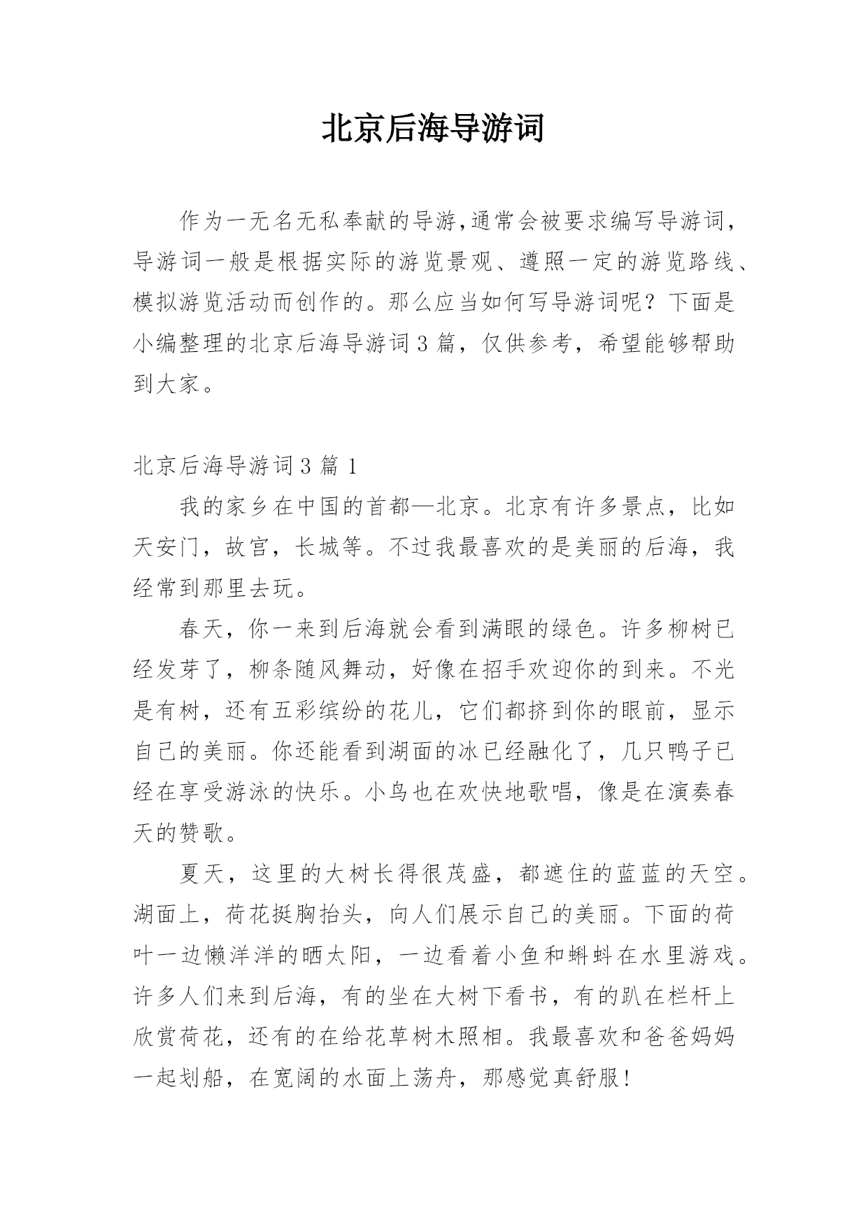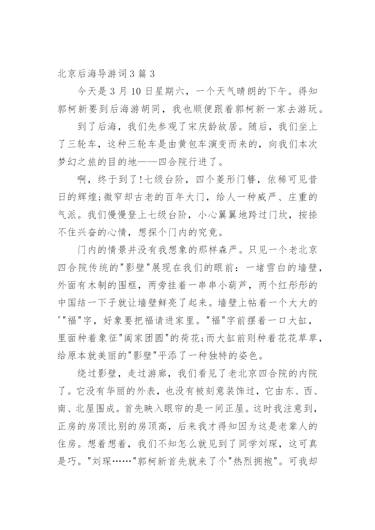 北京后海导游词作为一无名无私奉献的导游,通常会被要求编写导游词,导游词一般是根据实际的游览景观、遵照一定的游览路线、模拟游览活动而创作的。那么应当如何写导游词呢?下面是小编整理的北京后海导游词3篇,仅供参考,希望能够帮助到大家。北京后海导游词3篇1我的家乡在中国的首都—北京。北京有许多景点,比如天安门,故宫,长城等。不过我最喜欢的是美丽的后海,我经常到那里去玩。春天,你一来到后海就会看到满眼的绿色。许多柳树已经发芽了,柳条随风舞动,好像在招手欢迎你的到来。不光是有树,还有五彩缤纷的花儿,它们都挤到你的眼前,显示自己的美丽。你还能看到湖面的冰已经融化了,几只鸭子已经在享受游泳的快乐。小鸟也在欢快地歌唱,像是在演奏春天的赞歌。夏天,这里的大树长得很茂盛,都遮住的蓝蓝的天空。湖面上,荷花挺胸抬头,向人们展示自己的美丽。下面的荷叶一边懒洋洋的晒太阳,一边看着小鱼和蝌蚪在水里游戏。许多人们来到后海,有的坐在大树下看书,有的趴在栏杆上欣赏荷花,还有的在给花草树木照相。我最喜欢和爸爸妈妈一起划船,在宽阔的水面上荡舟,那感觉真舒服!秋天,树叶都飘落下来了。金色的树叶包后海衬托得更加美丽。游客们在凉爽的天气里聊着天,散着步,尽情享受秋天的阳光。冬天,雪花慢慢地飘落下来,让后海变成了白色的世界。湖面全都结了冰,许多孩子会在冰面上滑冰嬉戏。最引人注目的是一些冬泳爱好者,他们把冰凿开,在水里游泳。每次看到他们在那么冷的天游泳,我的身体都禁不住发抖,不得不佩服他们的勇气。后海的春夏秋冬都很美,而且每个季节都给我带来许多快乐。我爱后海,更爱我的家乡!北京后海导游词3篇2后海是13世纪元大都规划设计的基本项目之一,什刹海周边从元代起就是大都城繁华商业区,它在当时是漕运的终点,被称为"北京古海港",那时沿岸处处是酒楼歌台、商肆作坊。后海是一片有水而能观山,垂柳拂岸的闲散之地,岸上的民居与居民,周边的王府和名人故居更为它铺陈着京味和历史的无穷韵味。人们来这里只为了在这里依然能够听到秋日里清脆的虫鸣,依然能看见老北京四合院建筑群的缩影,依然能咀嚼那早已远去的皇家遗韵。后海是老北京久负盛名的消暑、游玩场所。藏匿在胡同中的小吃,随处散发着爆肚、卤煮、灌肠的味道,流窜着诱人的豆汁酸。在宾馆休息了一个下午,四点多钟的时候,我们去后海玩。我想,北京城里还有海吗?妈妈看出了我的心思,说,到了那里就知道了。从北京饭店出发,坐了十几分钟出租车就到了,有一片宽广的水面,靠近岸边的水上还开着几朵荷花。岸边有一座牌楼,上面写着:"荷花市场"。荷花市场前面的一小片空地上,有许多人在玩踢毽子的游戏,有老人、青年、孩子,还有很多像我们这样的游人,可热闹了。妈妈指着水面说:"这就是后海,她并不是真的大海,在蒙古语中,海就是湖的意思。"哦,原来如此,我恍然大悟!后海的岸边,都是一些酒吧和小店,店主把桌椅排在门前,还铺上一些装饰物,很好看。可能还不是吃饭的时候,只有零星几位客人坐在那里悠闲地吃着东西。我们边走边看,突然,我看到有人在划船,激动地叫:"我要划船!"高兴姐姐积极响应。于是,我们上了一条船,这条船是要用脚踩才会前进的。爸爸和叔叔又去买来一些零食放在船上。我们坐在船上,边吃边享受着美景,湖水清澈见底,湖的中央有一座小岛,上面有茂密的树林。经过一片辽阔的水面,前面出现了一座小小的石桥,我们把船划过去,勉强通过了桥洞,过了桥,"柳暗花明又一村",水面又变得宽阔起来。轮到我踩船了,我双脚使劲地蹬,船乘风破浪,我的心也跟着船飞起来了。渐渐地,天色暗了了下来,后海四周的灯都亮了起来,一片辉煌,好像五颜六色的烟火溅入人间。人也一下子多了起来,酒吧里的音乐在夜空中回荡。我们下了船,又绕着酒吧街走了一圈,霓虹灯照亮了后海的夜空。看到每个酒吧都有歌手在唱歌,游人摩肩接踵,有些人坐在酒吧门口的沙发里,听着音乐,喝着饮料。北京后海导游词3篇3今天是3月10日星期六,一个天气晴朗的下午。得知郭柯新要到后海游胡同,我也顺便跟着郭柯新一家去游玩。到了后海,我们先参观了宋庆龄故居。随后,我们坐上了三轮车,这种三轮车是由黄包车演变而来的,向我们本次梦幻之旅的目的地——四合院行进了。啊,终于到了!七级台阶,四个菱形门簪,依稀可见昔日的辉煌;微窄却古老的百年大门,给人一种威严、庄重的气派。我们慢慢登上七级台阶,小心翼翼地跨过门坎,按捺不住兴奋的心情,想探个门内的究竟。门内的情景并没有我想象的那样森严。只见一个老北京四合院传统的"影壁"展现在我们的眼前:一堵雪白的墙壁,外面有木制的围框,两旁挂着一串串小葫芦,两个红彤彤的中国结一下子就让墙壁鲜亮了起来。墙壁上帖着一个大大的'"福"字,好象要把福请进家里。"福"字前摆着一口大缸,里面种着象征"阖家团圆"的荷花;而大缸前则种着花花草草,给原本就美丽的"影壁"平添了一种独特的姿
