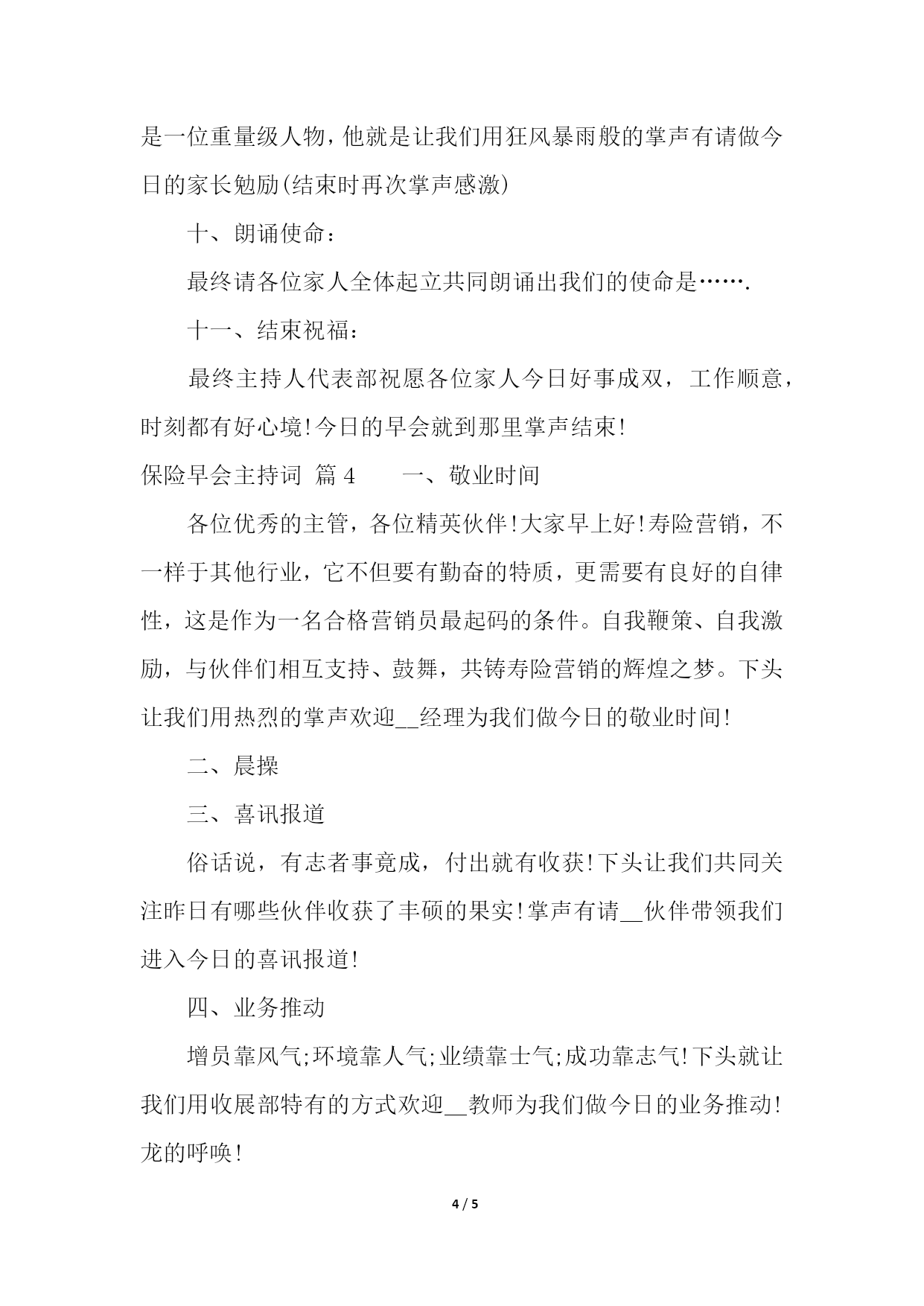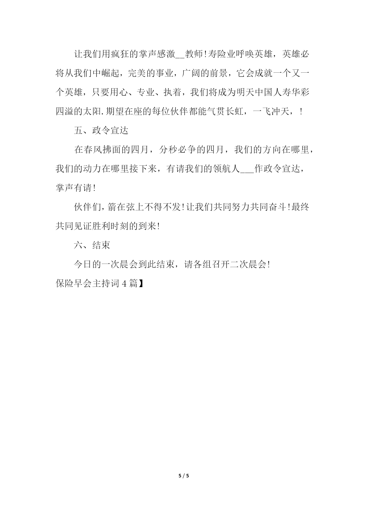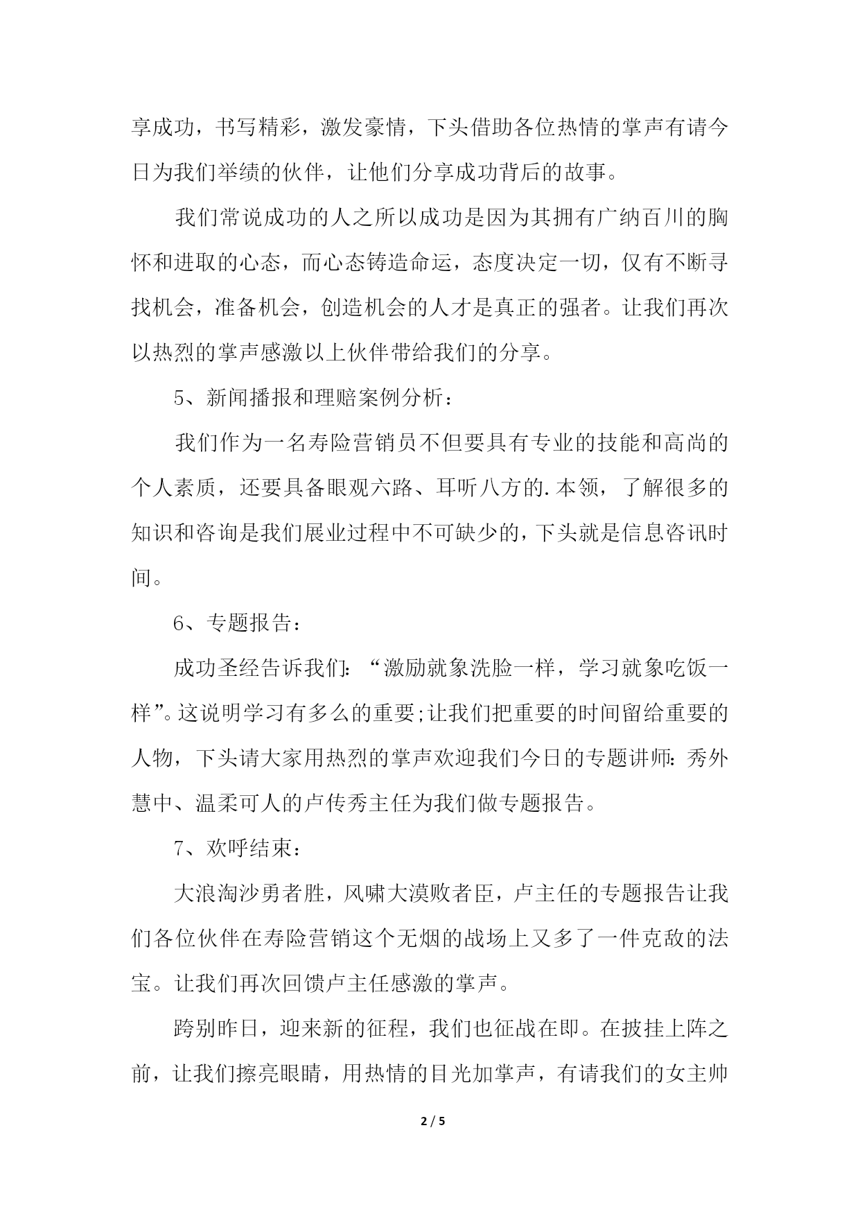 PAGE5/NUMPAGES5保险早会主持词4篇保险早会主持词篇11、开场白:尊敬的杨经理、各位尊贵的嘉宾以及各位优秀的同仁,大家早上好!十分荣幸能有这个机会与大家共度一个完美的早晨。首先让我们用热烈的掌声对各位尊贵嘉宾的到来表示热烈欢迎与诚挚的谢意。欢迎你们的到来!新的一天要有新的开始,也要有新的收获,让我们用饱满的活力迎接新的一天。2、考勤:让我们再次为正常出勤的自我掌声鼓励!3、手语舞:一年之际在于春,一天之际在于晨,一天中坚持一个良好的心态,愉悦的心境,对于我们大家来说十分重要。营销工作是重复而又充满压力的,所以,我们经常提倡欢乐营销,精彩生活。那么今日的简便时刻就要来临,让我们用全身心的欢乐来体验。下头的简便节拍将由我们部门的美女舞蹈队带出,有请美女们闪亮登场。一曲晨操不仅仅让我们的血液得到充足的氧气,更是我们彼此之间友谊和欢乐的传递。4、业绩分享:伙伴们,在寿险这个舞台上,让我们每个人都展现自我,分享成功,书写精彩,激发豪情,下头借助各位热情的掌声有请今日为我们举绩的伙伴,让他们分享成功背后的故事。我们常说成功的人之所以成功是因为其拥有广纳百川的胸怀和进取的心态,而心态铸造命运,态度决定一切,仅有不断寻找机会,准备机会,创造机会的人才是真正的强者。让我们再次以热烈的掌声感激以上伙伴带给我们的分享。5、新闻播报和理赔案例分析:我们作为一名寿险营销员不但要具有专业的技能和高尚的个人素质,还要具备眼观六路、耳听八方的.本领,了解很多的知识和咨询是我们展业过程中不可缺少的,下头就是信息咨讯时间。6、专题报告:成功圣经告诉我们:“激励就象洗脸一样,学习就象吃饭一样”。这说明学习有多么的重要;让我们把重要的时间留给重要的人物,下头请大家用热烈的掌声欢迎我们今日的专题讲师:秀外慧中、温柔可人的卢传秀主任为我们做专题报告。7、欢呼结束:大浪淘沙勇者胜,风啸大漠败者臣,卢主任的专题报告让我们各位伙伴在寿险营销这个无烟的战场上又多了一件克敌的法宝。让我们再次回馈卢主任感激的掌声。跨别昨日,迎来新的征程,我们也征战在即。在披挂上阵之前,让我们擦亮眼睛,用热情的目光加掌声,有请我们的女主帅杨芳经理带来出征前的政令宣导。保险早会主持词篇2首先在这个阳光明媚,生机昂然的早晨给亲爱的爱是一种体会,即使心碎也会觉得甜蜜;爱是一种经历,即使破碎也会觉得美丽。一声问候送来温馨甜蜜,一个拥抱能让你我心灵相犀。接下来就请各位全体起立,给对方一个拥抱,来表达我们爱的甜蜜。五、热舞:舞者相聚,活力延续。请上台.让我们共同热舞一曲(结束后)请台上的舞林高手回坐,来!各位家人们,给自我优美的舞姿热烈掌声鼓励一下。六、新闻播报:家事国事天下事,事事关心。接下来有请做今日的新闻播报。掌声感激精彩的播报(结束时再次掌声感激)七、每日英语:想走出国门,就必须要有一口流利的英语。知识经济的到来供给了我们语言交流的保证。接下来又是每日英语的时间让我们掌声有请(结束时再次掌声感激)八、文件宣读:重要的事必须是在重要的场合来安排,接下来有请做今日的文件宣读。(结束时再次掌声感激)九、家长勉励:制热震撼,精彩不断,光芒四射,魅力无限。接下来请出的是一位重量级人物,他就是让我们用狂风暴雨般的掌声有请做今日的家长勉励(结束时再次掌声感激)十、朗诵使命:最终请各位家人全体起立共同朗诵出我们的使命是…….十一、结束祝福:最终主持人代表部祝愿各位家人今日好事成双,工作顺意,时刻都有好心境!今日的早会就到那里掌声结束!保险早会主持词篇4一、敬业时间各位优秀的主管,各位精英伙伴!大家早上好!寿险营销,不一样于其他行业,它不但要有勤奋的特质,更需要有良好的自律性,这是作为一名合格营销员最起码的条件。自我鞭策、自我激励,与伙伴们相互支持、鼓舞,共铸寿险营销的辉煌之梦。下头让我们用热烈的掌声欢迎__经理为我们做今日的敬业时间!二、晨操三、喜讯报道俗话说,有志者事竟成,付出就有收获!下头让我们共同关注昨日有哪些伙伴收获了丰硕的果实!掌声有请__伙伴带领我们进入今日的喜讯报道!四、业务推动增员靠风气;环境靠人气;业绩靠士气;成功靠志气!下头就让我们用收展部特有的方式欢迎__教师为我们做今日的业务推动!龙的呼唤!让我们用疯狂的掌声感激__教师!寿险业呼唤英雄,英雄必将从我们中崛起,完美的事业,广阔的前景,它会成就一个又一个英雄,只要用心、专业、执着,我们将成为明天中国人寿华彩四溢的太阳.期望在座的每位伙伴都能气贯长虹,一飞冲天,!五、政令宣达在春风拂面的四月,分秒必争的四月,我们的方向在哪里,我们的动力在哪里接下来,有请我们的领航人___作政令宣达,掌声有请!伙伴们,箭在弦上不得不发!让我们共同努力共同奋斗!最终共同见证胜利时刻的到来!六、结束今日的一次晨会到此结束,请各组召开二次晨会