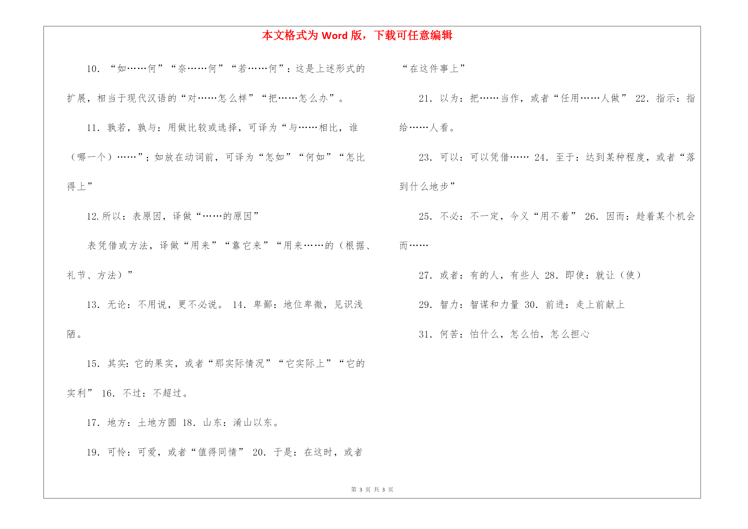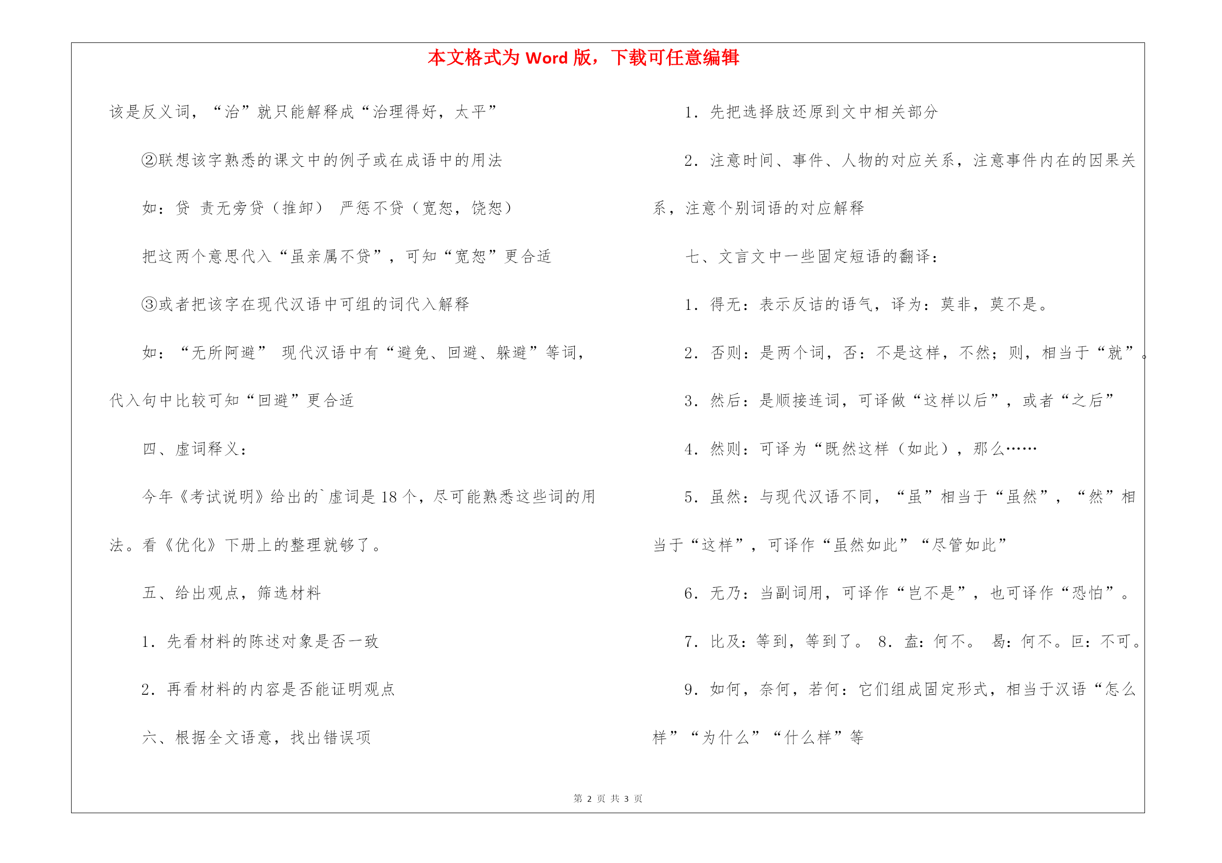 本文格式为Word版,下载可任意编辑第PAGE\*MERGEFORMAT3页共NUMPAGES\*MERGEFORMAT3页高考语文古文阅读复习高考语文古文阅读复习古文阅读一、文言文关键在整体阅读,一般阅读顺序是这样的:1.先仔细看一遍原文,目的是了解一下全文写的内容。现在的全国题大都围绕人物展开情节,以选记叙性的文字为主。2.第二步是浏览一下最后概括全文的判断题。因为此题一般要求选出错误的一项,且都是细小的问题。这样读了以后,对全文内容的把握就心中有数了。3.第三步,再去读原文,然后逐个做题。因为对全文理解得越透彻,做题的准确率就越高,做题的速度也越快。(当然这要结合自己的做题习惯)二、现在,文言文的命题思路有这样一些变化:1.离教材越来越近。文言虚词的考题大都引用教材的例子,所以熟悉一下古文的基本篇目还是有用的。2.对全文整体认知的考查越来越具体。考查对事情来龙去脉的理解与把握,考查观点认识的提炼等。三、实词的考查:1.把意思代入原句,看词性与意思是否解释得通,如果还不能排除,再把它还原到原文,看具体语境。2.实词释义方法:①文言文句子结构整齐,讲求对仗,可以利用这一结构特点推知词义。(相近或相反)如:忠不必用兮,贤不必以“以”对应“用”,所以它可以解释成“被任用”“人穷则反本,故劳苦倦极”“劳苦”同义,所以“倦极”也同义,“极”就是“疲惫”的意思“每读书至治乱得失”“得失”是反义词,所以“治乱”也应该是反义词,“治”就只能解释成“治理得好,太平”②联想该字熟悉的课文中的例子或在成语中的用法如:贷责无旁贷(推卸)严惩不贷(宽恕,饶恕)把这两个意思代入“虽亲属不贷”,可知“宽恕”更合适③或者把该字在现代汉语中可组的词代入解释如:“无所阿避”现代汉语中有“避免、回避、躲避”等词,代入句中比较可知“回避”更合适四、虚词释义:今年《考试说明》给出的`虚词是18个,尽可能熟悉这些词的用法。看《优化》下册上的整理就够了。五、给出观点,筛选材料1.先看材料的陈述对象是否一致2.再看材料的内容是否能证明观点六、根据全文语意,找出错误项1.先把选择肢还原到文中相关部分2.注意时间、事件、人物的对应关系,注意事件内在的因果关系,注意个别词语的对应解释七、文言文中一些固定短语的翻译:1.得无:表示反诘的语气,译为:莫非,莫不是。2.否则:是两个词,否:不是这样,不然;则,相当于“就”。3.然后:是顺接连词,可译做“这样以后”,或者“之后”4.然则:可译为“既然这样(如此),那么……5.虽然:与现代汉语不同,“虽”相当于“虽然”,“然”相当于“这样”,可译作“虽然如此”“尽管如此”6.无乃:当副词用,可译作“岂不是”,也可译作“恐怕”。7.比及:等到,等到了。8.盍:何不。曷:何不。叵:不可。9.如何,奈何,若何:它们组成固定形式,相当于汉语“怎么样”“为什么”“什么样”等10.“如……何”“奈……何”“若……何”:这是上述形式的扩展,相当于现代汉语的“对……怎么样”“把……怎么办”。11.孰若,孰与:用做比较或选择,可译为“与……相比,谁(哪一个)……”;如放在动词前,可译为“怎如”“何如”“怎比得上”12.所以:表原因,译做“……的原因”表凭借或方法,译做“用来”“靠它来”“用来……的(根据、礼节、方法)”13.无论:不用说,更不必说。14.卑鄙:地位卑微,见识浅陋。15.其实:它的果实,或者“那实际情况”“它实际上”“它的实利”16.不过:不超过。17.地方:土地方圆18.山东:淆山以东。19.可怜:可爱,或者“值得同情”20.于是:在这时,或者“在这件事上”21.以为:把……当作,或者“任用……人做”22.指示:指给……人看。23.可以:可以凭借……24.至于:达到某种程度,或者“落到什么地步”25.不必:不一定,今义“用不着”26.因而:趁着某个机会而……27.或者:有的人,有些人28.即使:就让(使)29.智力:智谋和力量30.前进:走上前献上31.何苦:怕什么,怎么怕,怎么担心