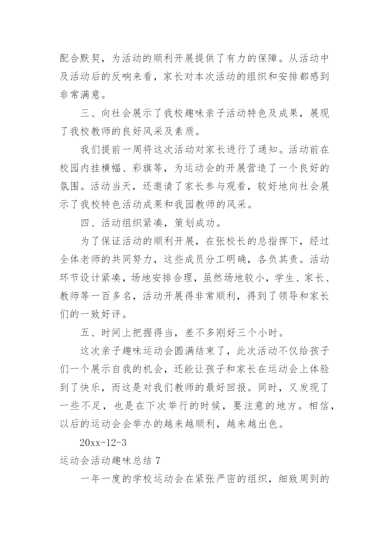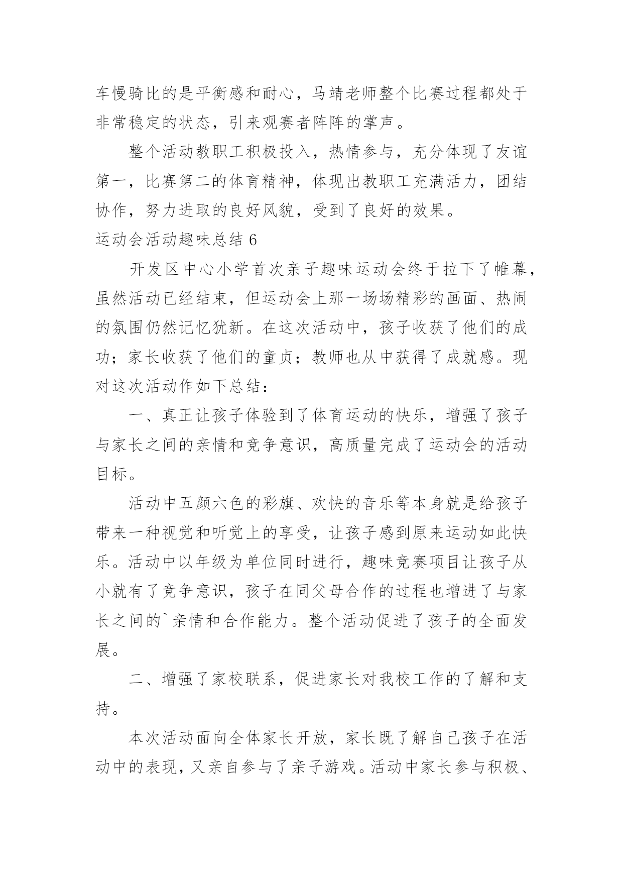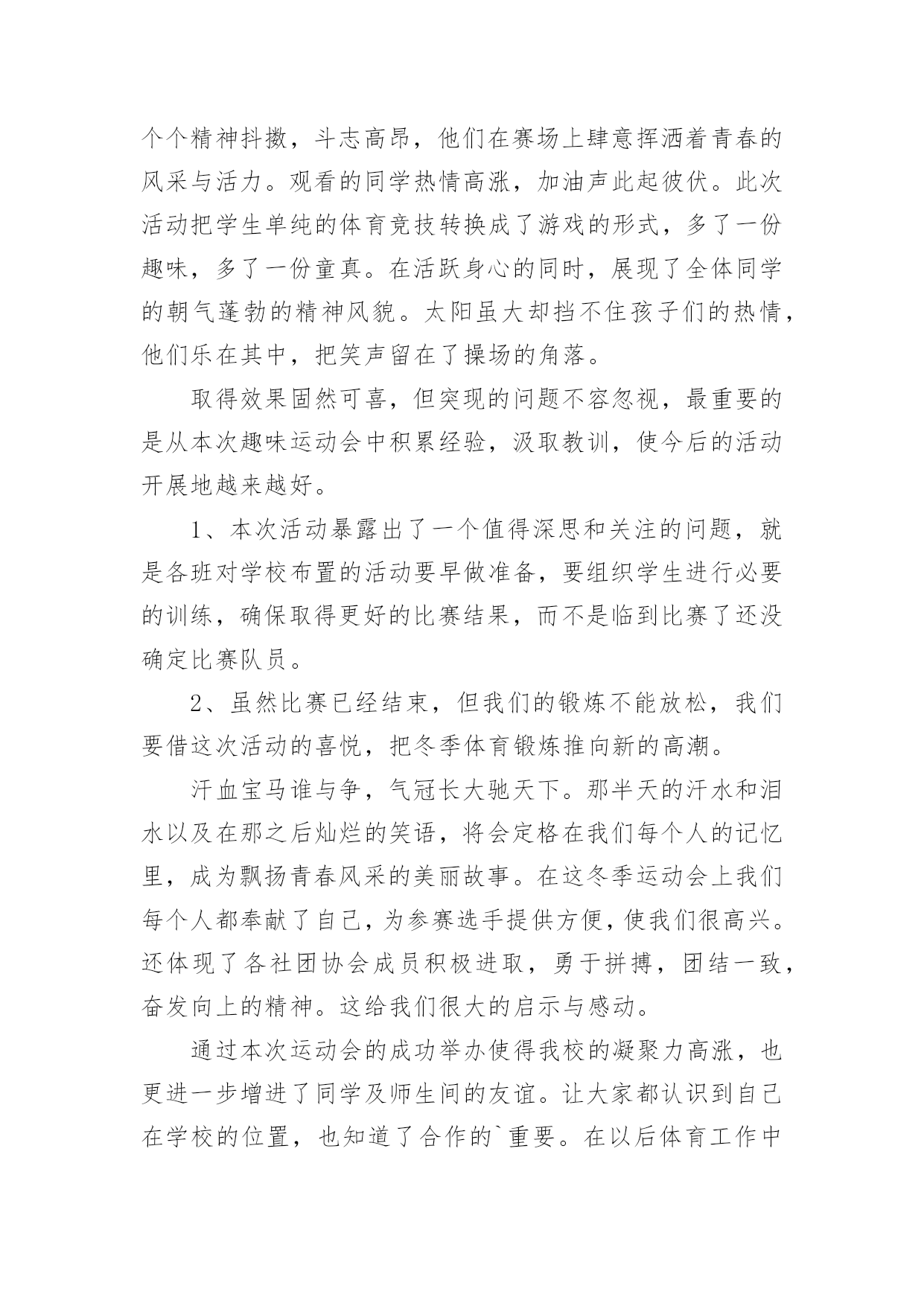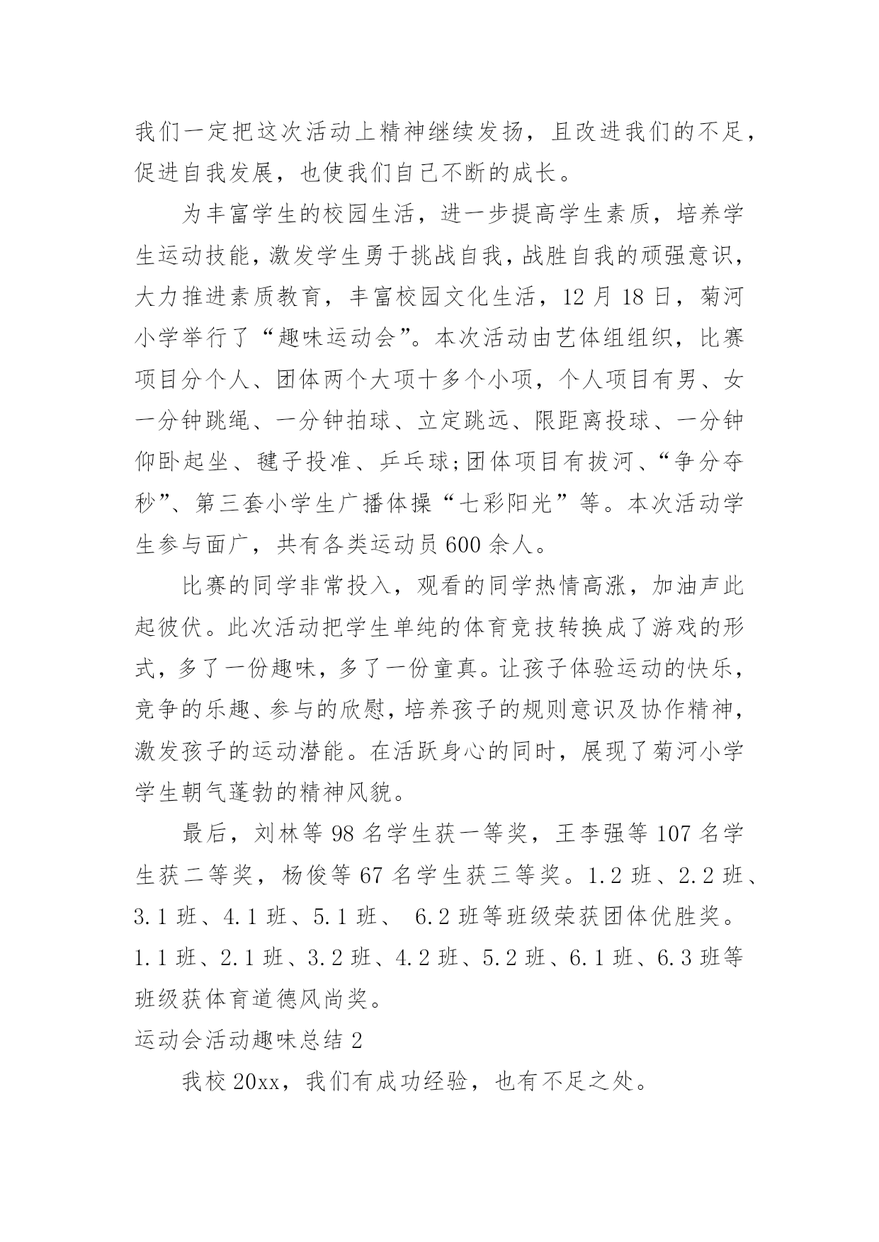 运动会活动趣味总结运动会活动趣味总结总结在一个时期、一个年度、一个阶段对学习和工作生活等情况加以回顾和分析的一种书面材料,它可以提升我们发现问题的能力,快快来写一份总结吧。你想知道总结怎么写吗?以下是小编整理的运动会活动趣味总结,希望对大家有所帮助。运动会活动趣味总结1为了丰富同学们的课余活动,增强同学们的班集体荣誉感及同学们之间的团结互助精神,同时为提高我院同学间的凝聚力,强健同学们的体魄,提升同学们的体育运动的热情,让同学们在寒冷的冬季享受到更多的乐趣,黄田农场学校在校领导的大力支持下,举办了冬季趣味运动会。此次运动会延续了以往的趣味性,删除了一些安全性较差的项目后,新添加了小型保龄球的比赛项目。运动会有50米往返障碍接力赛、持轻物掷准、小型保龄球等团体比赛项目。在比赛中同学们积极参加,由于比赛项目比较集中很多同学出现了个人项目与团体项目相冲突的现象,在这种情况下同学们毅然放弃个人荣誉投身于团体比赛中,为班级贡献出自己的力量。从总体上看,本次趣味运动会是成功,也基本达到了预期效果。大部分孩子参与其中。参赛的队员和裁判员老师们个个精神抖擞,斗志高昂,他们在赛场上肆意挥洒着青春的风采与活力。观看的同学热情高涨,加油声此起彼伏。此次活动把学生单纯的体育竞技转换成了游戏的形式,多了一份趣味,多了一份童真。在活跃身心的同时,展现了全体同学的朝气蓬勃的精神风貌。太阳虽大却挡不住孩子们的热情,他们乐在其中,把笑声留在了操场的角落。取得效果固然可喜,但突现的问题不容忽视,最重要的是从本次趣味运动会中积累经验,汲取教训,使今后的活动开展地越来越好。1、本次活动暴露出了一个值得深思和关注的问题,就是各班对学校布置的活动要早做准备,要组织学生进行必要的训练,确保取得更好的比赛结果,而不是临到比赛了还没确定比赛队员。2、虽然比赛已经结束,但我们的锻炼不能放松,我们要借这次活动的喜悦,把冬季体育锻炼推向新的高潮。汗血宝马谁与争,气冠长大驰天下。那半天的汗水和泪水以及在那之后灿烂的笑语,将会定格在我们每个人的记忆里,成为飘扬青春风采的美丽故事。在这冬季运动会上我们每个人都奉献了自己,为参赛选手提供方便,使我们很高兴。还体现了各社团协会成员积极进取,勇于拼搏,团结一致,奋发向上的精神。这给我们很大的启示与感动。通过本次运动会的成功举办使得我校的凝聚力高涨,也更进一步增进了同学及师生间的友谊。让大家都认识到自己在学校的位置,也知道了合作的`重要。在以后体育工作中我们一定把这次活动上精神继续发扬,且改进我们的不足,促进自我发展,也使我们自己不断的成长。为丰富学生的校园生活,进一步提高学生素质,培养学生运动技能,激发学生勇于挑战自我,战胜自我的顽强意识,大力推进素质教育,丰富校园文化生活,12月18日,菊河小学举行了“趣味运动会”。本次活动由艺体组组织,比赛项目分个人、团体两个大项十多个小项,个人项目有男、女一分钟跳绳、一分钟拍球、立定跳远、限距离投球、一分钟仰卧起坐、毽子投准、乒乓球;团体项目有拔河、“争分夺秒”、第三套小学生广播体操“七彩阳光”等。本次活动学生参与面广,共有各类运动员600余人。比赛的同学非常投入,观看的同学热情高涨,加油声此起彼伏。此次活动把学生单纯的体育竞技转换成了游戏的形式,多了一份趣味,多了一份童真。让孩子体验运动的快乐,竞争的乐趣、参与的欣慰,培养孩子的规则意识及协作精神,激发孩子的运动潜能。在活跃身心的同时,展现了菊河小学学生朝气蓬勃的精神风貌。最后,刘林等98名学生获一等奖,王李强等107名学生获二等奖,杨俊等67名学生获三等奖。1.2班、2.2班、3.1班、4.1班、5.1班、6.2班等班级荣获团体优胜奖。1.1班、2.1班、3.2班、4.2班、5.2班、6.1班、6.3班等班级获体育道德风尚奖。运动会活动趣味总结2我校20xx,我们有成功经验,也有不足之处。一,院领导的重视,和体育系的积极筹备。运动会之前的一个礼拜,我们体育系同学带领运动员做一些专业的训练,给非专业组运动员一些指导,规范动作,素拓部同学每天给运动员考勤,确认运动员到场训练。二,南岳代表队的方正队和拉拉队。方正队和拉拉队在运动会之前的三天做了充足的准备工作,方正队秩序井然,拉拉队热情高涨,成为我院代表队一道亮丽的风景。三,运动员的成功入场。在校车的运载和学生干部的紧密联系下,运动员准时到达比赛现场,正常参加比赛四,场面热烈有序。由于会前做好充足准备,赛场上下都一片欢腾却秩序井然,虽然天气寒冷,还有小雨,但是我院保证了良好的出勤率,拉拉队积极呐喊助威,为运动员增添士气。五,运动员成绩良好。运动员靠着吃苦耐劳的顽强拼搏精神,坚持不懈的毅力,完成了激烈的赛场竞争,并且成绩优良,本届运动会主力军是08,09级同学,10级学生也踊跃参加,为运动员队伍注入了新鲜血