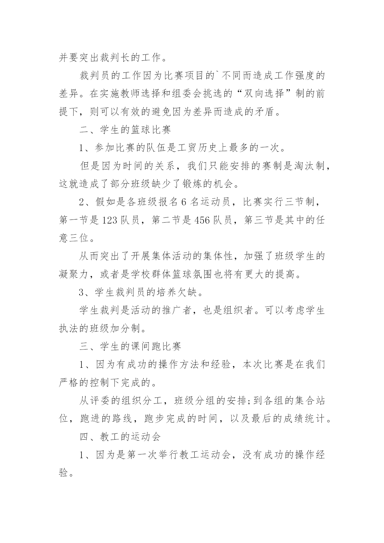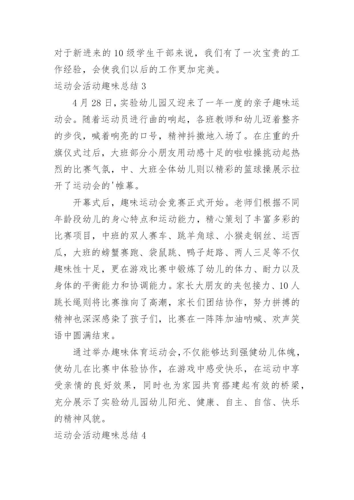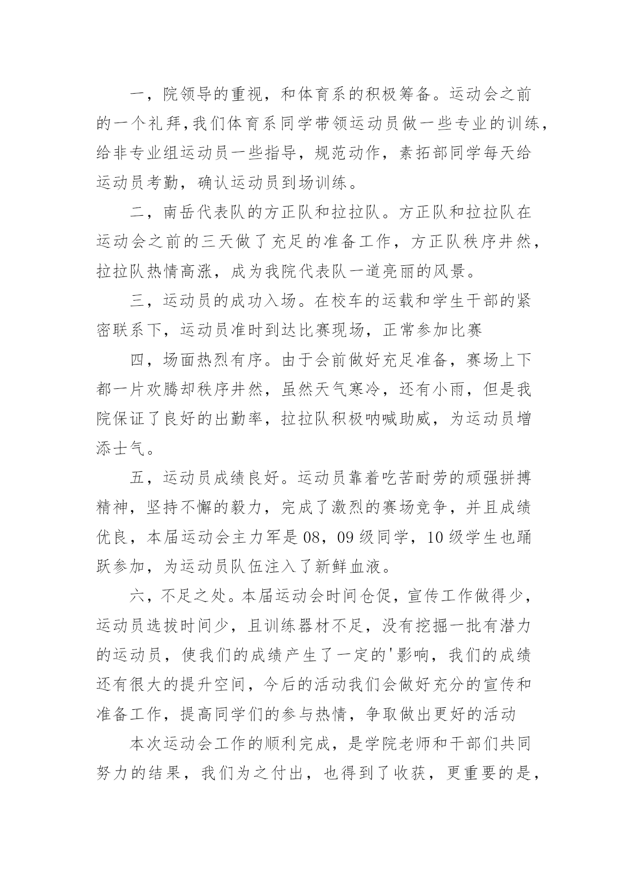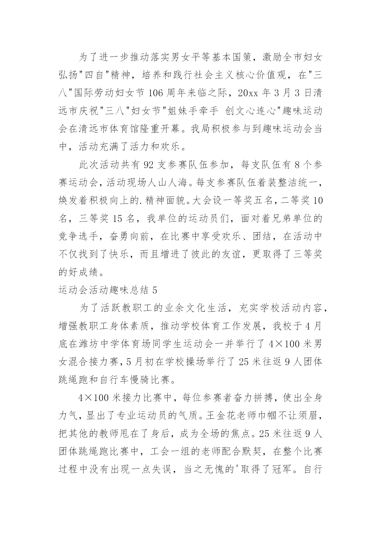 运动会活动趣味总结运动会活动趣味总结总结在一个时期、一个年度、一个阶段对学习和工作生活等情况加以回顾和分析的一种书面材料,它可以提升我们发现问题的能力,快快来写一份总结吧。你想知道总结怎么写吗?以下是小编整理的运动会活动趣味总结,希望对大家有所帮助。运动会活动趣味总结1为了丰富同学们的课余活动,增强同学们的班集体荣誉感及同学们之间的团结互助精神,同时为提高我院同学间的凝聚力,强健同学们的体魄,提升同学们的体育运动的热情,让同学们在寒冷的冬季享受到更多的乐趣,黄田农场学校在校领导的大力支持下,举办了冬季趣味运动会。此次运动会延续了以往的趣味性,删除了一些安全性较差的项目后,新添加了小型保龄球的比赛项目。运动会有50米往返障碍接力赛、持轻物掷准、小型保龄球等团体比赛项目。在比赛中同学们积极参加,由于比赛项目比较集中很多同学出现了个人项目与团体项目相冲突的现象,在这种情况下同学们毅然放弃个人荣誉投身于团体比赛中,为班级贡献出自己的力量。从总体上看,本次趣味运动会是成功,也基本达到了预期效果。大部分孩子参与其中。参赛的队员和裁判员老师们个个精神抖擞,斗志高昂,他们在赛场上肆意挥洒着青春的风采与活力。观看的同学热情高涨,加油声此起彼伏。此次活动把学生单纯的体育竞技转换成了游戏的形式,多了一份趣味,多了一份童真。在活跃身心的同时,展现了全体同学的朝气蓬勃的精神风貌。太阳虽大却挡不住孩子们的热情,他们乐在其中,把笑声留在了操场的角落。取得效果固然可喜,但突现的问题不容忽视,最重要的是从本次趣味运动会中积累经验,汲取教训,使今后的活动开展地越来越好。1、本次活动暴露出了一个值得深思和关注的问题,就是各班对学校布置的活动要早做准备,要组织学生进行必要的训练,确保取得更好的比赛结果,而不是临到比赛了还没确定比赛队员。2、虽然比赛已经结束,但我们的锻炼不能放松,我们要借这次活动的喜悦,把冬季体育锻炼推向新的高潮。汗血宝马谁与争,气冠长大驰天下。那半天的汗水和泪水以及在那之后灿烂的笑语,将会定格在我们每个人的记忆里,成为飘扬青春风采的美丽故事。在这冬季运动会上我们每个人都奉献了自己,为参赛选手提供方便,使我们很高兴。还体现了各社团协会成员积极进取,勇于拼搏,团结一致,奋发向上的精神。这给我们很大的启示与感动。通过本次运动会的成功举办使得我校的凝聚力高涨,也更进一步增进了同学及师生间的友谊。让大家都认识到自己在学校的位置,也知道了合作的`重要。在以后体育工作中我们一定把这次活动上精神继续发扬,且改进我们的不足,促进自我发展,也使我们自己不断的成长。为丰富学生的校园生活,进一步提高学生素质,培养学生运动技能,激发学生勇于挑战自我,战胜自我的顽强意识,大力推进素质教育,丰富校园文化生活,12月18日,菊河小学举行了“趣味运动会”。本次活动由艺体组组织,比赛项目分个人、团体两个大项十多个小项,个人项目有男、女一分钟跳绳、一分钟拍球、立定跳远、限距离投球、一分钟仰卧起坐、毽子投准、乒乓球;团体项目有拔河、“争分夺秒”、第三套小学生广播体操“七彩阳光”等。本次活动学生参与面广,共有各类运动员600余人。比赛的同学非常投入,观看的同学热情高涨,加油声此起彼伏。此次活动把学生单纯的体育竞技转换成了游戏的形式,多了一份趣味,多了一份童真。让孩子体验运动的快乐,竞争的乐趣、参与的欣慰,培养孩子的规则意识及协作精神,激发孩子的运动潜能。在活跃身心的同时,展现了菊河小学学生朝气蓬勃的精神风貌。最后,刘林等98名学生获一等奖,王李强等107名学生获二等奖,杨俊等67名学生获三等奖。1.2班、2.2班、3.1班、4.1班、5.1班、6.2班等班级荣获团体优胜奖。1.1班、2.1班、3.2班、4.2班、5.2班、6.1班、6.3班等班级获体育道德风尚奖。运动会活动趣味总结2我校20xx,我们有成功经验,也有不足之处。一,院领导的重视,和体育系的积极筹备。运动会之前的一个礼拜,我们体育系同学带领运动员做一些专业的训练,给非专业组运动员一些指导,规范动作,素拓部同学每天给运动员考勤,确认运动员到场训练。二,南岳代表队的方正队和拉拉队。方正队和拉拉队在运动会之前的三天做了充足的准备工作,方正队秩序井然,拉拉队热情高涨,成为我院代表队一道亮丽的风景。三,运动员的成功入场。在校车的运载和学生干部的紧密联系下,运动员准时到达比赛现场,正常参加比赛四,场面热烈有序。由于会前做好充足准备,赛场上下都一片欢腾却秩序井然,虽然天气寒冷,还有小雨,但是我院保证了良好的出勤率,拉拉队积极呐喊助威,为运动员增添士气。五,运动员成绩良好。运动员靠着吃苦耐劳的顽强拼搏精神,坚持不懈的毅力,完成了激烈的赛场竞争,并且成绩优良,本届运动会主力军是08,09级同学,10级学生也踊跃参加,为运动员队伍注入了新鲜血