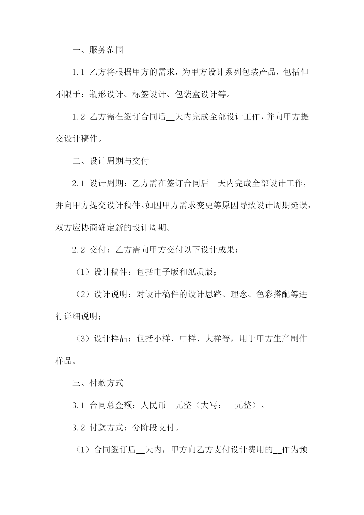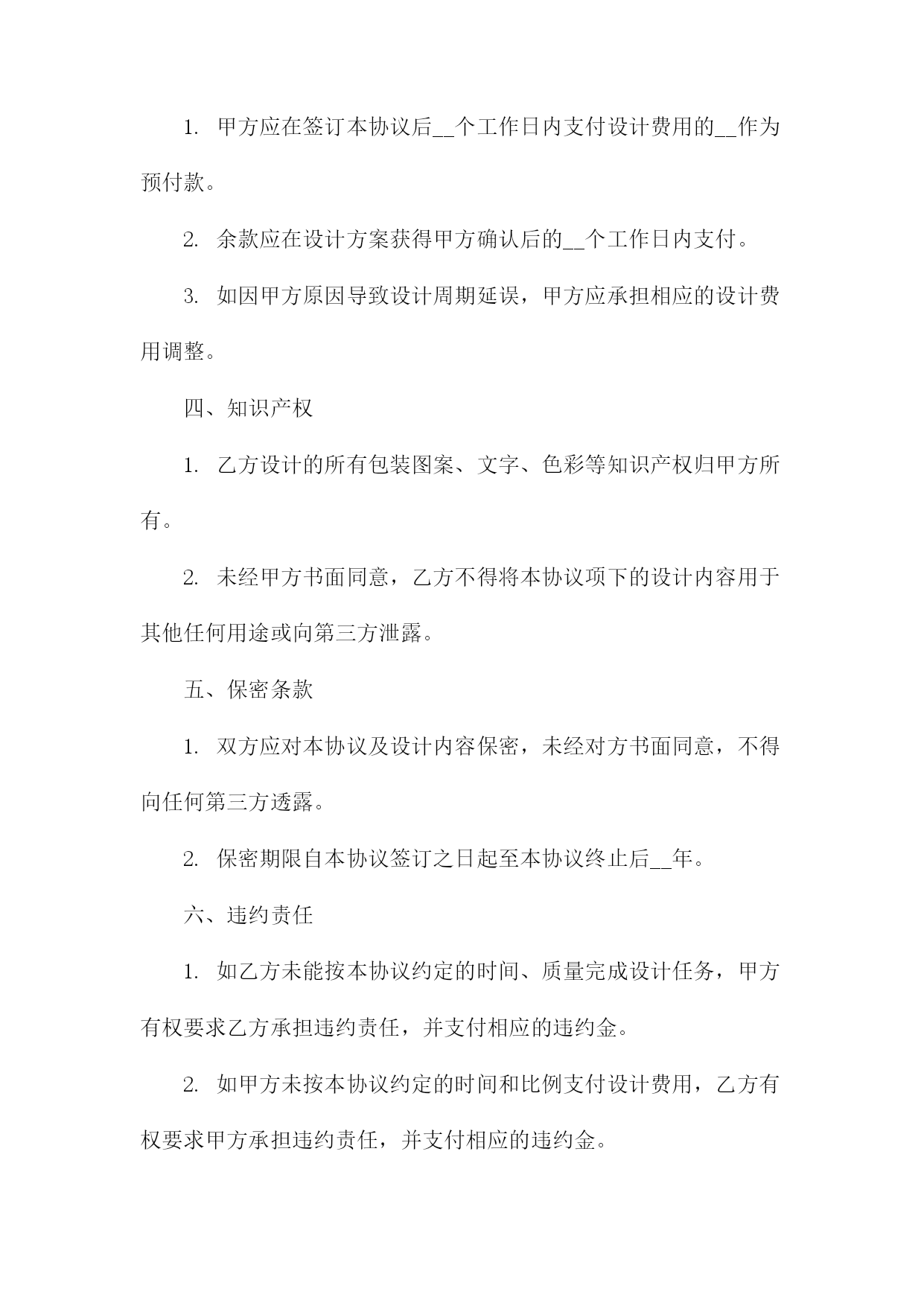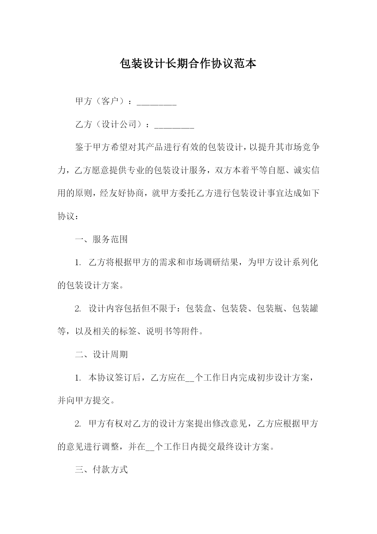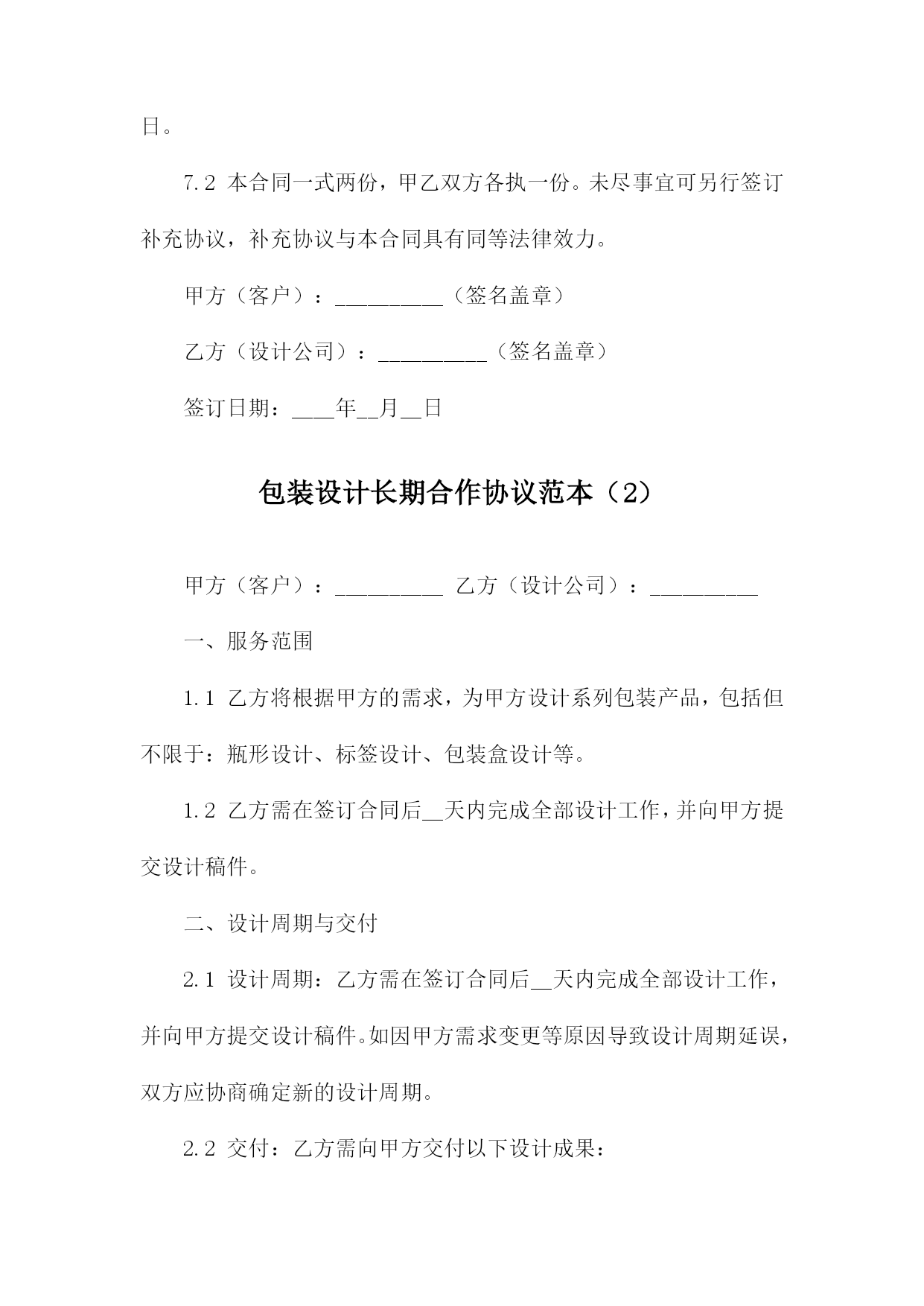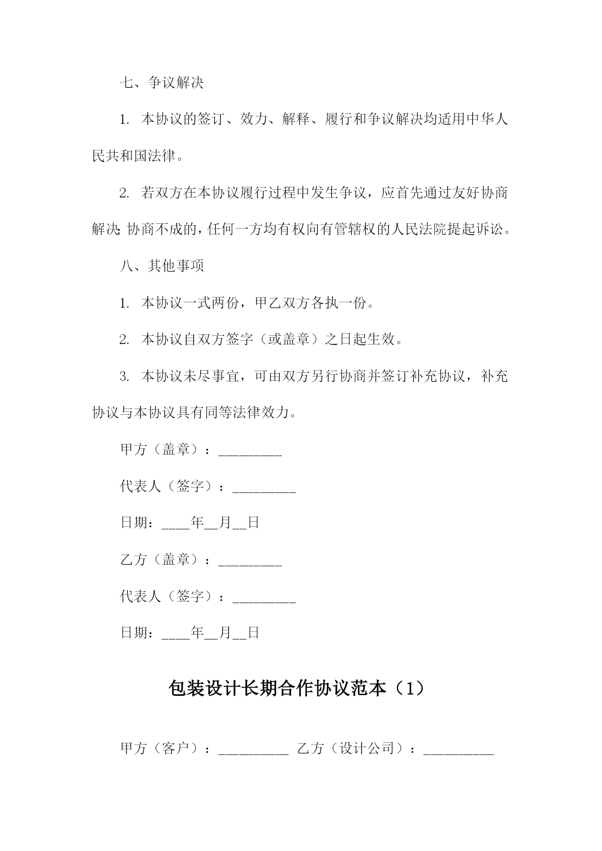 包装设计长期合作协议范本甲方(客户):_________乙方(设计公司):_________鉴于甲方希望对其产品进行有效的包装设计,以提升其市场竞争力,乙方愿意提供专业的包装设计服务,双方本着平等自愿、诚实信用的原则,经友好协商,就甲方委托乙方进行包装设计事宜达成如下协议:一、服务范围1.乙方将根据甲方的需求和市场调研结果,为甲方设计系列化的包装设计方案。2.设计内容包括但不限于:包装盒、包装袋、包装瓶、包装罐等,以及相关的标签、说明书等附件。二、设计周期1.本协议签订后,乙方应在__个工作日内完成初步设计方案,并向甲方提交。2.甲方有权对乙方的设计方案提出修改意见,乙方应根据甲方的意见进行调整,并在__个工作日内提交最终设计方案。三、付款方式1.甲方应在签订本协议后__个工作日内支付设计费用的__作为预付款。2.余款应在设计方案获得甲方确认后的__个工作日内支付。3.如因甲方原因导致设计周期延误,甲方应承担相应的设计费用调整。四、知识产权1.乙方设计的所有包装图案、文字、色彩等知识产权归甲方所有。2.未经甲方书面同意,乙方不得将本协议项下的设计内容用于其他任何用途或向第三方泄露。五、保密条款1.双方应对本协议及设计内容保密,未经对方书面同意,不得向任何第三方透露。2.保密期限自本协议签订之日起至本协议终止后__年。六、违约责任1.如乙方未能按本协议约定的时间、质量完成设计任务,甲方有权要求乙方承担违约责任,并支付相应的违约金。2.如甲方未按本协议约定的时间和比例支付设计费用,乙方有权要求甲方承担违约责任,并支付相应的违约金。七、争议解决1.本协议的签订、效力、解释、履行和争议解决均适用中华人民共和国法律。2.若双方在本协议履行过程中发生争议,应首先通过友好协商解决;协商不成的,任何一方均有权向有管辖权的人民法院提起诉讼。八、其他事项1.本协议一式两份,甲乙双方各执一份。2.本协议自双方签字(或盖章)之日起生效。3.本协议未尽事宜,可由双方另行协商并签订补充协议,补充协议与本协议具有同等法律效力。甲方(盖章):_________代表人(签字):_________日期:____年__月__日乙方(盖章):_________代表人(签字):_________日期:____年__月__日包装设计长期合作协议范本(1)甲方(客户):__________乙方(设计公司):__________一、服务范围1.1乙方将根据甲方的需求,为甲方设计系列包装产品,包括但不限于:瓶形设计、标签设计、包装盒设计等。1.2乙方需在签订合同后__天内完成全部设计工作,并向甲方提交设计稿件。二、设计周期与交付2.1设计周期:乙方需在签订合同后__天内完成全部设计工作,并向甲方提交设计稿件。如因甲方需求变更等原因导致设计周期延误,双方应协商确定新的设计周期。2.2交付:乙方需向甲方交付以下设计成果:(1)设计稿件:包括电子版和纸质版;(2)设计说明:对设计稿件的设计思路、理念、色彩搭配等进行详细说明;(3)设计样品:包括小样、中样、大样等,用于甲方生产制作样品。三、付款方式3.1合同总金额:人民币__元整(大写:__元整)。3.2付款方式:分阶段支付。(1)合同签订后__天内,甲方向乙方支付设计费用的__作为预付款;(2)乙方完成全部设计工作并提交设计稿件后__天内,甲方向乙方支付剩余的设计费用。四、知识产权归属4.1乙方对甲方提供的所有资料和信息负有保密义务,未经甲方书面同意,乙方不得将上述资料和信息用于本合同之外的任何用途。4.2本合同项下设计的所有知识产权归甲方所有。乙方应将设计稿件、设计说明等相关资料一并交付给甲方。甲方有权在中华人民共和国境内使用、许可他人使用或以其他方式处理上述知识产权。五、违约责任5.1如乙方未按照约定时间完成设计工作,甲方有权要求乙方承担违约责任,并支付相应的违约金。5.2如甲方未按照约定支付设计费用,乙方有权要求甲方承担违约责任,并支付相应的违约金。六、争议解决6.1双方在履行本合同过程中发生争议,应首先通过友好协商解决;协商不成的,可以向合同签订地的人民法院提起诉讼。七、其他事项7.1本合同自双方签字(或盖章)之日起生效,有效期为__年月日。7.2本合同一式两份,甲乙双方各执一份。未尽事宜可另行签订补充协议,补充协议与本合同具有同等法律效力。甲方(客户):__________(签名盖章)乙方(设计公司):__________(签名盖章)签订日期:____年__月__日包装设计长期合作协议范本(2)甲方(客户):__________乙方(设计公司):__________一、服务范围1.1乙