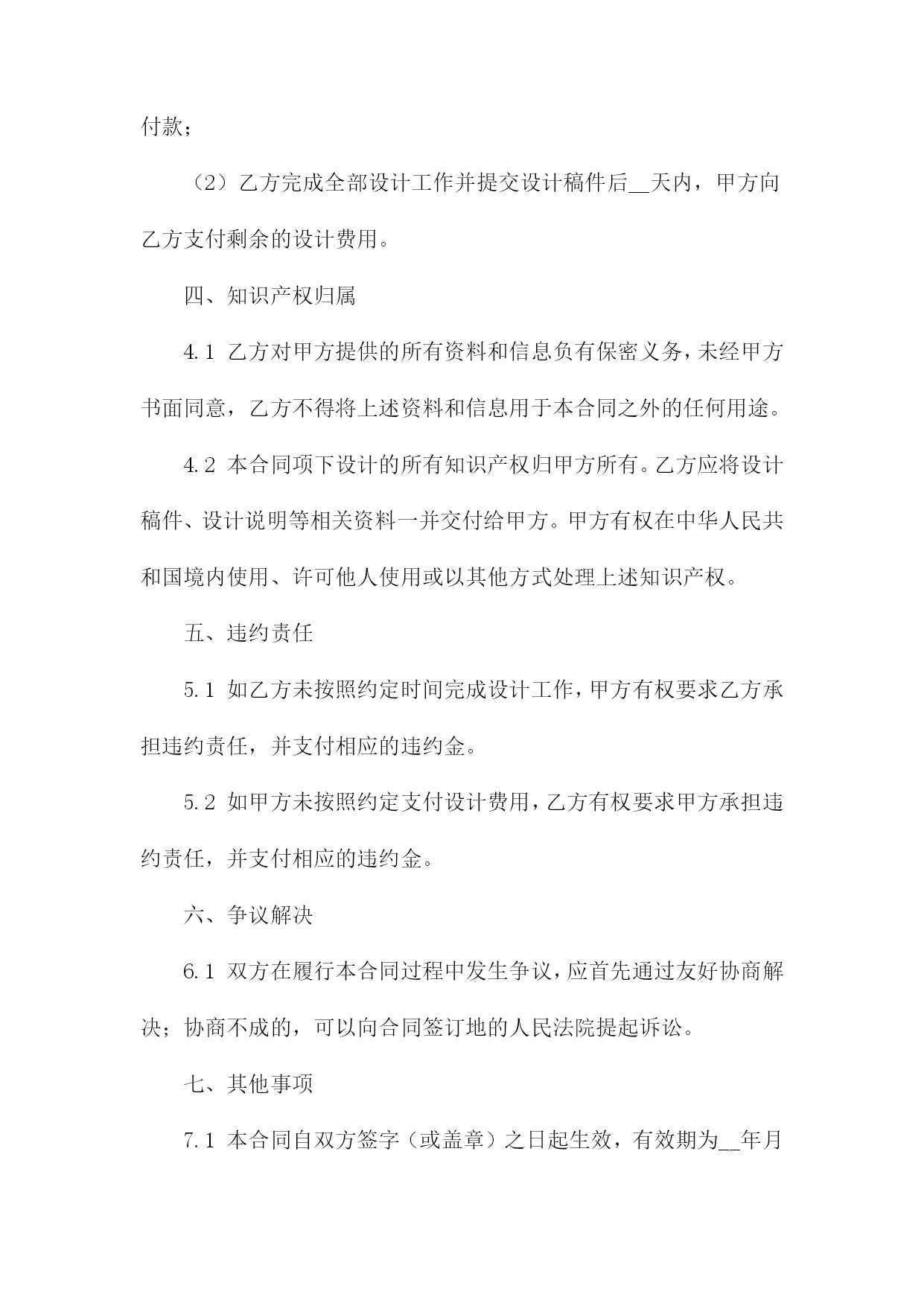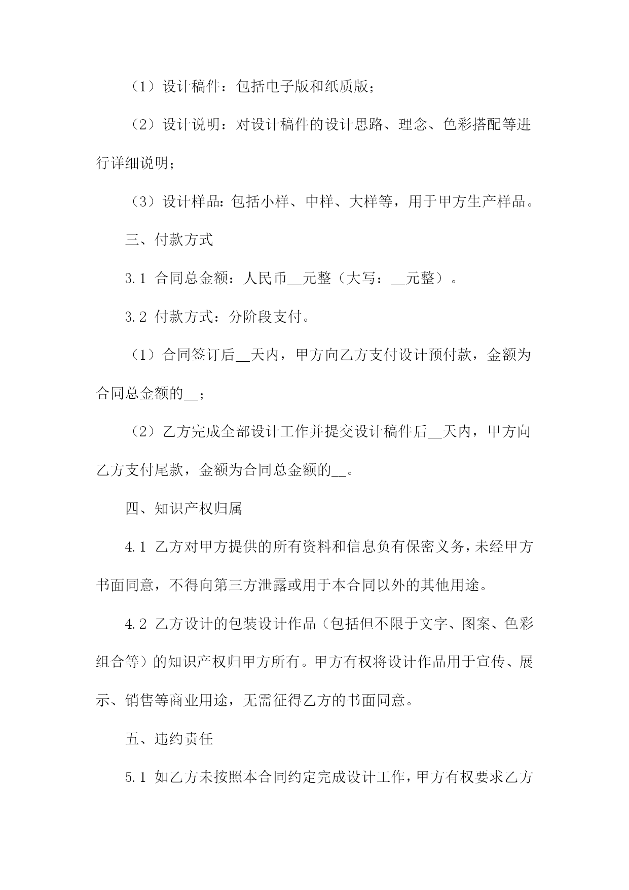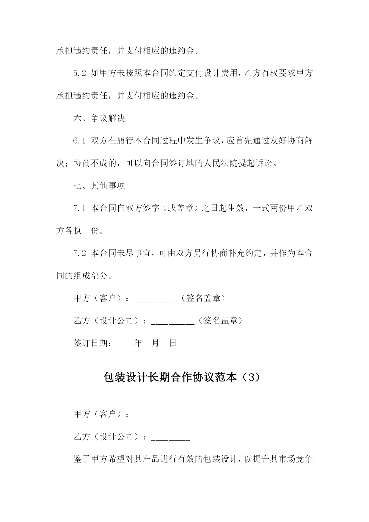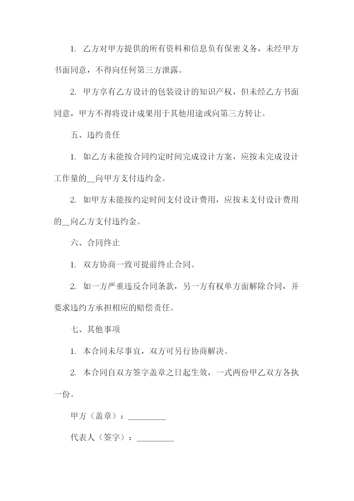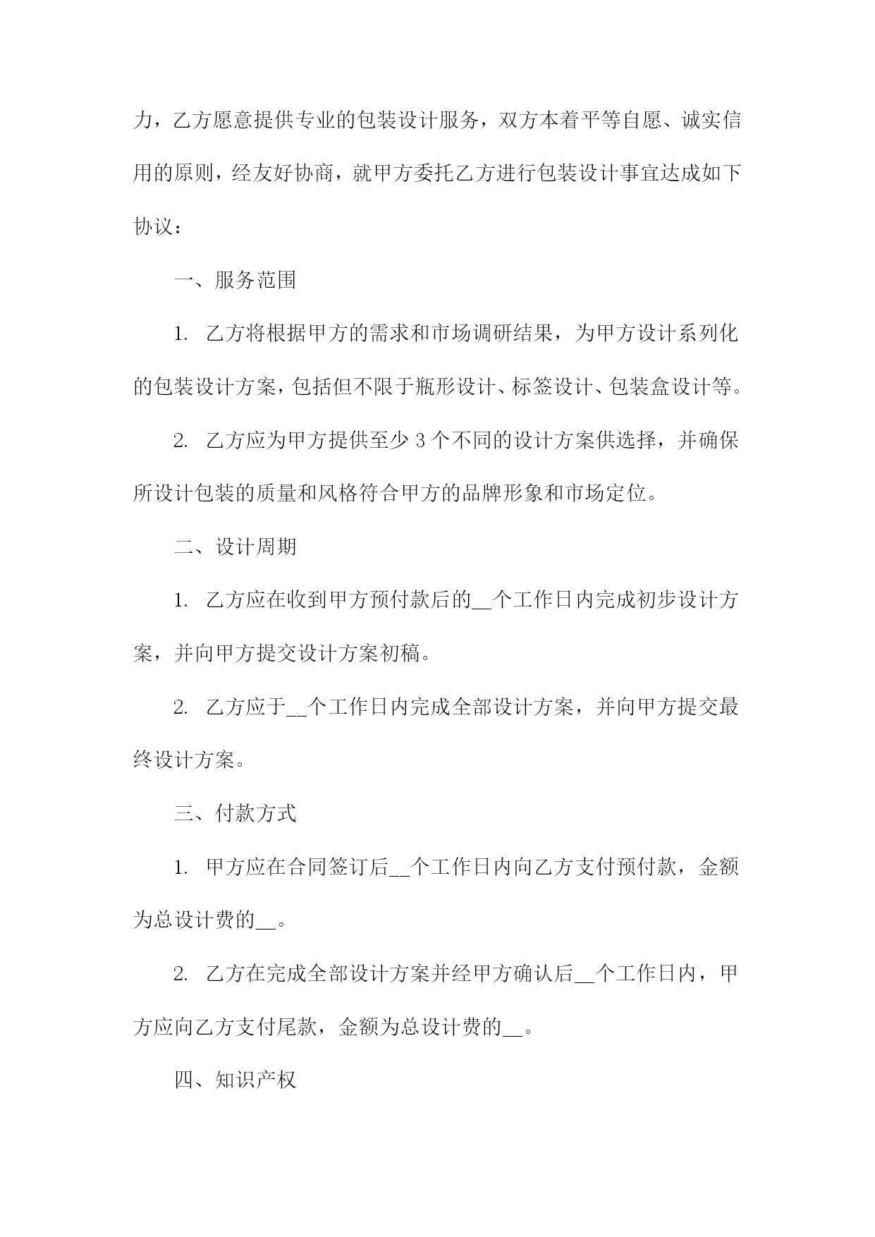 包装设计长期合作协议范本甲方(客户):_________乙方(设计公司):_________鉴于甲方希望对其产品进行有效的包装设计,以提升其市场竞争力,乙方愿意提供专业的包装设计服务,双方本着平等自愿、诚实信用的原则,经友好协商,就甲方委托乙方进行包装设计事宜达成如下协议:一、服务范围1.乙方将根据甲方的需求和市场调研结果,为甲方设计系列化的包装设计方案。2.设计内容包括但不限于:包装盒、包装袋、包装瓶、包装罐等,以及相关的标签、说明书等附件。二、设计周期1.本协议签订后,乙方应在__个工作日内完成初步设计方案,并向甲方提交。2.甲方有权对乙方的设计方案提出修改意见,乙方应根据甲方的意见进行调整,并在__个工作日内提交最终设计方案。三、付款方式1.甲方应在签订本协议后__个工作日内支付设计费用的__作为预付款。2.余款应在设计方案获得甲方确认后的__个工作日内支付。3.如因甲方原因导致设计周期延误,甲方应承担相应的设计费用调整。四、知识产权1.乙方设计的所有包装图案、文字、色彩等知识产权归甲方所有。2.未经甲方书面同意,乙方不得将本协议项下的设计内容用于其他任何用途或向第三方泄露。五、保密条款1.双方应对本协议及设计内容保密,未经对方书面同意,不得向任何第三方透露。2.保密期限自本协议签订之日起至本协议终止后__年。六、违约责任1.如乙方未能按本协议约定的时间、质量完成设计任务,甲方有权要求乙方承担违约责任,并支付相应的违约金。2.如甲方未按本协议约定的时间和比例支付设计费用,乙方有权要求甲方承担违约责任,并支付相应的违约金。七、争议解决1.本协议的签订、效力、解释、履行和争议解决均适用中华人民共和国法律。2.若双方在本协议履行过程中发生争议,应首先通过友好协商解决;协商不成的,任何一方均有权向有管辖权的人民法院提起诉讼。八、其他事项1.本协议一式两份,甲乙双方各执一份。2.本协议自双方签字(或盖章)之日起生效。3.本协议未尽事宜,可由双方另行协商并签订补充协议,补充协议与本协议具有同等法律效力。甲方(盖章):_________代表人(签字):_________日期:____年__月__日乙方(盖章):_________代表人(签字):_________日期:____年__月__日包装设计长期合作协议范本(1)甲方(客户):__________乙方(设计公司):__________一、服务范围1.1乙方将根据甲方的需求,为甲方设计系列包装产品,包括但不限于:瓶形设计、标签设计、包装盒设计等。1.2乙方需在签订合同后__天内完成全部设计工作,并向甲方提交设计稿件。二、设计周期与交付2.1设计周期:乙方需在签订合同后__天内完成全部设计工作,并向甲方提交设计稿件。如因甲方需求变更等原因导致设计周期延误,双方应协商确定新的设计周期。2.2交付:乙方需向甲方交付以下设计成果:(1)设计稿件:包括电子版和纸质版;(2)设计说明:对设计稿件的设计思路、理念、色彩搭配等进行详细说明;(3)设计样品:包括小样、中样、大样等,用于甲方生产制作样品。三、付款方式3.1合同总金额:人民币__元整(大写:__元整)。3.2付款方式:分阶段支付。(1)合同签订后__天内,甲方向乙方支付设计费用的__作为预付款;(2)乙方完成全部设计工作并提交设计稿件后__天内,甲方向乙方支付剩余的设计费用。四、知识产权归属4.1乙方对甲方提供的所有资料和信息负有保密义务,未经甲方书面同意,乙方不得将上述资料和信息用于本合同之外的任何用途。4.2本合同项下设计的所有知识产权归甲方所有。乙方应将设计稿件、设计说明等相关资料一并交付给甲方。甲方有权在中华人民共和国境内使用、许可他人使用或以其他方式处理上述知识产权。五、违约责任5.1如乙方未按照约定时间完成设计工作,甲方有权要求乙方承担违约责任,并支付相应的违约金。5.2如甲方未按照约定支付设计费用,乙方有权要求甲方承担违约责任,并支付相应的违约金。六、争议解决6.1双方在履行本合同过程中发生争议,应首先通过友好协商解决;协商不成的,可以向合同签订地的人民法院提起诉讼。七、其他事项7.1本合同自双方签字(或盖章)之日起生效,有效期为__年月日。7.2本合同一式两份,甲乙双方各执一份。未尽事宜可另行签订补充协议,补充协议与本合同具有同等法律效力。甲方(客户):__________(签名盖章)乙方(设计公司):__________(签名盖章)签订日期:____年__月__日包装设计长期合作协议范本(2)甲方(客户):__________乙方(设计公司):__________一、服务范围1.1乙