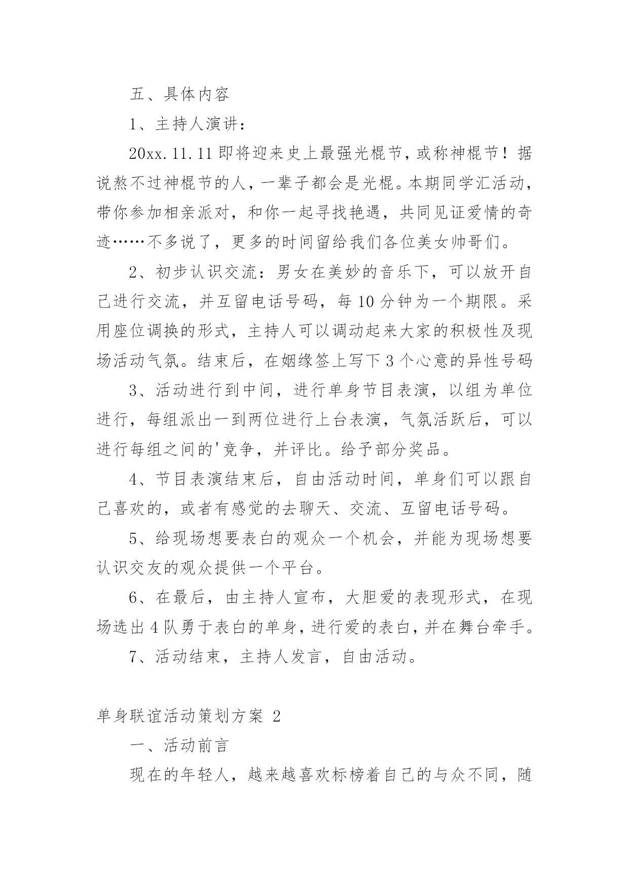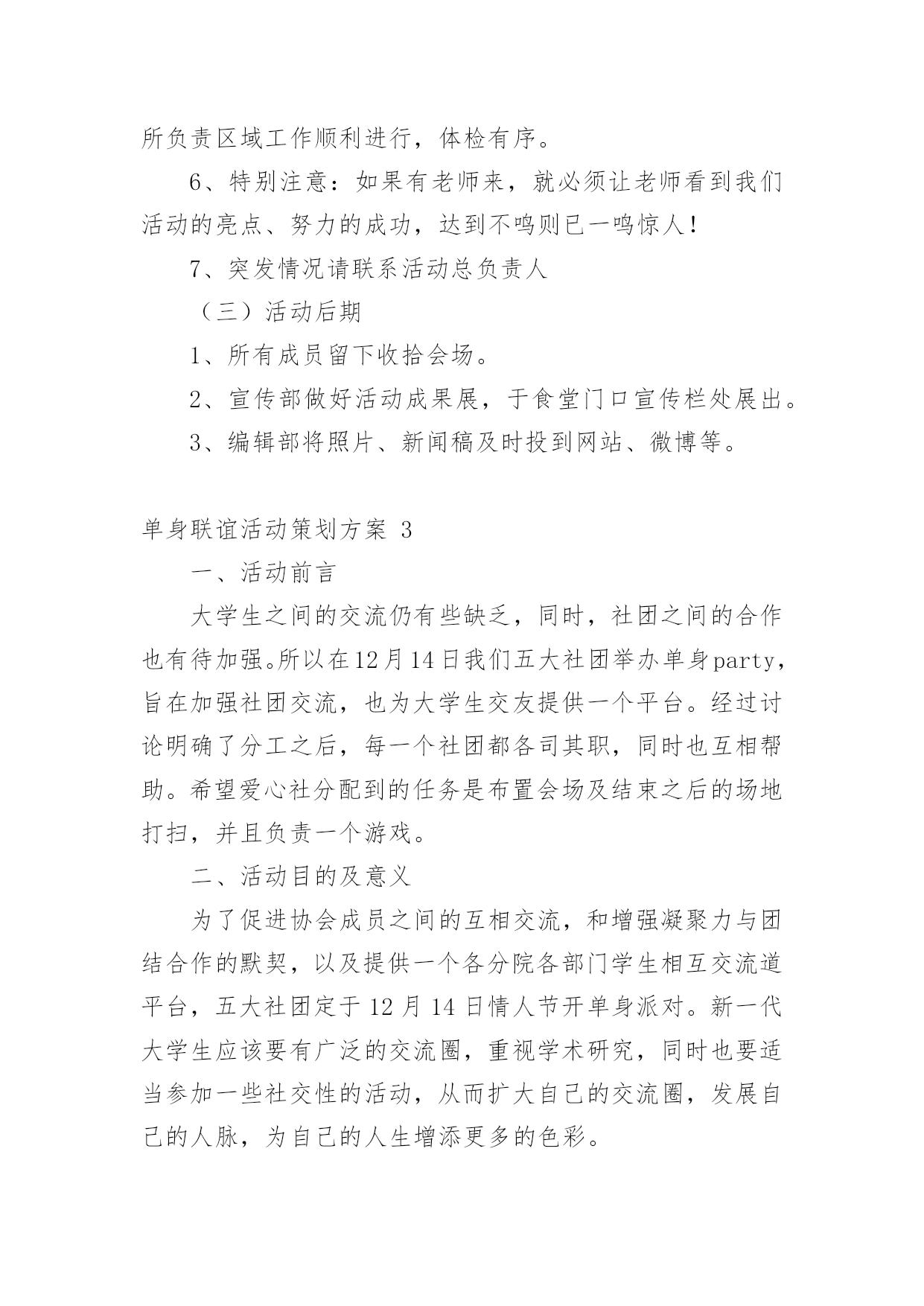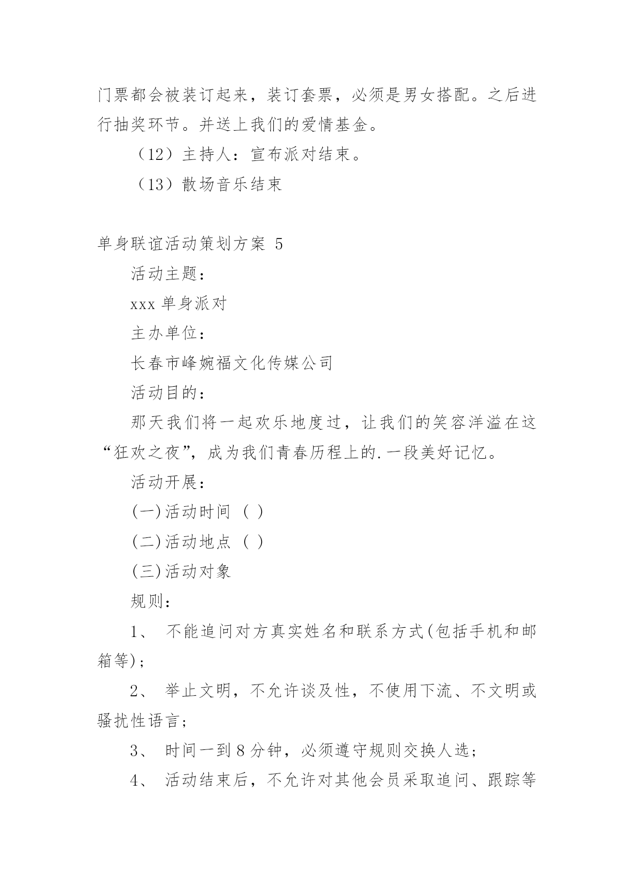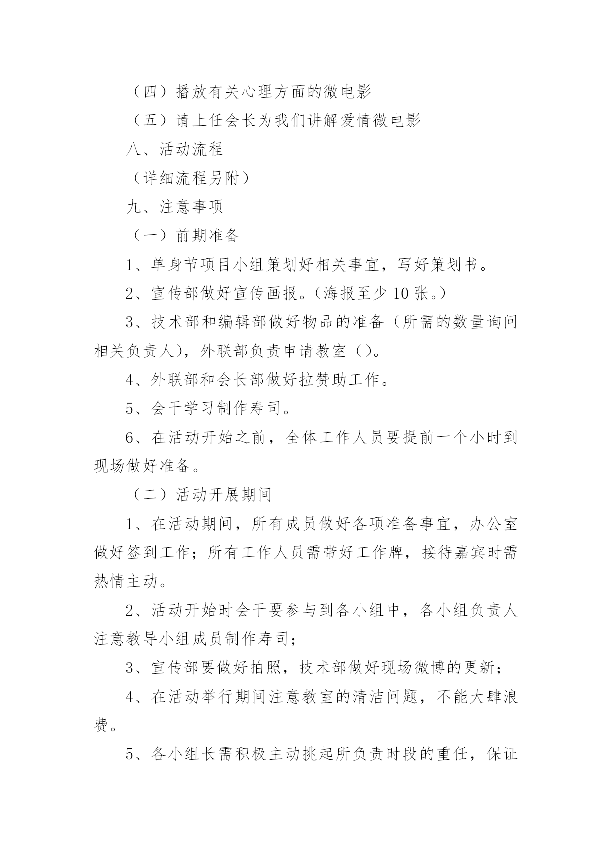 单身联谊活动策划方案单身联谊活动策划方案范文(通用12篇)为了保障活动顺利、圆满进行,时常需要预先开展活动方案准备工作,活动方案是从活动的目的、要求、方式、方法、进度等都部署具体、周密,并有很强可操作性的计划。那么优秀的活动方案是什么样的呢?以下是小编为大家收集的单身联谊活动策划方案范文,仅供参考,希望能够帮助到大家。单身联谊活动策划方案1一、活动主题:百年一遇神棍节相亲二、现场座次设计:采用围圈的方式,男女相互间隔来做,每12人为1组,当活动互动时,男方每隔10分钟换一个座次,根据现场顺时针的方向进行。女方则不变动。三、我方准备东西:每个单身发签字笔、号码牌、姻缘签(用于双方留联系方式),租用场地四、活动流程:会议开始—单身入场—主持人宣布开始—初步认识交流—单身节目表演—单身节目互动—聊天、互留电话号码—爱的牵手—活动结束。五、具体内容1、主持人演讲:20xx.11.11即将迎来史上最强光棍节,或称神棍节!据说熬不过神棍节的人,一辈子都会是光棍。本期同学汇活动,带你参加相亲派对,和你一起寻找艳遇,共同见证爱情的奇迹……不多说了,更多的时间留给我们各位美女帅哥们。2、初步认识交流:男女在美妙的音乐下,可以放开自己进行交流,并互留电话号码,每10分钟为一个期限。采用座位调换的形式,主持人可以调动起来大家的积极性及现场活动气氛。结束后,在姻缘签上写下3个心意的异性号码3、活动进行到中间,进行单身节目表演,以组为单位进行,每组派出一到两位进行上台表演,气氛活跃后,可以进行每组之间的'竞争,并评比。给予部分奖品。4、节目表演结束后,自由活动时间,单身们可以跟自己喜欢的,或者有感觉的去聊天、交流、互留电话号码。5、给现场想要表白的观众一个机会,并能为现场想要认识交友的观众提供一个平台。6、在最后,由主持人宣布,大胆爱的表现形式,在现场选出4队勇于表白的单身,进行爱的表白,并在舞台牵手。7、活动结束,主持人发言,自由活动。单身联谊活动策划方案2一、活动前言现在的年轻人,越来越喜欢标榜着自己的与众不同,随着xx年11月11日单身节的来临,就是无数年轻人所期盼的日子。随着单身节的到来,慢慢的步入了冬天,而怎样在这冬天里活出自己的精彩,活出自己的快乐,就是很多人思考的问题。在这个特殊的日子,开展一个单身派对,让更多的人一同来享受这个特殊的节日。二、活动目的在这个特殊的单身节派对,不仅仅能达到大家共同欢乐目的,同时也能使我们协会得到更好的宣传。再们一方面,可以为单身的同学做相应的咨询服务与引导,顺利的进行此次单身party。另一方面,也给我们一个锻炼和学习的'机会,认识各种优秀的朋友,发扬我们协会的作用!三、活动主题剖析爱情,单身万岁四、活动时间及地点时间:11月10日晚上:7:30—10:00地点:待定。五、主办单位:xx大学xx协会六、活动对象:全校师生。五、活动总负责人七、活动内容(一)开展寿司宴(二)游戏你画我猜(三)评比与颁奖(四)播放有关心理方面的微电影(五)请上任会长为我们讲解爱情微电影八、活动流程(详细流程另附)九、注意事项(一)前期准备1、单身节项目小组策划好相关事宜,写好策划书。2、宣传部做好宣传画报。(海报至少10张。)3、技术部和编辑部做好物品的准备(所需的数量询问相关负责人),外联部负责申请教室()。4、外联部和会长部做好拉赞助工作。5、会干学习制作寿司。6、在活动开始之前,全体工作人员要提前一个小时到现场做好准备。(二)活动开展期间1、在活动期间,所有成员做好各项准备事宜,办公室做好签到工作;所有工作人员需带好工作牌,接待嘉宾时需热情主动。2、活动开始时会干要参与到各小组中,各小组负责人注意教导小组成员制作寿司;3、宣传部要做好拍照,技术部做好现场微博的更新;4、在活动举行期间注意教室的清洁问题,不能大肆浪费。5、各小组长需积极主动挑起所负责时段的重任,保证所负责区域工作顺利进行,体检有序。6、特别注意:如果有老师来,就必须让老师看到我们活动的亮点、努力的成功,达到不鸣则已一鸣惊人!7、突发情况请联系活动总负责人(三)活动后期1、所有成员留下收拾会场。2、宣传部做好活动成果展,于食堂门口宣传栏处展出。3、编辑部将照片、新闻稿及时投到网站、微博等。单身联谊活动策划方案3一、活动前言大学生之间的交流仍有些缺乏,同时,社团之间的合作也有待加强。所以在12月14日我们五大社团举办单身party,旨在加强社团交流,也为大学生交友提供一个平台。经过讨论明确了分工之后,每一个社团都各司其职,同时也互相帮助。希望爱心社分配到的任务是布置会场及结束之后的场地打扫,并且负责一个游戏。二、活动目的及意义为了促进协会成员之间的互相交流,和增强凝聚力与团结合作的默契,以及提供一个各分院各部门学生相互交流道平台,五大社团定于12月14日情人