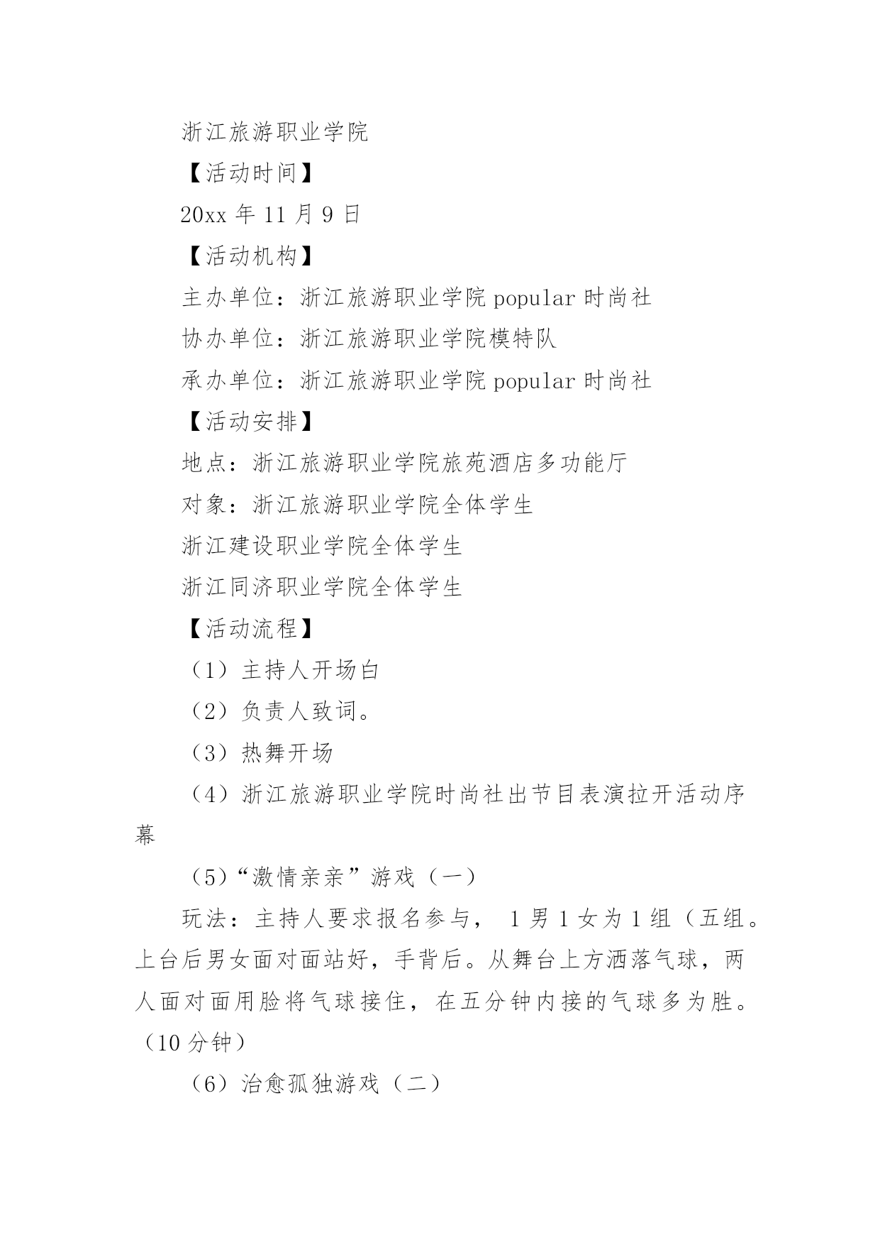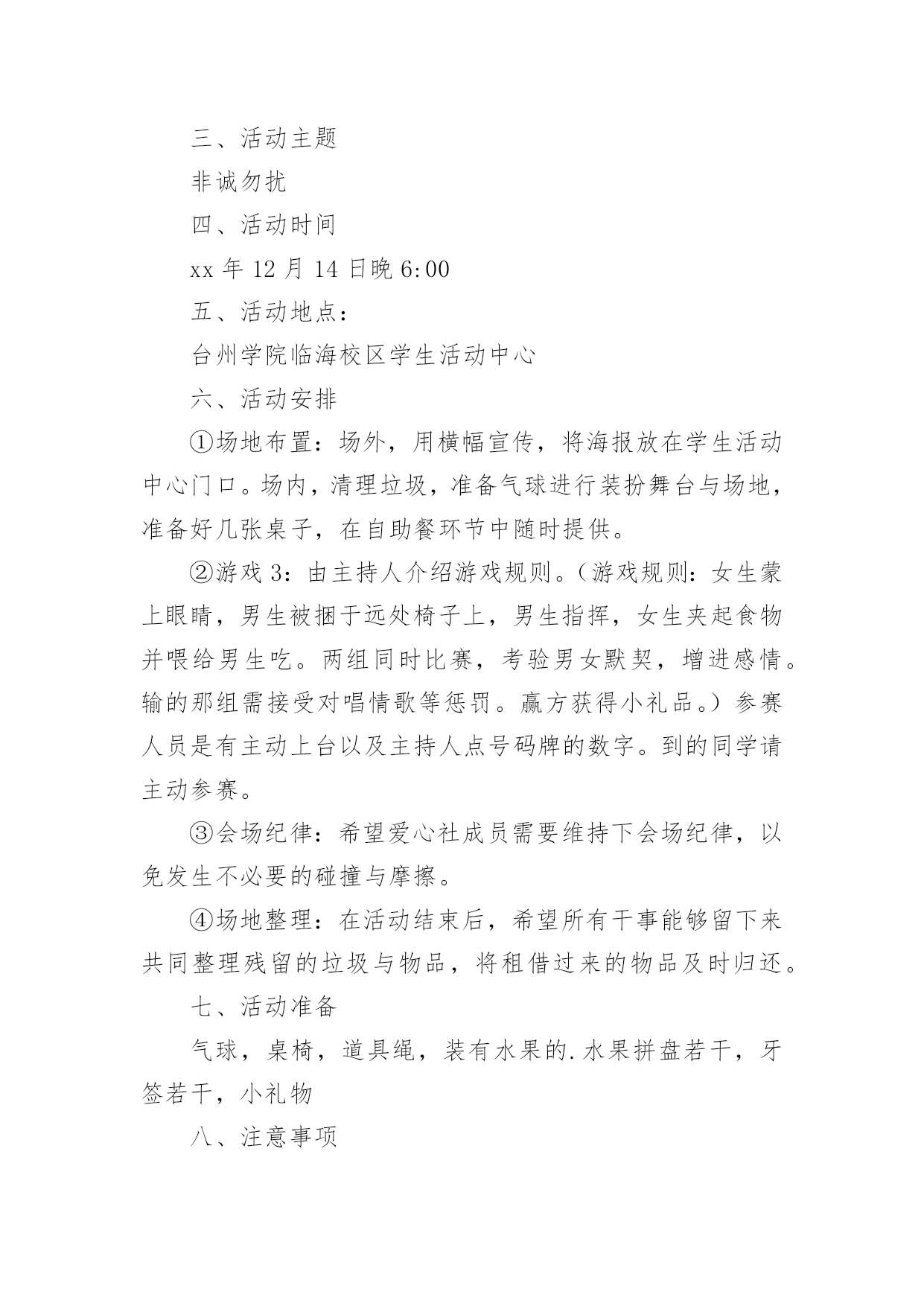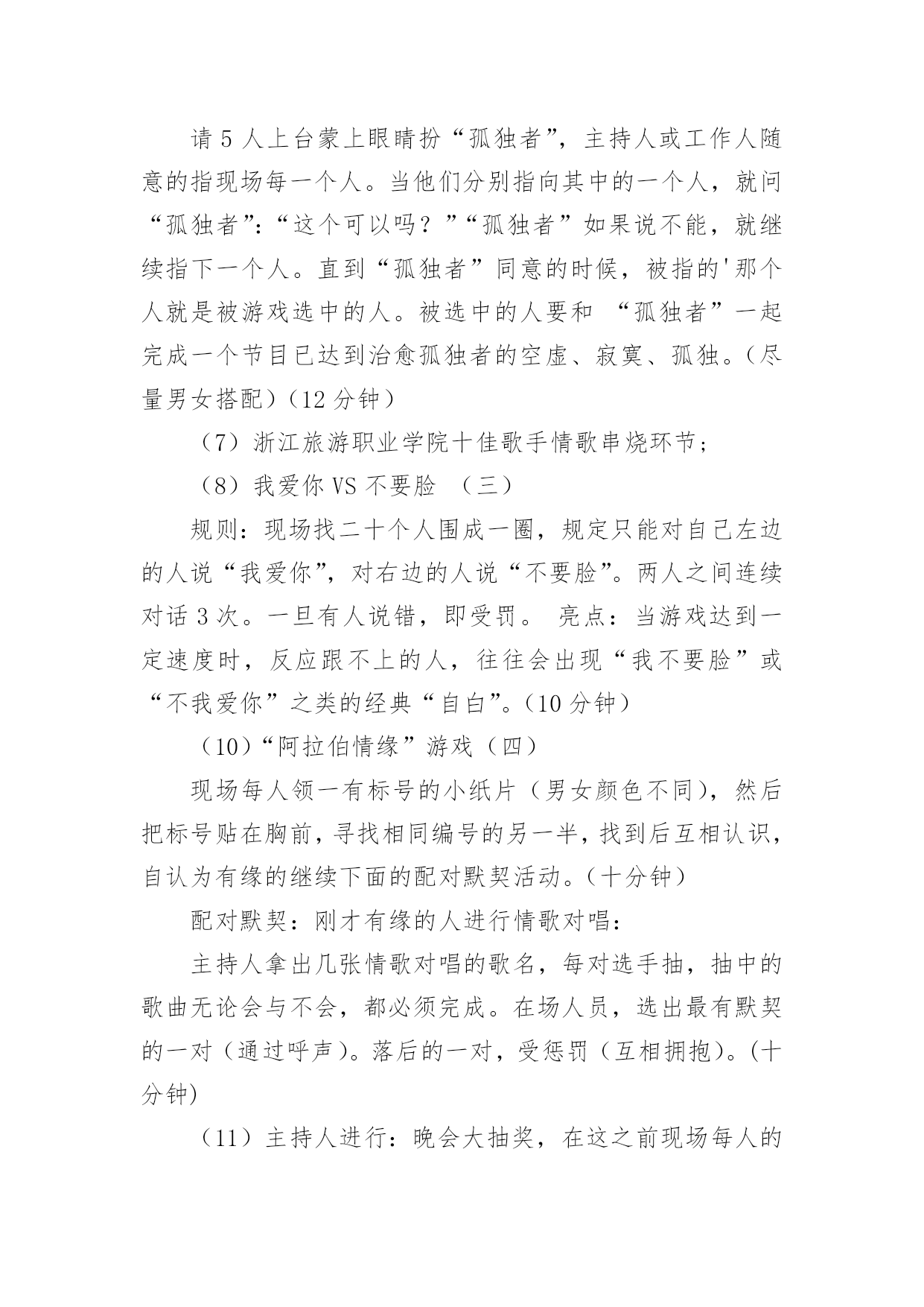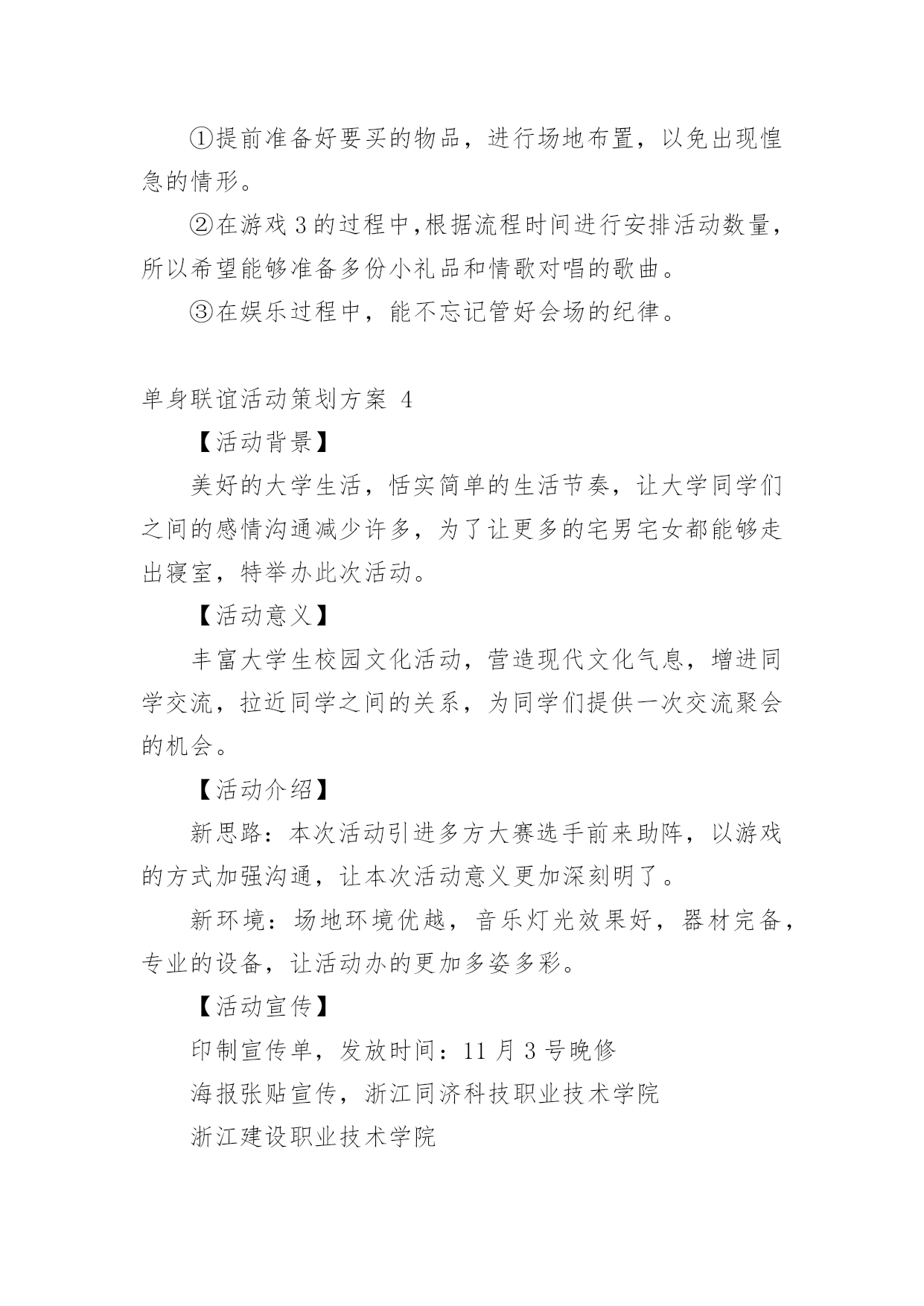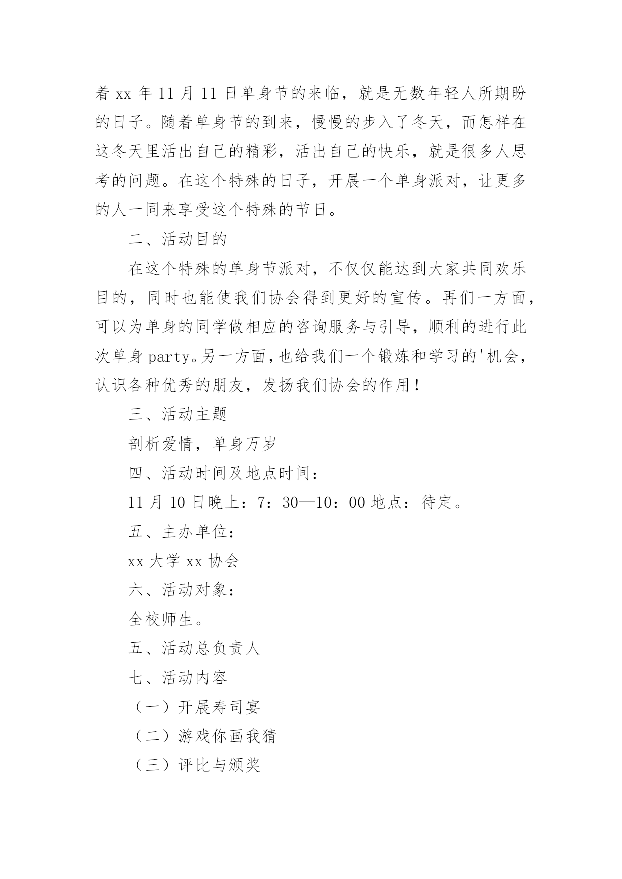 单身联谊活动策划方案单身联谊活动策划方案范文(通用12篇)为了保障活动顺利、圆满进行,时常需要预先开展活动方案准备工作,活动方案是从活动的目的、要求、方式、方法、进度等都部署具体、周密,并有很强可操作性的计划。那么优秀的活动方案是什么样的呢?以下是小编为大家收集的单身联谊活动策划方案范文,仅供参考,希望能够帮助到大家。单身联谊活动策划方案1一、活动主题:百年一遇神棍节相亲二、现场座次设计:采用围圈的方式,男女相互间隔来做,每12人为1组,当活动互动时,男方每隔10分钟换一个座次,根据现场顺时针的方向进行。女方则不变动。三、我方准备东西:每个单身发签字笔、号码牌、姻缘签(用于双方留联系方式),租用场地四、活动流程:会议开始—单身入场—主持人宣布开始—初步认识交流—单身节目表演—单身节目互动—聊天、互留电话号码—爱的牵手—活动结束。五、具体内容1、主持人演讲:20xx.11.11即将迎来史上最强光棍节,或称神棍节!据说熬不过神棍节的人,一辈子都会是光棍。本期同学汇活动,带你参加相亲派对,和你一起寻找艳遇,共同见证爱情的奇迹……不多说了,更多的时间留给我们各位美女帅哥们。2、初步认识交流:男女在美妙的音乐下,可以放开自己进行交流,并互留电话号码,每10分钟为一个期限。采用座位调换的形式,主持人可以调动起来大家的积极性及现场活动气氛。结束后,在姻缘签上写下3个心意的异性号码3、活动进行到中间,进行单身节目表演,以组为单位进行,每组派出一到两位进行上台表演,气氛活跃后,可以进行每组之间的'竞争,并评比。给予部分奖品。4、节目表演结束后,自由活动时间,单身们可以跟自己喜欢的,或者有感觉的去聊天、交流、互留电话号码。5、给现场想要表白的观众一个机会,并能为现场想要认识交友的观众提供一个平台。6、在最后,由主持人宣布,大胆爱的表现形式,在现场选出4队勇于表白的单身,进行爱的表白,并在舞台牵手。7、活动结束,主持人发言,自由活动。单身联谊活动策划方案2一、活动前言现在的年轻人,越来越喜欢标榜着自己的与众不同,随着xx年11月11日单身节的来临,就是无数年轻人所期盼的日子。随着单身节的到来,慢慢的步入了冬天,而怎样在这冬天里活出自己的精彩,活出自己的快乐,就是很多人思考的问题。在这个特殊的日子,开展一个单身派对,让更多的人一同来享受这个特殊的节日。二、活动目的在这个特殊的单身节派对,不仅仅能达到大家共同欢乐目的,同时也能使我们协会得到更好的宣传。再们一方面,可以为单身的同学做相应的咨询服务与引导,顺利的进行此次单身party。另一方面,也给我们一个锻炼和学习的'机会,认识各种优秀的朋友,发扬我们协会的作用!三、活动主题剖析爱情,单身万岁四、活动时间及地点时间:11月10日晚上:7:30—10:00地点:待定。五、主办单位:xx大学xx协会六、活动对象:全校师生。五、活动总负责人七、活动内容(一)开展寿司宴(二)游戏你画我猜(三)评比与颁奖(四)播放有关心理方面的微电影(五)请上任会长为我们讲解爱情微电影八、活动流程(详细流程另附)九、注意事项(一)前期准备1、单身节项目小组策划好相关事宜,写好策划书。2、宣传部做好宣传画报。(海报至少10张。)3、技术部和编辑部做好物品的准备(所需的数量询问相关负责人),外联部负责申请教室()。4、外联部和会长部做好拉赞助工作。5、会干学习制作寿司。6、在活动开始之前,全体工作人员要提前一个小时到现场做好准备。(二)活动开展期间1、在活动期间,所有成员做好各项准备事宜,办公室做好签到工作;所有工作人员需带好工作牌,接待嘉宾时需热情主动。2、活动开始时会干要参与到各小组中,各小组负责人注意教导小组成员制作寿司;3、宣传部要做好拍照,技术部做好现场微博的更新;4、在活动举行期间注意教室的清洁问题,不能大肆浪费。5、各小组长需积极主动挑起所负责时段的重任,保证所负责区域工作顺利进行,体检有序。6、特别注意:如果有老师来,就必须让老师看到我们活动的亮点、努力的成功,达到不鸣则已一鸣惊人!7、突发情况请联系活动总负责人(三)活动后期1、所有成员留下收拾会场。2、宣传部做好活动成果展,于食堂门口宣传栏处展出。3、编辑部将照片、新闻稿及时投到网站、微博等。单身联谊活动策划方案3一、活动前言大学生之间的交流仍有些缺乏,同时,社团之间的合作也有待加强。所以在12月14日我们五大社团举办单身party,旨在加强社团交流,也为大学生交友提供一个平台。经过讨论明确了分工之后,每一个社团都各司其职,同时也互相帮助。希望爱心社分配到的任务是布置会场及结束之后的场地打扫,并且负责一个游戏。二、活动目的及意义为了促进协会成员之间的互相交流,和增强凝聚力与团结合作的默契,以及提供一个各分院各部门学生相互交流道平台,五大社团定于12月14日情人