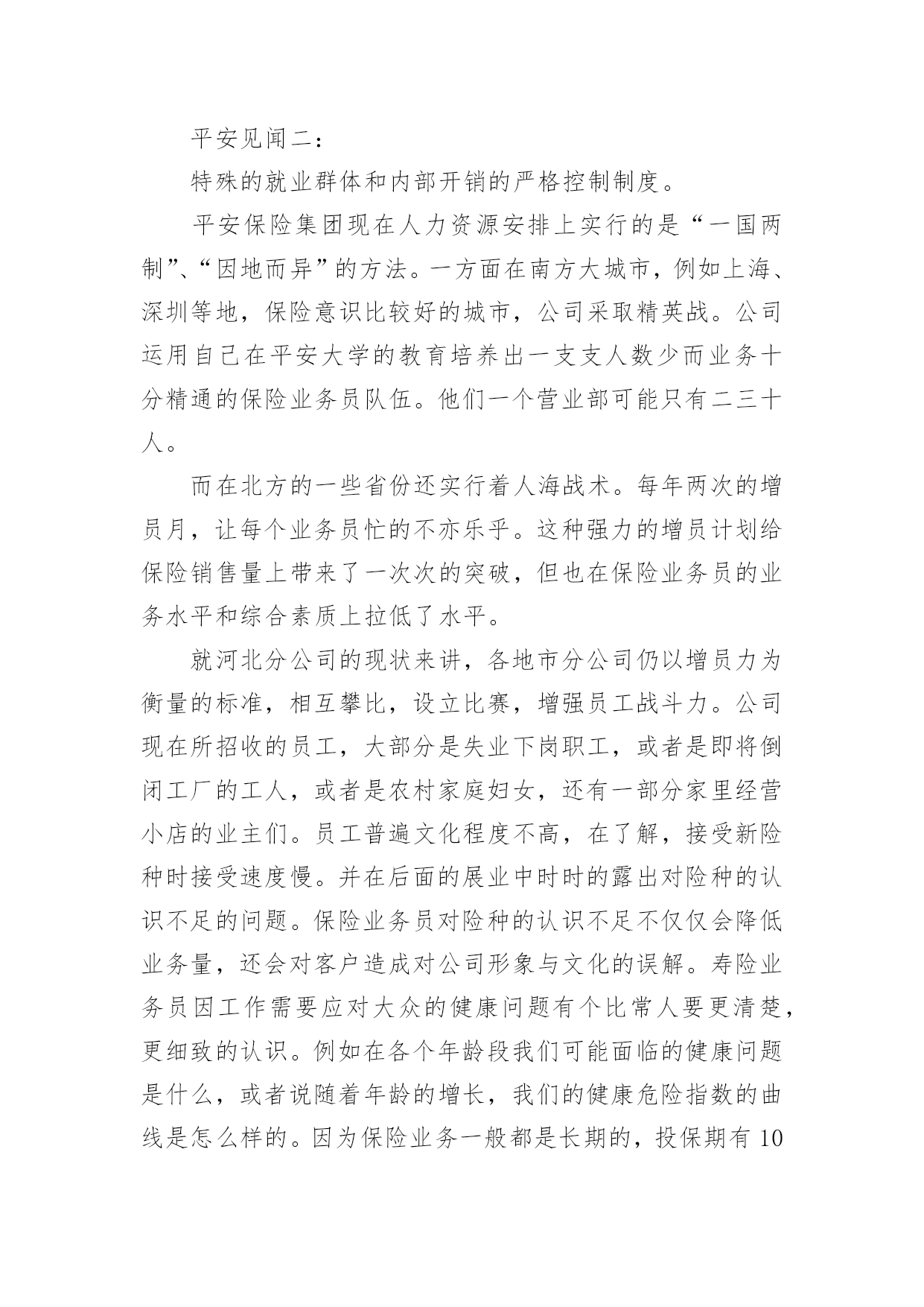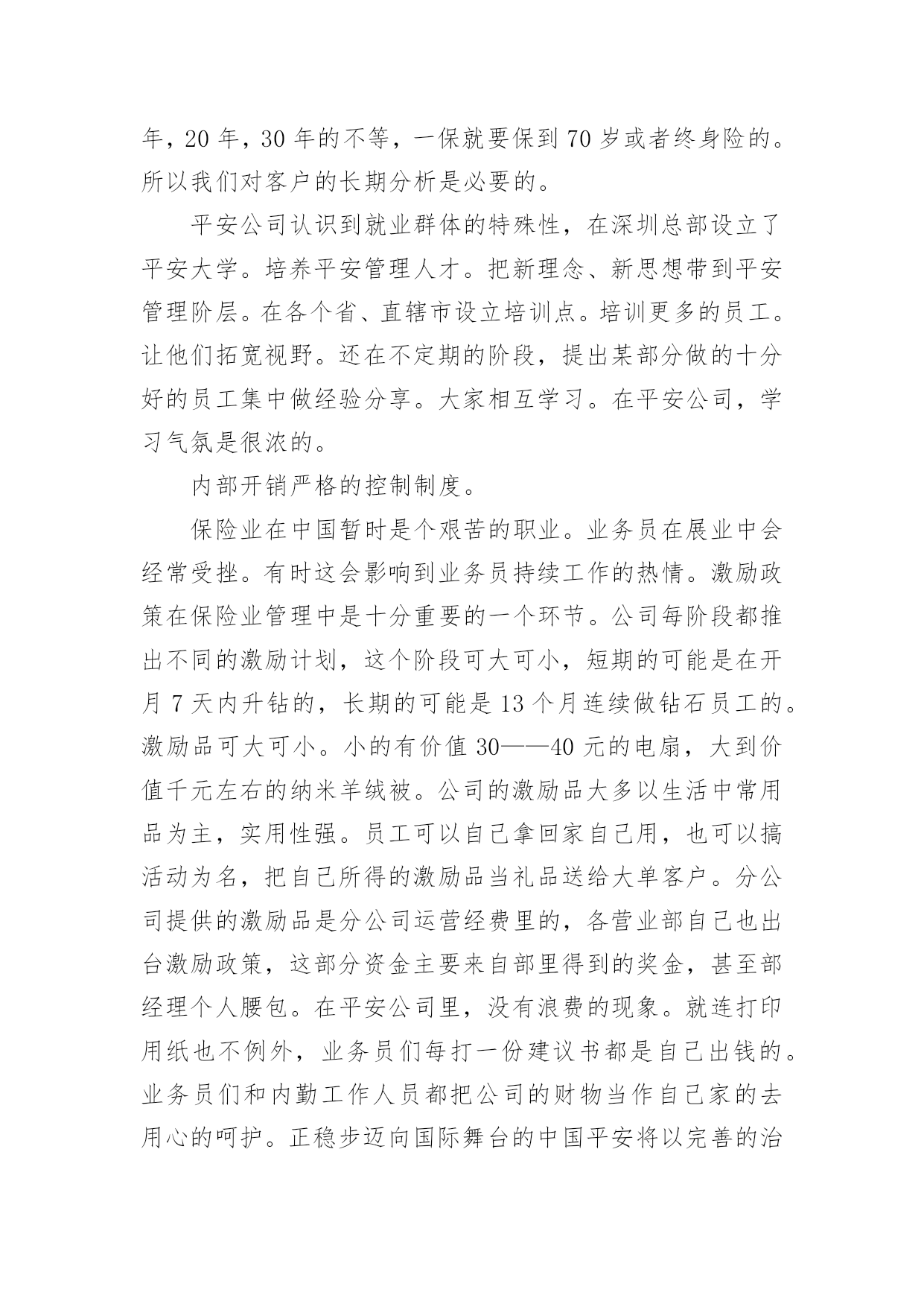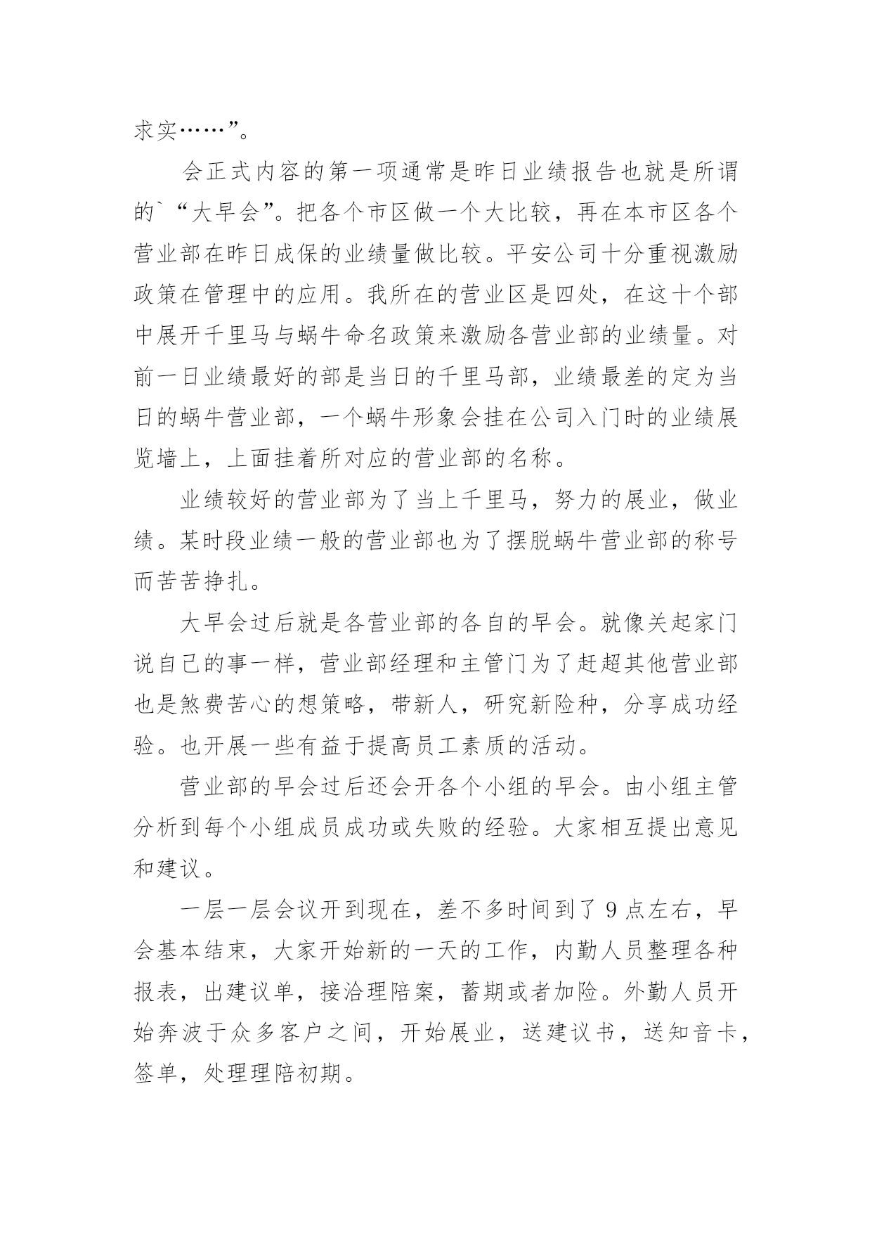 平安保险实习报告平安保险实习报告随着个人的素质不断提高,报告使用的次数愈发增长,写报告的时候要注意内容的完整。那么一般报告是怎么写的呢?下面是小编整理的平安保险实习报告,欢迎阅读,希望大家能够喜欢。平安保险实习报告1实习课程:市场营销策划实习地点:平安寿险云南分公司实习目标:通过本次营销策划的实习,将获得一定的关于保险的市场知识,并掌握一定的保险营销技巧。时间过得真快,我们暑假的第一轮营销策划实训就快过去了。在这期间,我们应学院安排,到平安寿险昆明分公司进行了业务实习,并根据所收获的东西得出了一份针对平安寿险营销的策划方案,在这期间,我学到了很多在课堂上根本就学不到的知识,受益非浅。现在我就对本次实习做一个小结。我知道,对于现代社会来说,保险制度是一项不可或缺的社会制度,在保险的运作过程中,社会完善了福利制度,人民找到了转移风险的保障,保险企业实现了利润收入,实在是一项多赢的产业。但是,具体到保险行业是如何运作,特别是它据说极其困难的营销,我就实在是一无所知了。带着这样的问题,我开始了在保险公司的实习。在此之前,我听了一个两天的营销峰会,那些职业经理人的经验和理论令我掌握了一些营销人的思考方式,这对我在实习当中会有很大的帮助。此次在保险公司的业务实习,主要岗位是做一些保险营销基层的工作,比如市场调查和陌生客户拜访。在市场调查的过程中,由于以前也做过这样的工作,所以还觉得不是太难,主要应注意的是礼貌和仪表,而且作为学生去做市场调查是比较容易的,学生嘛,大家都很配合,但偶尔也会遭遇冷遇,那时候真的是感觉非常的无助,但总体来说,还比较适应。相比较而言,比较难的应该是陌生客户拜访,这就比市场调查要难得多,因为他所需要的`沟通能力更加突出。陌生拜访的第一步,是客户的选择,陌生拜访并不是随便拉一个人就可以,而是要根据自己所要营销的产品选择有需求并有购买能力的客户,这一条就需要经验的累积,一开始,我根本不能辨别哪些客户是有需求的,哪些客户拥有购买能力,但在业务员的帮助下,我开始有感觉了,我们选择的客户对象是年收入在3到5万的人,而这样的客户,那些小业主中是最多的,他们生活富裕但却很忙碌,相应所要承担的风险也较大,所以他们就是版那种所谓有需求有购买力的客户。在选择了客户之后,我们确定了陌生拜访的第二步,称其为扫街,就是找一条比较繁华,小商铺比较多的街道,顺着街道一家一家的去进行拜访。这时最重要的是搭讪,打开话题,可不能一开始就说明你的来意,首先要装作是逛街的人,然后伺机与客户搭话,进一步确定他的需求,然后才技巧性的表明自己的身份和来意,最终完成拜访,在这一过程中,比较难完成的是索要客户信息,毕竟你是一个陌生人,很多客户并不是很信任你,要他留电话留地址会有些唐突,但这正是挑战所在,但有些小技巧可以使用,比如,我可以直接说你的电话是很多客户就会不自主的接下去,呵呵,这就是我这次业务实习掌握的一些沟通技巧之一。平安保险实习报告2一、实习目的提高实际工作能力,丰富社会经验,掌握信息管理知识在实际工作中的运用。二、公司简介20xx年1月份我十分有幸的来到中国平安保险(集团)股份有限公司实习。在去之前,我对它不是很了解,随着后来在平安的工作慢慢了解到中国平安保险(集团)股份有限公司(以下简称“中国平安”)是中国第一家以保险为核心的,融证券、信托、银行、资产管理、企业年金等多元金融业务为一体的紧密、高效、多元的综合金融服务集团。公司成立于1988年,总部位于深圳。20xx年6詒>我的工作主要分为两个阶段,第一阶段在营业部。分担营业部的外勤工作。第二阶段是在培训部。当时平安公司正在进行1月增员的活动,对新员工的岗前培训需要做大量的资料整理工作。平安见闻一:每天8点30分的早会。每天早上八点半是平安公司上班的时候,公司的喇叭里就会响起动感十足的音乐。这时候所有员工都要开始接受严格的考勤。平安的早会内容和各个外勤人员息息相关,所以对外勤人员的早会出席率有着极高的要求,也和各外勤人员的工资挂钩。8点25分,外勤所有业务员和本部的内勤们在营业部的排队站好,本营业部经理站在队列前面。然后广播里宣布早会开始,每日的早会是由各个部门的职员轮流主持。早会的第一项是齐唱公司司歌《平安颂》,这首歌是郭锋专门为平安公司而做。歌词如下:四海之内,心手相牵,选择平安是你我的心愿;诚实、信任、进取、成就,我们的信念永远不变;让每一个早晨与平安相见,人生拥有温馨的家园;让每一颗心灵与平安相连,生命书写辉煌的诗篇。追求卓越,全心奉献,回馈社会是我们的诺言;和平、友爱、幸福、欢乐,人类走向灿烂的明天;让每一个早晨与平安相见,人生拥有温馨的家园;让每一颗心灵与平安相连,生命书写辉煌的诗篇。生命书写辉煌的诗篇。平安!平安!平安!(每次回来跟朋友说到平安每天早晨都会唱司歌,他们都会说是学松下幸