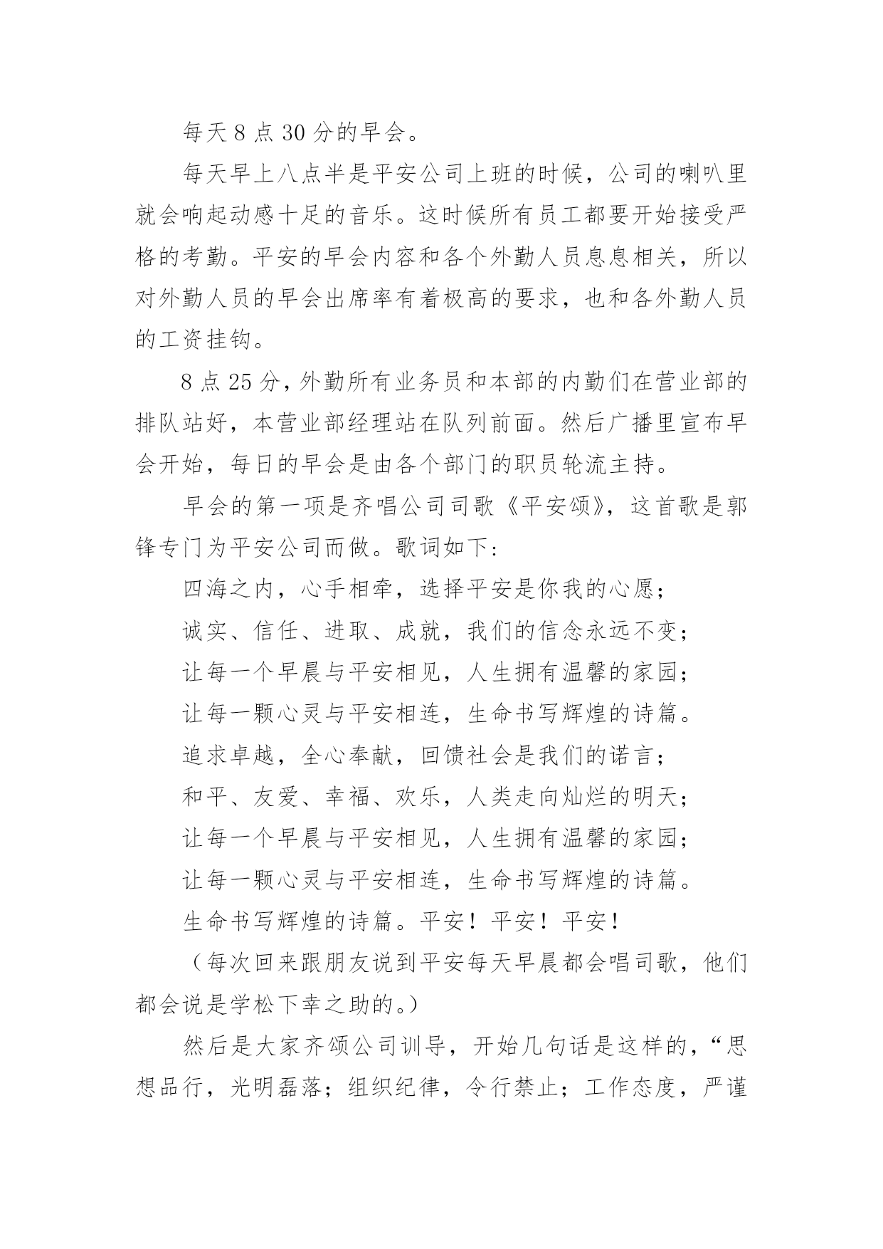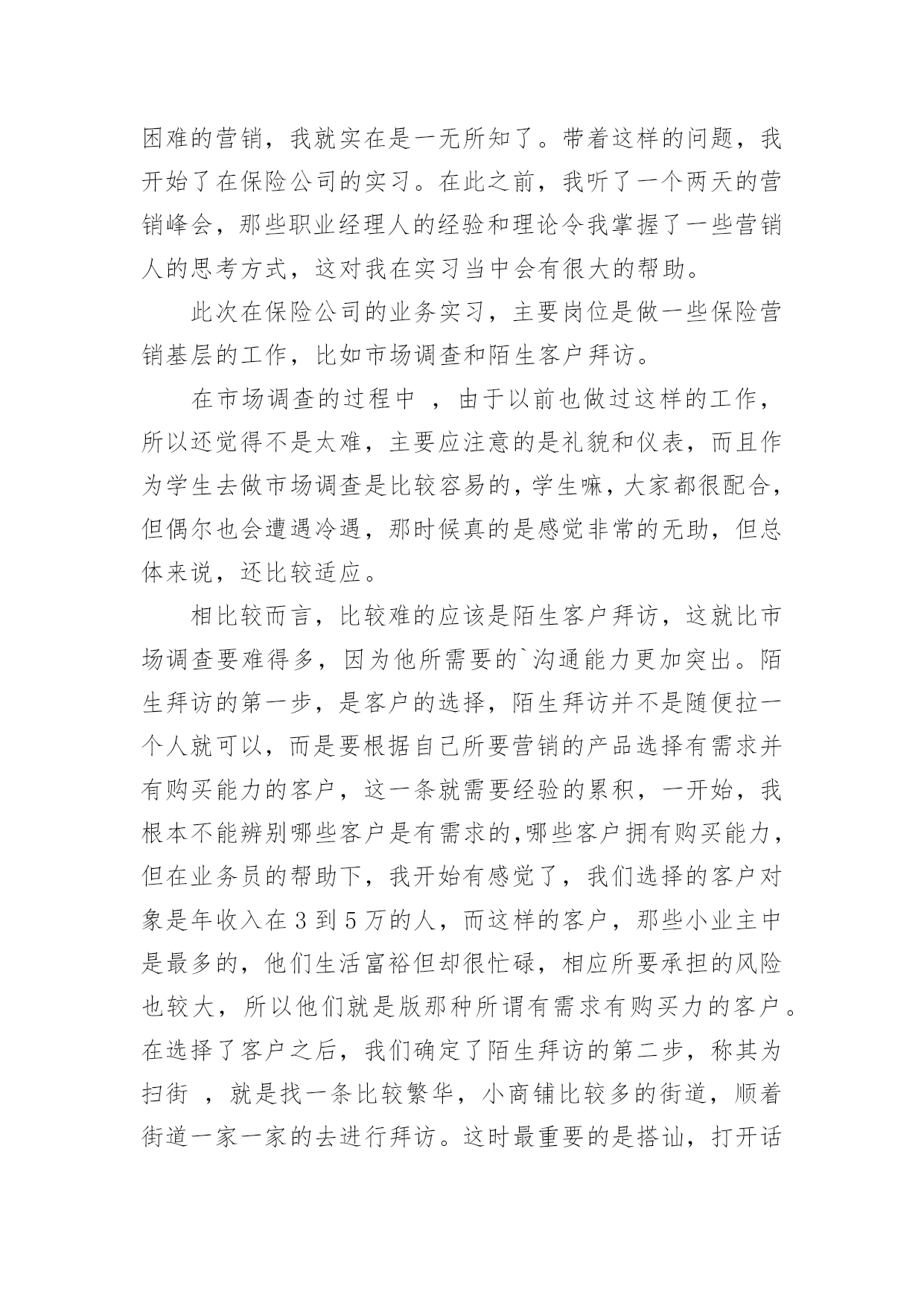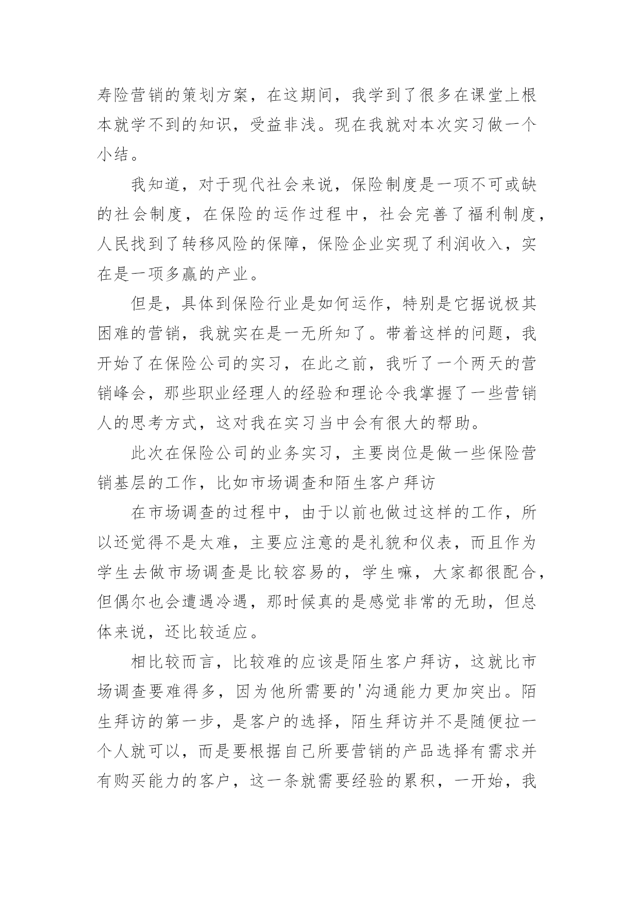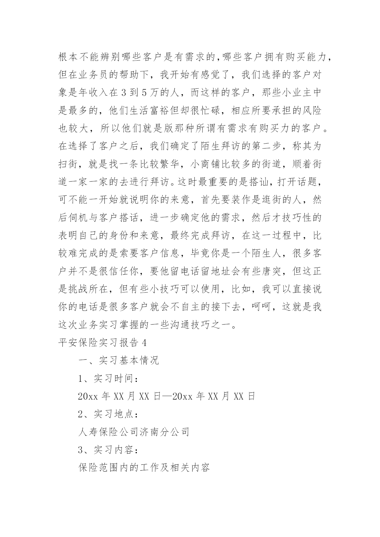 平安保险实习报告平安保险实习报告随着个人的素质不断提高,报告使用的次数愈发增长,写报告的时候要注意内容的完整。那么一般报告是怎么写的呢?下面是小编整理的平安保险实习报告,欢迎阅读,希望大家能够喜欢。平安保险实习报告1实习课程:市场营销策划实习地点:平安寿险云南分公司实习目标:通过本次营销策划的实习,将获得一定的关于保险的市场知识,并掌握一定的保险营销技巧。时间过得真快,我们暑假的第一轮营销策划实训就快过去了。在这期间,我们应学院安排,到平安寿险昆明分公司进行了业务实习,并根据所收获的东西得出了一份针对平安寿险营销的策划方案,在这期间,我学到了很多在课堂上根本就学不到的知识,受益非浅。现在我就对本次实习做一个小结。我知道,对于现代社会来说,保险制度是一项不可或缺的社会制度,在保险的运作过程中,社会完善了福利制度,人民找到了转移风险的保障,保险企业实现了利润收入,实在是一项多赢的产业。但是,具体到保险行业是如何运作,特别是它据说极其困难的营销,我就实在是一无所知了。带着这样的问题,我开始了在保险公司的实习。在此之前,我听了一个两天的营销峰会,那些职业经理人的经验和理论令我掌握了一些营销人的思考方式,这对我在实习当中会有很大的帮助。此次在保险公司的业务实习,主要岗位是做一些保险营销基层的工作,比如市场调查和陌生客户拜访。在市场调查的过程中,由于以前也做过这样的工作,所以还觉得不是太难,主要应注意的是礼貌和仪表,而且作为学生去做市场调查是比较容易的,学生嘛,大家都很配合,但偶尔也会遭遇冷遇,那时候真的是感觉非常的无助,但总体来说,还比较适应。相比较而言,比较难的应该是陌生客户拜访,这就比市场调查要难得多,因为他所需要的`沟通能力更加突出。陌生拜访的第一步,是客户的选择,陌生拜访并不是随便拉一个人就可以,而是要根据自己所要营销的产品选择有需求并有购买能力的客户,这一条就需要经验的累积,一开始,我根本不能辨别哪些客户是有需求的,哪些客户拥有购买能力,但在业务员的帮助下,我开始有感觉了,我们选择的客户对象是年收入在3到5万的人,而这样的客户,那些小业主中是最多的,他们生活富裕但却很忙碌,相应所要承担的风险也较大,所以他们就是版那种所谓有需求有购买力的客户。在选择了客户之后,我们确定了陌生拜访的第二步,称其为扫街,就是找一条比较繁华,小商铺比较多的街道,顺着街道一家一家的去进行拜访。这时最重要的是搭讪,打开话题,可不能一开始就说明你的来意,首先要装作是逛街的人,然后伺机与客户搭话,进一步确定他的需求,然后才技巧性的表明自己的身份和来意,最终完成拜访,在这一过程中,比较难完成的是索要客户信息,毕竟你是一个陌生人,很多客户并不是很信任你,要他留电话留地址会有些唐突,但这正是挑战所在,但有些小技巧可以使用,比如,我可以直接说你的电话是很多客户就会不自主的接下去,呵呵,这就是我这次业务实习掌握的一些沟通技巧之一。平安保险实习报告2一、实习目的提高实际工作能力,丰富社会经验,掌握信息管理知识在实际工作中的运用。二、公司简介20xx年1月份我十分有幸的来到中国平安保险(集团)股份有限公司实习。在去之前,我对它不是很了解,随着后来在平安的工作慢慢了解到中国平安保险(集团)股份有限公司(以下简称“中国平安”)是中国第一家以保险为核心的,融证券、信托、银行、资产管理、企业年金等多元金融业务为一体的紧密、高效、多元的综合金融服务集团。公司成立于1988年,总部位于深圳。20xx年6詒>我的工作主要分为两个阶段,第一阶段在营业部。分担营业部的外勤工作。第二阶段是在培训部。当时平安公司正在进行1月增员的活动,对新员工的岗前培训需要做大量的资料整理工作。平安见闻一:每天8点30分的早会。每天早上八点半是平安公司上班的时候,公司的喇叭里就会响起动感十足的音乐。这时候所有员工都要开始接受严格的考勤。平安的早会内容和各个外勤人员息息相关,所以对外勤人员的早会出席率有着极高的要求,也和各外勤人员的工资挂钩。8点25分,外勤所有业务员和本部的内勤们在营业部的排队站好,本营业部经理站在队列前面。然后广播里宣布早会开始,每日的早会是由各个部门的职员轮流主持。早会的第一项是齐唱公司司歌《平安颂》,这首歌是郭锋专门为平安公司而做。歌词如下:四海之内,心手相牵,选择平安是你我的心愿;诚实、信任、进取、成就,我们的信念永远不变;让每一个早晨与平安相见,人生拥有温馨的家园;让每一颗心灵与平安相连,生命书写辉煌的诗篇。追求卓越,全心奉献,回馈社会是我们的诺言;和平、友爱、幸福、欢乐,人类走向灿烂的明天;让每一个早晨与平安相见,人生拥有温馨的家园;让每一颗心灵与平安相连,生命书写辉煌的诗篇。生命书写辉煌的诗篇。平安!平安!平安!(每次回来跟朋友说到平安每天早晨都会唱司歌,他们都会说是学松下幸