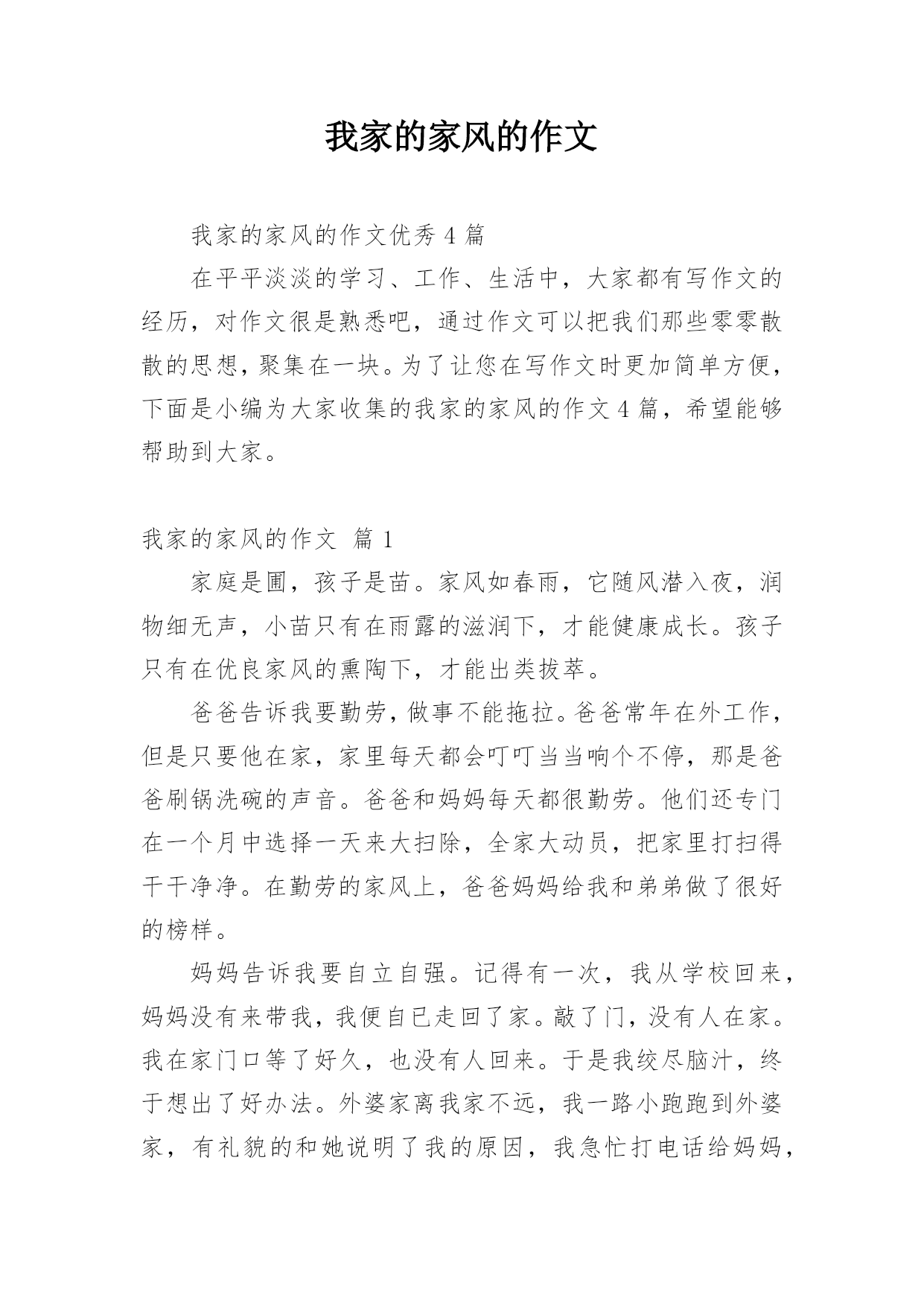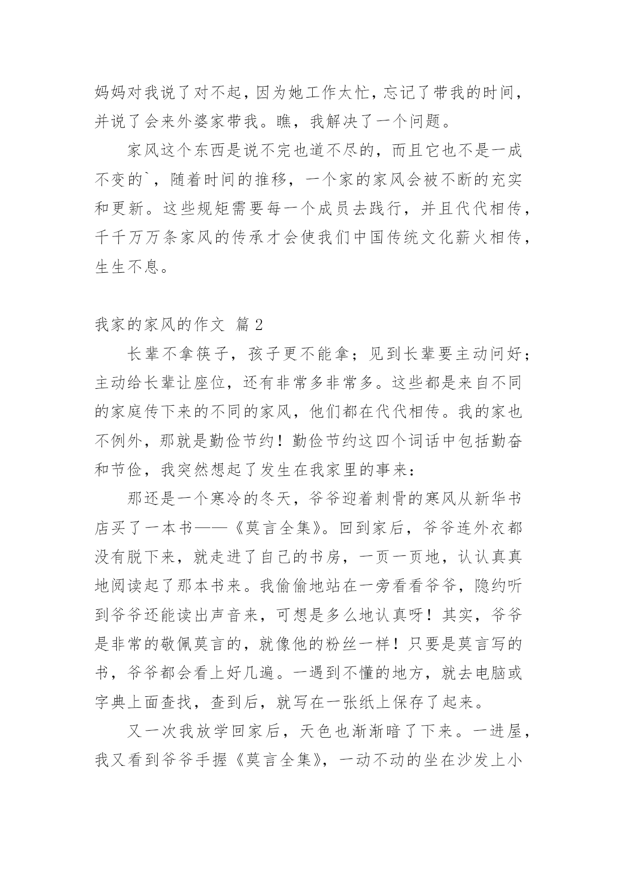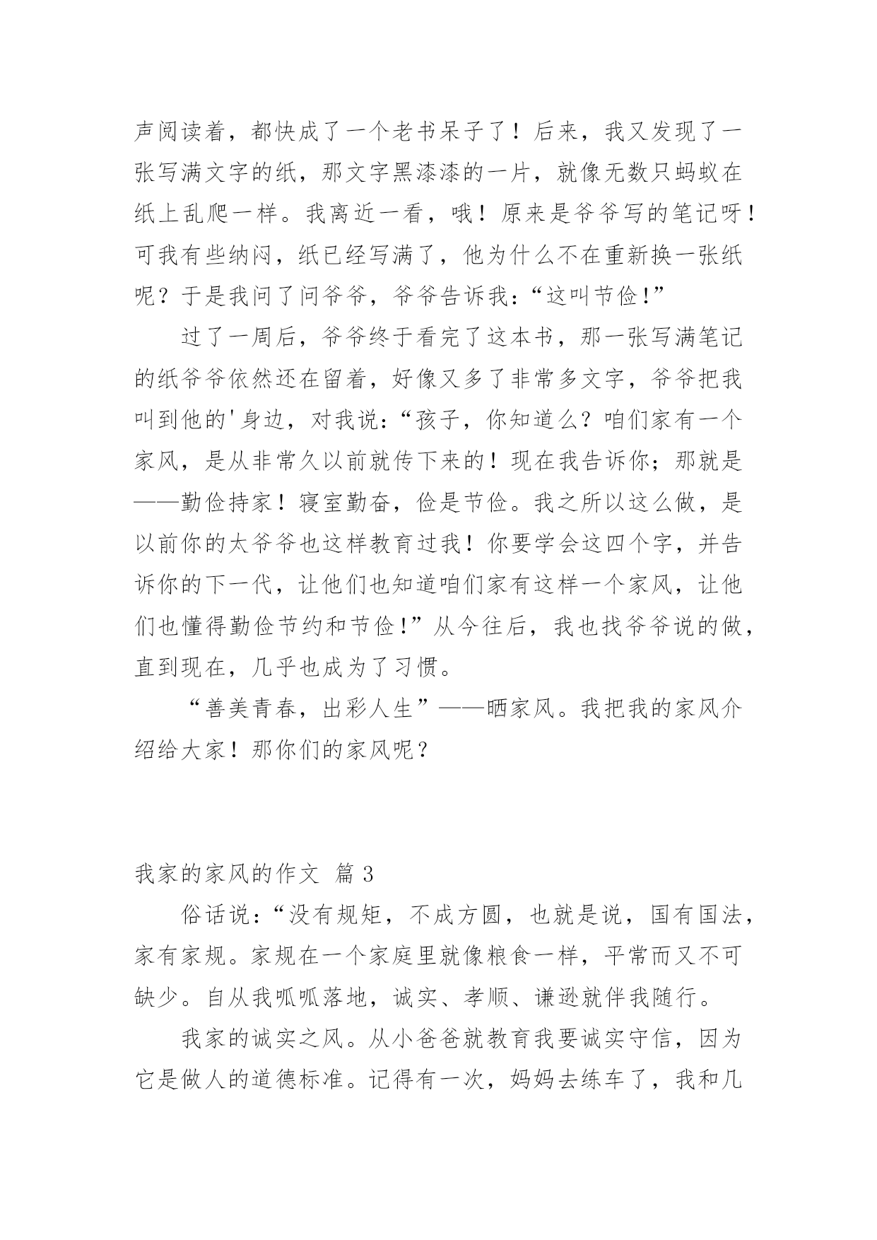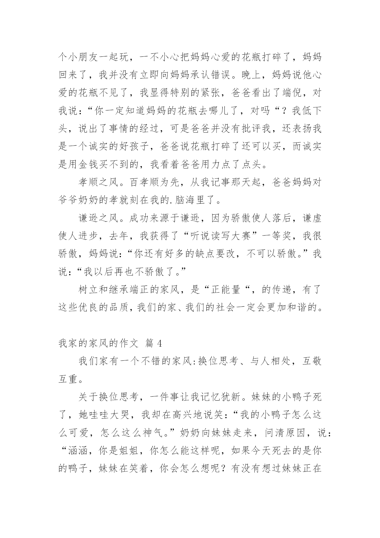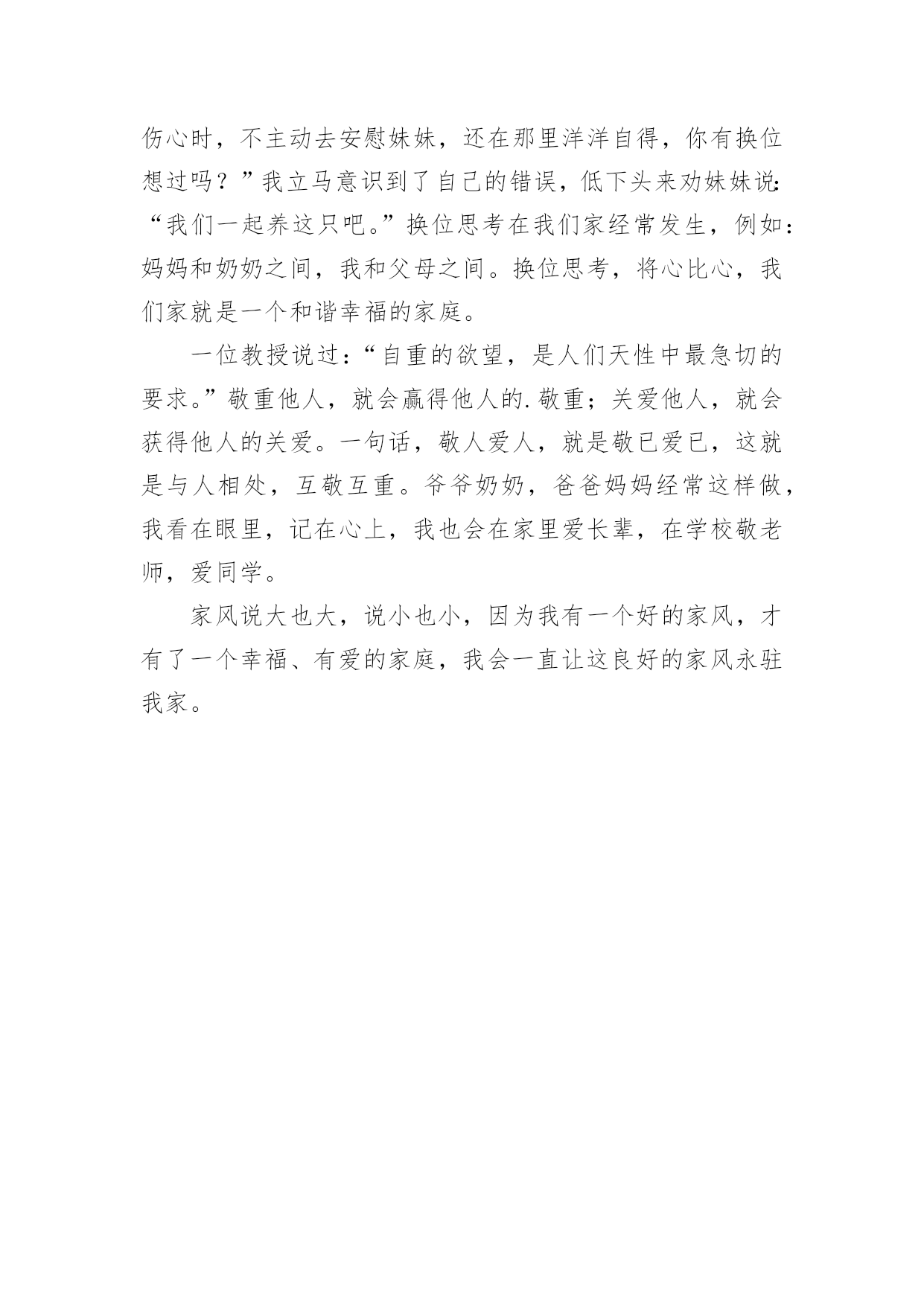我家的家风的作文我家的家风的作文优秀4篇在平平淡淡的学习、工作、生活中,大家都有写作文的经历,对作文很是熟悉吧,通过作文可以把我们那些零零散散的思想,聚集在一块。为了让您在写作文时更加简单方便,下面是小编为大家收集的我家的家风的作文4篇,希望能够帮助到大家。我家的家风的作文篇1家庭是圃,孩子是苗。家风如春雨,它随风潜入夜,润物细无声,小苗只有在雨露的滋润下,才能健康成长。孩子只有在优良家风的熏陶下,才能出类拔萃。爸爸告诉我要勤劳,做事不能拖拉。爸爸常年在外工作,但是只要他在家,家里每天都会叮叮当当响个不停,那是爸爸刷锅洗碗的声音。爸爸和妈妈每天都很勤劳。他们还专门在一个月中选择一天来大扫除,全家大动员,把家里打扫得干干净净。在勤劳的家风上,爸爸妈妈给我和弟弟做了很好的榜样。妈妈告诉我要自立自强。记得有一次,我从学校回来,妈妈没有来带我,我便自已走回了家。敲了门,没有人在家。我在家门口等了好久,也没有人回来。于是我绞尽脑汁,终于想出了好办法。外婆家离我家不远,我一路小跑跑到外婆家,有礼貌的和她说明了我的原因,我急忙打电话给妈妈,妈妈对我说了对不起,因为她工作太忙,忘记了带我的时间,并说了会来外婆家带我。瞧,我解决了一个问题。家风这个东西是说不完也道不尽的,而且它也不是一成不变的`,随着时间的推移,一个家的家风会被不断的充实和更新。这些规矩需要每一个成员去践行,并且代代相传,千千万万条家风的传承才会使我们中国传统文化薪火相传,生生不息。我家的家风的作文篇2长辈不拿筷子,孩子更不能拿;见到长辈要主动问好;主动给长辈让座位,还有非常多非常多。这些都是来自不同的家庭传下来的不同的家风,他们都在代代相传。我的家也不例外,那就是勤俭节约!勤俭节约这四个词话中包括勤奋和节俭,我突然想起了发生在我家里的事来:那还是一个寒冷的冬天,爷爷迎着刺骨的寒风从新华书店买了一本书——《莫言全集》。回到家后,爷爷连外衣都没有脱下来,就走进了自己的书房,一页一页地,认认真真地阅读起了那本书来。我偷偷地站在一旁看看爷爷,隐约听到爷爷还能读出声音来,可想是多么地认真呀!其实,爷爷是非常的敬佩莫言的,就像他的粉丝一样!只要是莫言写的书,爷爷都会看上好几遍。一遇到不懂的地方,就去电脑或字典上面查找,查到后,就写在一张纸上保存了起来。又一次我放学回家后,天色也渐渐暗了下来。一进屋,我又看到爷爷手握《莫言全集》,一动不动的坐在沙发上小声阅读着,都快成了一个老书呆子了!后来,我又发现了一张写满文字的纸,那文字黑漆漆的一片,就像无数只蚂蚁在纸上乱爬一样。我离近一看,哦!原来是爷爷写的笔记呀!可我有些纳闷,纸已经写满了,他为什么不在重新换一张纸呢?于是我问了问爷爷,爷爷告诉我:“这叫节俭!”过了一周后,爷爷终于看完了这本书,那一张写满笔记的纸爷爷依然还在留着,好像又多了非常多文字,爷爷把我叫到他的'身边,对我说:“孩子,你知道么?咱们家有一个家风,是从非常久以前就传下来的!现在我告诉你;那就是——勤俭持家!寝室勤奋,俭是节俭。我之所以这么做,是以前你的太爷爷也这样教育过我!你要学会这四个字,并告诉你的下一代,让他们也知道咱们家有这样一个家风,让他们也懂得勤俭节约和节俭!”从今往后,我也找爷爷说的做,直到现在,几乎也成为了习惯。“善美青春,出彩人生”——晒家风。我把我的家风介绍给大家!那你们的家风呢?我家的家风的作文篇3俗话说:“没有规矩,不成方圆,也就是说,国有国法,家有家规。家规在一个家庭里就像粮食一样,平常而又不可缺少。自从我呱呱落地,诚实、孝顺、谦逊就伴我随行。我家的诚实之风。从小爸爸就教育我要诚实守信,因为它是做人的道德标准。记得有一次,妈妈去练车了,我和几个小朋友一起玩,一不小心把妈妈心爱的花瓶打碎了,妈妈回来了,我并没有立即向妈妈承认错误。晚上,妈妈说他心爱的花瓶不见了,我显得特别的紧张,爸爸看出了端倪,对我说:“你一定知道妈妈的花瓶去哪儿了,对吗“?我低下头,说出了事情的经过,可是爸爸并没有批评我,还表扬我是一个诚实的好孩子,爸爸说花瓶打碎了还可以买,而诚实是用金钱买不到的,我看着爸爸用力点了点头。孝顺之风。百孝顺为先,从我记事那天起,爸爸妈妈对爷爷奶奶的孝就刻在我的.脑海里了。谦逊之风。成功来源于谦逊,因为骄傲使人落后,谦虚使人进步,去年,我获得了“听说读写大赛”一等奖,我很骄傲,妈妈说:“你还有好多的缺点要改,不可以骄傲。”我说:“我以后再也不骄傲了。”树立和继承端正的家风,是“正能量“,的传递,有了这些优良的品质,我们的家、我们的社会一定会更加和谐的。我家的家风的作文篇4我们家有一个不错的家风:换位思考、与人相处,互敬互重。关于换位思考,一件事让我记忆犹新。妹妹的小鸭子死了,她哇哇大哭,我却在高兴地说笑:“我的小鸭子怎么这么可爱,怎么这么神气。”奶奶向妹