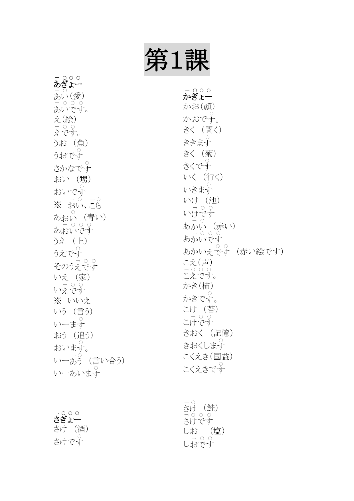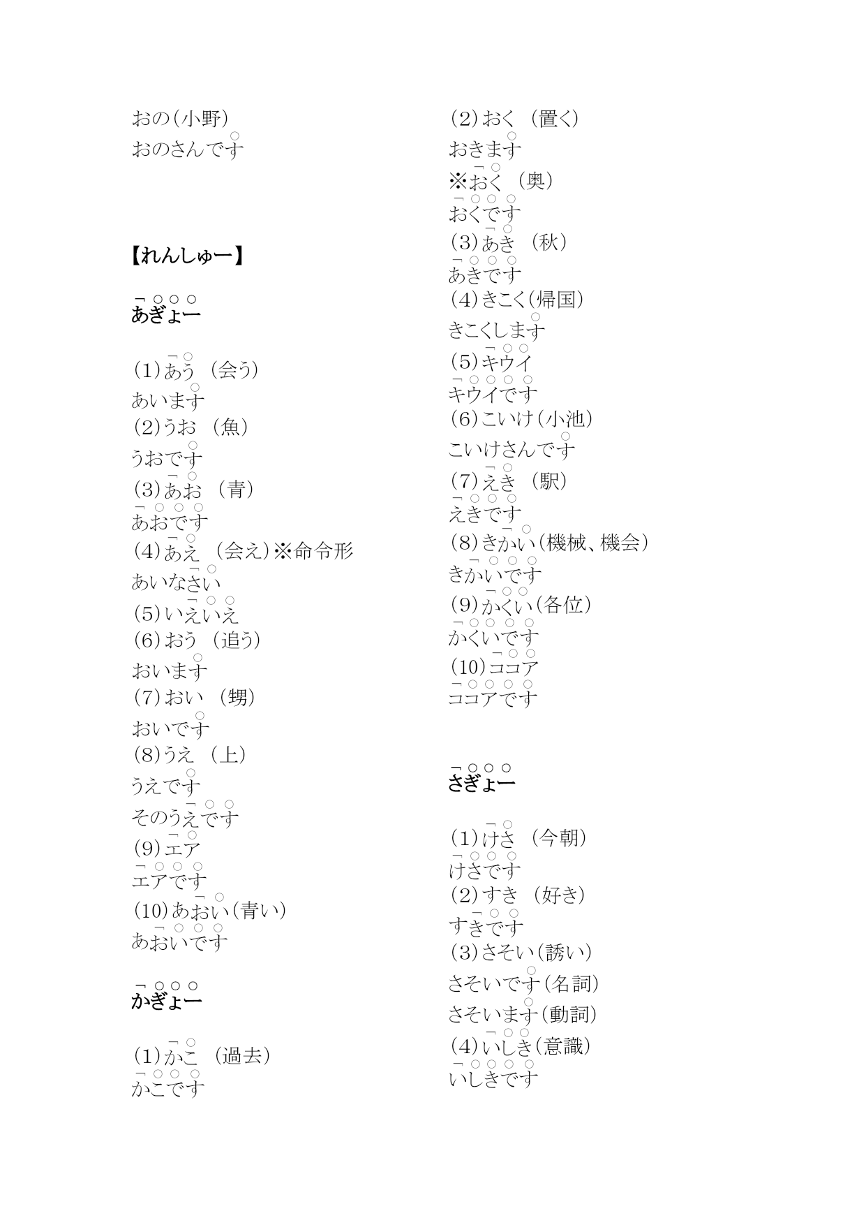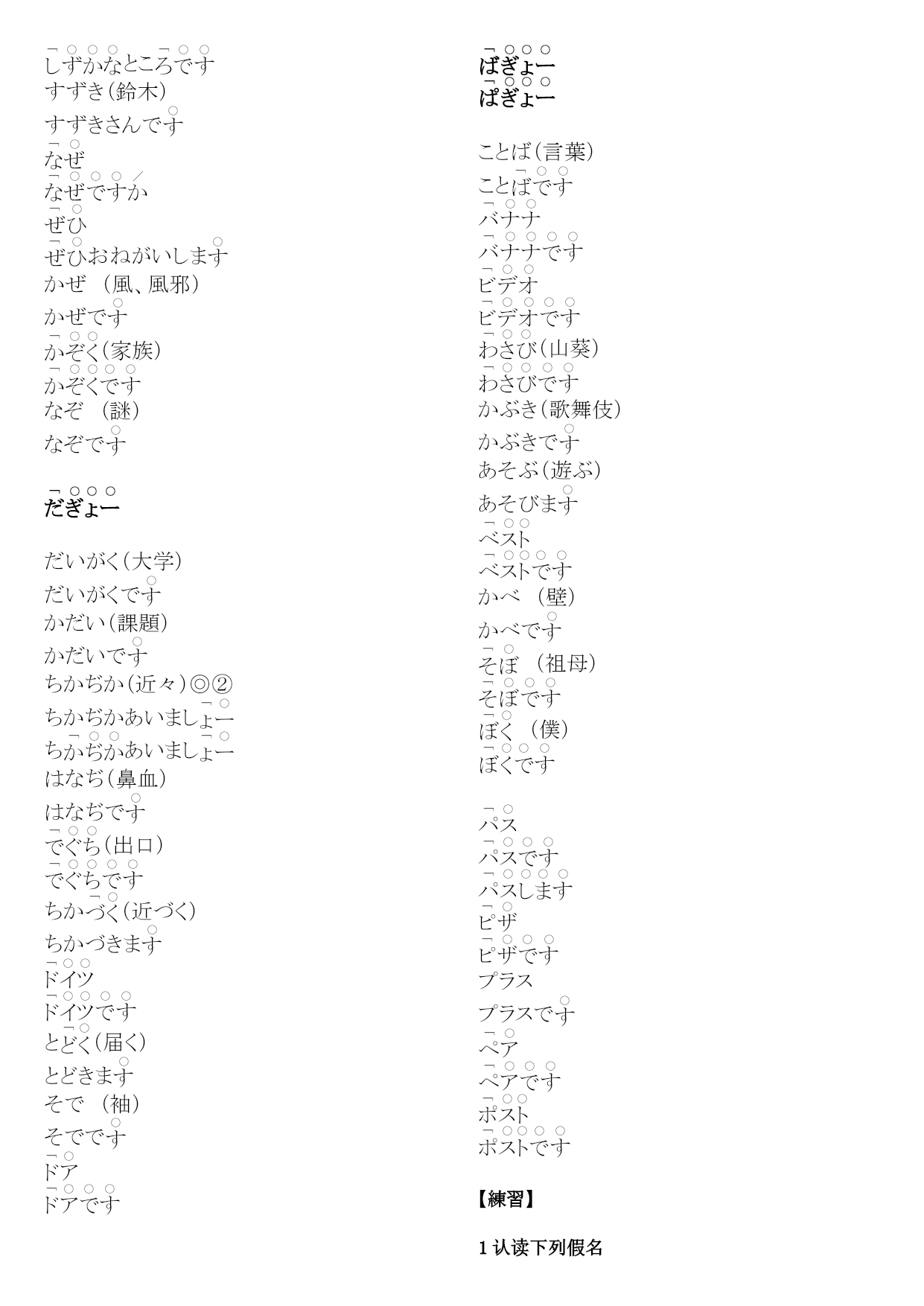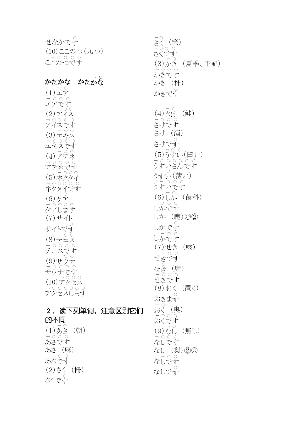 研究生二外発音练习编(完整版)实用资料(可以直接使用,可编辑完整版实用资料,欢迎下载)第1課(愛)。え(絵)。うお(魚)うおでさかなでおい(甥)おいで※、あ(青い)あうえ(上)うえでそのういえ(家)い※いいえいう(言う)いーまおう(追う)おいま。いー(言い合う)いーあいまかお(顔)かおで。きく(聞く)ききまきく(菊)きくでいく(行く)いきまいけ(池)いあ(赤い)ああかい(赤い絵です)こえ(声)。かき(柿)かきで。こけ(苔)こきおく(記憶)きおくしまこくえき(国益)こくえきでさけ(酒)さけで(鮭)しお(塩)しすいか(西瓜)すいかでこせき(戸籍)こせきで(嘘)(朝)あさ(麻)あでお(お寿司)おす(少し)す(世界)あそこあそこでた(高い)た。たかい(高井)たかいさんであした(明日)あし(知識)つくえ(机)つくえでとくい(得意)とくいでとつかう(使う)つかいまあいて(相手)あいおとこ(男)おととし(年)と(都市)なつ(夏)ななく(泣く)なきまいちにち(一日)いちににく(肉)にいぬ(犬)いぬの(布)ぬので(ねこ)おかね(お金)おかねでいのち(命)(斧)おの(小野)おのさんで【れんしゅー】(1)(会う)あいま(2)うお(魚)うおで(3)(青)(4)(会え)※命令形あいな(5)い(6)おう(追う)おいま(7)おい(甥)おいで(8)うえ(上)うえでそのう(9)(10)あ(青い)あ(1)(過去)(2)おく(置く)おきま※(奥)(3)(秋)(4)きこく(帰国)きこくしま(5)(6)こいけ(小池)こいけさんで(7)(駅)(8)き(機械、機会)き(9)(各位)(10)(1)(今朝)(2)すき(好き)す(3)さそい(誘い)さそいで(名詞)さそいま(動詞)(4)(意識)(5)お(お菓子)お(6)くせ(癖)く(7)(基礎)(8)かそく(加速)かそくしま(9)おさけ(お酒)おさけで(10)こくせき(国籍)こくせきで(1)たけ(竹)たけで(2)(外)(3)(幾つ)?(4)ちかい(近い)ちちかい(誓い)ちかいで(5)たいせつ(大切)たいせつでたいせつなも(6)くち(口)くちで(7)くつ(靴)く(8)あ(熱い)あ(9)こ(答え)こ(10)ちかてつ(地下鉄)ちかてつで(1)(何)?(2)(兄)(3)あね(姉)あねで(4)てぬき(手抜き)てぬ(5)(熱意)(6)(絹)(7)にし(にし)にしで(8)くに(くに)くにでく(9)せなか(背中)せなかで(10)ここのつ(九つ)こかたかなかた(1)(2)(3)(4)(5)(6)(7)サイトサイトで(8)(9)(10)2.读下列单词,注意区别它们的不同(1)(朝)あさ(麻)あ(2)さく(柵)さくで(策)(3)(夏季、下記)かき(柿)かきで(4)(鮭)さけ(酒)さけで(5)(臼井)う(薄い)う(6)(歯科)しか(鹿)◎②しかでし(7)せき(咳)せ(席)(8)おく(置く)おきま(奥)(9)(無し)なし(梨)②◎ななしで(10)(西鶴)さいかく(才覚)さいかくがありま(母)へた(下手)へひかく(比較)ひかくしまほし(星)ほしでさいふ(財布)さいふでふく(服)ふはたけ(畑)はたけでほか(他)ほかでひ(一つ)ひなまえ(名前)なまえであたま(頭)③②あたあみせ(店)みむかし(昔)むかしでさ(寒い)さ(飲む)のみま(雨)※あめで(飴)もも(桃)ももでやさい(野菜)やさいでは(早い、速い)は(屋根)ゆき(雪)ゆふゆ(冬)ふおかゆ(お粥)おかゆでひよこ(雛)ひよこで(良い)よこ(横)よこで(読む)よみまさくら(桜)さくらでか(辛い)か(利益)(理解)(留守)つ(作る)つくりまれきし(歴史)れきしでいろいろ(色々)いろいろありまろく(六)ろわたし(私)わたしでわかもの(若者)わかもので