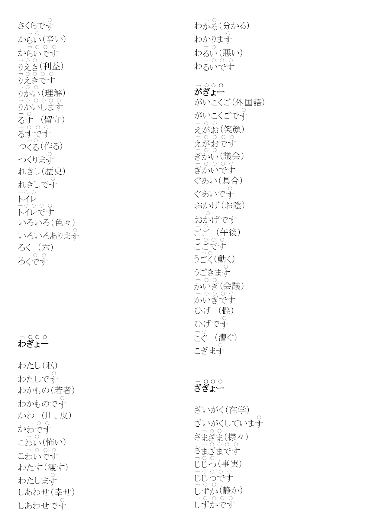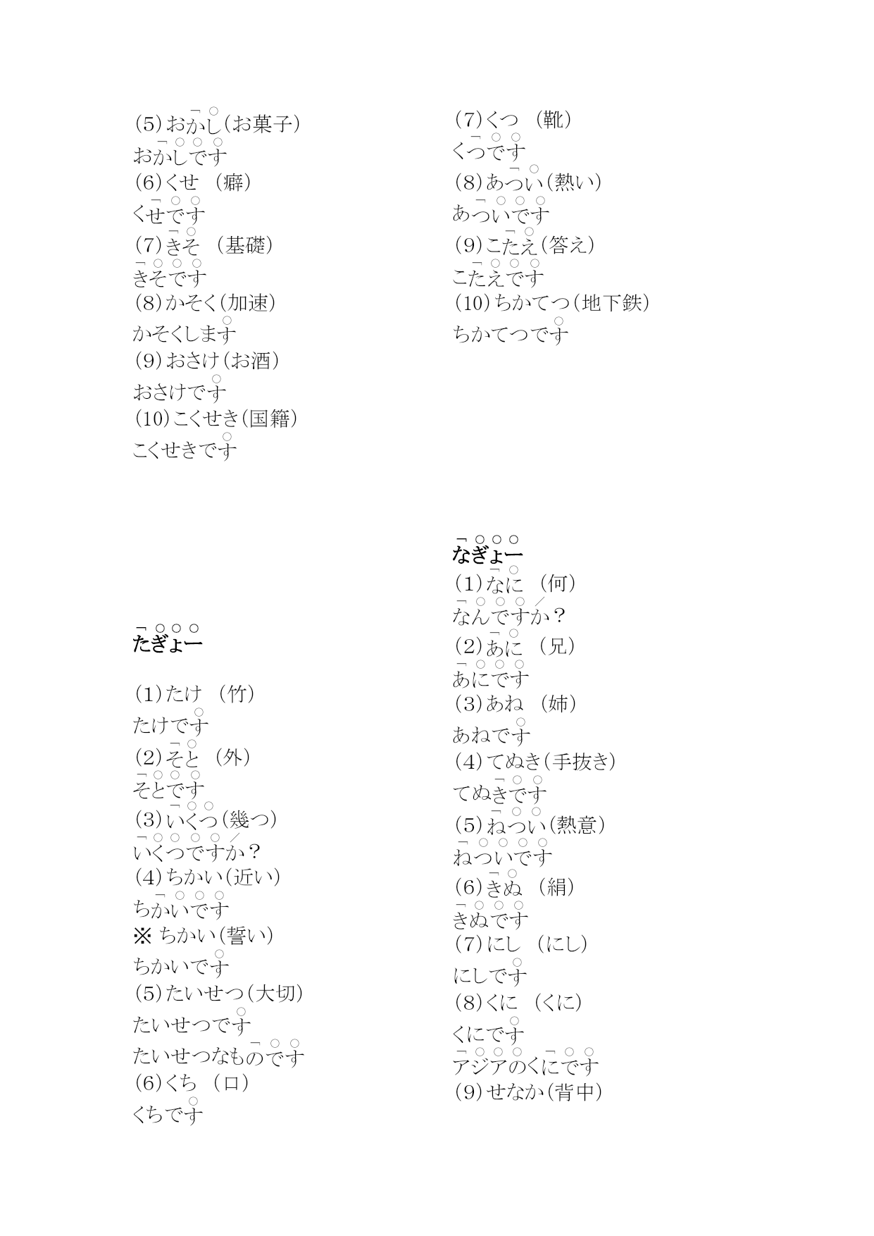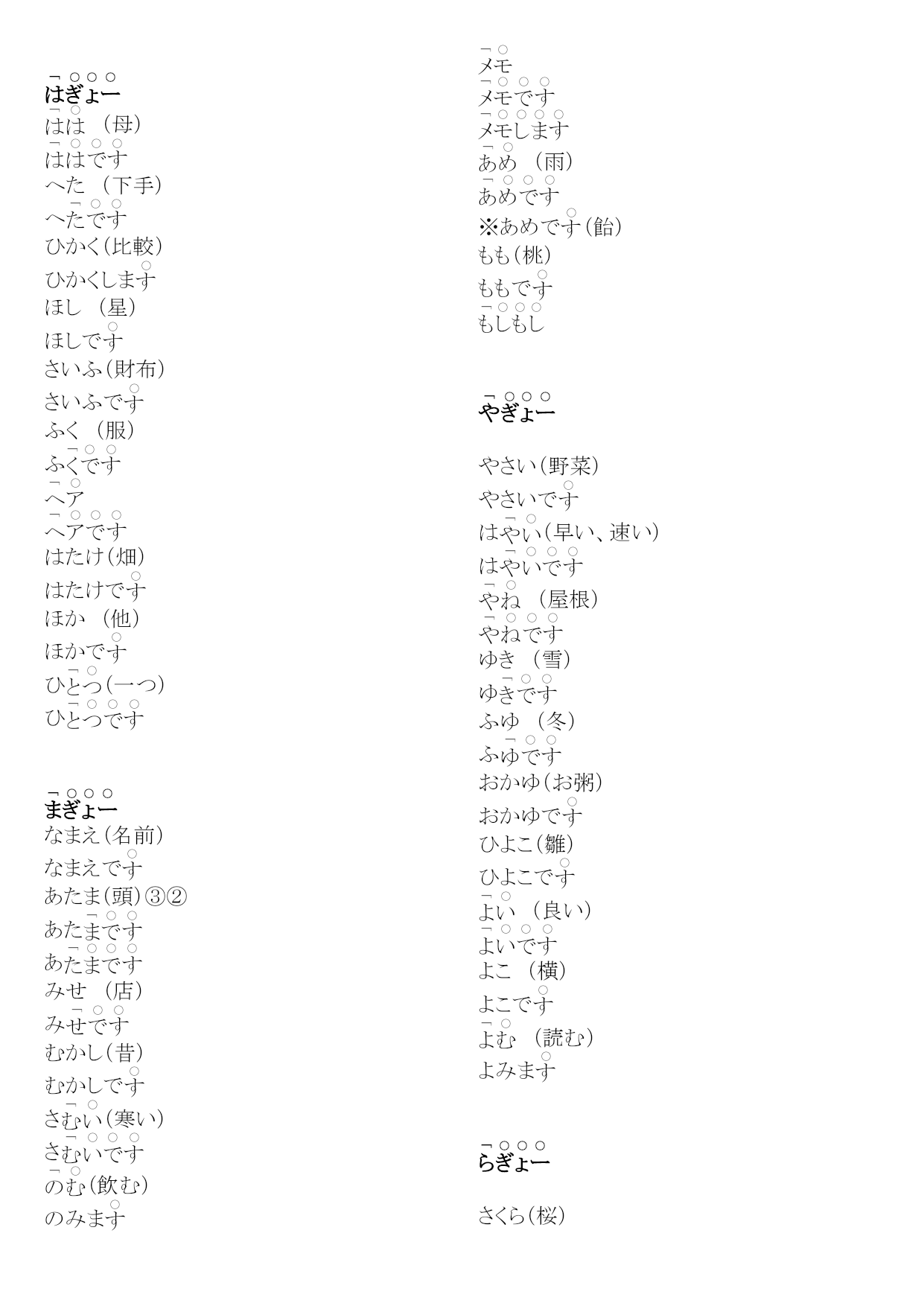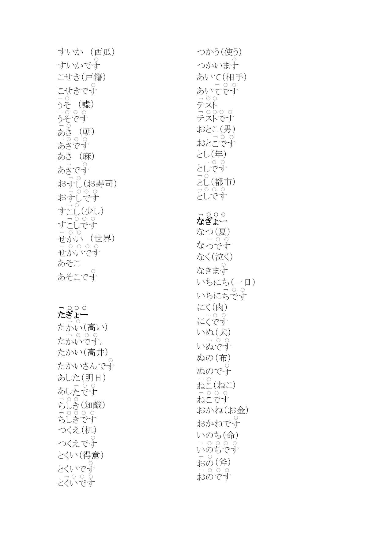 研究生二外発音练习编(完整版)实用资料(可以直接使用,可编辑完整版实用资料,欢迎下载)第1課(愛)。え(絵)。うお(魚)うおでさかなでおい(甥)おいで※、あ(青い)あうえ(上)うえでそのういえ(家)い※いいえいう(言う)いーまおう(追う)おいま。いー(言い合う)いーあいまかお(顔)かおで。きく(聞く)ききまきく(菊)きくでいく(行く)いきまいけ(池)いあ(赤い)ああかい(赤い絵です)こえ(声)。かき(柿)かきで。こけ(苔)こきおく(記憶)きおくしまこくえき(国益)こくえきでさけ(酒)さけで(鮭)しお(塩)しすいか(西瓜)すいかでこせき(戸籍)こせきで(嘘)(朝)あさ(麻)あでお(お寿司)おす(少し)す(世界)あそこあそこでた(高い)た。たかい(高井)たかいさんであした(明日)あし(知識)つくえ(机)つくえでとくい(得意)とくいでとつかう(使う)つかいまあいて(相手)あいおとこ(男)おととし(年)と(都市)なつ(夏)ななく(泣く)なきまいちにち(一日)いちににく(肉)にいぬ(犬)いぬの(布)ぬので(ねこ)おかね(お金)おかねでいのち(命)(斧)おの(小野)おのさんで【れんしゅー】(1)(会う)あいま(2)うお(魚)うおで(3)(青)(4)(会え)※命令形あいな(5)い(6)おう(追う)おいま(7)おい(甥)おいで(8)うえ(上)うえでそのう(9)(10)あ(青い)あ(1)(過去)(2)おく(置く)おきま※(奥)(3)(秋)(4)きこく(帰国)きこくしま(5)(6)こいけ(小池)こいけさんで(7)(駅)(8)き(機械、機会)き(9)(各位)(10)(1)(今朝)(2)すき(好き)す(3)さそい(誘い)さそいで(名詞)さそいま(動詞)(4)(意識)(5)お(お菓子)お(6)くせ(癖)く(7)(基礎)(8)かそく(加速)かそくしま(9)おさけ(お酒)おさけで(10)こくせき(国籍)こくせきで(1)たけ(竹)たけで(2)(外)(3)(幾つ)?(4)ちかい(近い)ちちかい(誓い)ちかいで(5)たいせつ(大切)たいせつでたいせつなも(6)くち(口)くちで(7)くつ(靴)く(8)あ(熱い)あ(9)こ(答え)こ(10)ちかてつ(地下鉄)ちかてつで(1)(何)?(2)(兄)(3)あね(姉)あねで(4)てぬき(手抜き)てぬ(5)(熱意)(6)(絹)(7)にし(にし)にしで(8)くに(くに)くにでく(9)せなか(背中)せなかで(10)ここのつ(九つ)こかたかなかた(1)(2)(3)(4)(5)(6)(7)サイトサイトで(8)(9)(10)2.读下列单词,注意区别它们的不同(1)(朝)あさ(麻)あ(2)さく(柵)さくで(策)(3)(夏季、下記)かき(柿)かきで(4)(鮭)さけ(酒)さけで(5)(臼井)う(薄い)う(6)(歯科)しか(鹿)◎②しかでし(7)せき(咳)せ(席)(8)おく(置く)おきま(奥)(9)(無し)なし(梨)②◎ななしで(10)(西鶴)さいかく(才覚)さいかくがありま(母)へた(下手)へひかく(比較)ひかくしまほし(星)ほしでさいふ(財布)さいふでふく(服)ふはたけ(畑)はたけでほか(他)ほかでひ(一つ)ひなまえ(名前)なまえであたま(頭)③②あたあみせ(店)みむかし(昔)むかしでさ(寒い)さ(飲む)のみま(雨)※あめで(飴)もも(桃)ももでやさい(野菜)やさいでは(早い、速い)は(屋根)ゆき(雪)ゆふゆ(冬)ふおかゆ(お粥)おかゆでひよこ(雛)ひよこで(良い)よこ(横)よこで(読む)よみまさくら(桜)さくらでか(辛い)か(利益)(理解)(留守)つ(作る)つくりまれきし(歴史)れきしでいろいろ(色々)いろいろありまろく(六)ろわたし(私)わたしでわかもの(若者)わかもので
