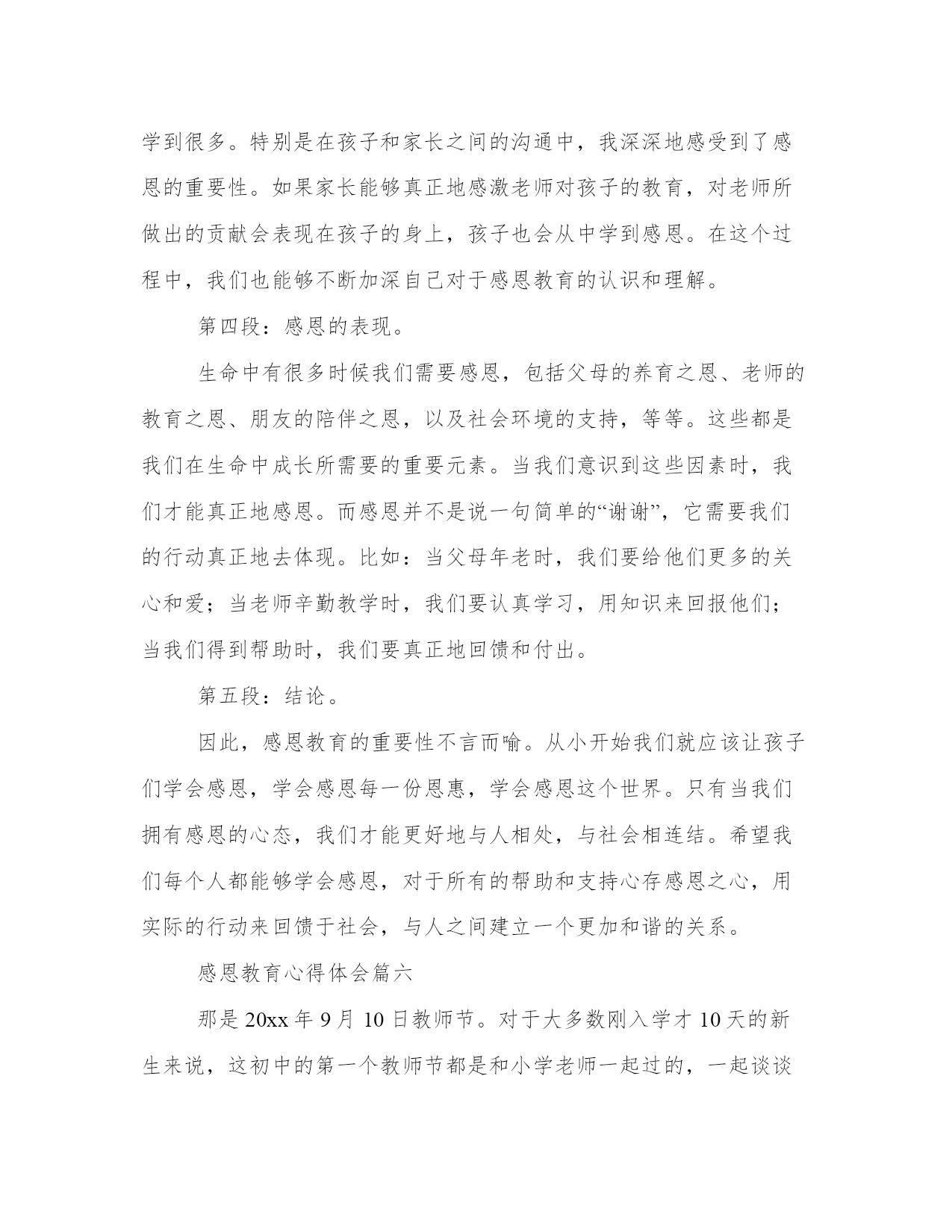 最新感恩教育心得体会(模板8篇)我们在一些事情上受到启发后,应该马上记录下来,写一篇心得体会,这样我们可以养成良好的总结方法。心得体会对于我们是非常有帮助的,可是应该怎么写心得体会呢?下面我给大家整理了一些心得体会范文,希望能够帮助到大家。感恩教育心得体会篇一“谢谢你陪我一生,让我有勇气做我自己,谢谢你的缘分,我也会好好珍惜。”歌声触动了我的心弦,让我不由自主地唱起了歌。一个阳光明媚的早晨,我校安排了一场“感恩教育”讲座,由名师关彦主讲。她的话语是如此的强烈和有力,以至于在场的每个人都激动的落下了泪水。你们,捏大腿,肯定会痛的,更何况这个老妈用刀子把大腿上的肉,一块一块地砍了……。爸爸妈妈,等你们老了,我不会做事,我会细心耐心地教你们,因为,曾经,你们也教过我很辛苦。我承认我以前做过这些事情,我没有向他们道歉,因为我没有勇气,但我知道我错了……。父亲是船,母亲是帆,承载着小我,乘风破浪,承担一切危险,让我拥有安全的环境和健康的身体。我仰望蓝天,真想大声说:“父母,我永远爱你!今生我爱你,下辈子我也爱你!”游走于知识的海洋-老师!老师不详。我们不给他们任何东西。政府只是给他们一些薪水,但他们会尽力为我们服务。老师们常常站在讲台上,穿梭于课桌之间,为我们铺平了人生的道路,只为看看我们能不能走那条路。周末我们开心玩耍的时候,老师正在为我们批改一份又一份的作业;当我们入睡时,老师正在备课;当我们学不会知识的时候,老师可是我尽力教我们了,老师,多么棒的老师啊!我们有时会在课堂上交谈,但你知道吗?在这堂课上,老师花了多少分钟准备这门课,准备这40分钟的课?所以,我们要尊重老师,尊重他的每一堂课。再次仰望蓝天,天空依旧那么蓝,好想大声说出来;“老师,您辛苦了!我爱您,我永远不会忘记您!”我还要感谢我的同学们,是他们给了我友谊,给了我朋友,给了我帮助;我也想感谢那些伤害过我的人。他们让我变得坚强和勇敢。我也想感谢很多人……就像天上的星星,沙滩上的沙子。不详,数不胜数。今天,我终于长大了,学会了感恩……感谢关燕的讲座。每个人都心存感激,那个世界会变得更好,变得更加辉煌!从此,让世界的每一个角落都充满感恩!愿感恩之神捆绑我们,永存人间!感恩教育心得体会篇二第一段:引言(200字左右)。教育是每个人一生中最重要的事情之一,它不仅仅是传授知识,更是培养素质、塑造品德的过程。作为受教育者,我们应当心怀感恩之情。感恩老师的辛勤付出和指导,感恩家庭的支持和鼓励。通过接受教育这一过程,我们才能得到改变和成长。在接受教育的过程中,我深刻认识到教育的重要性和感恩的意义。第二段:感恩老师(200字左右)。作为学生,我们能够接受教育离不开老师的辛勤付出和指导。老师们用心教育、悉心呵护着我们,他们默默地为我们的成长付出着无数的努力和汗水。在学习中遇到困难时,老师们总是耐心地解答我们的问题,给予我们帮助和鼓励。他们不仅仅是知识的传授者,更是我们日常生活中的良师益友。正是有了老师们的指导和关怀,我们才能获得自信和勇气,追求更高的目标。第三段:感恩父母(200字左右)。教育的基础来自父母的家庭教育。父母给予我们的不仅仅是物质的支持,更是心灵的滋养。他们给予我们无私的爱,悉心地教育我们,让我们在磨难中成长。他们教会我们做人的道理,引导我们去追求真理和美好。他们经常给我们以鼓励和指导,教会我们谦逊、感恩和尊重他人。正是因为父母的爱和教育,我们才有了健康的人生观和价值观。第四段:感恩同学(200字左右)。在学校中,同学们是我们共同成长的伙伴。他们是我们学习的榜样,是我们竞争的对手,也是我们分享快乐和困难的朋友。他们在生活中给予我们支持和帮助,与我们共同度过了许多难忘的时刻。无论是课堂上的互动学习,还是课外的交流互动,每一个同学都在我们成长的道路上扮演着重要的角色。他们的存在让我们不再孤独,我们需要感恩和珍惜我们共同走过的时光。第五段:结论(200字左右)。教育是我们人生中的礼物,我们应当感恩这个礼物,充分利用它的价值。在成长的过程中,我们要时刻保持感恩之心,感恩教育给予我们的知识和智慧,感恩老师的辛勤教导,感恩父母的无私奉献,感恩同学们的陪伴和支持。只有心怀感恩,我们才能真正珍惜教育的机会,努力学习,做到全面发展。让我们怀着感恩的心情,走好自己的成长之路。感恩教育心得体会篇三十月份,我们班开展了“学会感恩,感知责任”的主题活动,通过活动我们有许多感触和收获。当我们还是襁褓中的婴儿时,我们是极易夭折的;当我们青春年少不谙世事时,我们也极易误入歧途。今天,我们能强健而正直的生活着,我们应该对那些在我们生命历程中用关爱扶持我们的人,用智慧启迪我们的人,用美德陶冶我们的人,用真情沐浴我们的人,心存感激。心存感激,是一种朗朗的心境,