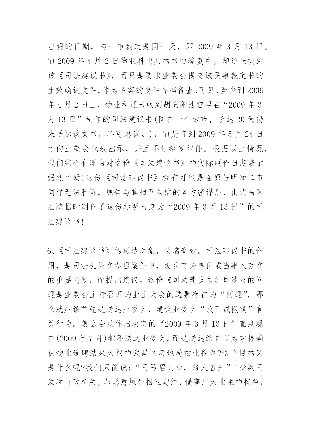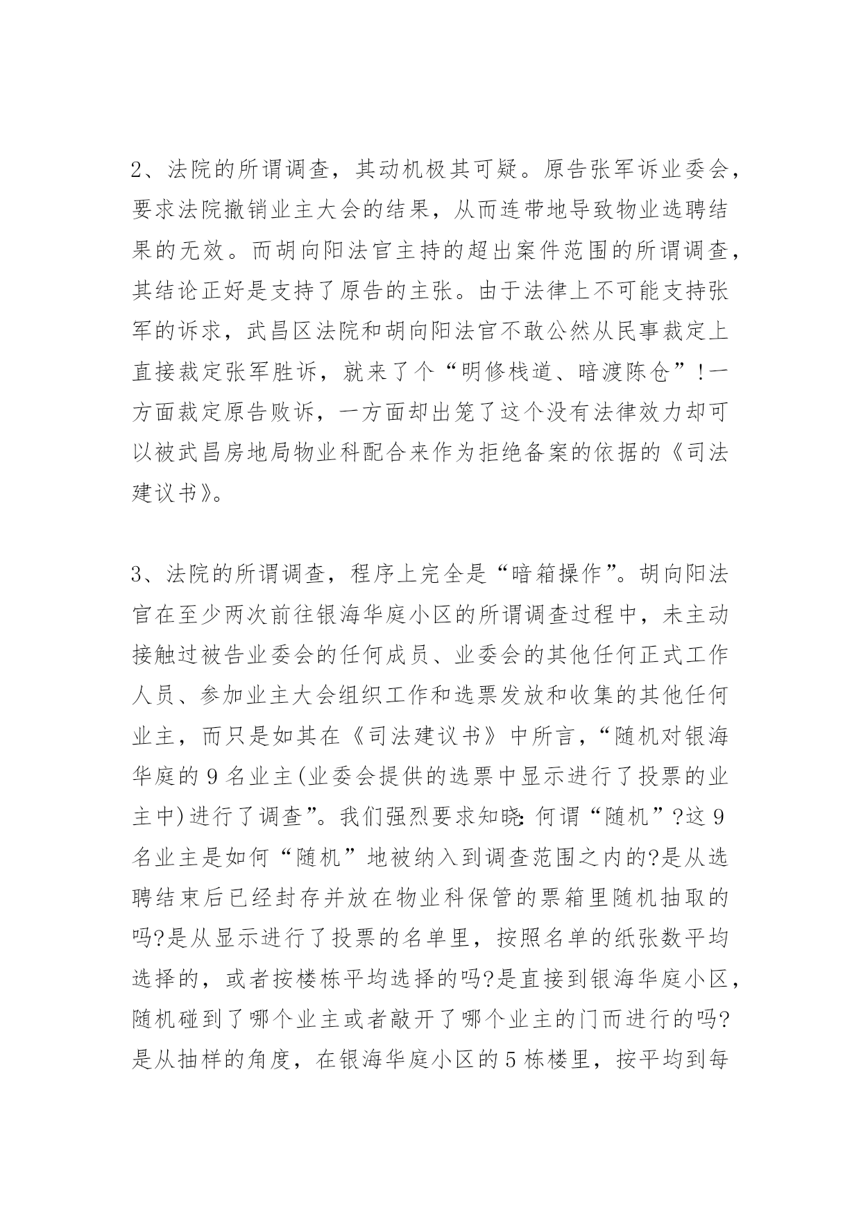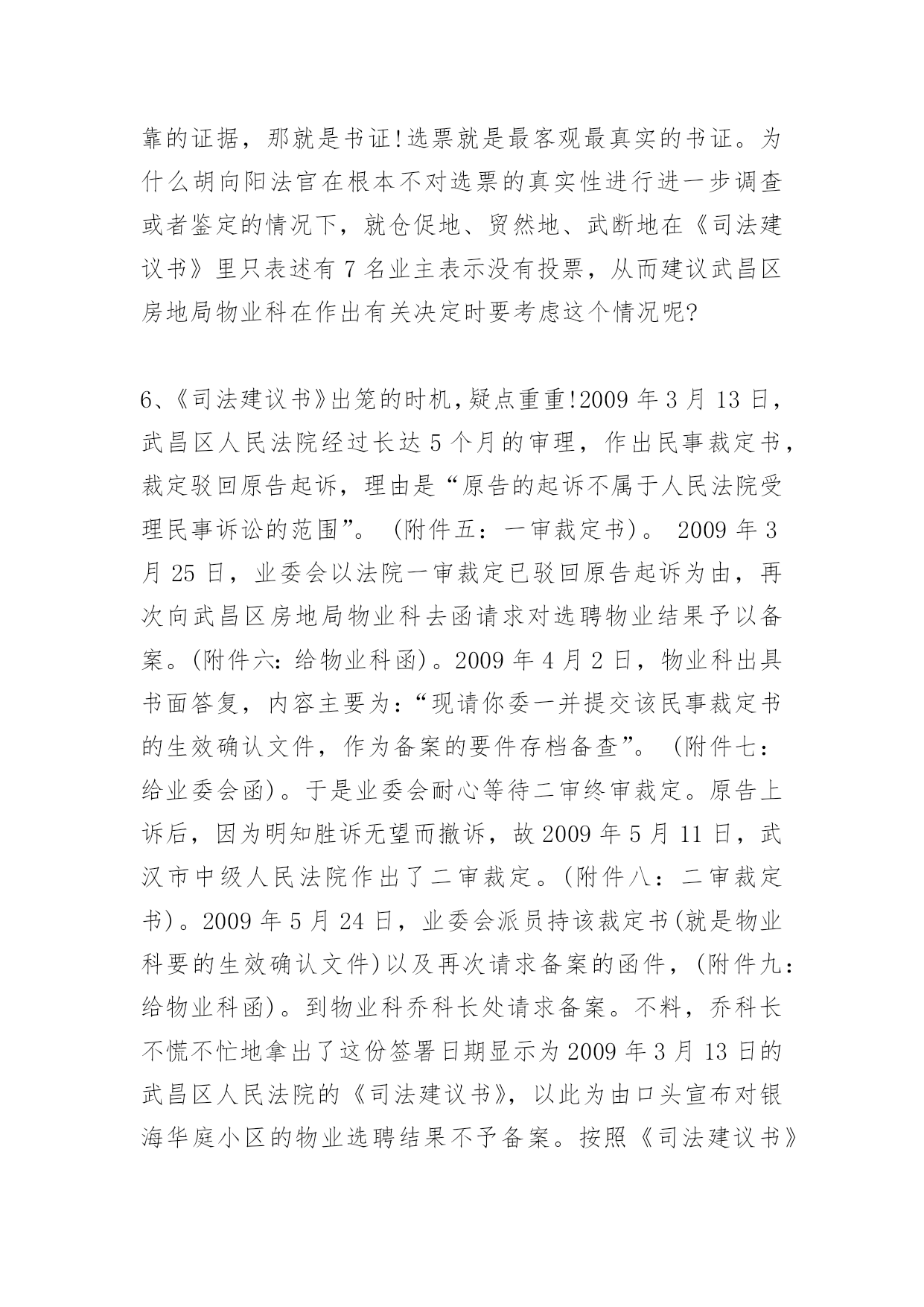 消防司法建议书消防司法建议书蹊跷的动机,蹊跷的时机,蹊跷的程序,蹊跷的结论驳武昌区人民法院的一份《司法建议书》武昌区人民法院于2009年3月13日向武昌区房地局物业科出具了一份《司法建议书》,内容大致是:“我院在审理原告张军诉银海华庭小区业委会的案件过程中,随机对银海华庭的9名业主(业委会提供的选票中显示进行了投票的业主中)进行了调查,其中,3名业主表示没有参加业委会就选聘物业公司召开的业主大会的投票,4名业主表示没有参加投票并称业委会弄虚作假。建议物业科在作出有关行政决定时,考虑上述情况”。就此《司法建议书》,银海华庭业委会和银海华庭广大业主向武昌区人民法院和该院代理审判员胡向阳提出强烈质疑,并坚决要求武昌区人民法院撤销该《司法建议书》,同时彻查该《司法建议书》出笼的层层黑幕!理由如下:1、法院的所谓调查,违反了民事诉讼中的“不告不理”原则。原告张军(银海华庭小区业主)诉业委会,理由是:在业委会主持召开的与选聘物业公司相关的第二次业主大会的选票中,同意以招标方式选聘物业公司的选票,虽然超过总投票数的一半,但没有超过全体业主的半数,因此原告要求法院判决撤销第二次业主大会的结果。(附件四:起诉书)。显然,原告诉诸法院,针对的是票数多少而引起的效力问题,而不是选票的真实性问题。而该案代理审判员胡向阳却无视被告律师的抗-议,在被告律师缺席的情况下,多次前往银海华庭小区,主动主持针对选票真实性的调查。此所谓调查行为违反了“不告不理”原则。对胡向阳法官主持这一调查的动机,我们表示强烈质疑!《银海华庭部分业主曾到武昌区法院向胡向阳法官本人介绍了原告张军的背景。原告张军,系银海华庭业主,湖北黄冈人,与银海华庭开发商银海置业公司老总曾文涛是老乡,在银海华庭二号楼商铺开设“百帝园”餐厅。“百帝园”餐厅未经业委会或业主大会同意,侵占业主共有建筑部位,私建门楣;(照片19)。未经业委会或业主大会同意,“百帝园”餐厅的员工长期居住在小区泛会所,现因故已搬出;“百帝园”餐厅私开消防通道,其员工不受任何门禁监控,自由出入小区;(照片17)。“百帝园”餐厅霸占小区业主共有部位作为其停车常(照片03)。对这些行为,业委会多次向五洲物业公司去函,要求物业公司予以制止。但由于五洲物业与开发商本为一体,故长期纵容“百帝园”餐厅的违法和侵权行为。因此,业主张军,最希望五洲物业公司继续留任,以继续袒护其在小区的种种特权和违法行为。》2、法院的所谓调查,其动机极其可疑。原告张军诉业委会,要求法院撤销业主大会的结果,从而连带地导致物业选聘结果的无效。而胡向阳法官主持的超出案件范围的所谓调查,其结论正好是支持了原告的主张。由于法律上不可能支持张军的诉求,武昌区法院和胡向阳法官不敢公然从民事裁定上直接裁定张军胜诉,就来了个“明修栈道、暗渡陈仓”!一方面裁定原告败诉,一方面却出笼了这个没有法律效力却可以被武昌房地局物业科配合来作为拒绝备案的依据的《司法建议书》。3、法院的所谓调查,程序上完全是“暗箱操作”。胡向阳法官在至少两次前往银海华庭小区的所谓调查过程中,未主动接触过被告业委会的任何成员、业委会的其他任何正式工作人员、参加业主大会组织工作和选票发放和收集的其他任何业主,而只是如其在《司法建议书》中所言,“随机对银海华庭的9名业主(业委会提供的选票中显示进行了投票的业主中)进行了调查”。我们强烈要求知晓:何谓“随机”?这9名业主是如何“随机”地被纳入到调查范围之内的?是从选聘结束后已经封存并放在物业科保管的票箱里随机抽取的吗?是从显示进行了投票的名单里,按照名单的纸张数平均选择的,或者按楼栋平均选择的吗?是直接到银海华庭小区,随机碰到了哪个业主或者敲开了哪个业主的门而进行的吗?是从抽样的角度,在银海华庭小区的5栋楼里,按平均到每栋楼约2名业主,来进行调查的吗?或者是事先收集了对选票的真实性有疑虑的业主名单,然后从这个名单里来随机进行调查的吗?不管怎样,既然《司法建议书》里说是“随机”,业委会作为被告,银海华庭广大业主作为利益攸关方,有权利知晓这个“随机”是怎么产生的!4、法院的所谓调查,程序上毫无公平和公正。既然是要调查选票的`真伪,除了“随机地对显示进行了投票的业主”进行调查取证之外,难道不应该找参与投票工作的有关工作人员进行询问吗?既然有业主说没有参加投票,按常理,就得接着询问一下有关工作人员,为什么业主表示没有参加投票,而在登记中却将其登记为参加了投票呢?既然是进行证人证言方面的调查,那么,与其调查内容有关的各方面证人,都要进行调查吧?这个基本的法律程序上的常识,难道胡向阳法官不懂吗?难道这就是武昌区人民法院的法官的专业素质吗?5、法院的所谓调查结论,更是荒唐无比!就算是调查是“随机”的,那么那7个“表示没有参加投票”的业主的表述,也只是属于证人证言。法院作事实上的