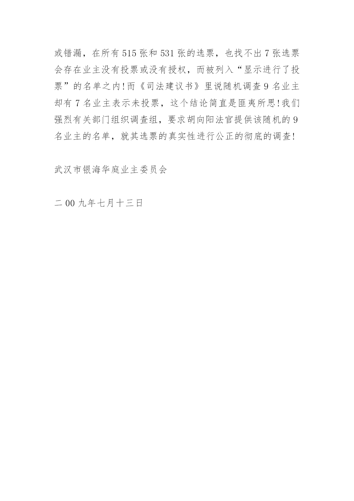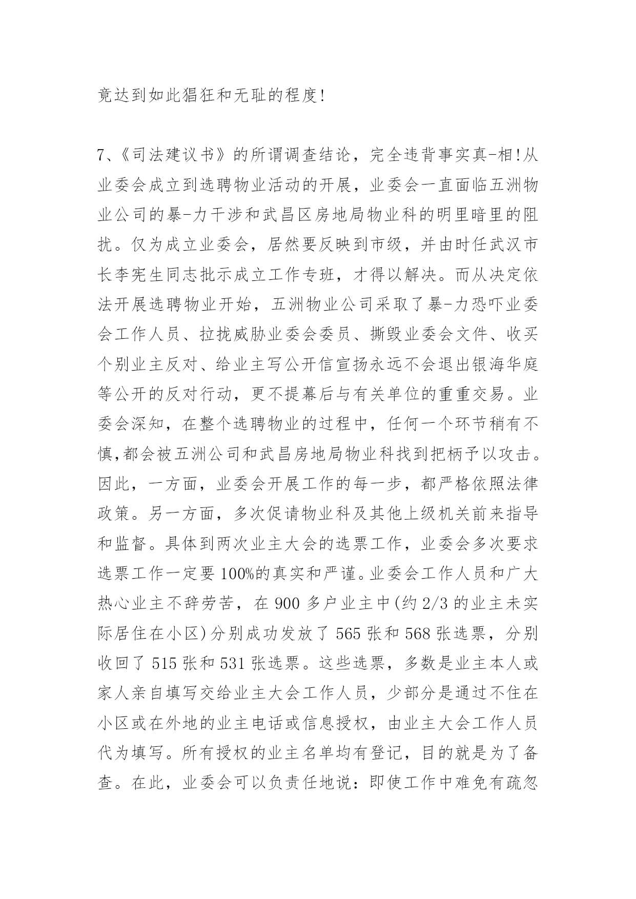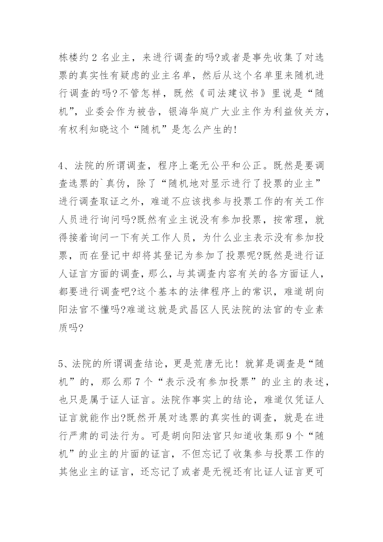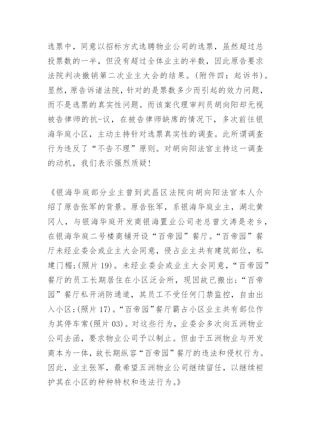 消防司法建议书消防司法建议书蹊跷的动机,蹊跷的时机,蹊跷的程序,蹊跷的结论驳武昌区人民法院的一份《司法建议书》武昌区人民法院于2009年3月13日向武昌区房地局物业科出具了一份《司法建议书》,内容大致是:“我院在审理原告张军诉银海华庭小区业委会的案件过程中,随机对银海华庭的9名业主(业委会提供的选票中显示进行了投票的业主中)进行了调查,其中,3名业主表示没有参加业委会就选聘物业公司召开的业主大会的投票,4名业主表示没有参加投票并称业委会弄虚作假。建议物业科在作出有关行政决定时,考虑上述情况”。就此《司法建议书》,银海华庭业委会和银海华庭广大业主向武昌区人民法院和该院代理审判员胡向阳提出强烈质疑,并坚决要求武昌区人民法院撤销该《司法建议书》,同时彻查该《司法建议书》出笼的层层黑幕!理由如下:1、法院的所谓调查,违反了民事诉讼中的“不告不理”原则。原告张军(银海华庭小区业主)诉业委会,理由是:在业委会主持召开的与选聘物业公司相关的第二次业主大会的选票中,同意以招标方式选聘物业公司的选票,虽然超过总投票数的一半,但没有超过全体业主的半数,因此原告要求法院判决撤销第二次业主大会的结果。(附件四:起诉书)。显然,原告诉诸法院,针对的是票数多少而引起的效力问题,而不是选票的真实性问题。而该案代理审判员胡向阳却无视被告律师的抗-议,在被告律师缺席的情况下,多次前往银海华庭小区,主动主持针对选票真实性的调查。此所谓调查行为违反了“不告不理”原则。对胡向阳法官主持这一调查的动机,我们表示强烈质疑!《银海华庭部分业主曾到武昌区法院向胡向阳法官本人介绍了原告张军的背景。原告张军,系银海华庭业主,湖北黄冈人,与银海华庭开发商银海置业公司老总曾文涛是老乡,在银海华庭二号楼商铺开设“百帝园”餐厅。“百帝园”餐厅未经业委会或业主大会同意,侵占业主共有建筑部位,私建门楣;(照片19)。未经业委会或业主大会同意,“百帝园”餐厅的员工长期居住在小区泛会所,现因故已搬出;“百帝园”餐厅私开消防通道,其员工不受任何门禁监控,自由出入小区;(照片17)。“百帝园”餐厅霸占小区业主共有部位作为其停车常(照片03)。对这些行为,业委会多次向五洲物业公司去函,要求物业公司予以制止。但由于五洲物业与开发商本为一体,故长期纵容“百帝园”餐厅的违法和侵权行为。因此,业主张军,最希望五洲物业公司继续留任,以继续袒护其在小区的种种特权和违法行为。》2、法院的所谓调查,其动机极其可疑。原告张军诉业委会,要求法院撤销业主大会的结果,从而连带地导致物业选聘结果的无效。而胡向阳法官主持的超出案件范围的所谓调查,其结论正好是支持了原告的主张。由于法律上不可能支持张军的诉求,武昌区法院和胡向阳法官不敢公然从民事裁定上直接裁定张军胜诉,就来了个“明修栈道、暗渡陈仓”!一方面裁定原告败诉,一方面却出笼了这个没有法律效力却可以被武昌房地局物业科配合来作为拒绝备案的依据的《司法建议书》。3、法院的所谓调查,程序上完全是“暗箱操作”。胡向阳法官在至少两次前往银海华庭小区的所谓调查过程中,未主动接触过被告业委会的任何成员、业委会的其他任何正式工作人员、参加业主大会组织工作和选票发放和收集的其他任何业主,而只是如其在《司法建议书》中所言,“随机对银海华庭的9名业主(业委会提供的选票中显示进行了投票的业主中)进行了调查”。我们强烈要求知晓:何谓“随机”?这9名业主是如何“随机”地被纳入到调查范围之内的?是从选聘结束后已经封存并放在物业科保管的票箱里随机抽取的吗?是从显示进行了投票的名单里,按照名单的纸张数平均选择的,或者按楼栋平均选择的吗?是直接到银海华庭小区,随机碰到了哪个业主或者敲开了哪个业主的门而进行的吗?是从抽样的角度,在银海华庭小区的5栋楼里,按平均到每栋楼约2名业主,来进行调查的吗?或者是事先收集了对选票的真实性有疑虑的业主名单,然后从这个名单里来随机进行调查的吗?不管怎样,既然《司法建议书》里说是“随机”,业委会作为被告,银海华庭广大业主作为利益攸关方,有权利知晓这个“随机”是怎么产生的!4、法院的所谓调查,程序上毫无公平和公正。既然是要调查选票的`真伪,除了“随机地对显示进行了投票的业主”进行调查取证之外,难道不应该找参与投票工作的有关工作人员进行询问吗?既然有业主说没有参加投票,按常理,就得接着询问一下有关工作人员,为什么业主表示没有参加投票,而在登记中却将其登记为参加了投票呢?既然是进行证人证言方面的调查,那么,与其调查内容有关的各方面证人,都要进行调查吧?这个基本的法律程序上的常识,难道胡向阳法官不懂吗?难道这就是武昌区人民法院的法官的专业素质吗?5、法院的所谓调查结论,更是荒唐无比!就算是调查是“随机”的,那么那7个“表示没有参加投票”的业主的表述,也只是属于证人证言。法院作事实上的