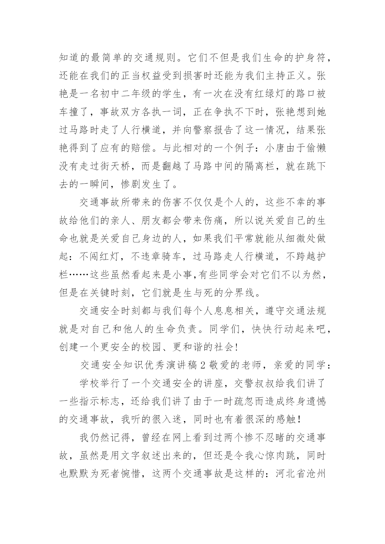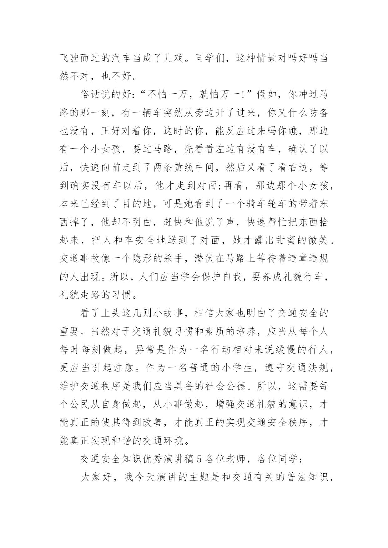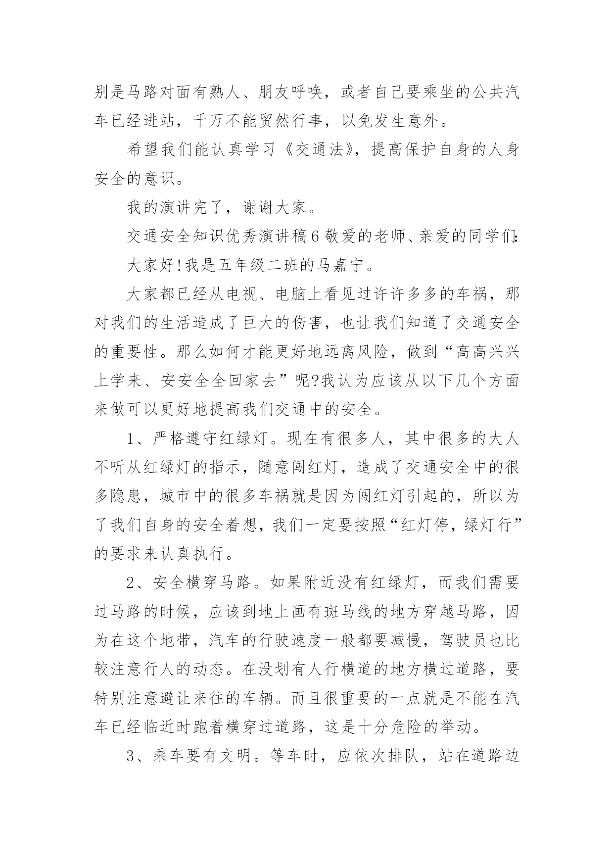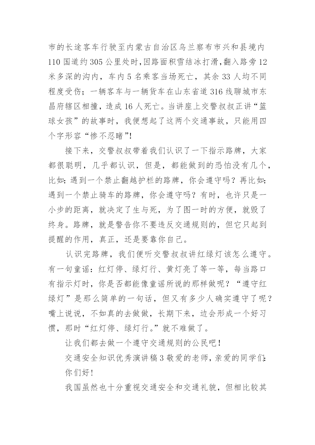 交通安全知识优秀演讲稿交通安全知识优秀演讲稿范文(通用16篇)演讲稿具有观点鲜明,内容具有鼓动性的特点。在学习、工作生活中,越来越多地方需要用到演讲稿,你知道演讲稿怎样才能写的好吗?下面是小编精心整理的交通安全知识优秀演讲稿范文(通用17篇),希望对大家有所帮助。交通安全知识优秀演讲稿1亲爱的老师、同学们:大家好!交通和我们的生活密切相连,无论是在路上走还是乘坐各种交通工具,安全总是处于第一位的。近年来,在我们中学生身边交通事故频繁发生,很多都是因为我们自身缺乏安全意识和安全知识,不注意遵守交通和乘车规则而发生的不该发生的悲剧。交通法规需要每个人都自觉地去遵守,这样才可以尽可能避免交通事故的发生。年轻人大多生性好动,注意力不易集中。有些同学在骑车时戴着随身听,或者在街上追逐嬉戏,以至于不能辨明当时的情况而作出及时的反应。还有很多同学心存侥幸,以为自己能够在发生事故前躲避危险,或者抱着“他们不敢撞我”的想法,这些都是造成交通事故中不必要伤亡的原因。只要我们能谨慎一点,不要太自以为是,就可以在很大程度上避免交通事故的发生。“红灯停,绿灯行”,过马路走人行横道是我们从小就知道的最简单的交通规则。它们不但是我们生命的护身符,还能在我们的正当权益受到损害时还能为我们主持正义。张艳是一名初中二年级的学生,有一次在没有红绿灯的路口被车撞了,事故双方各执一词,正在争执不下时,张艳想到她过马路时走了人行横道,并向警察报告了这一情况,结果张艳得到了应有的赔偿。与此相对的一个例子:小唐由于偷懒没有走过街天桥,而是翻越了马路中间的隔离栏,就在跳下去的一瞬间,惨剧发生了。交通事故所带来的伤害不仅仅是个人的,这些不幸的事故给他们的亲人、朋友都会带来伤痛,所以说关爱自己的生命也就是关爱自己身边的人,如果我们平常就能从细微处做起:不闯红灯,不违章骑车,过马路走人行横道,不跨越护栏……这些虽然看起来是小事,有些同学会对它们不以为然,但是在关键时刻,它们就是生与死的分界线。交通安全时刻都与我们每个人息息相关,遵守交通法规就是对自己和他人的生命负责。同学们,快快行动起来吧,创建一个更安全的校园、更和谐的社会!交通安全知识优秀演讲稿2敬爱的老师,亲爱的同学:学校举行了一个交通安全的讲座,交警叔叔给我们讲了一些指示标志,还给我们讲了由于一时疏忽而造成终身遗憾的交通事故,我听的很入迷,同时也有着很深的感触!我仍然记得,曾经在网上看到过两个惨不忍睹的交通事故,虽然是用文字叙述出来的,但还是令我心惊肉跳,同时也默默为死者惋惜,这两个交通事故是这样的:河北省沧州市的长途客车行驶至内蒙古自治区乌兰察布市兴和县境内110国道约305公里处时,因路面积雪结冰打滑,翻入路旁12米多深的沟内,车内5名乘客当场死亡,其余33人均不同程度受伤;一辆客车与一辆货车在山东省道316线聊城市东昌府辖区相撞,造成16人死亡。当讲座上交警叔叔正讲“篮球女孩”的故事时,我便想起了这两个交通事故,只能用四个字形容“惨不忍睹”!接下来,交警叔叔带着我们认识了一下指示路牌,大家都很聪明,几乎都认识,但是,都能做到的恐怕没有几个,比如:遇到一个禁止翻越护栏的路牌,你会遵守吗?再比如:遇到一个禁止骑车的路牌,你会遵守吗?有时,也许只是一小步的距离,就决定了生与死,为了图一时的方便,就毁了终身。路牌,就是警告你不要违反交通规则的,但它只起到提醒的作用,真正,还是要靠你自己。认识完路牌,我们便听交警叔叔讲红绿灯该怎么遵守。有一句童谣:红灯停、绿灯行、黄灯亮了等一等,每当路口有指示灯时,你是否都能像童谣所说的那样做呢?“遵守红绿灯”是那么简单的一句话,但又有多少人确实遵守了呢?嘴上说说,不如真的去做做,长期下来,边会形成一个好习惯,那时“红灯停、绿灯行。”就不难做了。让我们都去做一个遵守交通规则的公民吧!交通安全知识优秀演讲稿3敬爱的老师,亲爱的同学们:你们好!我国虽然也十分重视交通安全和交通礼貌,但相比较其他国家做得还远远不够。每一天,马路上,不遵守交通规则的行人、自行车、车辆比比皆是。如,非机动车遇红灯时越线、在车道上逆行、违法载人载物,行人不走人行道、任意跨越护栏、乱穿机动车道等。有的时候我过马路,经常会看见红灯时行人无视信号灯闯红灯,或者绿灯时汽车利用交叉路口时间差不顾过马路的行人加速冲过去等情景。没有信号灯的时候更甚。我国交通法规明确规定:“车辆行经人行横道,遇有交通信号放行行人经过时,必须停车或减速让行;经过没有信号灯控制的人行横道时,须注意避让来往行人。”在现实生活中,有交通信号的路口还好一些,没有交通信号的路口根本就是一片混乱的景象,车水马龙,互不相让。在我们这个现代社会中,车辆依法行车,行人依法行路,是交通礼貌的一部分。另外,交通警察依法管理、礼貌执法,也是交通礼貌的另一部分。这两部分同时“展现