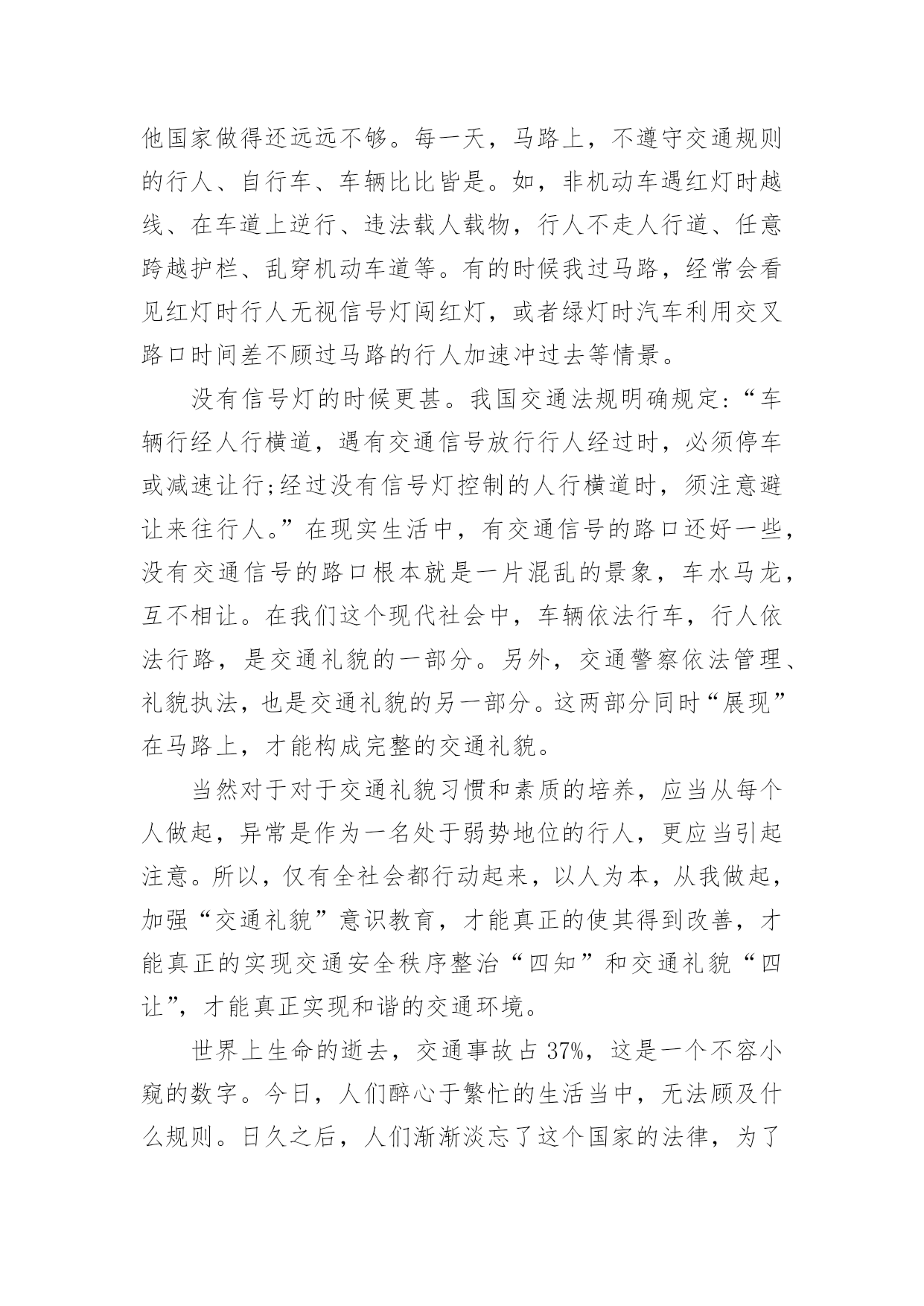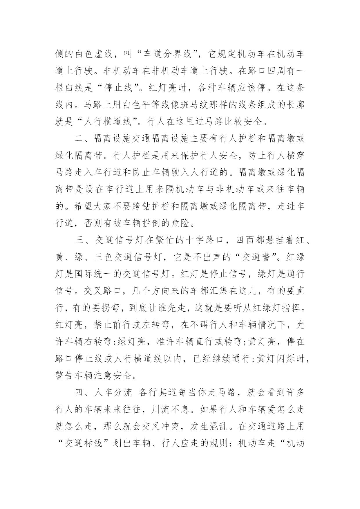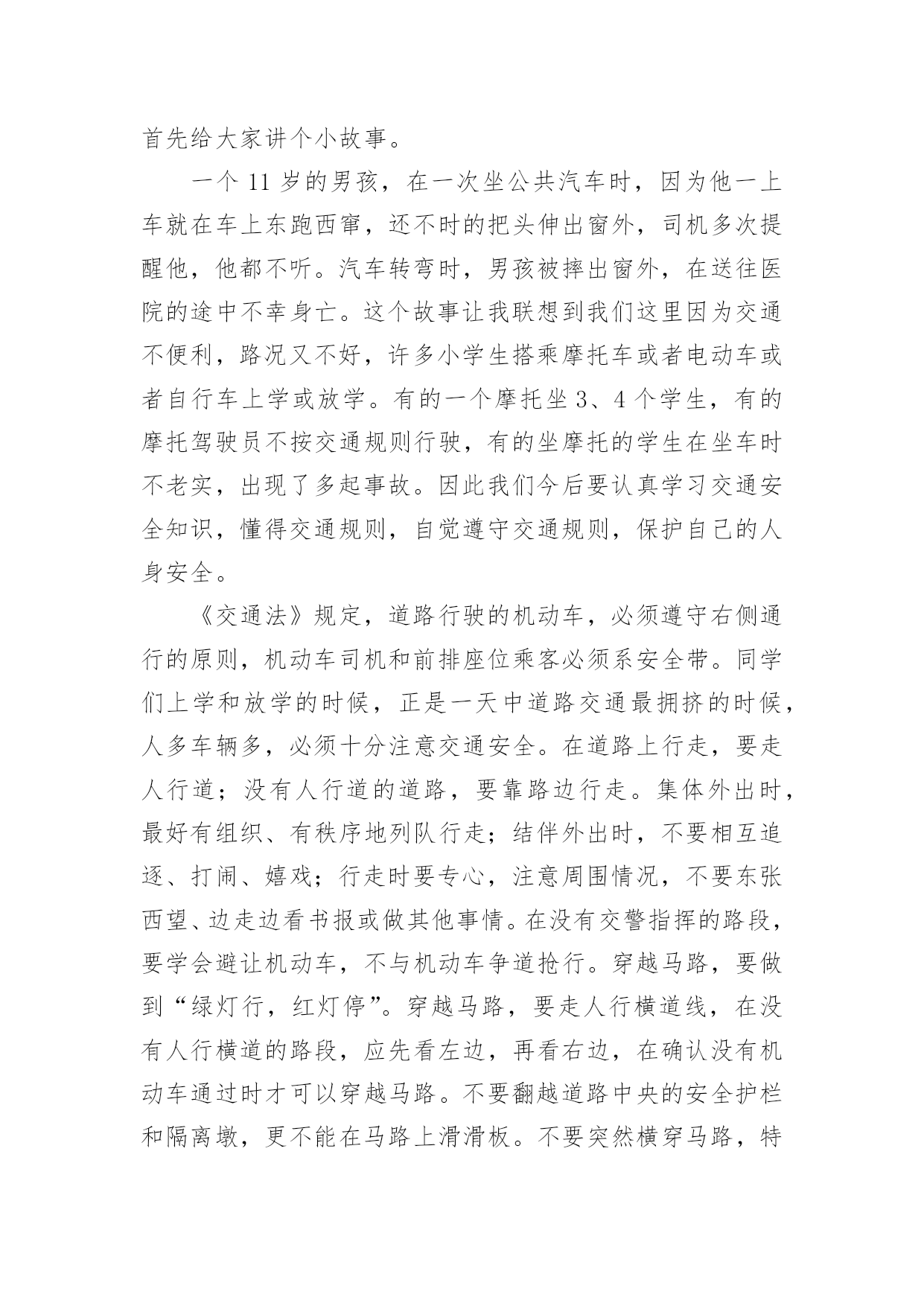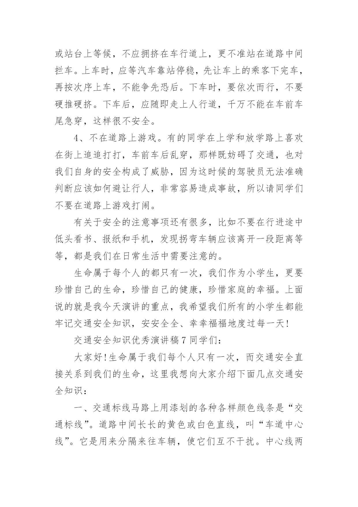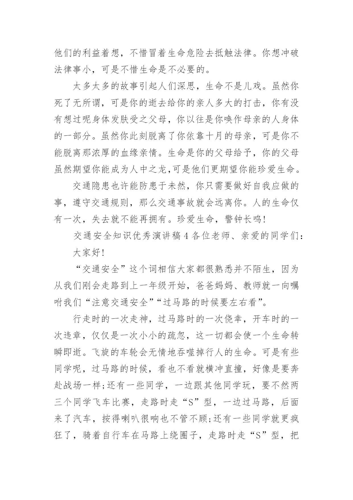 交通安全知识优秀演讲稿交通安全知识优秀演讲稿范文(通用16篇)演讲稿具有观点鲜明,内容具有鼓动性的特点。在学习、工作生活中,越来越多地方需要用到演讲稿,你知道演讲稿怎样才能写的好吗?下面是小编精心整理的交通安全知识优秀演讲稿范文(通用17篇),希望对大家有所帮助。交通安全知识优秀演讲稿1亲爱的老师、同学们:大家好!交通和我们的生活密切相连,无论是在路上走还是乘坐各种交通工具,安全总是处于第一位的。近年来,在我们中学生身边交通事故频繁发生,很多都是因为我们自身缺乏安全意识和安全知识,不注意遵守交通和乘车规则而发生的不该发生的悲剧。交通法规需要每个人都自觉地去遵守,这样才可以尽可能避免交通事故的发生。年轻人大多生性好动,注意力不易集中。有些同学在骑车时戴着随身听,或者在街上追逐嬉戏,以至于不能辨明当时的情况而作出及时的反应。还有很多同学心存侥幸,以为自己能够在发生事故前躲避危险,或者抱着“他们不敢撞我”的想法,这些都是造成交通事故中不必要伤亡的原因。只要我们能谨慎一点,不要太自以为是,就可以在很大程度上避免交通事故的发生。“红灯停,绿灯行”,过马路走人行横道是我们从小就知道的最简单的交通规则。它们不但是我们生命的护身符,还能在我们的正当权益受到损害时还能为我们主持正义。张艳是一名初中二年级的学生,有一次在没有红绿灯的路口被车撞了,事故双方各执一词,正在争执不下时,张艳想到她过马路时走了人行横道,并向警察报告了这一情况,结果张艳得到了应有的赔偿。与此相对的一个例子:小唐由于偷懒没有走过街天桥,而是翻越了马路中间的隔离栏,就在跳下去的一瞬间,惨剧发生了。交通事故所带来的伤害不仅仅是个人的,这些不幸的事故给他们的亲人、朋友都会带来伤痛,所以说关爱自己的生命也就是关爱自己身边的人,如果我们平常就能从细微处做起:不闯红灯,不违章骑车,过马路走人行横道,不跨越护栏……这些虽然看起来是小事,有些同学会对它们不以为然,但是在关键时刻,它们就是生与死的分界线。交通安全时刻都与我们每个人息息相关,遵守交通法规就是对自己和他人的生命负责。同学们,快快行动起来吧,创建一个更安全的校园、更和谐的社会!交通安全知识优秀演讲稿2敬爱的老师,亲爱的同学:学校举行了一个交通安全的讲座,交警叔叔给我们讲了一些指示标志,还给我们讲了由于一时疏忽而造成终身遗憾的交通事故,我听的很入迷,同时也有着很深的感触!我仍然记得,曾经在网上看到过两个惨不忍睹的交通事故,虽然是用文字叙述出来的,但还是令我心惊肉跳,同时也默默为死者惋惜,这两个交通事故是这样的:河北省沧州市的长途客车行驶至内蒙古自治区乌兰察布市兴和县境内110国道约305公里处时,因路面积雪结冰打滑,翻入路旁12米多深的沟内,车内5名乘客当场死亡,其余33人均不同程度受伤;一辆客车与一辆货车在山东省道316线聊城市东昌府辖区相撞,造成16人死亡。当讲座上交警叔叔正讲“篮球女孩”的故事时,我便想起了这两个交通事故,只能用四个字形容“惨不忍睹”!接下来,交警叔叔带着我们认识了一下指示路牌,大家都很聪明,几乎都认识,但是,都能做到的恐怕没有几个,比如:遇到一个禁止翻越护栏的路牌,你会遵守吗?再比如:遇到一个禁止骑车的路牌,你会遵守吗?有时,也许只是一小步的距离,就决定了生与死,为了图一时的方便,就毁了终身。路牌,就是警告你不要违反交通规则的,但它只起到提醒的作用,真正,还是要靠你自己。认识完路牌,我们便听交警叔叔讲红绿灯该怎么遵守。有一句童谣:红灯停、绿灯行、黄灯亮了等一等,每当路口有指示灯时,你是否都能像童谣所说的那样做呢?“遵守红绿灯”是那么简单的一句话,但又有多少人确实遵守了呢?嘴上说说,不如真的去做做,长期下来,边会形成一个好习惯,那时“红灯停、绿灯行。”就不难做了。让我们都去做一个遵守交通规则的公民吧!交通安全知识优秀演讲稿3敬爱的老师,亲爱的同学们:你们好!我国虽然也十分重视交通安全和交通礼貌,但相比较其他国家做得还远远不够。每一天,马路上,不遵守交通规则的行人、自行车、车辆比比皆是。如,非机动车遇红灯时越线、在车道上逆行、违法载人载物,行人不走人行道、任意跨越护栏、乱穿机动车道等。有的时候我过马路,经常会看见红灯时行人无视信号灯闯红灯,或者绿灯时汽车利用交叉路口时间差不顾过马路的行人加速冲过去等情景。没有信号灯的时候更甚。我国交通法规明确规定:“车辆行经人行横道,遇有交通信号放行行人经过时,必须停车或减速让行;经过没有信号灯控制的人行横道时,须注意避让来往行人。”在现实生活中,有交通信号的路口还好一些,没有交通信号的路口根本就是一片混乱的景象,车水马龙,互不相让。在我们这个现代社会中,车辆依法行车,行人依法行路,是交通礼貌的一部分。另外,交通警察依法管理、礼貌执法,也是交通礼貌的另一部分。这两部分同时“展现