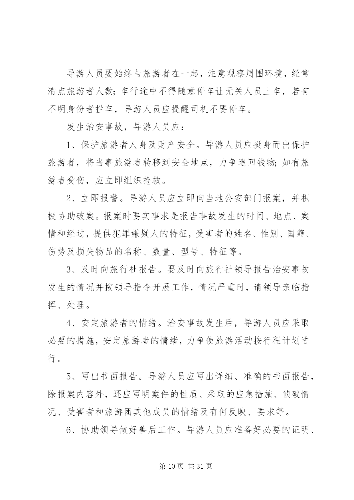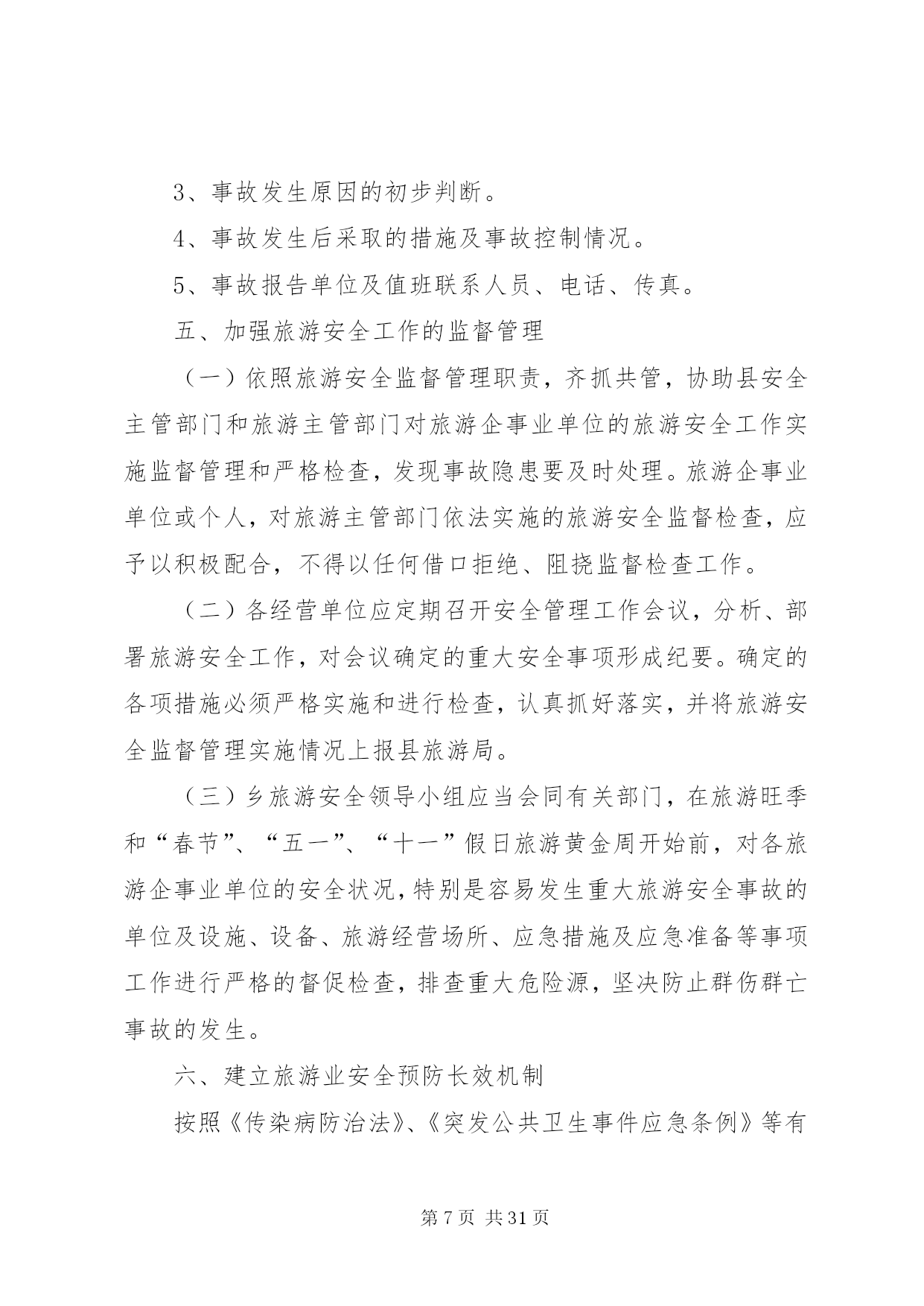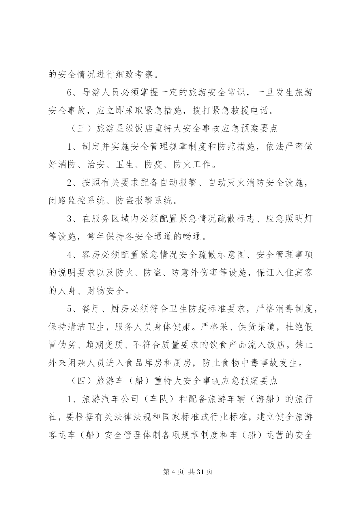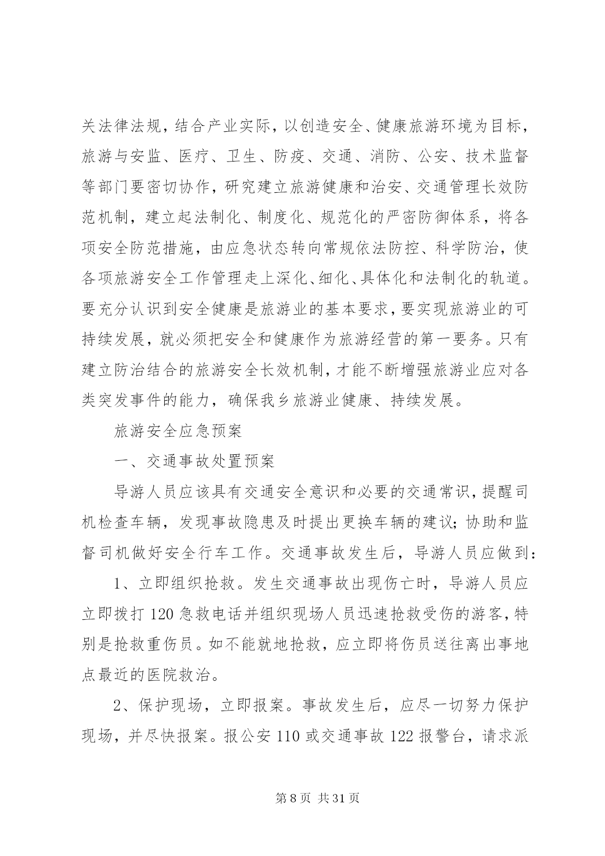 第PAGE\*Arabic\*MERGEFORMAT31页共NUMPAGES\*MERGEFORMAT31页旅游安全应急预案为全面加强旅游安全监督管理,防范旅游安全事故发生,保障旅游者和旅游经营者的人身、财物安全,促进旅游业健康发展,积极应对可能发生的重特大旅游安全事故,及时、高效、有序地组织事故应急救援工作,最大限度减少人员伤亡和财产损失。根据《中华人民共和国安全生产法》和有关旅游安全管理的法律、法规,结合我乡旅游业的具体状况,制定本预案。一、指导思想坚持安全防范为主的思想,以开展安全检查,落实防范措施,整治治安问题,整改安全隐患,强化重要活动安全保卫为重点,共同作战,齐抓共管,落实责任,明确目标,落实各项安全保卫措施,确保旅游安全。二、适用范围当遇到有紧急情况,主要指刑事治安案件,交通事故、火灾、落水事故、栏杆等保护设施损坏坍塌,游客突发急病等,应立即报相关负责人及县旅游局,根据本预案,各就其责,妥善处理,尽量减少不良影响。三、组织领导乡旅游安全生产领导小组办公室是乡旅游事故的应急机构。负责贯彻执行国家安全生产的法律法规,监督相关法律法规的实施;制定旅游事故应急预案;掌握安全生产动态,组织协调指挥事故救援工作,汇总报告情况。办公室设在乡城建办。领导小组成员名单如下:组长:陈林习副组长:刘光绍成员:何本春贺运民阳林张小锋钱俊贤贺杰乡旅游安全生产领导小组应在事故发生后的第一时间赶赴现场,全面掌握事故动态,制定具体救援方案,启动应急预案,协调指挥救援。四、内容与要求(一)旅游景区(点)重特大安全事故应急预案要点1、根据有关法律、法规和国家标准,制定和实施旅游安全管理规章制度、安全防范措施,配备必要的、充足的、有效的各种安全防护设施,严格执行安全操作规程,确保游客生命财产安全。2、制定游览、游乐规则和游客须知,引导游客活动;设置旅游安全标志,提醒游客注意安全。3、对全体员工进行旅游安全培训,特别是火警预演培训和机械险情排除培训,使员工具备基本的抢险救生知识,提高安全防护技能,熟练掌握有关紧急处理措施。4、加强旅游安全检查,对惊险旅游项目和危险性较大的特种设备、大中型游乐设施,要加强监控,定期检查,严禁超负荷运行,在旅游黄金周来临之前,必须进行全面检修,确保各种机械设备、设施正常运转。5、凡遇恶劣天气或设备、设施机械故障时,须有应急应变措施,客运、大中型游乐设施停止运营,并对外公告,防止意外伤害事故的发生。(二)旅行社重特大安全事故应急预案要点1、必须按时足额交纳旅行社责任保险,切实保障旅行社和游客的合法权益,在与旅游者签定旅游合同时,应当推荐旅游者购买相当的旅游者个人保险。2、制定和实施旅游者活动中的旅游安全防范措施,旅游者的行李交接手续制度。3、周密安排旅游团队的行程计划和线路,认真考虑可能影响旅游安全的诸多项目因素,制定并执行旅游者住宿就餐的规章制度。4、选择具备经营资格且信誉好的汽车公司(车队),技术性能合格、证照齐全、有旅游客运资质的车辆,责任心强、技术过硬并且有旅游车辆驾驶员上岗证的司机运营旅游团队,严禁租用证照不全、存在安全隐患、特别是社会闲散车辆和农用车辆运营旅游团队。5、组织学生、老年旅游及大型群体旅游活动时,必须事先制订周密的旅游安全保护和急救措施,对道路、项目和运载工具的安全情况进行细致考察。6、导游人员必须掌握一定的旅游安全常识,一旦发生旅游安全事故,应立即采取紧急措施,拨打紧急救援电话。(三)旅游星级饭店重特大安全事故应急预案要点1、制定并实施安全管理规章制度和防范措施,依法严密做好消防、治安、卫生、防疫、防火工作。2、按照有关要求配备自动报警、自动灭火消防安全设施,闭路监控系统、防盗报警系统。3、在服务区域内必须配置紧急情况疏散标志、应急照明灯等设施,常年保持各安全通道的畅通。4、客房必须配置紧急情况安全疏散示意图、安全管理事项的说明要求以及防火、防盗、防意外伤害等设施,保证入住宾客的人身、财物安全。5、餐厅、厨房必须符合卫生防疫标准要求,严格消毒制度,保持清洁卫生,服务人员身体健康。严格采、供货渠道,杜绝假冒伪劣、超期变质、不符合质量要求的饮食产品流入饭店,禁止外来闲杂人员进入食品库房和厨房,防止食物中毒事故发生。(四)旅游车(船)重特大安全事故应急预案要点1、旅游汽车公司(车队)和配备旅游车辆(游船)的旅行社,要根据有关法律法规和国家标准或行业标准,建立健全旅游客运车(船)安全管理体制各项规章制度和车(船)运营的安全防范制度。2、建立对驾驶员进行安全教育和培训制度,使其自觉遵守交通法规,安全操作行驶,合理掌握车速,确保车(船)安全和乘客的人身安全。3、严格禁止驾驶员在执行游客运营中疲劳驾驶、酒后驾驶、空档滑行、超员超速、违章行驶等违规行为。4、制定并严格实施对旅游车(船)的日