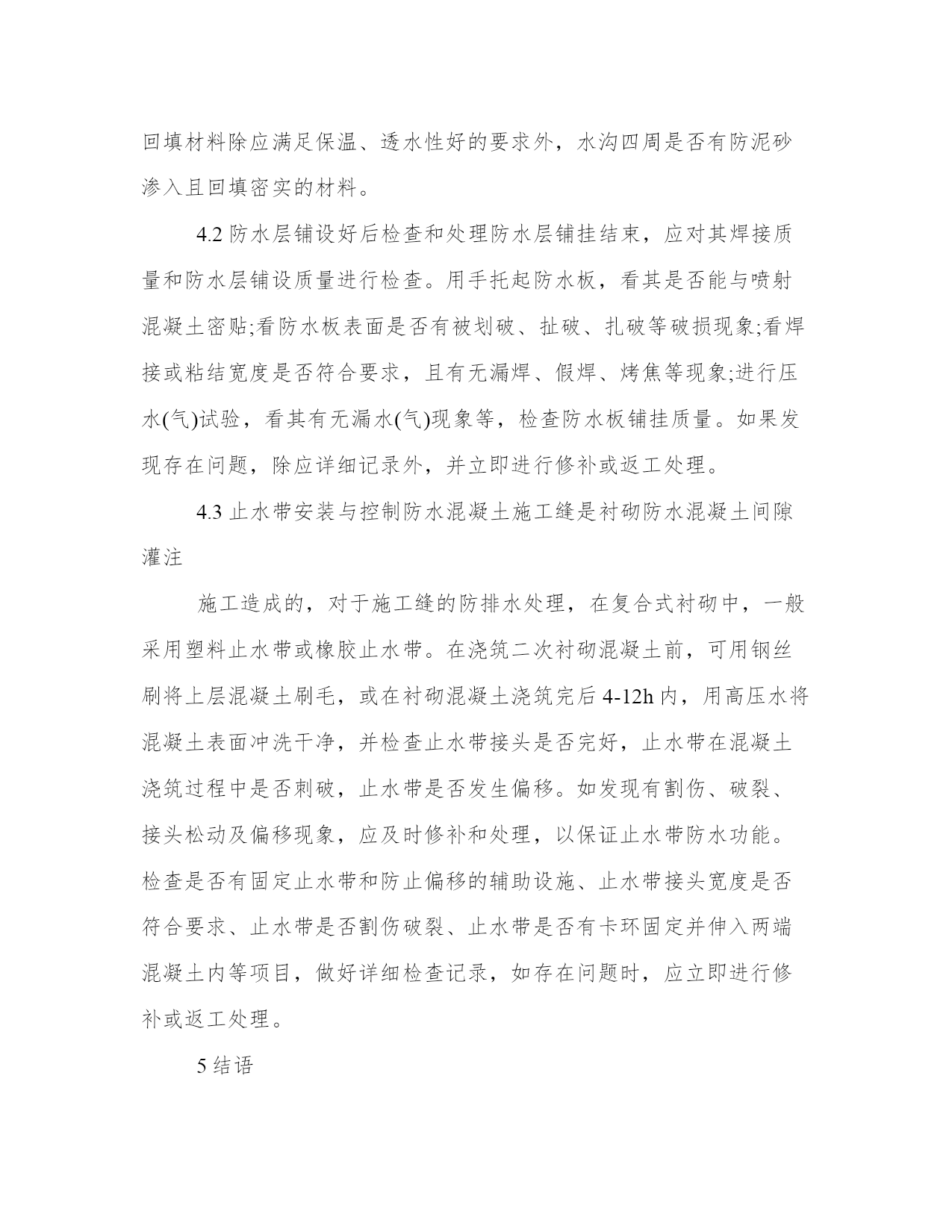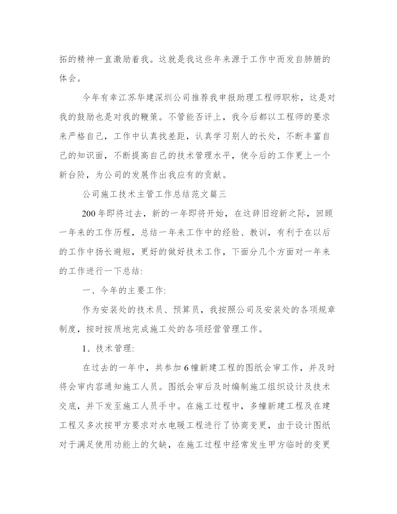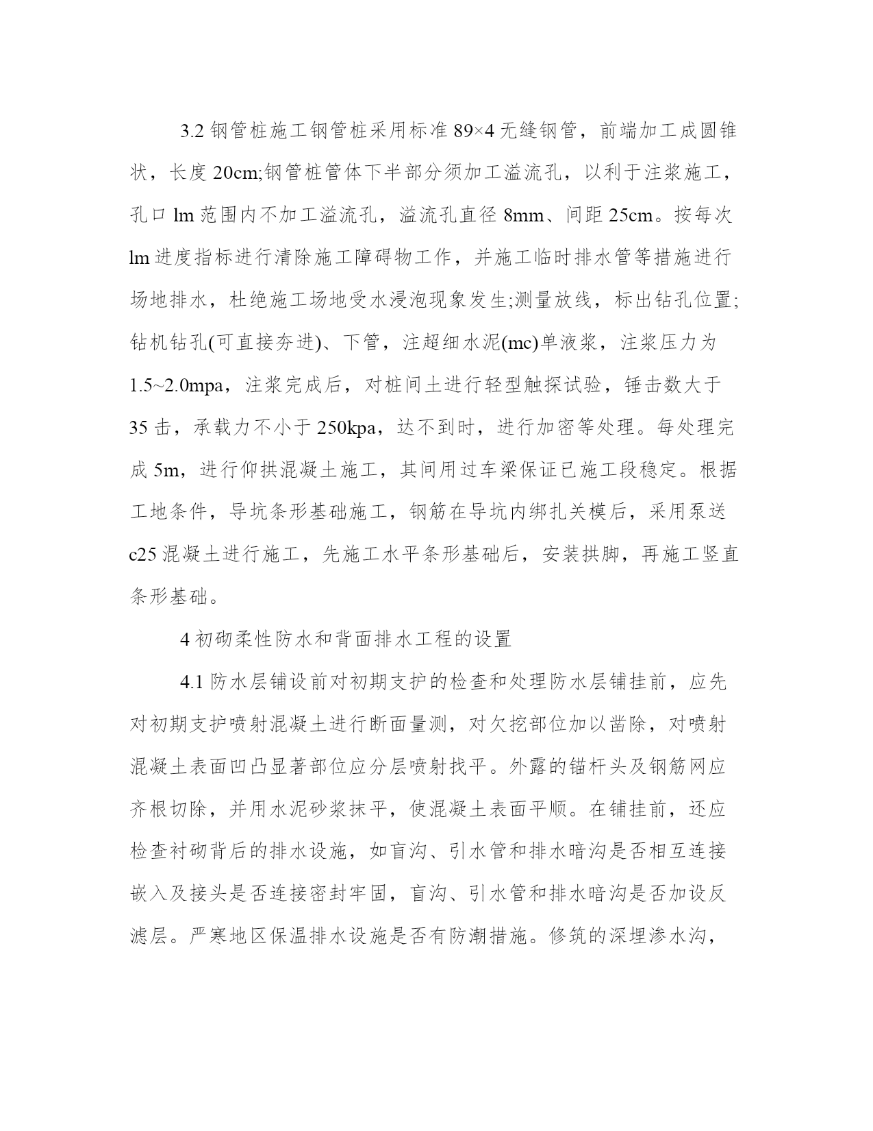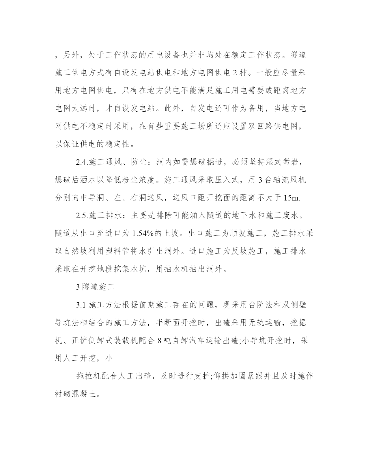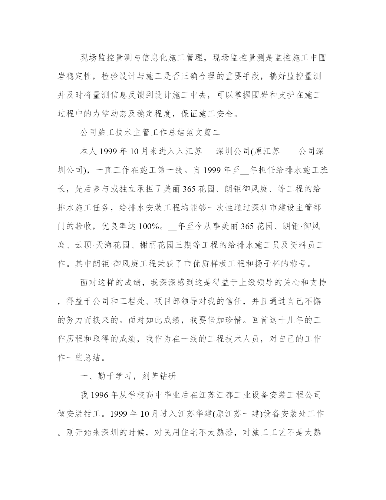 公司施工技术主管工作总结范文(三篇)工作学习中一定要善始善终,只有总结才标志工作阶段性完成或者彻底的终止。通过总结对工作学习进行回顾和分析,从中找出经验和教训,引出规律性认识,以指导今后工作和实践活动。总结书写有哪些要求呢?我们怎样才能写好一篇总结呢?下面是小编整理的个人今后的总结范文,欢迎阅读分享,希望对大家有所帮助。公司施工技术主管工作总结范文篇一关键词:隧道施工;施工技术;公路引言:随着科技的进步与经济的发展,人民日益增长的物质文化需要,不论是在交通运输、水利还是在地下交通或空间利用方面,人们对隧道工程的要求也越来越高,从数量、质量及难度方面都提出了很高的要求。1隧道开挖分析大洞隧道左线出口洞口vi类围岩施工中,隧道拱顶下沉大,地表出现不同程度的下沉及开裂现象,拱脚局部有开裂的现象。通过对左线施工情况及右线地质资料的分析,洞口段隧道位于堆积土中,隧道斜穿沟心,且土层松软、松散、含水,地基承载力低。同时隧道埋深浅,极难形成自拱度,靠围岩自身无法控制围岩变形,必须采取支撑措施,而基础承载力是主动支撑有效的前提和保证,超前探明地质情况,并进行基础处理就非常必要。2风、水、电作业,通风、防尘和施工排水2.1.施工供风:管道敷设要求平顺、接头密封、防止漏风,凡有裂纹、创伤、凹陷等现象的钢管不能使用。在洞外地段,风管长度超过500m、温度变化较大时,宜安装伸缩器,靠近空压机150m以内,风管的法兰盘接头宜用耐热材料制成垫片,加石棉衬垫等。2.2.凡无臭味、不含有害矿物质的洁净天然水,都可以作为施工用水,饮用水的水质则要求更为新鲜清洁。无论生活用水还是施工用水,均应做好水质化验工作。施工用水与工程规模、机械化程度、施工进度、人员数量和气候条件等有关,因而用水量的变化幅度较大,很难精确估计,一般根据以往经验估计。随着隧道施工工地卫生要求的提高,生活设施(如洗衣机等)配置增多,耗水量也就相应增多。因而生活用水量也有一定的变化,但幅度不大,一般可按下列参考指标估算:?生产工人平均0.1---0.15m3/d?非生产工人平均0.08一0.12m3/d2.3.施工供电:随着隧道施工机械化程度的提高,隧道施工的耗电量也越来越大,且负荷集中。同时为保证施工质量和施工安全,对隧道施工供电的可靠性要求也越来越高,因而施工供电显得越来越重要。在施工现场,电力供应首先要确定总用电量,以便选择合适的发电机、变压器、各类开关设备和线路导线,做到安全、可靠地供电,减少投资,节约开支。确定现场供电负荷的大小时,不能简单地将所有用电设备的容量相加。因为在实际生产中,并非所有设备同时工作,另外,处于工作状态的用电设备也并非均处在额定工作状态。隧道施工供电方式有自设发电站供电和地方电网供电2种。一般应尽量采用地方电网供电,只有在地方供电不能满足施工用电需要或距离地方电网太远时,才自设发电站。此外,自发电还可作为备用,当地方电网供电不稳定时采用,在有些重要施工场所还应设置双回路供电网,以保证供电的稳定性。2.4.施工通风、防尘:洞内如需爆破掘进,必须坚持湿式凿岩,爆破后洒水以降低粉尘浓度。施工通风采取压入式,用3台轴流风机分别向中导洞、左、右洞送风,送风口距开挖面的距离不大于15m.2.5.施工排水:主要是排除可能涌入隧道的地下水和施工废水。隧道从出口至进口为1.54%的上坡。出口施工为顺坡施工,施工排水采取自然坡利用塑料管将水引出洞外。进口施工为反坡施工,施工排水采取在开挖地段挖集水坑,用抽水机抽出洞外。3隧道施工3.1施工方法根据前期施工存在的问题,现采用台阶法和双侧壁导坑法相结合的施工方法,半断面开挖时,出碴采用无轨运输,挖掘机、正铲侧卸式装载机配合8吨自卸汽车运输出碴;小导坑开挖时,采用人工开挖,小拖拉机配合人工出碴,及时进行支护;仰拱加固紧跟并且及时施作衬砌混凝土。3.2钢管桩施工钢管桩采用标准89×4无缝钢管,前端加工成圆锥状,长度20cm;钢管桩管体下半部分须加工溢流孔,以利于注浆施工,孔口lm范围内不加工溢流孔,溢流孔直径8mm、间距25cm。按每次lm进度指标进行清除施工障碍物工作,并施工临时排水管等措施进行场地排水,杜绝施工场地受水浸泡现象发生;测量放线,标出钻孔位置;钻机钻孔(可直接夯进)、下管,注超细水泥(mc)单液浆,注浆压力为1.5~2.0mpa,注浆完成后,对桩间土进行轻型触探试验,锤击数大于35击,承载力不小于250kpa,达不到时,进行加密等处理。每处理完成5m,进行仰拱混凝土施工,其间用过车梁保证已施工段稳定。根据工地条件,导坑条形基础施工,钢筋在导坑内绑扎关模后,采用泵送c25混凝土进行施工,先施工水平条形基础后,安装拱脚,再施工竖直条形基础。4初砌柔性防水和背面排水工程的设置4.1防水层铺设