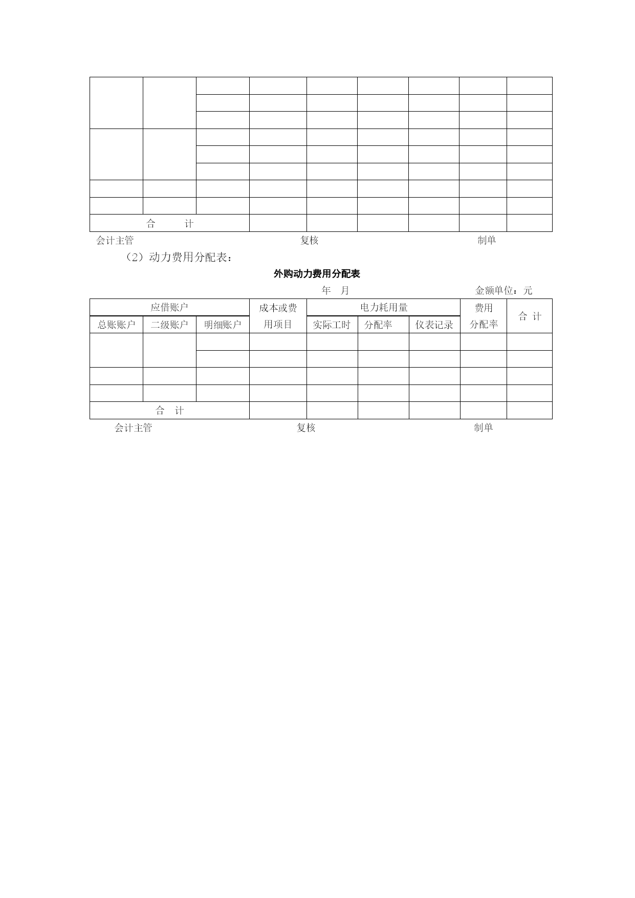 表2-1天华制造有限公司发出材料明细表附领料单15张20××年1月金额单位:元材料类别品名发出数量单位成本金额用途原材料甲材料9000千克10.090000A、B产品耗用原材料乙材料4500千克12.054000B产品领用原材料丙材料2000千克60.0120000A产品领用原材料丙材料150千克60.09000公司办公室领用燃料大同煤22吨400.08800锅炉车间领用辅助材料010材料80千克25.02000机修车间领用辅助材料011材料500千克13.06500机修车间领用修理备件E配件15只30.0450一车间修理领用修理备件F配件12只60.0720一车间修理领用合计291470仓库主任王华复核李敏制单陈志明表2-3天华制造有限公司固定资产折旧明细表××年1月31日金额单位:元车间名称固定资产类别折旧计提基数月折旧率月折旧额一车间房屋30000000.3%设备15000000.8%锅炉车间房屋4000000.3%设备5000000.8%机修车间房屋10000000.3%机器、设备15000000.8%合计表2-4天华制造有限公司辅助生产车间提供劳务情况明细表××年1月31日接受劳务部门辅助生产车间备注锅炉车间机修车间锅炉车间50工时机修车间500吨一车间3000吨2420工时生产A、B产品公司管理部门500吨30工时合计4000吨2500工时(1)原材料费用分配表原材料费用分配表年月金额单位:元应借账户成本或费用项目间接计入费用直接计入费用合计总账账户二级账户明细账户消耗定量分配率分配额合计会计主管复核制单(2)动力费用分配表:外购动力费用分配表年月金额单位:元应借账户成本或费用项目电力耗用量费用分配率合计总账账户二级账户明细账户实际工时分配率仪表记录合计会计主管复核制单