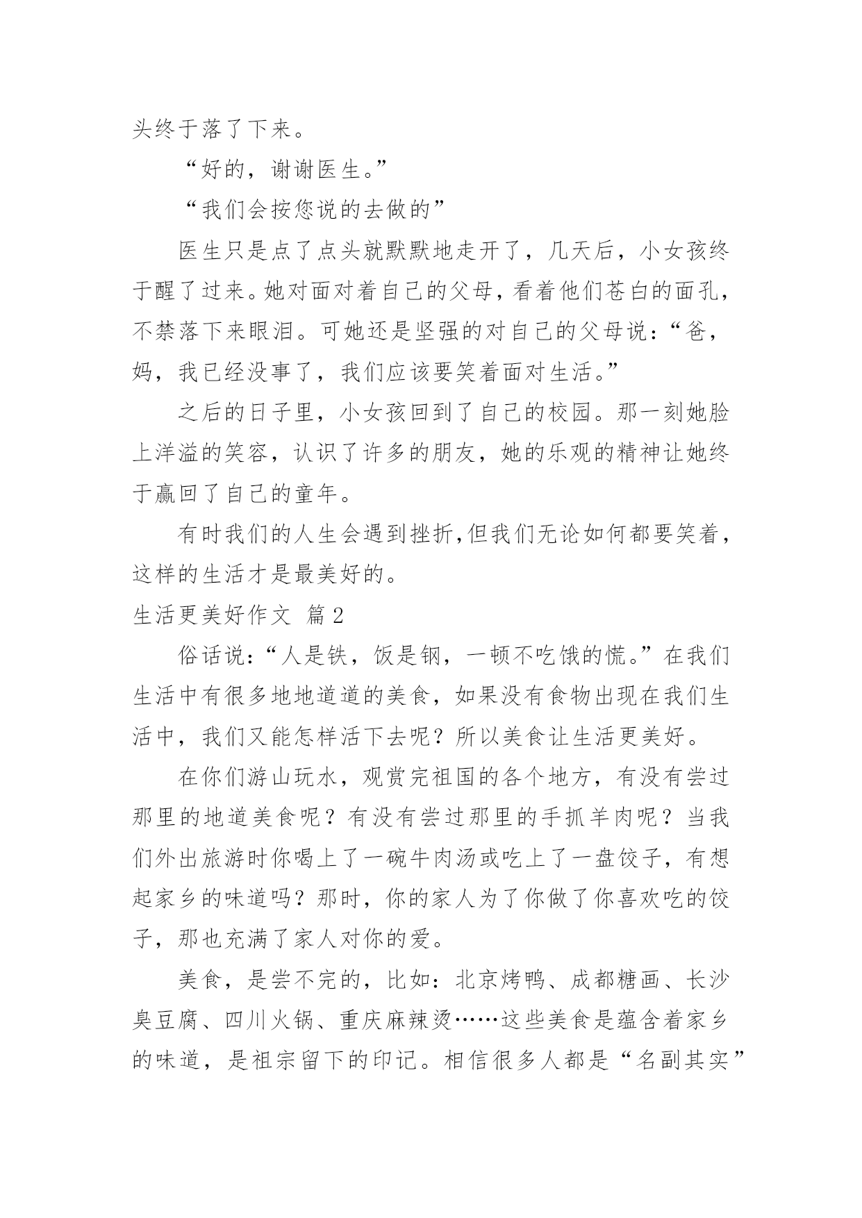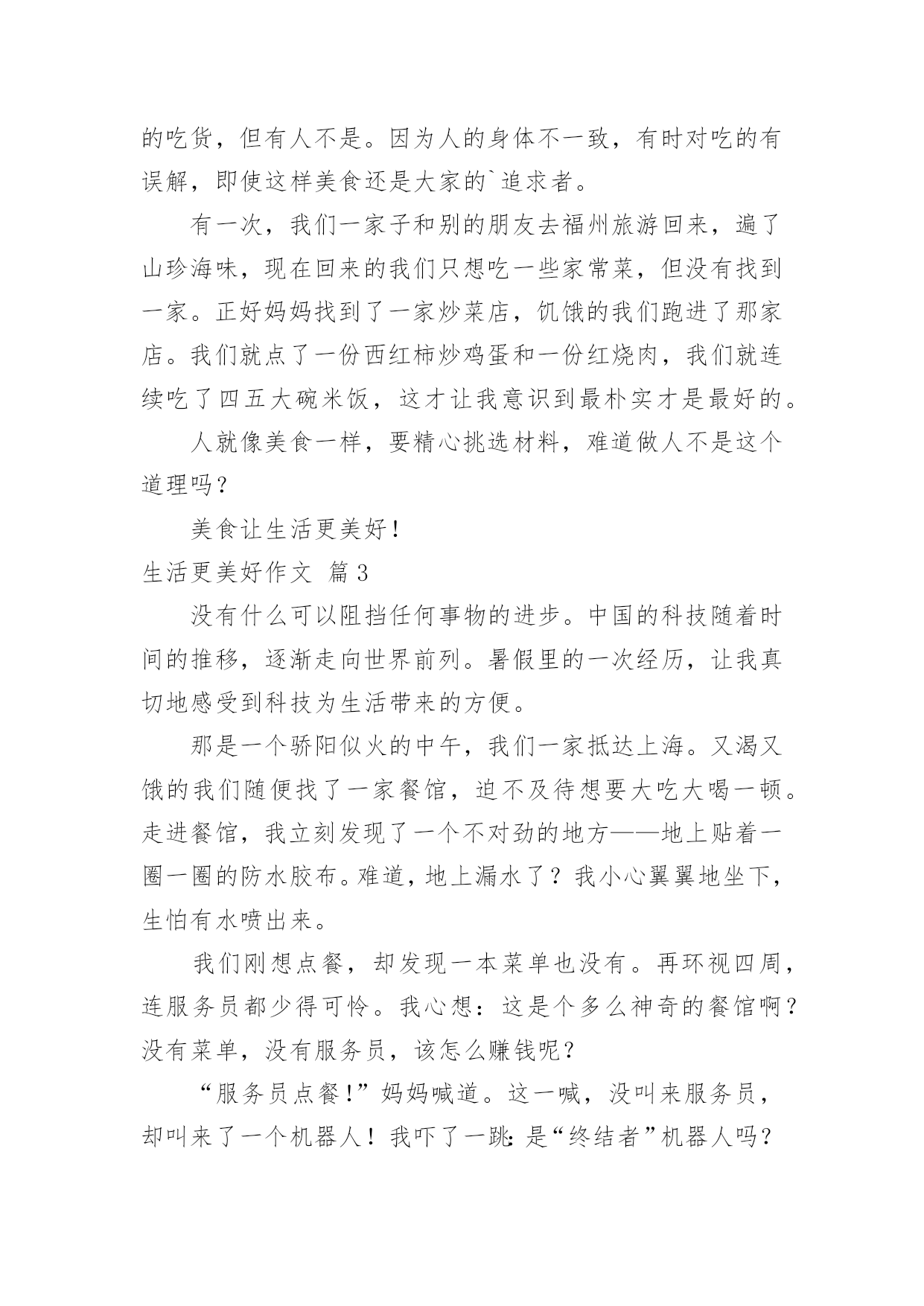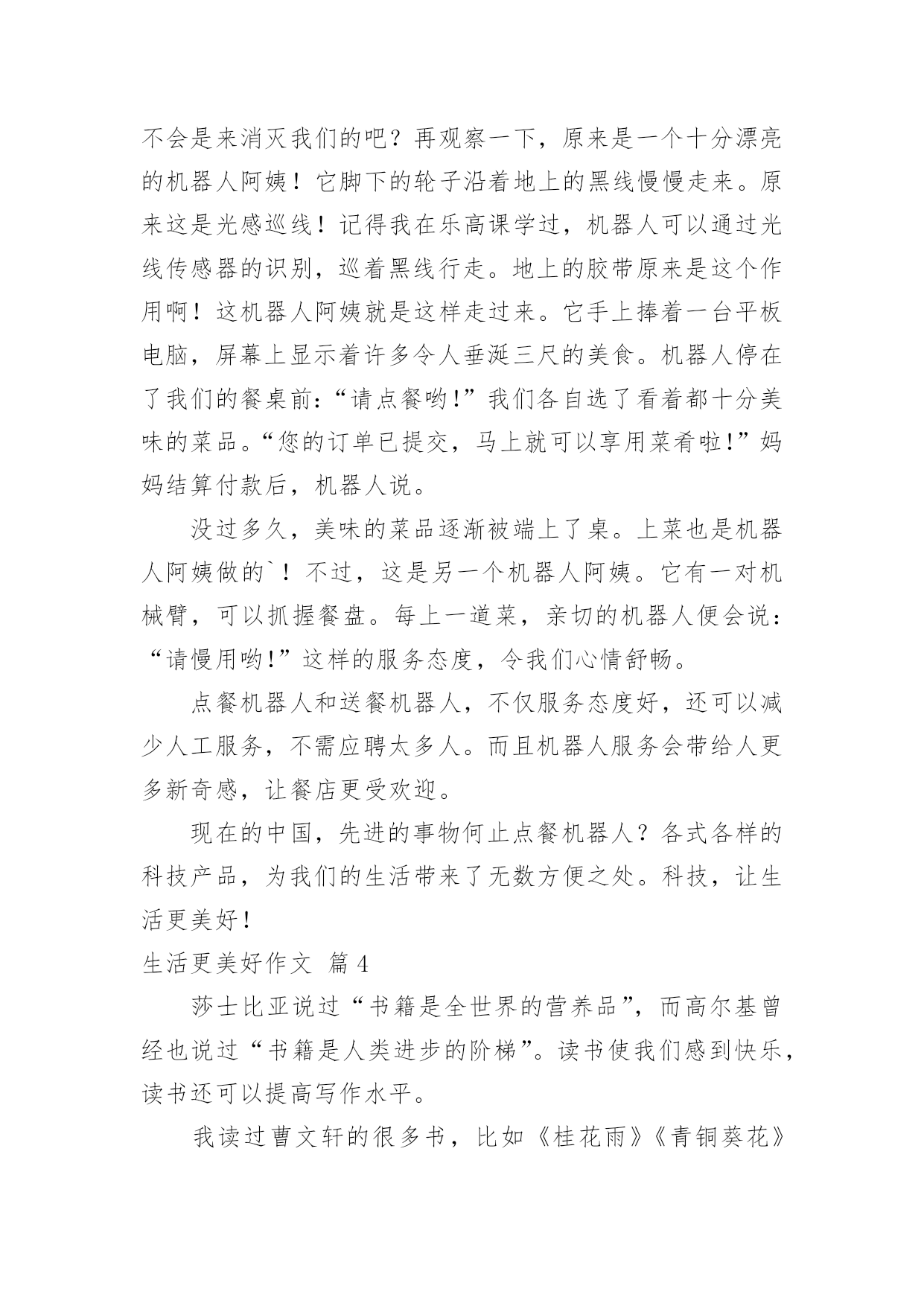 生活更美好作文生活更美好作文无论在学习、工作或是生活中,大家都经常接触到作文吧,借助作文人们可以反映客观事物、表达思想感情、传递知识信息。相信很多朋友都对写作文感到非常苦恼吧,下面是小编整理的生活更美好作文9篇,供大家参考借鉴,希望可以帮助到有需要的朋友。生活更美好作文篇1生活中的美好有很多,乐观是其中的一种,但你知道为什么乐观会让生活更美好吗?当某医院的病床上,躺着一个年仅九岁的小女孩,这年级的她本应享受着童年的快乐。可着一切全因为一场意外而奔走了她快乐的童年。当她在进手术室的那一刻,她的爸爸妈妈就连她的家人也痛不欲生。但她却微笑着看着自己的亲人“爸爸妈妈没事”小女孩说:“我不怕,就这样。小女孩被医生缓缓地推进了手术室,这道冰冷的大门不知有多少生命在里面悬一线。这场手术整整经过了四十八小时,两天一夜的'时间却让这场比赛变得更加让人恐惧和害怕。就在这时,手术们推开了。小女孩的家人们都欣喜若狂地跑了过去,激动地问医生自己女儿的情况。“渡过了危险期了,但还要住院观察。”医生中的大石头终于落了下来。“好的,谢谢医生。”“我们会按您说的去做的”医生只是点了点头就默默地走开了,几天后,小女孩终于醒了过来。她对面对着自己的父母,看着他们苍白的面孔,不禁落下来眼泪。可她还是坚强的对自己的父母说:“爸,妈,我已经没事了,我们应该要笑着面对生活。”之后的日子里,小女孩回到了自己的校园。那一刻她脸上洋溢的笑容,认识了许多的朋友,她的乐观的精神让她终于赢回了自己的童年。有时我们的人生会遇到挫折,但我们无论如何都要笑着,这样的生活才是最美好的。生活更美好作文篇2俗话说:“人是铁,饭是钢,一顿不吃饿的慌。”在我们生活中有很多地地道道的美食,如果没有食物出现在我们生活中,我们又能怎样活下去呢?所以美食让生活更美好。在你们游山玩水,观赏完祖国的各个地方,有没有尝过那里的地道美食呢?有没有尝过那里的手抓羊肉呢?当我们外出旅游时你喝上了一碗牛肉汤或吃上了一盘饺子,有想起家乡的味道吗?那时,你的家人为了你做了你喜欢吃的饺子,那也充满了家人对你的爱。美食,是尝不完的,比如:北京烤鸭、成都糖画、长沙臭豆腐、四川火锅、重庆麻辣烫……这些美食是蕴含着家乡的味道,是祖宗留下的印记。相信很多人都是“名副其实”的吃货,但有人不是。因为人的身体不一致,有时对吃的有误解,即使这样美食还是大家的`追求者。有一次,我们一家子和别的朋友去福州旅游回来,遍了山珍海味,现在回来的我们只想吃一些家常菜,但没有找到一家。正好妈妈找到了一家炒菜店,饥饿的我们跑进了那家店。我们就点了一份西红柿炒鸡蛋和一份红烧肉,我们就连续吃了四五大碗米饭,这才让我意识到最朴实才是最好的。人就像美食一样,要精心挑选材料,难道做人不是这个道理吗?美食让生活更美好!生活更美好作文篇3没有什么可以阻挡任何事物的进步。中国的科技随着时间的推移,逐渐走向世界前列。暑假里的一次经历,让我真切地感受到科技为生活带来的方便。那是一个骄阳似火的中午,我们一家抵达上海。又渴又饿的我们随便找了一家餐馆,迫不及待想要大吃大喝一顿。走进餐馆,我立刻发现了一个不对劲的地方——地上贴着一圈一圈的防水胶布。难道,地上漏水了?我小心翼翼地坐下,生怕有水喷出来。我们刚想点餐,却发现一本菜单也没有。再环视四周,连服务员都少得可怜。我心想:这是个多么神奇的餐馆啊?没有菜单,没有服务员,该怎么赚钱呢?“服务员点餐!”妈妈喊道。这一喊,没叫来服务员,却叫来了一个机器人!我吓了一跳:是“终结者”机器人吗?不会是来消灭我们的吧?再观察一下,原来是一个十分漂亮的机器人阿姨!它脚下的轮子沿着地上的黑线慢慢走来。原来这是光感巡线!记得我在乐高课学过,机器人可以通过光线传感器的识别,巡着黑线行走。地上的胶带原来是这个作用啊!这机器人阿姨就是这样走过来。它手上捧着一台平板电脑,屏幕上显示着许多令人垂涎三尺的美食。机器人停在了我们的餐桌前:“请点餐哟!”我们各自选了看着都十分美味的菜品。“您的订单已提交,马上就可以享用菜肴啦!”妈妈结算付款后,机器人说。没过多久,美味的菜品逐渐被端上了桌。上菜也是机器人阿姨做的`!不过,这是另一个机器人阿姨。它有一对机械臂,可以抓握餐盘。每上一道菜,亲切的机器人便会说:“请慢用哟!”这样的服务态度,令我们心情舒畅。点餐机器人和送餐机器人,不仅服务态度好,还可以减少人工服务,不需应聘太多人。而且机器人服务会带给人更多新奇感,让餐店更受欢迎。现在的中国,先进的事物何止点餐机器人?各式各样的科技产品,为我们的生活带来了无数方便之处。科技,让生活更美好!生活更美好作文篇4莎士比亚说过“书籍是全世界的营养品”,而高尔基曾经也说过“书籍是人类进步的阶梯”。读书使我们感到快乐,读书还可以提高写作水平。我读过曹文轩的很多书,比如《桂花雨》《青铜葵花》《
