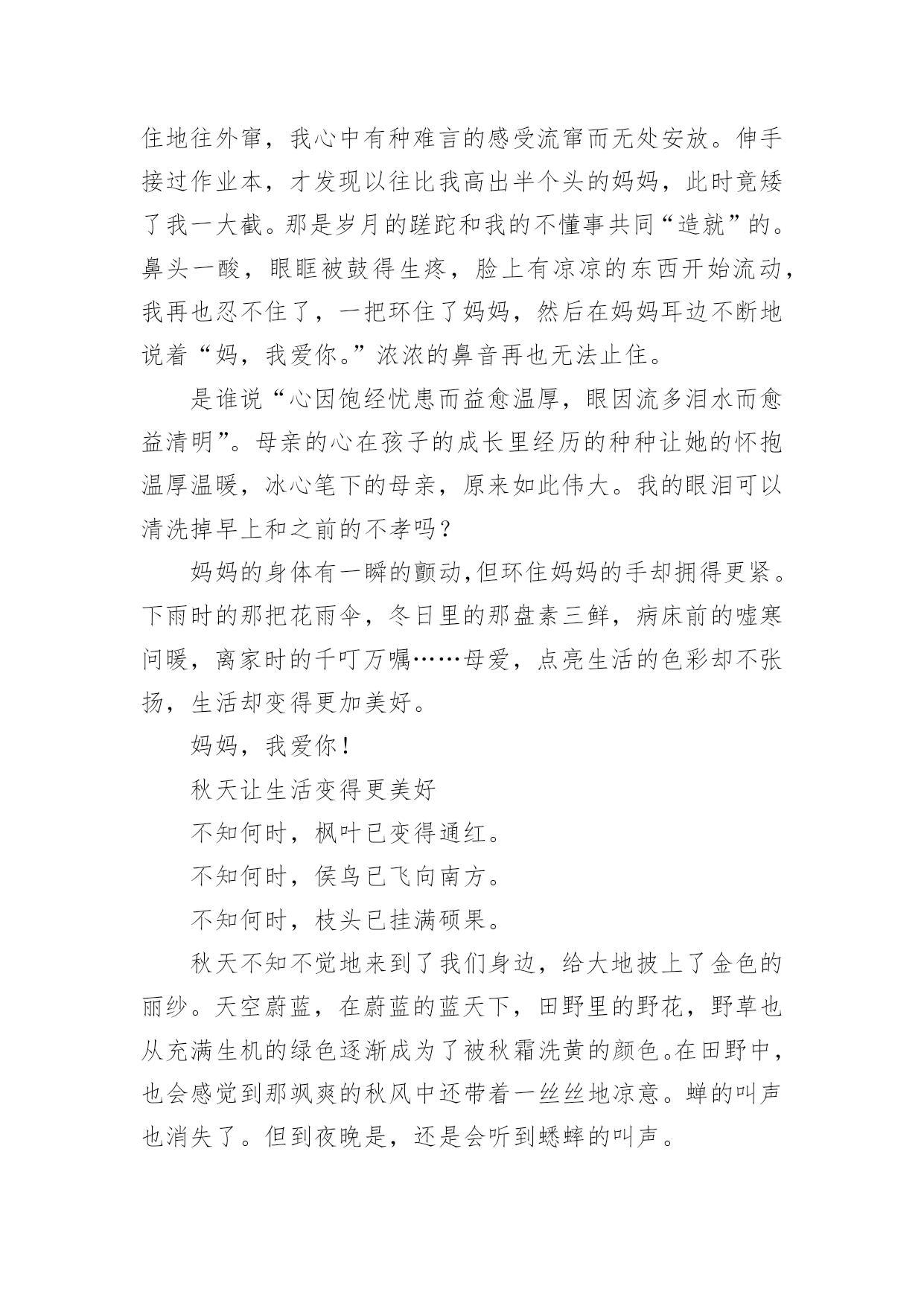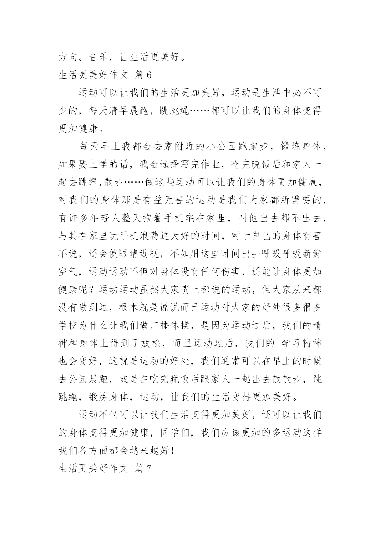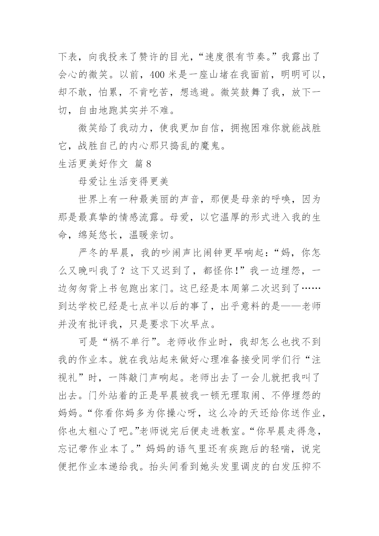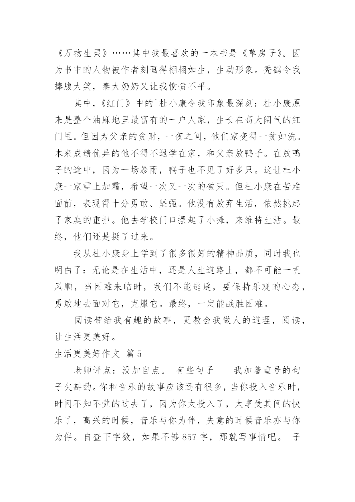 生活更美好作文生活更美好作文无论在学习、工作或是生活中,大家都经常接触到作文吧,借助作文人们可以反映客观事物、表达思想感情、传递知识信息。相信很多朋友都对写作文感到非常苦恼吧,下面是小编整理的生活更美好作文9篇,供大家参考借鉴,希望可以帮助到有需要的朋友。生活更美好作文篇1生活中的美好有很多,乐观是其中的一种,但你知道为什么乐观会让生活更美好吗?当某医院的病床上,躺着一个年仅九岁的小女孩,这年级的她本应享受着童年的快乐。可着一切全因为一场意外而奔走了她快乐的童年。当她在进手术室的那一刻,她的爸爸妈妈就连她的家人也痛不欲生。但她却微笑着看着自己的亲人“爸爸妈妈没事”小女孩说:“我不怕,就这样。小女孩被医生缓缓地推进了手术室,这道冰冷的大门不知有多少生命在里面悬一线。这场手术整整经过了四十八小时,两天一夜的'时间却让这场比赛变得更加让人恐惧和害怕。就在这时,手术们推开了。小女孩的家人们都欣喜若狂地跑了过去,激动地问医生自己女儿的情况。“渡过了危险期了,但还要住院观察。”医生中的大石头终于落了下来。“好的,谢谢医生。”“我们会按您说的去做的”医生只是点了点头就默默地走开了,几天后,小女孩终于醒了过来。她对面对着自己的父母,看着他们苍白的面孔,不禁落下来眼泪。可她还是坚强的对自己的父母说:“爸,妈,我已经没事了,我们应该要笑着面对生活。”之后的日子里,小女孩回到了自己的校园。那一刻她脸上洋溢的笑容,认识了许多的朋友,她的乐观的精神让她终于赢回了自己的童年。有时我们的人生会遇到挫折,但我们无论如何都要笑着,这样的生活才是最美好的。生活更美好作文篇2俗话说:“人是铁,饭是钢,一顿不吃饿的慌。”在我们生活中有很多地地道道的美食,如果没有食物出现在我们生活中,我们又能怎样活下去呢?所以美食让生活更美好。在你们游山玩水,观赏完祖国的各个地方,有没有尝过那里的地道美食呢?有没有尝过那里的手抓羊肉呢?当我们外出旅游时你喝上了一碗牛肉汤或吃上了一盘饺子,有想起家乡的味道吗?那时,你的家人为了你做了你喜欢吃的饺子,那也充满了家人对你的爱。美食,是尝不完的,比如:北京烤鸭、成都糖画、长沙臭豆腐、四川火锅、重庆麻辣烫……这些美食是蕴含着家乡的味道,是祖宗留下的印记。相信很多人都是“名副其实”的吃货,但有人不是。因为人的身体不一致,有时对吃的有误解,即使这样美食还是大家的`追求者。有一次,我们一家子和别的朋友去福州旅游回来,遍了山珍海味,现在回来的我们只想吃一些家常菜,但没有找到一家。正好妈妈找到了一家炒菜店,饥饿的我们跑进了那家店。我们就点了一份西红柿炒鸡蛋和一份红烧肉,我们就连续吃了四五大碗米饭,这才让我意识到最朴实才是最好的。人就像美食一样,要精心挑选材料,难道做人不是这个道理吗?美食让生活更美好!生活更美好作文篇3没有什么可以阻挡任何事物的进步。中国的科技随着时间的推移,逐渐走向世界前列。暑假里的一次经历,让我真切地感受到科技为生活带来的方便。那是一个骄阳似火的中午,我们一家抵达上海。又渴又饿的我们随便找了一家餐馆,迫不及待想要大吃大喝一顿。走进餐馆,我立刻发现了一个不对劲的地方——地上贴着一圈一圈的防水胶布。难道,地上漏水了?我小心翼翼地坐下,生怕有水喷出来。我们刚想点餐,却发现一本菜单也没有。再环视四周,连服务员都少得可怜。我心想:这是个多么神奇的餐馆啊?没有菜单,没有服务员,该怎么赚钱呢?“服务员点餐!”妈妈喊道。这一喊,没叫来服务员,却叫来了一个机器人!我吓了一跳:是“终结者”机器人吗?不会是来消灭我们的吧?再观察一下,原来是一个十分漂亮的机器人阿姨!它脚下的轮子沿着地上的黑线慢慢走来。原来这是光感巡线!记得我在乐高课学过,机器人可以通过光线传感器的识别,巡着黑线行走。地上的胶带原来是这个作用啊!这机器人阿姨就是这样走过来。它手上捧着一台平板电脑,屏幕上显示着许多令人垂涎三尺的美食。机器人停在了我们的餐桌前:“请点餐哟!”我们各自选了看着都十分美味的菜品。“您的订单已提交,马上就可以享用菜肴啦!”妈妈结算付款后,机器人说。没过多久,美味的菜品逐渐被端上了桌。上菜也是机器人阿姨做的`!不过,这是另一个机器人阿姨。它有一对机械臂,可以抓握餐盘。每上一道菜,亲切的机器人便会说:“请慢用哟!”这样的服务态度,令我们心情舒畅。点餐机器人和送餐机器人,不仅服务态度好,还可以减少人工服务,不需应聘太多人。而且机器人服务会带给人更多新奇感,让餐店更受欢迎。现在的中国,先进的事物何止点餐机器人?各式各样的科技产品,为我们的生活带来了无数方便之处。科技,让生活更美好!生活更美好作文篇4莎士比亚说过“书籍是全世界的营养品”,而高尔基曾经也说过“书籍是人类进步的阶梯”。读书使我们感到快乐,读书还可以提高写作水平。我读过曹文轩的很多书,比如《桂花雨》《青铜葵花》《