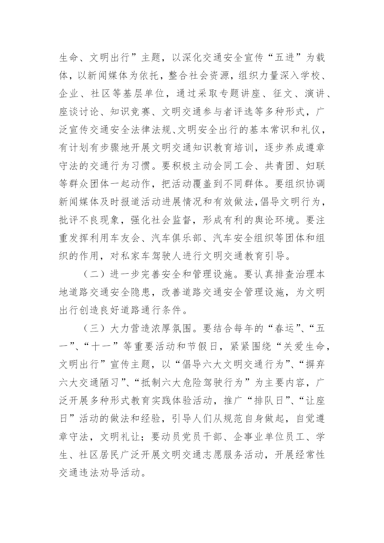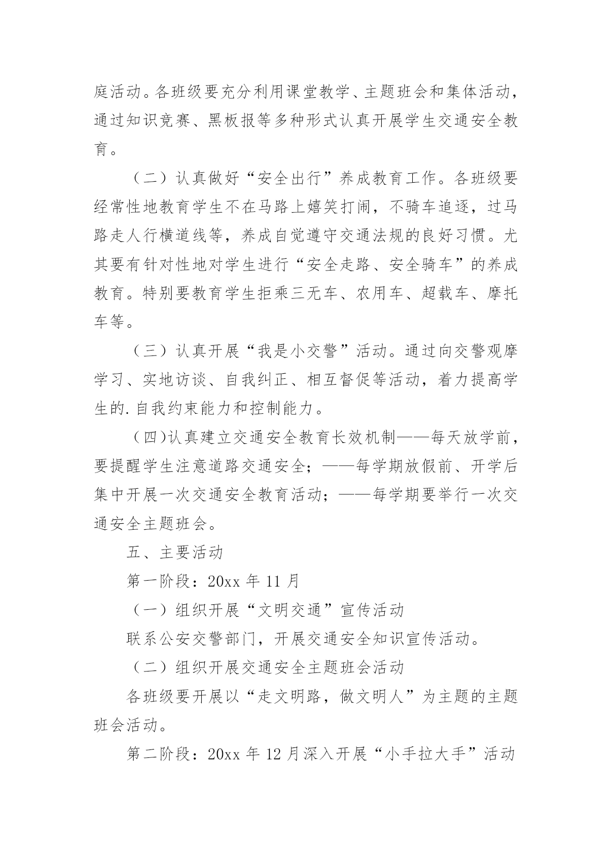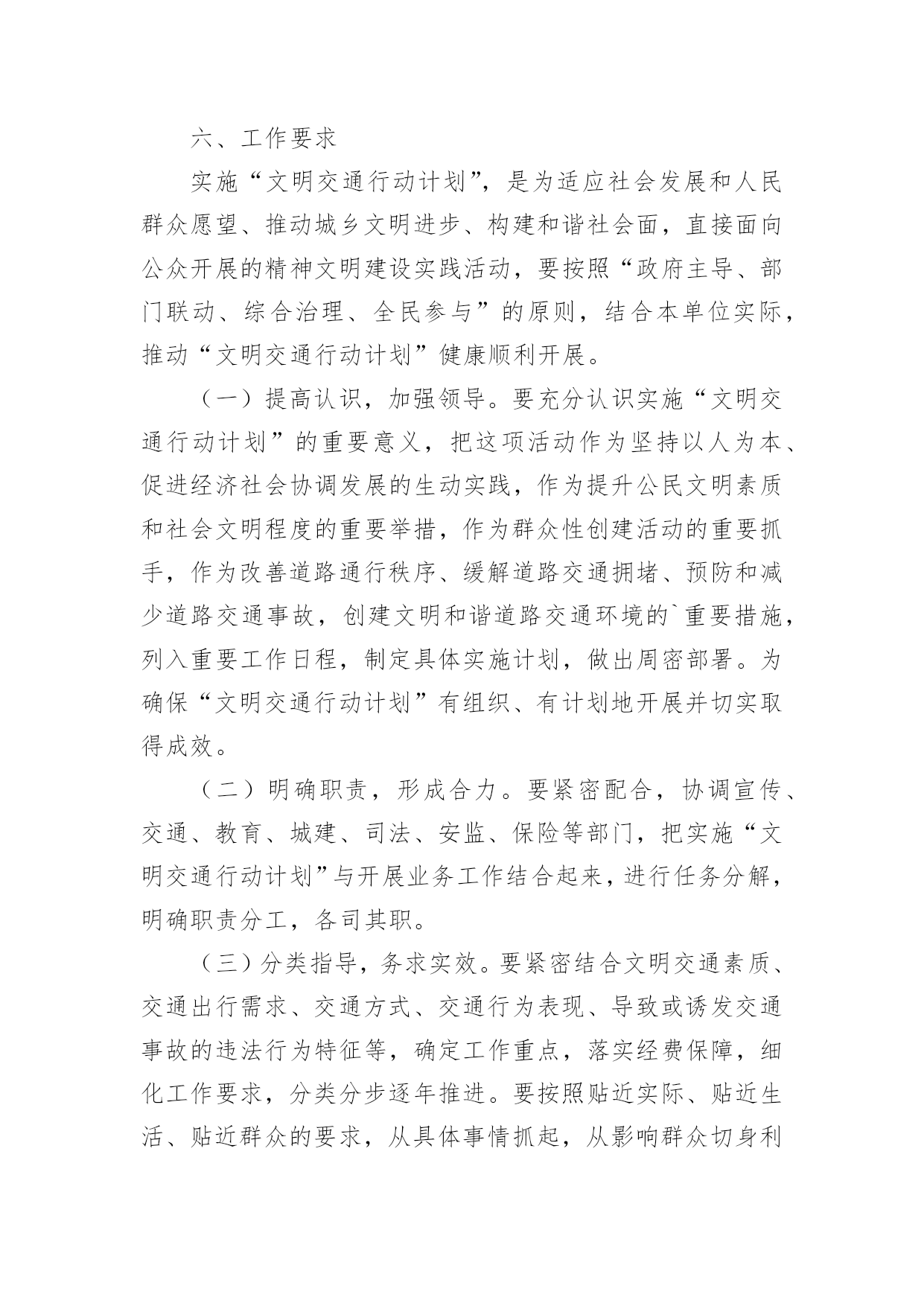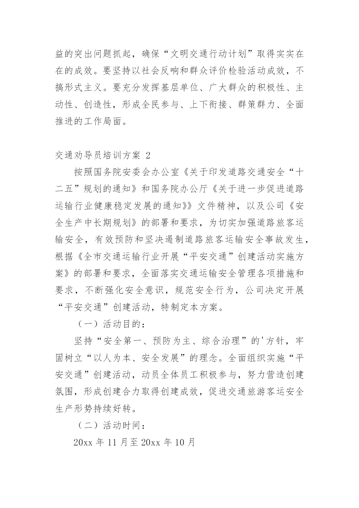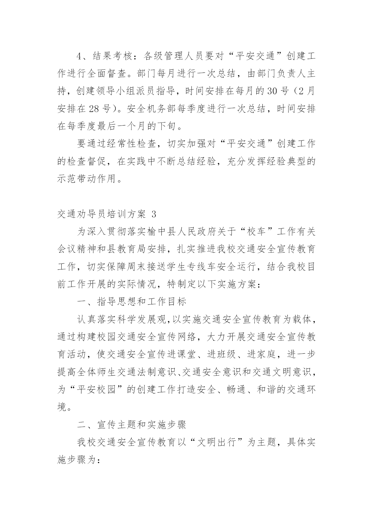 交通劝导员培训方案交通劝导员培训方案范文(通用8篇)为了确保事情或工作有序有力开展,通常需要预先制定一份完整的方案,方案属于计划类文书的一种。你知道什么样的方案才能切实地帮助到我们吗?以下是小编收集整理的交通劝导员培训方案范文,欢迎大家分享。交通劝导员培训方案1为深化“讲文明树新风”活动,着力纠正各类违反交通法规行为,切实增强本单位干部职工交通法治、安全和文明意识,创造良好道路通行环境,进一步提升全县公民文明素质和社会文明程度,根据县文明办、公安局的统一部署,制定了我单位文明交通行动计划实施方案。一、指导思想以邓小平理论和“三个代表”重要思想为指导,深入贯彻落实科学发展观,坚持以人为本,以努力提高公民文明交通素质为主线,以解决影响道路交通安全畅通的突出问题为切入点,以动员社会各界和人民群众共同参与为抓手,以“关爱生命、文明出行”为主题,大力开展文明交通活动,立足当前,着眼长远,科学精细管理,严格规范执法,为推进科学发展、促进尉犁崛起创造安全畅通、文明和谐的道路交通环境。二、工作目标力争通过一年努力,使我单位干部职工交通出行的法治意识、安全意识、文明意识明显增强,交通秩序明显改善,交通事故明显减少,交通执法更加规范,交通管理更加科学,文明交通长效机制进一步完善。三、组织领导为使“文明交通行动计划”在我单位稳步推进并顺利实施,成立实施“文明交通行动计划”工作领导小组,领导小组下设办公室负责指导、协调、督促、检查相关工作。四、活动内容围绕“关爱生命,文明出行”这一活动主题,重点组织开展好以下四项活动:一是倡导“六大文明交通行为”,即大力倡导机动车礼让斑马线、机动车按序排队通行、机动车有序停放、文明使用车灯、行人/非机动车各行其道、行人/非机动车过街遵守信号等文明交通行为。二是“摒弃六大交通陋习”,即自觉告别机动车随意变更车道、占用应急车道、开车打手机、不系安全带、驾乘摩托车不戴头盔、行人过街跨越隔离设施等交通陋习。三是“抵制六大危险驾驶行为”,即坚决抵制酒后驾驶、超速行驶、疲劳驾驶、闯红灯、强行超车、超员/超载等危险驾驶行为。四是“完善六类道路安全及管理设施”,即进一步完善城市过街安全设施、路口渠化设施、出行引导与指路设施、道路车速控制设施、农村公路基本安全设施、施工道路交通组织与安全防护设施。五、主要措施(一)广泛开展文明交通行为教育。要紧紧围绕“关爱生命、文明出行”主题,以深化交通安全宣传“五进”为载体,以新闻媒体为依托,整合社会资源,组织力量深入学校、企业、社区等基层单位,通过采取专题讲座、征文、演讲、座谈讨论、知识竞赛、文明交通参与者评选等多种形式,广泛宣传交通安全法律法规、文明安全出行的基本常识和礼仪,有计划有步骤地开展文明交通知识教育培训,逐步养成遵章守法的交通行为习惯。要积极主动会同工会、共青团、妇联等群众团体一起动作,把活动覆盖到不同群体。要组织协调新闻媒体及时报道活动进展情况和有效做法,倡导文明行为,批评不良现象,强化社会监督,形成有利的舆论环境。要注重发挥利用车友会、汽车俱乐部、汽车安全组织等团体和组织的作用,对私家车驾驶人进行文明交通教育引导。(二)进一步完善安全和管理设施。要认真排查治理本地道路交通安全隐患,改善道路交通安全管理设施,为文明出行创造良好道路通行条件。(三)大力营造浓厚氛围。要结合每年的“春运”、“五一”、“十一”等重要活动和节假日,紧紧围绕“关爱生命,文明出行”宣传主题,以“倡导六大文明交通行为”、“摒弃六大交通陋习”、“抵制六大危险驾驶行为”为主要内容,广泛开展多种形式教育实践体验活动,推广“排队日”、“让座日”活动的做法和经验,引导人们从规范自身做起,自觉遵章守法,文明礼让;要动员党员干部、企事业单位员工、学生、社区居民广泛开展文明交通志愿服务活动,开展经常性交通违法劝导活动。六、工作要求实施“文明交通行动计划”,是为适应社会发展和人民群众愿望、推动城乡文明进步、构建和谐社会面,直接面向公众开展的精神文明建设实践活动,要按照“政府主导、部门联动、综合治理、全民参与”的原则,结合本单位实际,推动“文明交通行动计划”健康顺利开展。(一)提高认识,加强领导。要充分认识实施“文明交通行动计划”的重要意义,把这项活动作为坚持以人为本、促进经济社会协调发展的生动实践,作为提升公民文明素质和社会文明程度的重要举措,作为群众性创建活动的重要抓手,作为改善道路通行秩序、缓解道路交通拥堵、预防和减少道路交通事故,创建文明和谐道路交通环境的`重要措施,列入重要工作日程,制定具体实施计划,做出周密部署。为确保“文明交通行动计划”有组织、有计划地开展并切实取得成效。(二)明确职责,形成合力。要紧密配合,协调宣传、交通、教育、城建、司法、安监、保险等部门,把实施“文明交通行动计划”与开展业务工作结合起来,进行任务