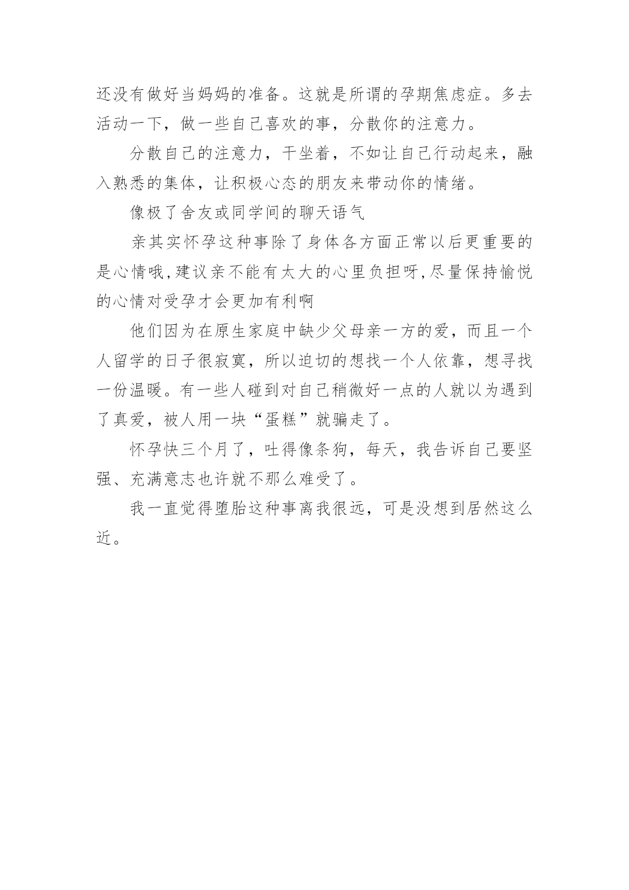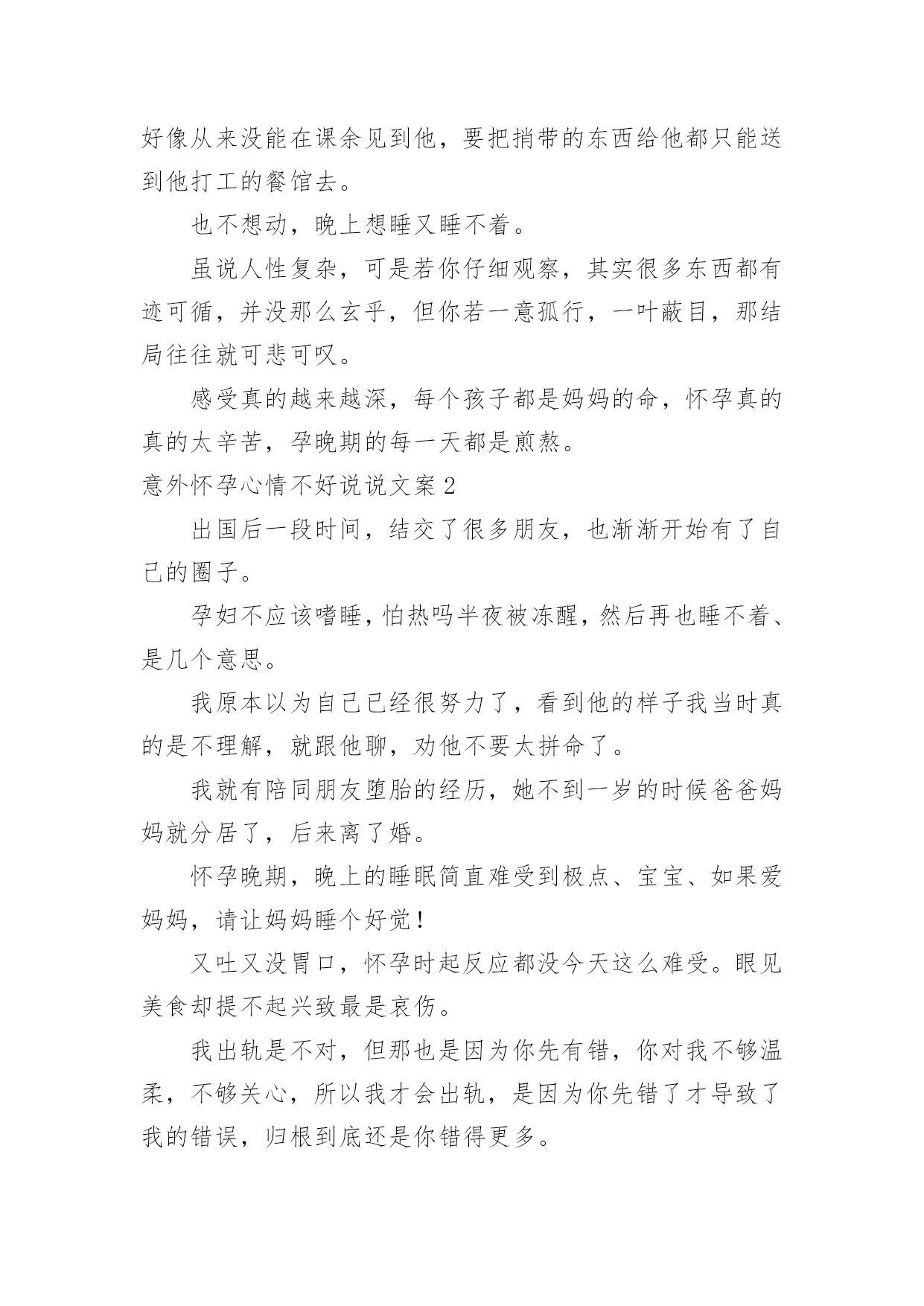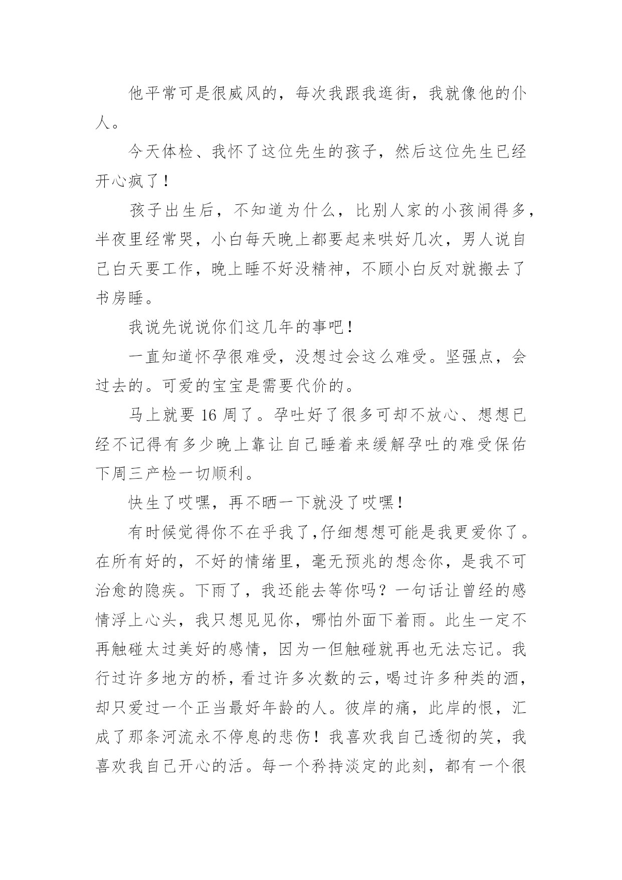 意外怀孕心情不好说说文案意外怀孕心情不好说说文案随着社交平台的兴起,大家都听说过或者使用过一些比较经典的文案吧,文案在生活中是比较重要的一种宣传形式。还在苦苦寻找个性、独特的文案吗?下面是小编整理的意外怀孕心情不好说说文案,欢迎大家借鉴与参考,希望对大家有所帮助。意外怀孕心情不好说说文案1小白很气愤,说我怀着你的孩子,你却在网上聊骚,你对得起我吗?我是出轨了,可是我没说要离婚啊,什么?你居然要跟我离婚,你把我们好好的家拆散了,都是你的错啊!所以,跟这类男人生活,你既要承担他们高概率的出轨风险,还要承担他们颠倒黑白的奇葩逻辑。炫个腹、一辈子能有几次这种形态、虽然辛苦,但很幸福,珍惜母子合体的最后30天。小白苦笑一声说,谁说不是呢?我一惊,不知道说什么好,又生怕她朝我发难,怪我当初“诅咒”她。怀孕2个月多月了,孕吐很难受,吃什么吐什么没有胃口!我出国那年十七岁,我对我将要去学习生活的另一块大陆,一无所知。其实65%的留学生,都有不同程度的抑郁症。要不是儿子特别想要个妹妹、我真的不想要老二了,难受死了,真的是度日如年,真的,怀孕没孕吐的一定是上辈子不知道积了多少德,这辈子才不会如此受罪。可是没想到的是,出国之后发现,留学生群体里,富二代固然不少,然而那些“背水一战”出国留学的人,更多。有的时候真是命运的安排,不想要的,偏偏到了,我只能努力的接受了!我真的不想让自己生活的那么的尴尬,我突然怀孕的时候,我觉得我的人生是那么的痛苦,他就是一个小生命,我不得不要她,但是我从来没有做好打算,让我始终都是那么的'糊涂!从小没有得到过一点父爱,所以很期盼能找到一个好男友来保护自己。在国内妈妈看的紧不让谈恋爱,到国外觉得自己终于自由了,很快和对她献殷勤的学长谈起了恋爱,不到一周她就主动提出了同居,然后就意外又不意外的怀孕了。内心真的想好好的玩几年,不想怀孕却中枪了。还有一种,是单亲留学生中最容易受伤害的。当周围很多留学生购物泡吧傻吃傻睡的时候,他们在图书馆通宵,在连轴转的打工。我认识一位朋友,是个山东小伙子,从来到澳大利亚的第一周就开始打工。在我印象里,好像从来没能在课余见到他,要把捎带的东西给他都只能送到他打工的餐馆去。也不想动,晚上想睡又睡不着。虽说人性复杂,可是若你仔细观察,其实很多东西都有迹可循,并没那么玄乎,但你若一意孤行,一叶蔽目,那结局往往就可悲可叹。感受真的越来越深,每个孩子都是妈妈的命,怀孕真的真的太辛苦,孕晚期的每一天都是煎熬。意外怀孕心情不好说说文案2出国后一段时间,结交了很多朋友,也渐渐开始有了自己的圈子。孕妇不应该嗜睡,怕热吗半夜被冻醒,然后再也睡不着、是几个意思。我原本以为自己已经很努力了,看到他的样子我当时真的是不理解,就跟他聊,劝他不要太拼命了。我就有陪同朋友堕胎的经历,她不到一岁的时候爸爸妈妈就分居了,后来离了婚。怀孕晚期,晚上的睡眠简直难受到极点、宝宝、如果爱妈妈,请让妈妈睡个好觉!又吐又没胃口,怀孕时起反应都没今天这么难受。眼见美食却提不起兴致最是哀伤。我出轨是不对,但那也是因为你先有错,你对我不够温柔,不够关心,所以我才会出轨,是因为你先错了才导致了我的错误,归根到底还是你错得更多。他平常可是很威风的,每次我跟我逛街,我就像他的仆人。今天体检、我怀了这位先生的孩子,然后这位先生已经开心疯了!孩子出生后,不知道为什么,比别人家的小孩闹得多,半夜里经常哭,小白每天晚上都要起来哄好几次,男人说自己白天要工作,晚上睡不好没精神,不顾小白反对就搬去了书房睡。我说先说说你们这几年的事吧!一直知道怀孕很难受,没想过会这么难受。坚强点,会过去的。可爱的宝宝是需要代价的。马上就要16周了。孕吐好了很多可却不放心、想想已经不记得有多少晚上靠让自己睡着来缓解孕吐的难受保佑下周三产检一切顺利。快生了哎嘿,再不晒一下就没了哎嘿!有时候觉得你不在乎我了,仔细想想可能是我更爱你了。在所有好的,不好的情绪里,毫无预兆的想念你,是我不可治愈的隐疾。下雨了,我还能去等你吗?一句话让曾经的感情浮上心头,我只想见见你,哪怕外面下着雨。此生一定不再触碰太过美好的感情,因为一但触碰就再也无法忘记。我行过许多地方的桥,看过许多次数的云,喝过许多种类的酒,却只爱过一个正当最好年龄的人。彼岸的痛,此岸的恨,汇成了那条河流永不停息的悲伤!我喜欢我自己透彻的笑,我喜欢我自己开心的活。每一个矜持淡定的此刻,都有一个很傻很天真的以前。我在原地等你,你却已经忘记曾来过这里。不碰触别人的伤口,才是最大的善意,这世上只有冷暖自知,哪有什么感同身受。作者:王俊俊来源:知乎前不久认识了一个北京妹子,爸爸有严重的家庭暴力,从她记事儿开始,爸爸每次喝酒都会变得理智全无,疯狂的暴打妈妈。在她小的时候,妈妈怕她因为父母离婚在学校被同学嘲笑,欺负,一直隐忍着没离婚,这一忍就是二十年