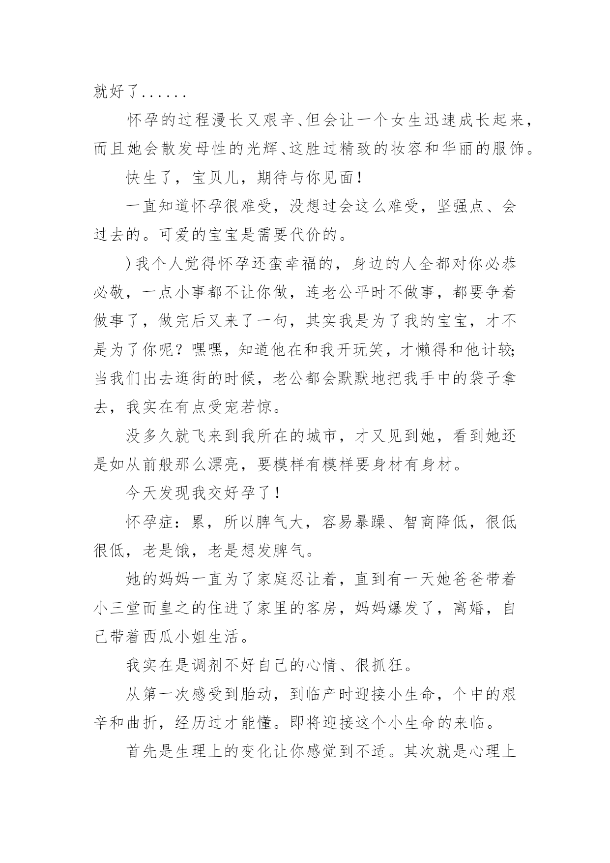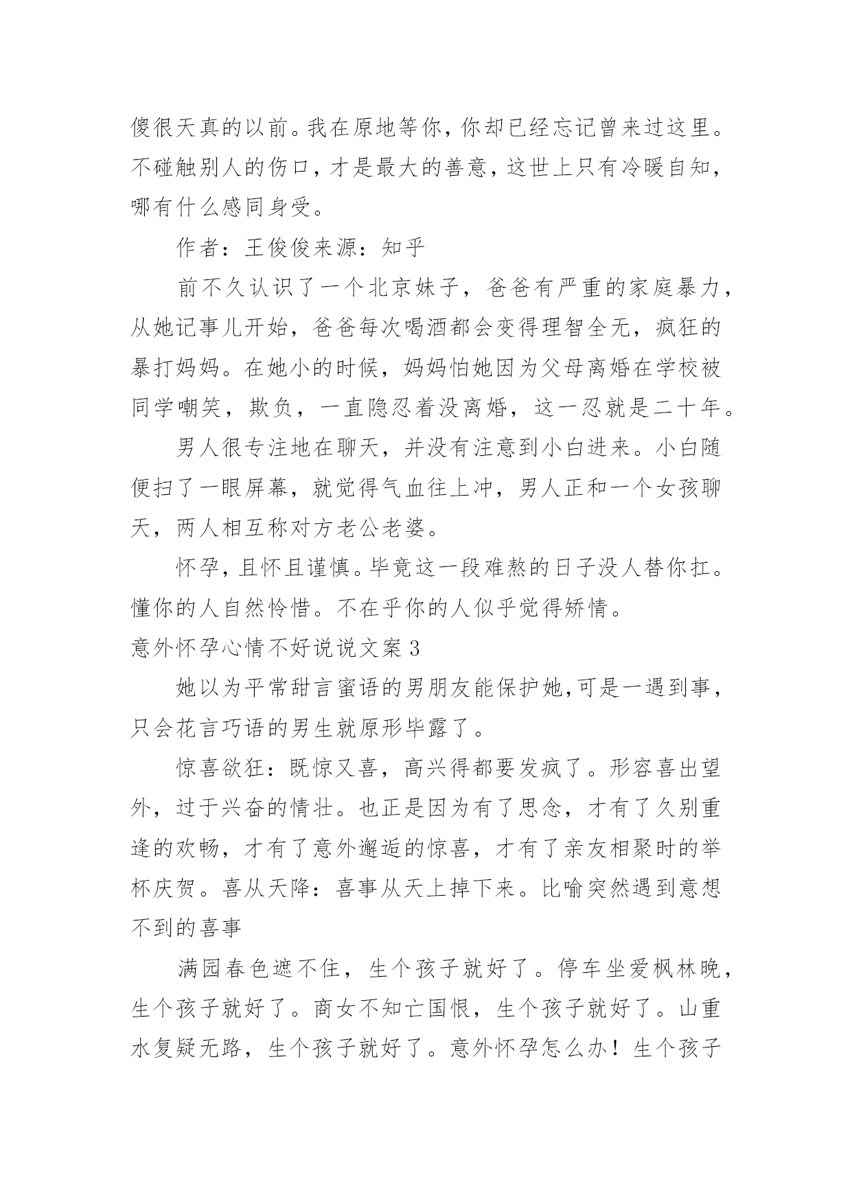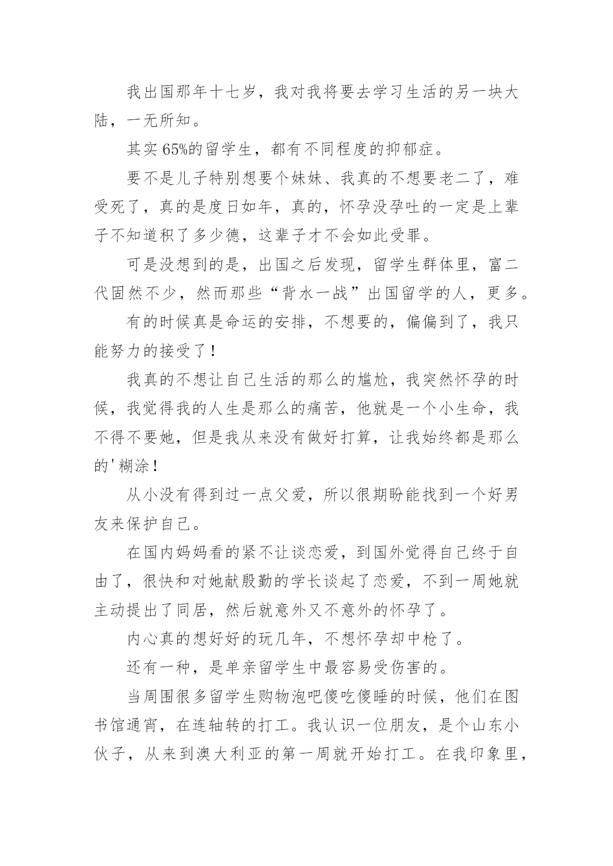 意外怀孕心情不好说说文案意外怀孕心情不好说说文案随着社交平台的兴起,大家都听说过或者使用过一些比较经典的文案吧,文案在生活中是比较重要的一种宣传形式。还在苦苦寻找个性、独特的文案吗?下面是小编整理的意外怀孕心情不好说说文案,欢迎大家借鉴与参考,希望对大家有所帮助。意外怀孕心情不好说说文案1小白很气愤,说我怀着你的孩子,你却在网上聊骚,你对得起我吗?我是出轨了,可是我没说要离婚啊,什么?你居然要跟我离婚,你把我们好好的家拆散了,都是你的错啊!所以,跟这类男人生活,你既要承担他们高概率的出轨风险,还要承担他们颠倒黑白的奇葩逻辑。炫个腹、一辈子能有几次这种形态、虽然辛苦,但很幸福,珍惜母子合体的最后30天。小白苦笑一声说,谁说不是呢?我一惊,不知道说什么好,又生怕她朝我发难,怪我当初“诅咒”她。怀孕2个月多月了,孕吐很难受,吃什么吐什么没有胃口!我出国那年十七岁,我对我将要去学习生活的另一块大陆,一无所知。其实65%的留学生,都有不同程度的抑郁症。要不是儿子特别想要个妹妹、我真的不想要老二了,难受死了,真的是度日如年,真的,怀孕没孕吐的一定是上辈子不知道积了多少德,这辈子才不会如此受罪。可是没想到的是,出国之后发现,留学生群体里,富二代固然不少,然而那些“背水一战”出国留学的人,更多。有的时候真是命运的安排,不想要的,偏偏到了,我只能努力的接受了!我真的不想让自己生活的那么的尴尬,我突然怀孕的时候,我觉得我的人生是那么的痛苦,他就是一个小生命,我不得不要她,但是我从来没有做好打算,让我始终都是那么的'糊涂!从小没有得到过一点父爱,所以很期盼能找到一个好男友来保护自己。在国内妈妈看的紧不让谈恋爱,到国外觉得自己终于自由了,很快和对她献殷勤的学长谈起了恋爱,不到一周她就主动提出了同居,然后就意外又不意外的怀孕了。内心真的想好好的玩几年,不想怀孕却中枪了。还有一种,是单亲留学生中最容易受伤害的。当周围很多留学生购物泡吧傻吃傻睡的时候,他们在图书馆通宵,在连轴转的打工。我认识一位朋友,是个山东小伙子,从来到澳大利亚的第一周就开始打工。在我印象里,好像从来没能在课余见到他,要把捎带的东西给他都只能送到他打工的餐馆去。也不想动,晚上想睡又睡不着。虽说人性复杂,可是若你仔细观察,其实很多东西都有迹可循,并没那么玄乎,但你若一意孤行,一叶蔽目,那结局往往就可悲可叹。感受真的越来越深,每个孩子都是妈妈的命,怀孕真的真的太辛苦,孕晚期的每一天都是煎熬。意外怀孕心情不好说说文案2出国后一段时间,结交了很多朋友,也渐渐开始有了自己的圈子。孕妇不应该嗜睡,怕热吗半夜被冻醒,然后再也睡不着、是几个意思。我原本以为自己已经很努力了,看到他的样子我当时真的是不理解,就跟他聊,劝他不要太拼命了。我就有陪同朋友堕胎的经历,她不到一岁的时候爸爸妈妈就分居了,后来离了婚。怀孕晚期,晚上的睡眠简直难受到极点、宝宝、如果爱妈妈,请让妈妈睡个好觉!又吐又没胃口,怀孕时起反应都没今天这么难受。眼见美食却提不起兴致最是哀伤。我出轨是不对,但那也是因为你先有错,你对我不够温柔,不够关心,所以我才会出轨,是因为你先错了才导致了我的错误,归根到底还是你错得更多。他平常可是很威风的,每次我跟我逛街,我就像他的仆人。今天体检、我怀了这位先生的孩子,然后这位先生已经开心疯了!孩子出生后,不知道为什么,比别人家的小孩闹得多,半夜里经常哭,小白每天晚上都要起来哄好几次,男人说自己白天要工作,晚上睡不好没精神,不顾小白反对就搬去了书房睡。我说先说说你们这几年的事吧!一直知道怀孕很难受,没想过会这么难受。坚强点,会过去的。可爱的宝宝是需要代价的。马上就要16周了。孕吐好了很多可却不放心、想想已经不记得有多少晚上靠让自己睡着来缓解孕吐的难受保佑下周三产检一切顺利。快生了哎嘿,再不晒一下就没了哎嘿!有时候觉得你不在乎我了,仔细想想可能是我更爱你了。在所有好的,不好的情绪里,毫无预兆的想念你,是我不可治愈的隐疾。下雨了,我还能去等你吗?一句话让曾经的感情浮上心头,我只想见见你,哪怕外面下着雨。此生一定不再触碰太过美好的感情,因为一但触碰就再也无法忘记。我行过许多地方的桥,看过许多次数的云,喝过许多种类的酒,却只爱过一个正当最好年龄的人。彼岸的痛,此岸的恨,汇成了那条河流永不停息的悲伤!我喜欢我自己透彻的笑,我喜欢我自己开心的活。每一个矜持淡定的此刻,都有一个很傻很天真的以前。我在原地等你,你却已经忘记曾来过这里。不碰触别人的伤口,才是最大的善意,这世上只有冷暖自知,哪有什么感同身受。作者:王俊俊来源:知乎前不久认识了一个北京妹子,爸爸有严重的家庭暴力,从她记事儿开始,爸爸每次喝酒都会变得理智全无,疯狂的暴打妈妈。在她小的时候,妈妈怕她因为父母离婚在学校被同学嘲笑,欺负,一直隐忍着没离婚,这一忍就是二十年