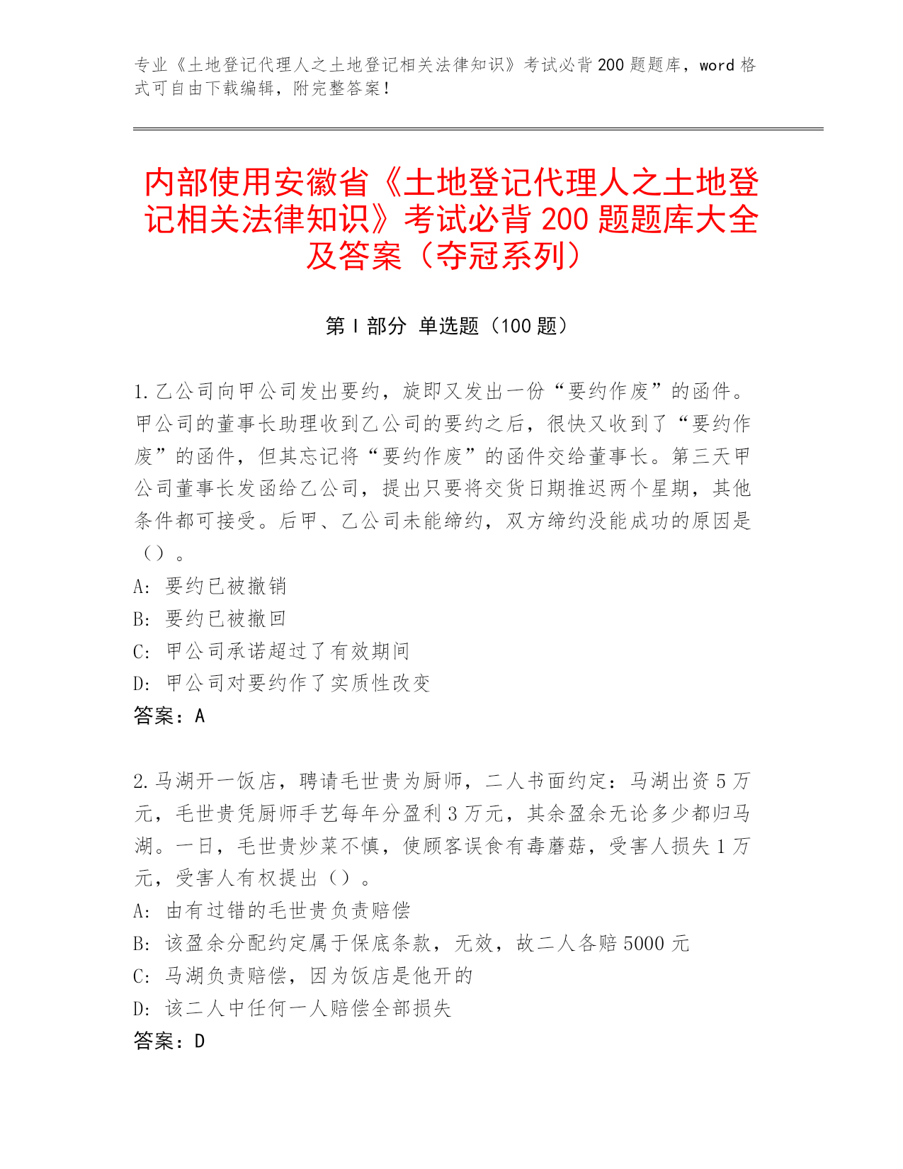 内部使用安徽省《土地登记代理人之土地登记相关法律知识》考试必背200题题库大全及答案(夺冠系列).docx