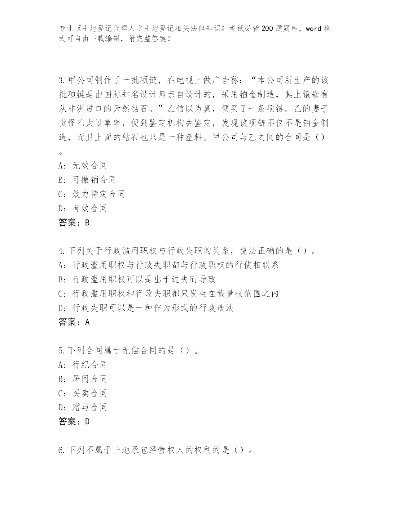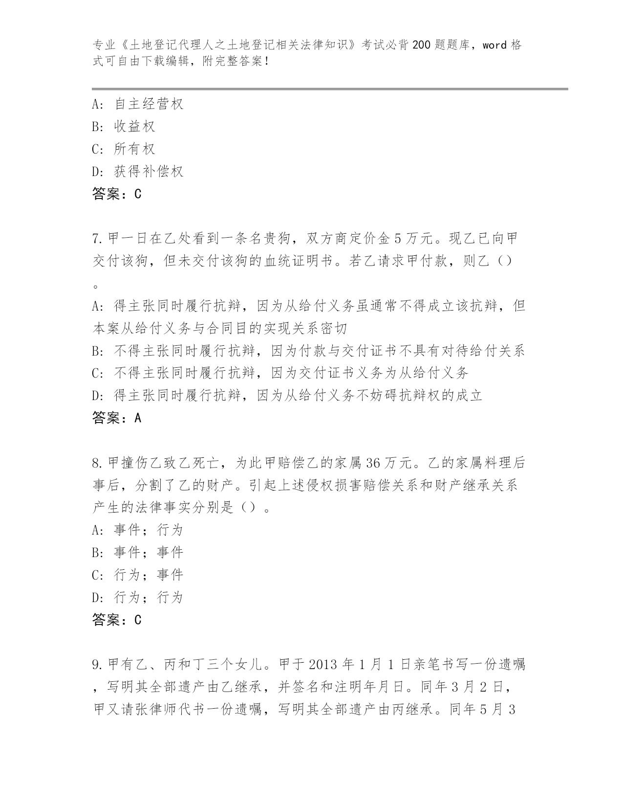 2024黑龙江省泰来县《土地登记代理人之土地登记相关法律知识》资格考试必刷200题真题(网校专用)
