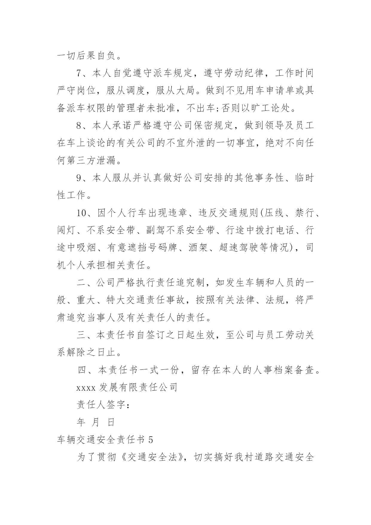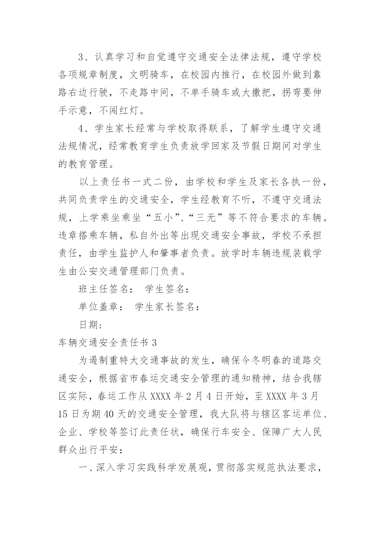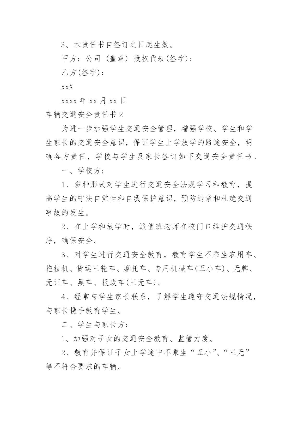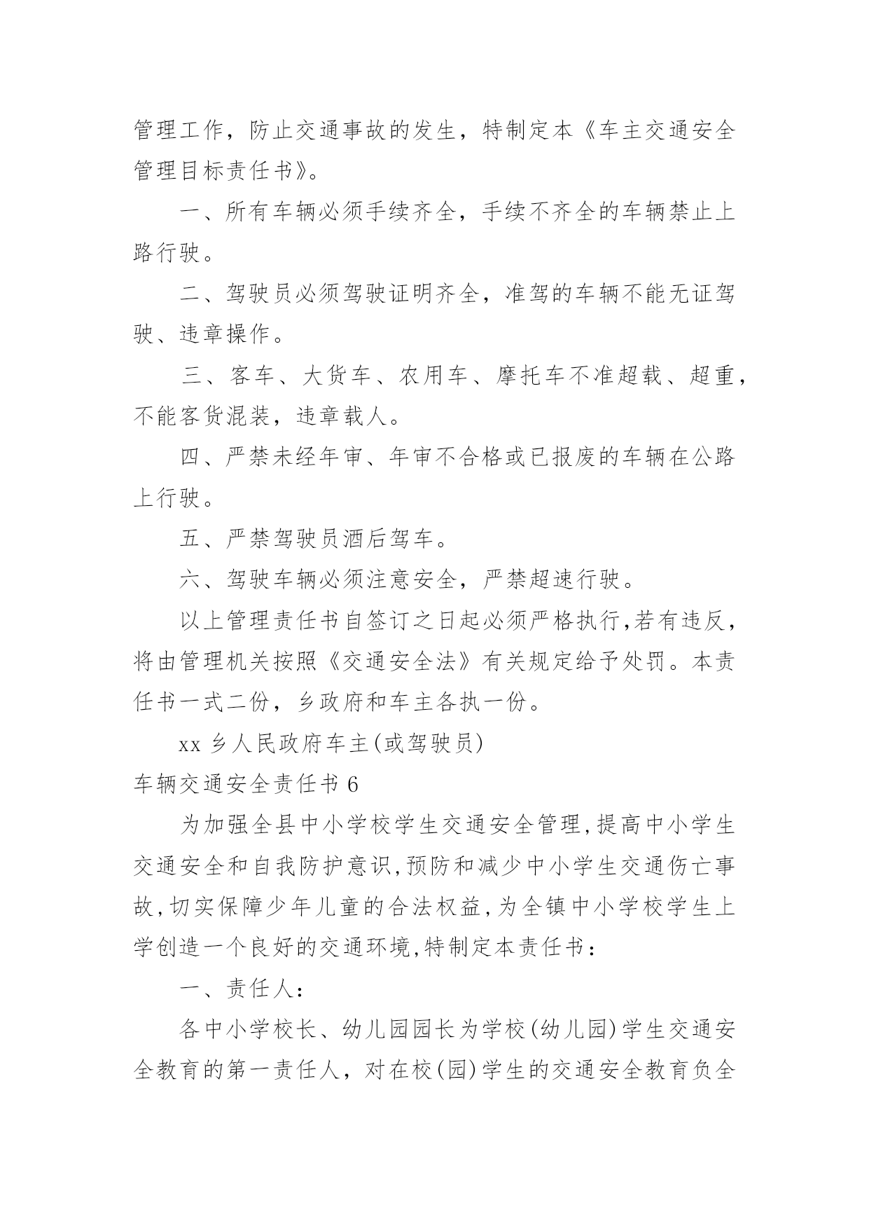 车辆交通安全责任书车辆交通安全责任书现如今,很多情况下我们都会接触到责任书,签订责任书有助于落实责任。那么你真正懂得怎么制定责任书吗?下面是小编收集整理的车辆交通安全责任书,仅供参考,大家一起来看看吧。车辆交通安全责任书1甲方:公司乙方:(车辆驾驶人)为进一步加强车辆管理,杜绝交通事故的发生,确保员工及家庭的安全与幸福,根据公司《车辆管理制度》就私车公用车辆的使用、管理、及有关费用与使用人签订如下责任书。一、甲方权利、责任1、甲方根据部门工作需要、车型(每百公里油耗量)、家居距离,依据《车辆补贴办法》为乙方车牌照号为:的私家车加油,并每月发放车损补助。2、甲方免费为车辆安装GPS定位系统与行车记录仪,对行车中出现的违反规定的情况每月进行核查、处理。(储运部核查违规车辆,企管人事部对违反规定的罚款,在每月的工资中扣除。)3、甲方如遇特殊情况,不论工作时间或休假期间,公司有权调度所有车辆。二、乙方权利、责任1、乙方承诺:严格遵守公司制定的《车辆管理制度》,对所使用车辆的安全负全部责任。2、乙方承诺:严格遵守交通规则,安全驾驶。不酒后驾车、不疲劳驾车、不危险驾车(如:超速、紧跟、争道、赛车等)。如因违返交通法律法规造成的责任与罚款,甲方概不负责,全部由乙方自行承担。3、乙方承诺:讲究交通公德和职业道德,文明驾驶、礼貌行车,服从交通民警的指挥,车辆按时年审,驾驶证按时年审。4、乙方做好车辆日常维护、保养工作,做好车辆查工作,发现问题即使修理,严禁驾驶部件失灵的车辆。5、乙方如果发生交通事故与违章,要及时如实向甲方相关管理责任人及部门报告备案,所发生的经济处罚及赔款(包括对公司的处罚)一律由乙方个人承担。根据情节与损失的大小按甲方有关规定接受处罚(超速罚款500元,酒后驾驶罚款1000元,其他违章按交通规定罚款)。三、附则1、乙方因违反上述规定所应支付的款项,甲方有权在乙方工资(或资金等)中扣除,乙方不得提出异议。2、以上条款具有同行法律效力,双方各执一份,相互遵守,严格执行。3、本责任书自签订之日起生效。甲方:公司(盖章)授权代表(签字):乙方(签字):xxXxxxx年xx月xx日车辆交通安全责任书2为进一步加强学生交通安全管理,增强学校、学生和学生家长的交通安全意识,保证学生上学放学的路途安全,明确各方责任,学校与学生及家长签订如下交通安全责任书。一、学校方:1、多种形式对学生进行交通安全法规学习和教育,提高学生的守法自觉性和自我保护意识,预防违章和杜绝交通事故的发生。2、在上学和放学时,派值班老师在校门口维护交通秩序,确保安全。3、对学生进行交通安全教育,教育学生不乘坐农用车、拖拉机、货运三轮车、摩托车、专用机械车(五小车)、无牌、无证车、黑车、报废车(三无车)。4、经常与学生家长联系,了解学生遵守交通法规情况,与家长携手教育学生。二、学生与家长方:1、加强对子女的交通安全教育、监管力度。2、教育并保证子女上学途中不乘坐“五小”、“三无”等不符合要求的车辆。3、认真学习和自觉遵守交通安全法律法规,遵守学校各项规章制度,文明骑车,在校园内推行,在校园外做到靠路右边行驶,不走路中间,不单手骑车或大撒把,拐弯要伸手示意,不闯红灯。4、学生家长经常与学校取得联系,了解学生遵守交通法规情况,经常教育学生负责放学回家及节假日期间对学生的教育管理。以上责任书一式二份,由学校和学生及家长各执一份,共同负责学生的交通安全,学生经教育不听,不遵守交通法规,上学乘坐乘坐“五小”、“三无”等不符合要求的车辆。违章搭乘车辆,私自外出等出现交通安全事故,学校不承担责任,由学生监护人和肇事者负责。放学时车辆违规装载学生由公安交通管理部门负责。班主任签名:学生签名:单位盖章:学生家长签名:日期:车辆交通安全责任书3为遏制重特大交通事故的发生,确保今冬明春的道路交通安全,根据省市春运交通安全管理的通知精神,结合我辖区实际,春运工作从XXXX年2月4日开始,至XXXX年3月15日为期40天的交通安全管理,我大队将与辖区客运单位、企业、学校等签订此责任状,确保行车安全、保障广大人民群众出行平安:一、深入学习实践科学发展观,贯彻落实规范执法要求,加强信息化建设,进一步构建和谐警民关系,围绕“降事故、保安全、保畅通”工作要求,把春运交通安全工作抓紧、抓实,责任到人,确保人民群众生命财产安全,为春运期间广大人民群众出行创造安全、有序、畅通的交通环境。二、各客运单位、企业要强化源头管理、深化交通安全宣传,落实交通安全责任制,交警大队将利用春运启动日组织客运企业领导、管理人员、驾驶人、售票员和所有从事春运的客运职工,进行一次道路交通安全宣传教育,开展一次面对面的宣传,提高预防交通事故的安全意识。三、严厉查纠超员、超速、酒后、疲劳驾驶等危及行车安全的严重交通违法行为,着力消除