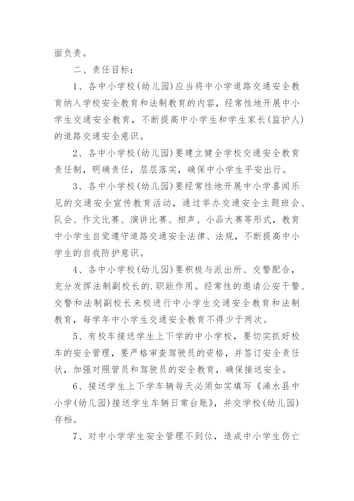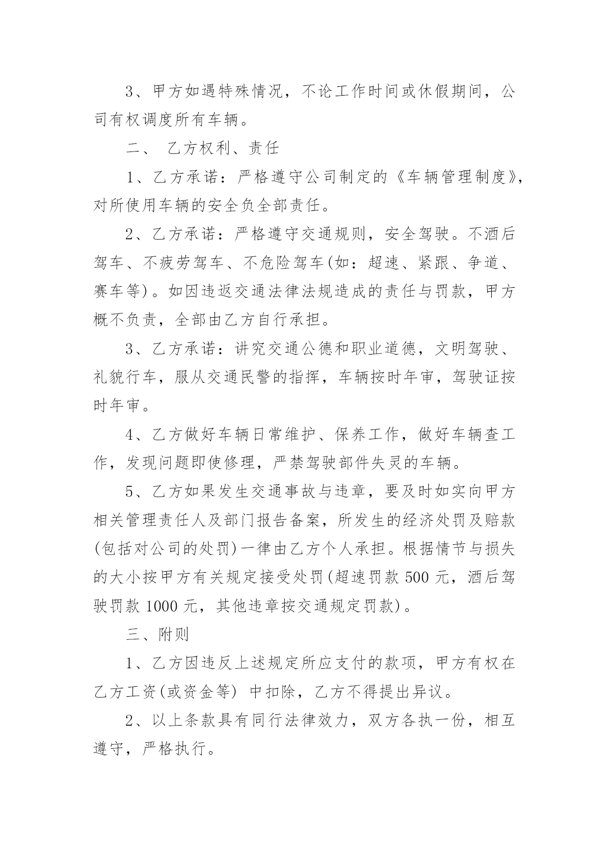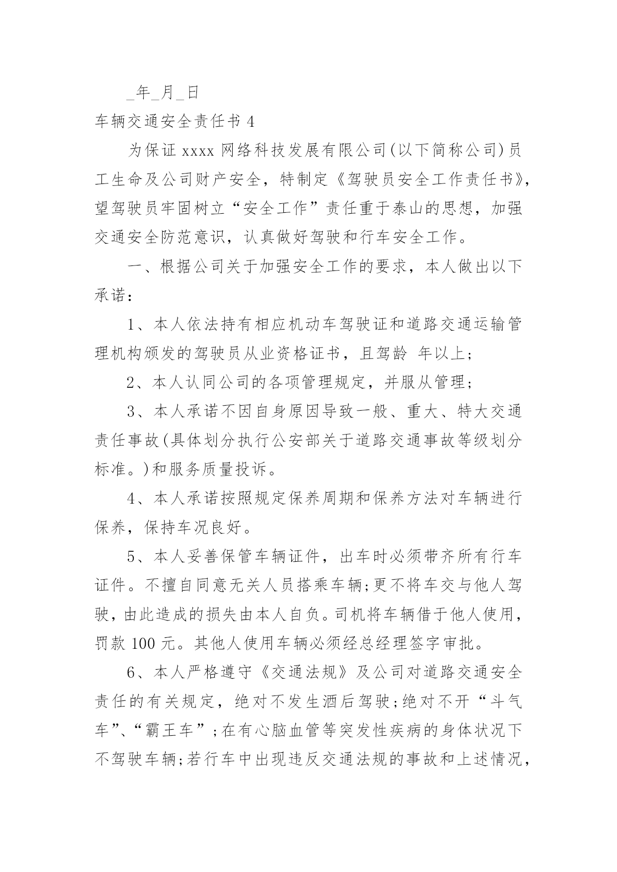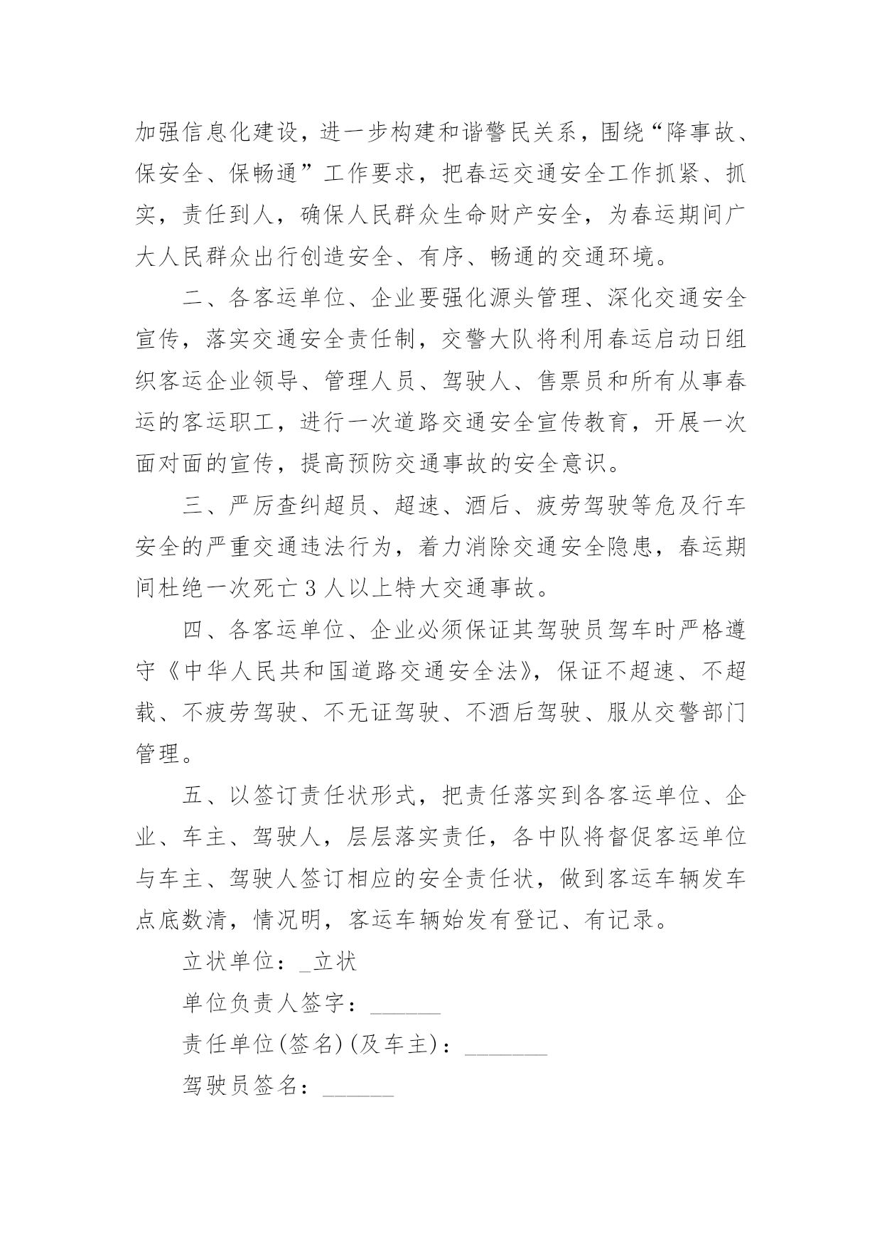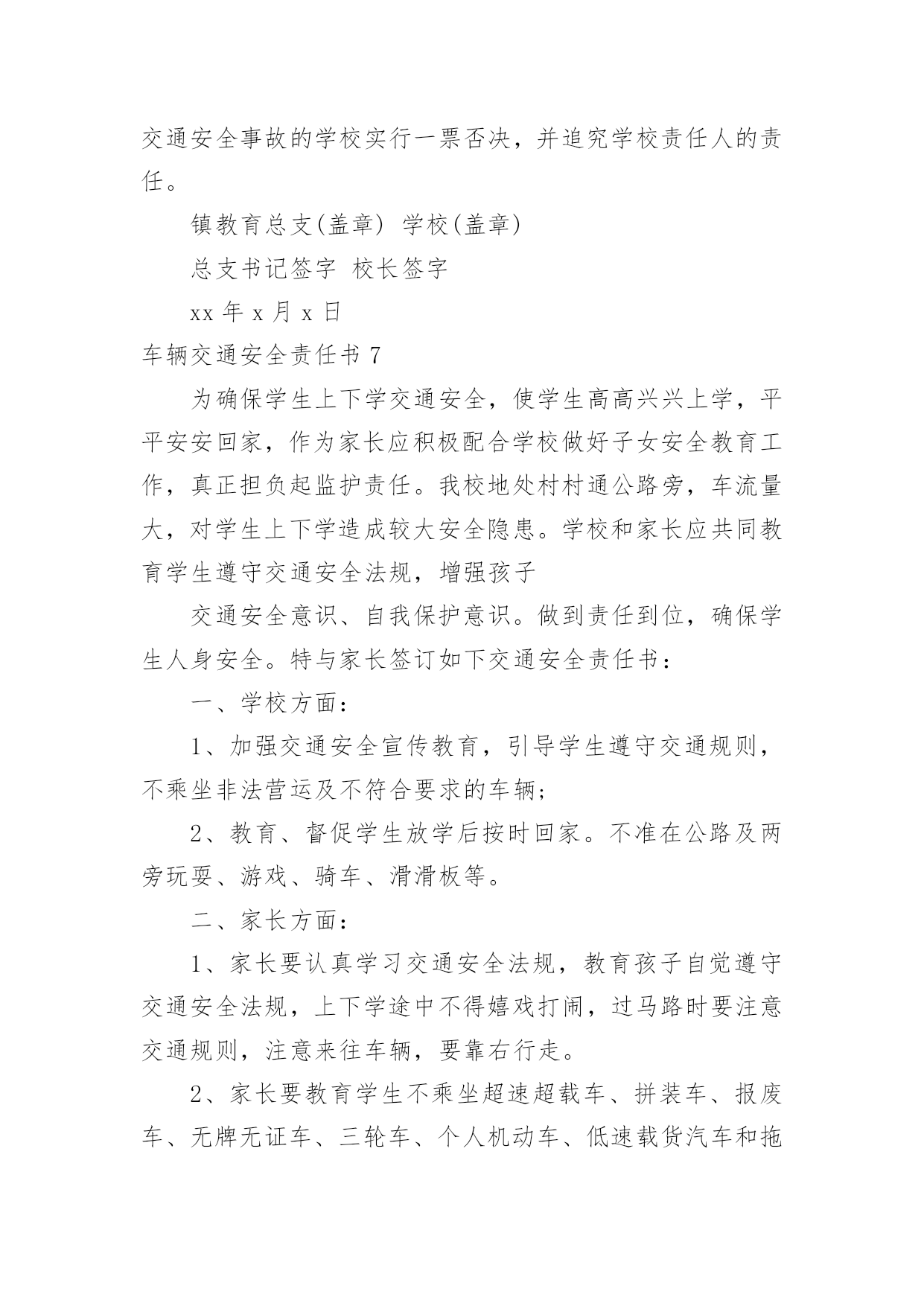 车辆交通安全责任书车辆交通安全责任书现如今,很多情况下我们都会接触到责任书,签订责任书有助于落实责任。那么你真正懂得怎么制定责任书吗?下面是小编收集整理的车辆交通安全责任书,仅供参考,大家一起来看看吧。车辆交通安全责任书1甲方:公司乙方:(车辆驾驶人)为进一步加强车辆管理,杜绝交通事故的发生,确保员工及家庭的安全与幸福,根据公司《车辆管理制度》就私车公用车辆的使用、管理、及有关费用与使用人签订如下责任书。一、甲方权利、责任1、甲方根据部门工作需要、车型(每百公里油耗量)、家居距离,依据《车辆补贴办法》为乙方车牌照号为:的私家车加油,并每月发放车损补助。2、甲方免费为车辆安装GPS定位系统与行车记录仪,对行车中出现的违反规定的情况每月进行核查、处理。(储运部核查违规车辆,企管人事部对违反规定的罚款,在每月的工资中扣除。)3、甲方如遇特殊情况,不论工作时间或休假期间,公司有权调度所有车辆。二、乙方权利、责任1、乙方承诺:严格遵守公司制定的《车辆管理制度》,对所使用车辆的安全负全部责任。2、乙方承诺:严格遵守交通规则,安全驾驶。不酒后驾车、不疲劳驾车、不危险驾车(如:超速、紧跟、争道、赛车等)。如因违返交通法律法规造成的责任与罚款,甲方概不负责,全部由乙方自行承担。3、乙方承诺:讲究交通公德和职业道德,文明驾驶、礼貌行车,服从交通民警的指挥,车辆按时年审,驾驶证按时年审。4、乙方做好车辆日常维护、保养工作,做好车辆查工作,发现问题即使修理,严禁驾驶部件失灵的车辆。5、乙方如果发生交通事故与违章,要及时如实向甲方相关管理责任人及部门报告备案,所发生的经济处罚及赔款(包括对公司的处罚)一律由乙方个人承担。根据情节与损失的大小按甲方有关规定接受处罚(超速罚款500元,酒后驾驶罚款1000元,其他违章按交通规定罚款)。三、附则1、乙方因违反上述规定所应支付的款项,甲方有权在乙方工资(或资金等)中扣除,乙方不得提出异议。2、以上条款具有同行法律效力,双方各执一份,相互遵守,严格执行。3、本责任书自签订之日起生效。甲方:公司(盖章)授权代表(签字):乙方(签字):xxXxxxx年xx月xx日车辆交通安全责任书2为进一步加强学生交通安全管理,增强学校、学生和学生家长的交通安全意识,保证学生上学放学的路途安全,明确各方责任,学校与学生及家长签订如下交通安全责任书。一、学校方:1、多种形式对学生进行交通安全法规学习和教育,提高学生的守法自觉性和自我保护意识,预防违章和杜绝交通事故的发生。2、在上学和放学时,派值班老师在校门口维护交通秩序,确保安全。3、对学生进行交通安全教育,教育学生不乘坐农用车、拖拉机、货运三轮车、摩托车、专用机械车(五小车)、无牌、无证车、黑车、报废车(三无车)。4、经常与学生家长联系,了解学生遵守交通法规情况,与家长携手教育学生。二、学生与家长方:1、加强对子女的交通安全教育、监管力度。2、教育并保证子女上学途中不乘坐“五小”、“三无”等不符合要求的车辆。3、认真学习和自觉遵守交通安全法律法规,遵守学校各项规章制度,文明骑车,在校园内推行,在校园外做到靠路右边行驶,不走路中间,不单手骑车或大撒把,拐弯要伸手示意,不闯红灯。4、学生家长经常与学校取得联系,了解学生遵守交通法规情况,经常教育学生负责放学回家及节假日期间对学生的教育管理。以上责任书一式二份,由学校和学生及家长各执一份,共同负责学生的交通安全,学生经教育不听,不遵守交通法规,上学乘坐乘坐“五小”、“三无”等不符合要求的车辆。违章搭乘车辆,私自外出等出现交通安全事故,学校不承担责任,由学生监护人和肇事者负责。放学时车辆违规装载学生由公安交通管理部门负责。班主任签名:学生签名:单位盖章:学生家长签名:日期:车辆交通安全责任书3为遏制重特大交通事故的发生,确保今冬明春的道路交通安全,根据省市春运交通安全管理的通知精神,结合我辖区实际,春运工作从XXXX年2月4日开始,至XXXX年3月15日为期40天的交通安全管理,我大队将与辖区客运单位、企业、学校等签订此责任状,确保行车安全、保障广大人民群众出行平安:一、深入学习实践科学发展观,贯彻落实规范执法要求,加强信息化建设,进一步构建和谐警民关系,围绕“降事故、保安全、保畅通”工作要求,把春运交通安全工作抓紧、抓实,责任到人,确保人民群众生命财产安全,为春运期间广大人民群众出行创造安全、有序、畅通的交通环境。二、各客运单位、企业要强化源头管理、深化交通安全宣传,落实交通安全责任制,交警大队将利用春运启动日组织客运企业领导、管理人员、驾驶人、售票员和所有从事春运的客运职工,进行一次道路交通安全宣传教育,开展一次面对面的宣传,提高预防交通事故的安全意识。三、严厉查纠超员、超速、酒后、疲劳驾驶等危及行车安全的严重交通违法行为,着力消除