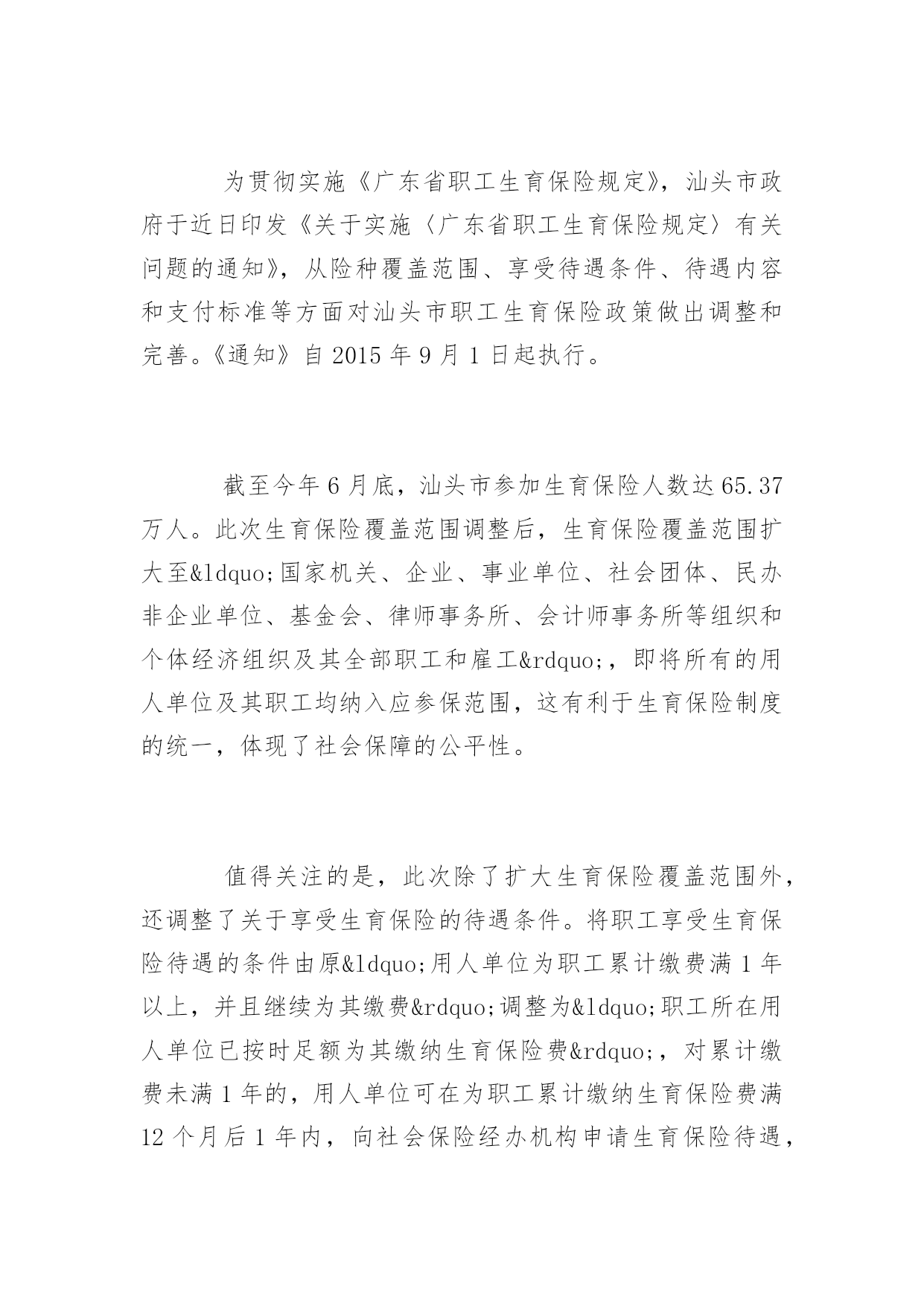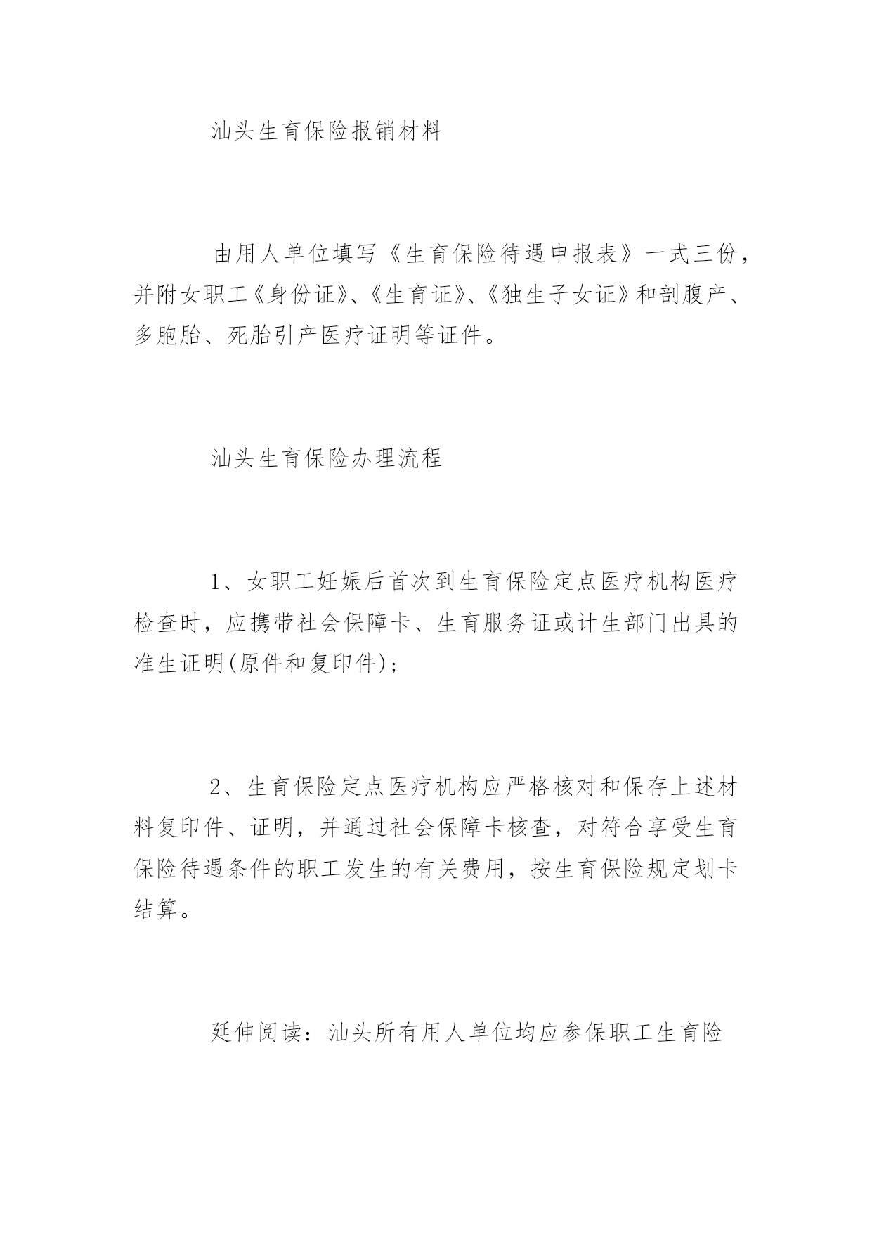 汕头生育保险报销条件2017汕头生育保险报销条件生育保险的报销需要满足一定的条件,那么在汕头,生育保险的报销条件是怎样的呢?今天我们就一起来看看相关内容吧!汕头生育保险报销条件1、符合计划生育政策生育的;2、工作年限满一年以上或者在领取失业救济金期间生育的;3、缴费年限满一年以上的。汕头生育保险报销材料由用人单位填写《生育保险待遇申报表》一式三份,并附女职工《身份证》、《生育证》、《独生子女证》和剖腹产、多胞胎、死胎引产医疗证明等证件。汕头生育保险办理流程1、女职工妊娠后首次到生育保险定点医疗机构医疗检查时,应携带社会保障卡、生育服务证或计生部门出具的准生证明(原件和复印件);2、生育保险定点医疗机构应严格核对和保存上述材料复印件、证明,并通过社会保障卡核查,对符合享受生育保险待遇条件的职工发生的有关费用,按生育保险规定划卡结算。延伸阅读:汕头所有用人单位均应参保职工生育险为贯彻实施《广东省职工生育保险规定》,汕头市政府于近日印发《关于实施〈广东省职工生育保险规定〉有关问题的通知》,从险种覆盖范围、享受待遇条件、待遇内容和支付标准等方面对汕头市职工生育保险政策做出调整和完善。《通知》自2015年9月1日起执行。截至今年6月底,汕头市参加生育保险人数达65.37万人。此次生育保险覆盖范围调整后,生育保险覆盖范围扩大至“国家机关、企业、事业单位、社会团体、民办非企业单位、基金会、律师事务所、会计师事务所等组织和个体经济组织及其全部职工和雇工”,即将所有的用人单位及其职工均纳入应参保范围,这有利于生育保险制度的统一,体现了社会保障的公平性。值得关注的是,此次除了扩大生育保险覆盖范围外,还调整了关于享受生育保险的待遇条件。将职工享受生育保险待遇的条件由原“用人单位为职工累计缴费满1年以上,并且继续为其缴费”调整为“职工所在用人单位已按时足额为其缴纳生育保险费”,对累计缴费未满1年的,用人单位可在为职工累计缴纳生育保险费满12个月后1年内,向社会保险经办机构申请生育保险待遇,进一步保障了参保职工的生育保险权益。政策调整后,还增加计划生育手术假期津贴,原有的晚婚晚育和独子等计划生育奖励增加的产假津贴和看护假津贴改由用人单位按规定支付;同时,为让参保人待遇兑现更加简便快捷,将原有定额发放的生育医疗费用补助调整为职工在协议医疗服务机构发生的符合规定的生育医疗费用直接记账,由生育保险基金支付,个人不需垫付费用。另外,将职工未就业配偶享受生育医疗费用待遇,领取失业保险金期间或达到法定退休年龄后发生符合规定的生育医疗费用,纳入生育保险基金支付。据介绍,因《广东省职工生育保险规定》自2015年1月1日起施行。为确保政策执行过渡期内参保人权益,《通知》明确2015年1月1日后生育或施行计划生育手术的职工,可按《通知》的规定享受相应待遇。