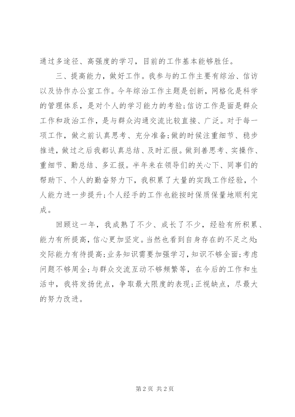 第PAGE\*Arabic\*MERGEFORMAT2页共NUMPAGES\*MERGEFORMAT2页乡镇公务员个人年终总结**年下半年,我通过省公务员考试,如愿以偿地回到了自己的家乡——**镇,转眼已经工作一年多了。在各位领导的关心栽培和同事们的帮助支持下,我始终勤奋学习、积极进取,努力提高自我,始终勤奋工作,认真完成任务,履行好岗位职责。现将一年来的学习、工作情况简要总结如下:一、以德为先,摆正心态。政府部门是为人民服务的窗口,政府人员是人民的公仆,进入基层工作不是成为人上人、作威作福,不是为了争权上位。意识到这点,我首先注重自身思想道德的修养,培养自己正确的价值观、事业观、人生观,树立心中的“一杆秤”,明晰自己的道德“底线”。其次是摆正心态,怀一颗服务之心,秉公平、公正态度来面对工作、面对群众,扎实地做好日常工作中的每一件事。二、加强学习,迅速适应。虽然之前已经有近两年的私企工作经验,但是政府工作对我们新进公务员来说是全新的领域,工作环境、工作性质、工作要求都与外面企业单位有很大不同,只有通过加强学习,才能迅速适应新的岗位、新的工作、新的职责。一方面加强政治理论学习,提高政治素养;一方面积极与群众打成一片,了解群众所需所想;一方面多看报纸、新闻报道、杂志评论等,积累写作素材;一方面虚心向领导及同事请教。不清楚的多问、不懂的多请教,多与同事交流沟通,促进同事间的感情。通过多途径、高强度的学习,目前的工作基本能够胜任。三、提高能力,做好工作。我参与的工作主要有综治、信访以及协作办公室工作。今年综治工作主题是创新,网格化是科学的管理体系,是对个人的学习能力的考验;信访工作是面是群众工作和政治工作,是与群众沟通交流比较直接、广泛。对于每一项工作,做之前认真思考、充分准备;做的时候注重细节、稳步推进,做过之后我都认真总结、及时汇报。做到善思考、实操作、重细节、勤总结、多汇报。半年来在领导们的关心下、同事们的帮助下、个人的勤奋努力下,我积累了大量的实践工作经验,个人能力进一步提升;个人经手的工作也能按时保质保量地顺利完成。回顾这一年,我成熟了不少、成长了不少,经验有所积累、能力有所提高,信心更加坚定。当然也看到自身存在的不足之处:交际能力有待提高;业务知识需要加强学习,知识不够全面;考虑问题不够周全;与群众交流互动不够频繁等,在今后的工作和生活中,我将发扬优点,争取最大限度的表现;正视缺点,尽最大的努力改进。