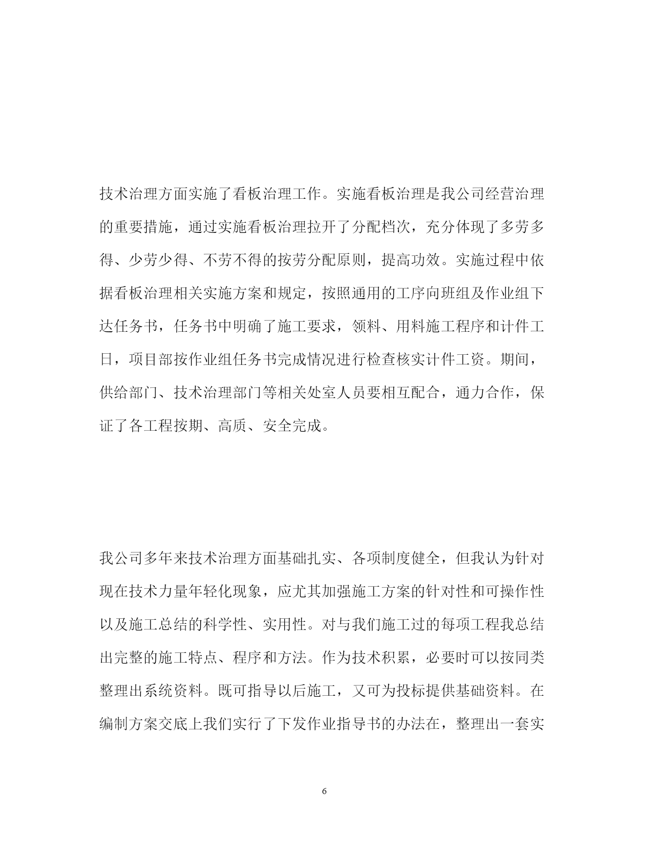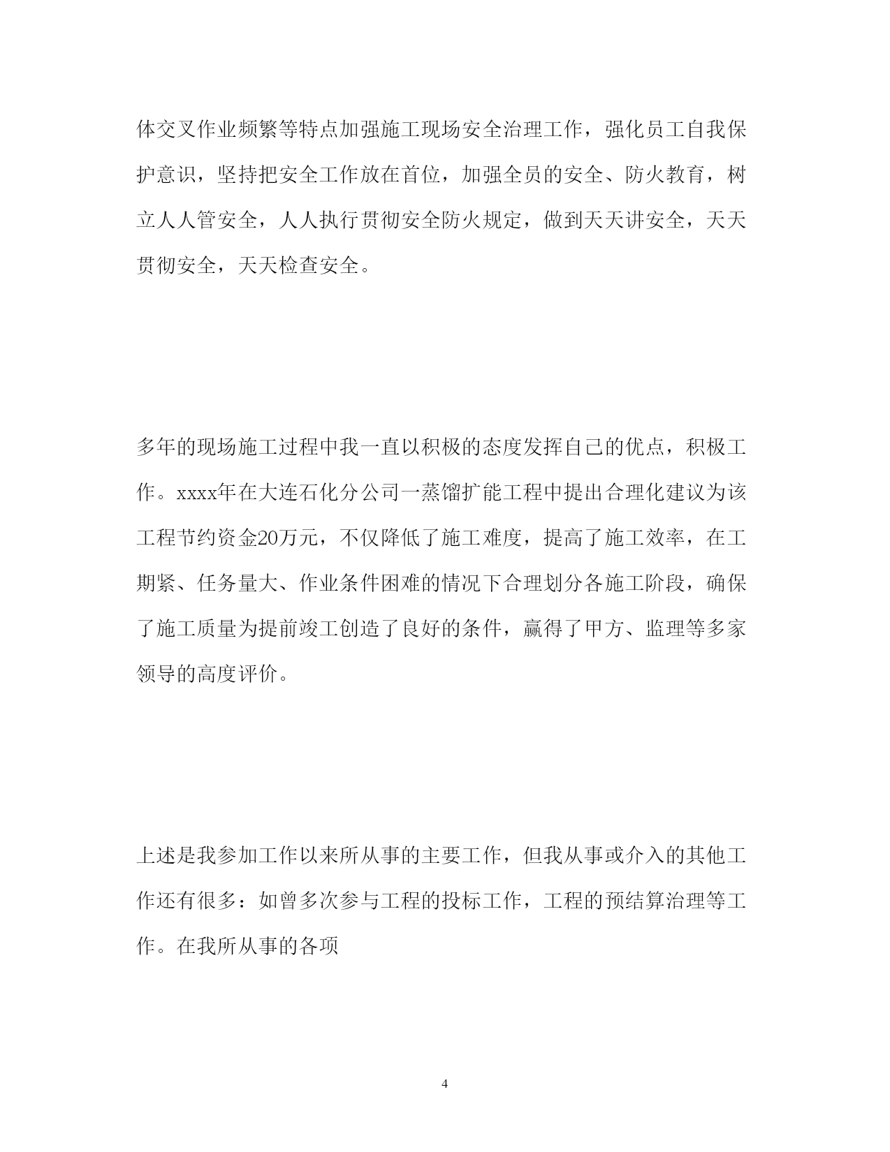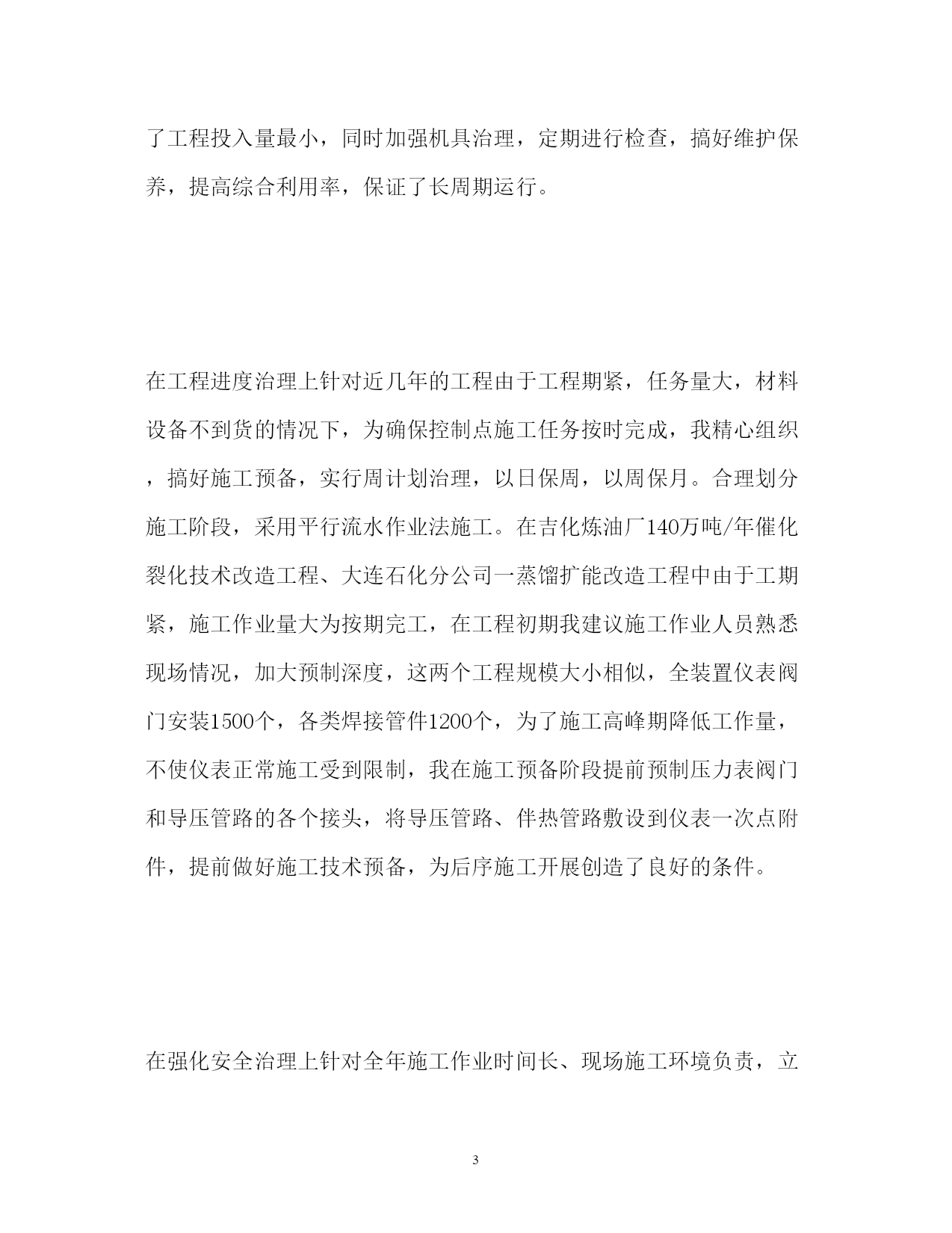 此资料由网络收集而来,如有侵权请告知上传者立即删除。资料共分享,我们负责传递知识。PAGEPAGE7石化公司技术员个人自我总结石化公司技术员个人自我总结参加工作以来,我已从一名幼稚的学生逐步成长为一名合格的技术人员,经过几年的现场实际工作,我已总结出一套适合自己、适合各工程的施工程序。这几年来我先后从事过XX蜡化100万吨/年催化裂化工程、XX电石厂2万吨/年有机硅扩能改造工程、XX化肥厂10万吨/年丁锌醇扩建工程、XX炼油厂三机组移位改造工程、XX石化分公司二蒸馏扩能改造工程,XX乙烯厂10万吨/年乙烯挖潜技术改造项目、XX乙烯厂15万吨/年聚乙烯挖潜技术改造项目、XXX炼油厂140万吨/年催化裂化技术改造工程、XX石化分公司一蒸馏扩能改造工程、XX炼油厂100万吨/年延迟焦化工程等12个工程。在上述工程中我负责技术治理工作,在工作中一直兢兢业业,对待工作一丝不苟,一直奉行科学治理,严格要求施工质量,保证了施工一次校验合格率100,部分工程已获国家优质工程。2001年到2003年先后在XX乙烯厂10万吨/年乙烯挖潜技术改造项目、XX乙烯厂15万吨/年聚乙烯挖潜技术改造项目、XX炼油厂140万吨/年催化裂化技术改造工程、大连石化分公司一蒸馏扩能改造工程中从事施工治理工作,在这些施工中,我强化质量治理、成本治理、进度治理、安全治理。在质量治理上我把加强质量终身责任制的治理,明确责任,强化治理责任卡做为施工过程中的重点,这样保证了施工各道工序质量合格,同时加大对质量的日常治理工作,做到本道工序不合格不得进行下道工序施工,保证每到工序受控。同时加强了施工开工前的技术交底、方案的编制和执行监督工作。施工中严格执行各类标准,加强了过程质量控制,实行质量工资制,优质优价,对创建精品工程起到了推动作用。在成本治理上,在施工前认真做好成本猜测,在施工中对成本治理实施动态监控治理,使工程成本始终在有序可控的治理体系下运行。实际施工中禁止现场出现大面积返工现象,合理用料,利旧利废,做到了工程投入量最小,同时加强机具治理,定期进行检查,搞好维护保养,提高综合利用率,保证了长周期运行。在工程进度治理上针对近几年的工程由于工程期紧,任务量大,材料设备不到货的情况下,为确保控制点施工任务按时完成,我精心组织,搞好施工预备,实行周计划治理,以日保周,以周保月。合理划分施工阶段,采用平行流水作业法施工。在吉化炼油厂140万吨/年催化裂化技术改造工程、大连石化分公司一蒸馏扩能改造工程中由于工期紧,施工作业量大为按期完工,在工程初期我建议施工作业人员熟悉现场情况,加大预制深度,这两个工程规模大小相似,全装置仪表阀门安装1500个,各类焊接管件1200个,为了施工高峰期降低工作量,不使仪表正常施工受到限制,我在施工预备阶段提前预制压力表阀门和导压管路的各个接头,将导压管路、伴热管路敷设到仪表一次点附件,提前做好施工技术预备,为后序施工开展创造了良好的条件。在强化安全治理上针对全年施工作业时间长、现场施工环境负责,立体交叉作业频繁等特点加强施工现场安全治理工作,强化员工自我保护意识,坚持把安全工作放在首位,加强全员的安全、防火教育,树立人人管安全,人人执行贯彻安全防火规定,做到天天讲安全,天天贯彻安全,天天检查安全。多年的现场施工过程中我一直以积极的态度发挥自己的优点,积极工作。xxxx年在大连石化分公司一蒸馏扩能工程中提出合理化建议为该工程节约资金20万元,不仅降低了施工难度,提高了施工效率,在工期紧、任务量大、作业条件困难的情况下合理划分各施工阶段,确保了施工质量为提前竣工创造了良好的条件,赢得了甲方、监理等多家领导的高度评价。上述是我参加工作以来所从事的主要工作,但我从事或介入的其他工作还有很多:如曾多次参与工程的投标工作,工程的预结算治理等工作。在我所从事的各项工作中,都能尽职尽责,积极思考,不断学习新知识,全面、终合的考虑工程施工,圆满的完成了领导所交给的各项任务。多年来我被公司评为十佳青年、优秀员工、撰写的论文、合理化建议、施工技术方案多次被评为优秀作品。2003年我从事了技术质量处的治理工作,这个岗位对我又是一个新的工作起点。技术治理岗位是对各施工项目的全面的.技术质量治理并保证质量体系有效运行。它包括了以下工作内容:组织贯彻执行国家、地区、部门关于技术质量方面的法规、标准、文件;负责工程项目的技术质量治理工作;借鉴同行业先进的施工方法或自创独特的施工方法在本企业中推广实施,不断改进施工方法和提高治理水平;根据企业现状和长远发展规划搞好技术培训工作。因此就此部门的工作,我做了以下工作:技术治理方面实施了看板治理工作。实施看板治理是我公司经营治理的重要措施,通过