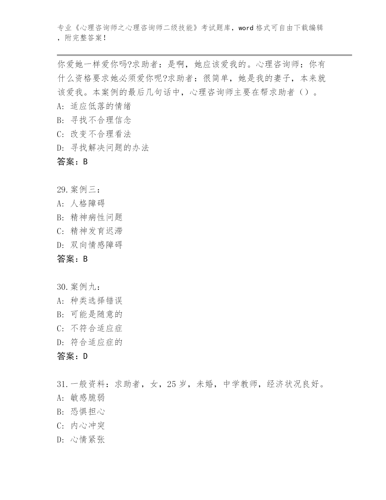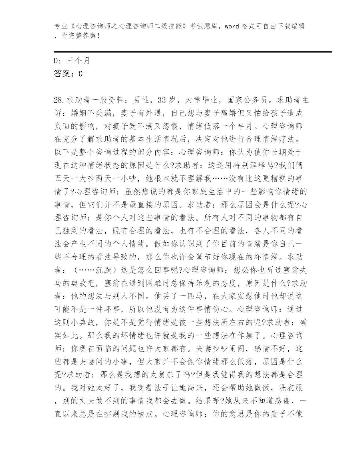 河南省2024年《心理咨询师之心理咨询师二级技能》考试真题题库加下载答案
