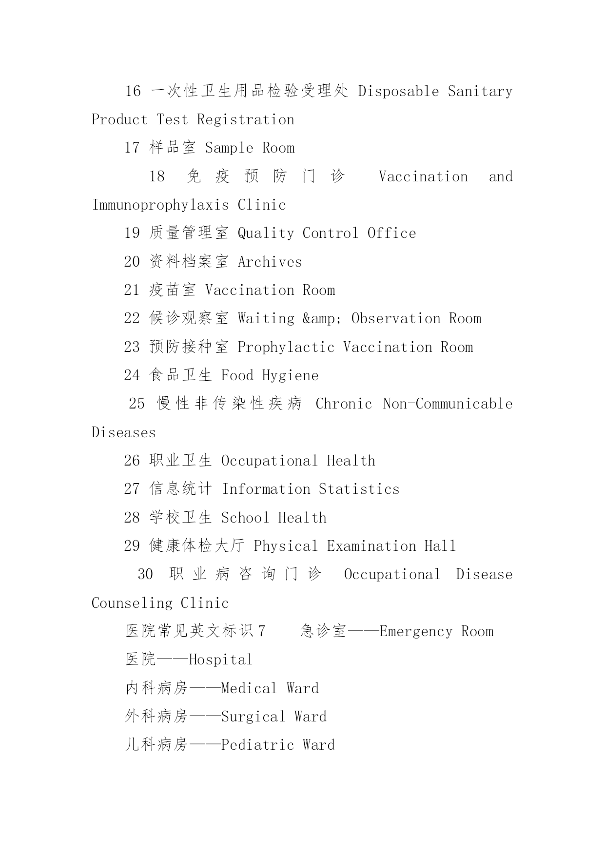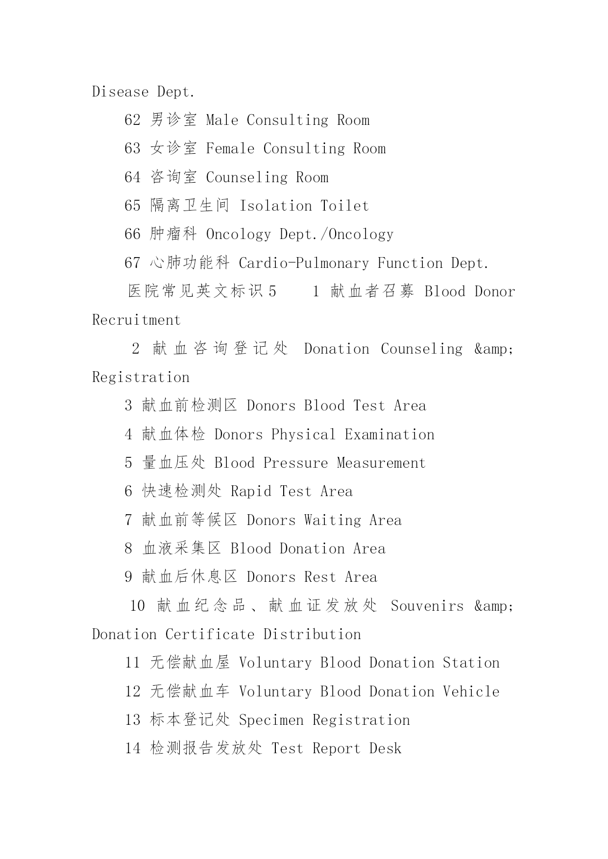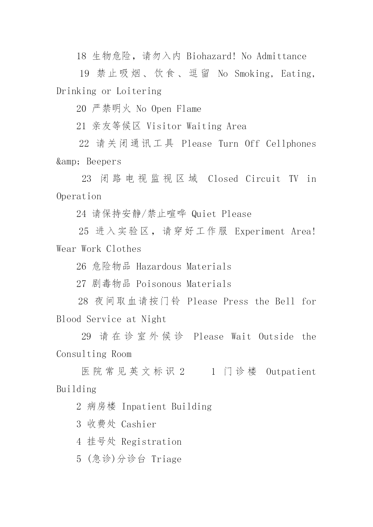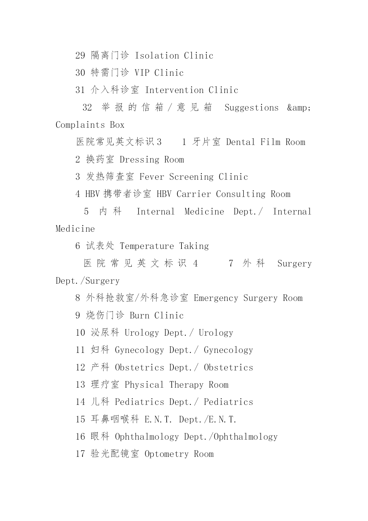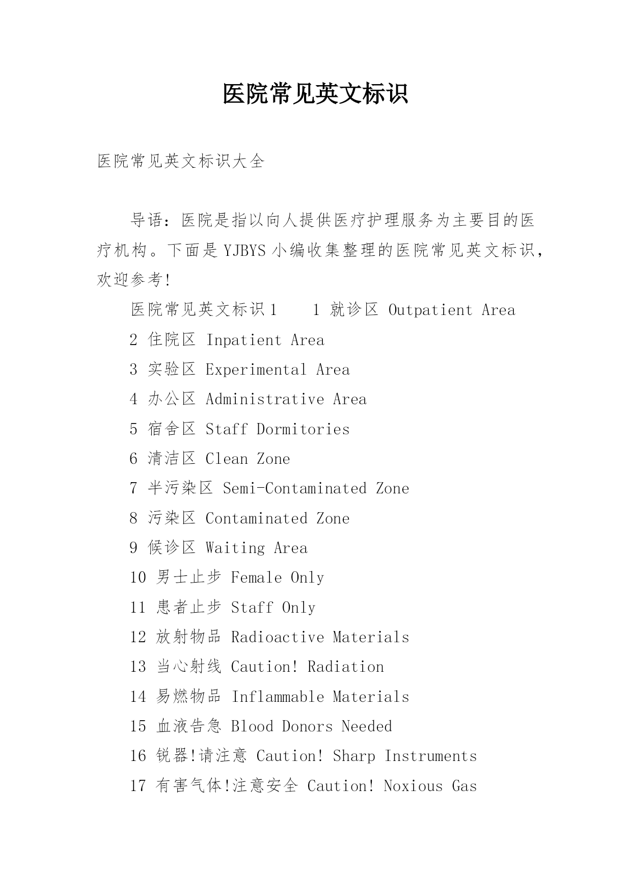 医院常见英文标识医院常见英文标识大全导语:医院是指以向人提供医疗护理服务为主要目的医疗机构。下面是YJBYS小编收集整理的医院常见英文标识,欢迎参考!医院常见英文标识11就诊区OutpatientArea2住院区InpatientArea3实验区ExperimentalArea4办公区AdministrativeArea5宿舍区StaffDormitories6清洁区CleanZone7半污染区Semi-ContaminatedZone8污染区ContaminatedZone9候诊区WaitingArea10男士止步FemaleOnly11患者止步StaffOnly12放射物品RadioactiveMaterials13当心射线Caution!Radiation14易燃物品InflammableMaterials15血液告急BloodDonorsNeeded16锐器!请注意Caution!SharpInstruments17有害气体!注意安全Caution!NoxiousGas18生物危险,请勿入内Biohazard!NoAdmittance19禁止吸烟、饮食、逗留NoSmoking,Eating,DrinkingorLoitering20严禁明火NoOpenFlame21亲友等候区VisitorWaitingArea22请关闭通讯工具PleaseTurnOffCellphones&Beepers23闭路电视监视区域ClosedCircuitTVinOperation24请保持安静/禁止喧哗QuietPlease25进入实验区,请穿好工作服ExperimentArea!WearWorkClothes26危险物品HazardousMaterials27剧毒物品PoisonousMaterials28夜间取血请按门铃PleasePresstheBellforBloodServiceatNight29请在诊室外候诊PleaseWaitOutsidetheConsultingRoom医院常见英文标识21门诊楼OutpatientBuilding2病房楼InpatientBuilding3收费处Cashier4挂号处Registration5(急诊)分诊台Triage6(普通)分诊台/门诊接待室Reception7登记处Registration8划价处PrescriptionPricing9取药处/药房Pharmacy/Dispensary10患者入口PatientEntrance11探视入口VisitorEntrance12消防应急面罩EmergencyFireMasks13就餐卡办理处MealCardService14生活垃圾暂存处Non-BiohazardWaste15医用废弃物BiohazardWaste16医用电梯MedicalServiceElevator17放标本处Specimen18取检查、检验结果处TestReports19投诉电话ComplaintsHotline20医疗急救电话120FirstAidCall12021医疗急救通道EmergencyAccess22门诊化验室Laboratory/Lab23门诊收费处Cashier24门诊手术室OutpatientOperatingRoom25门诊注射输液室Injection&TransfusionRoom26门诊治疗室OutpatientTreatmentRoom27普通取血室RoutineBloodDrawingRoom28隔离取血室IsolatedBloodDrawingRoom29隔离门诊IsolationClinic30特需门诊VIPClinic31介入科诊室InterventionClinic32举报的信箱/意见箱Suggestions&ComplaintsBox医院常见英文标识31牙片室DentalFilmRoom2换药室DressingRoom3发热筛查室FeverScreeningClinic4HBV携带者诊室HBVCarrierConsultingRoom5内科InternalMedicineDept./InternalMedicine6试表处TemperatureTaking医院常见英文标识47外科SurgeryDept./Surgery8外科抢救室/外科急诊室EmergencySurgeryRoom9烧伤门诊BurnClinic10泌尿科UrologyDept./Urology11妇科GynecologyDept./Gynecology12产科ObstetricsDept./Obstetrics13理疗室PhysicalTherapyRoom14儿科PediatricsDept./Pediatrics15耳鼻咽喉科E.