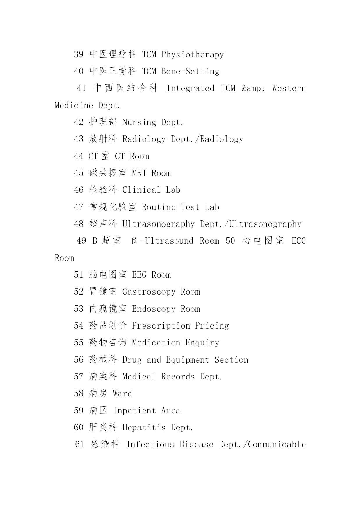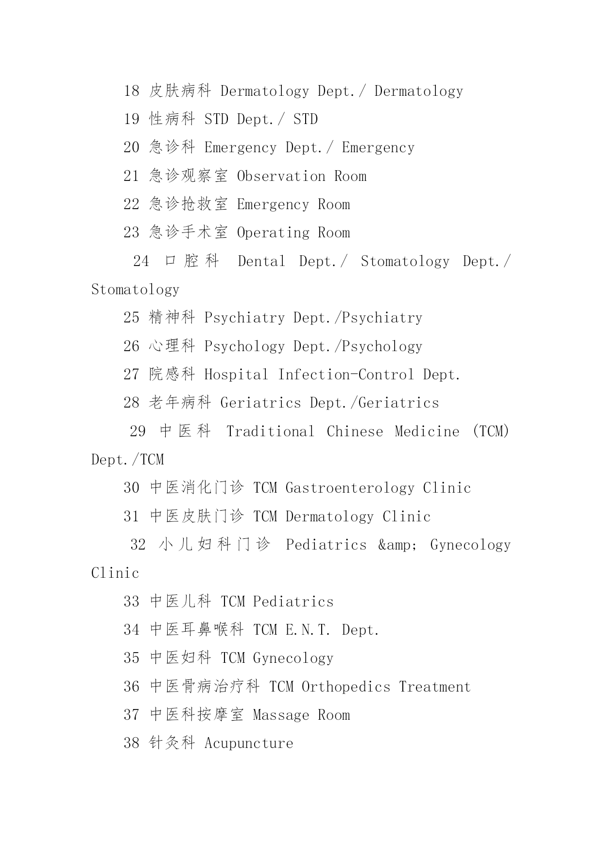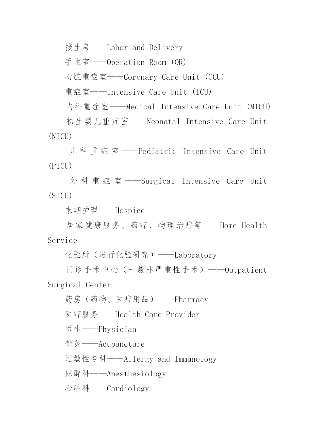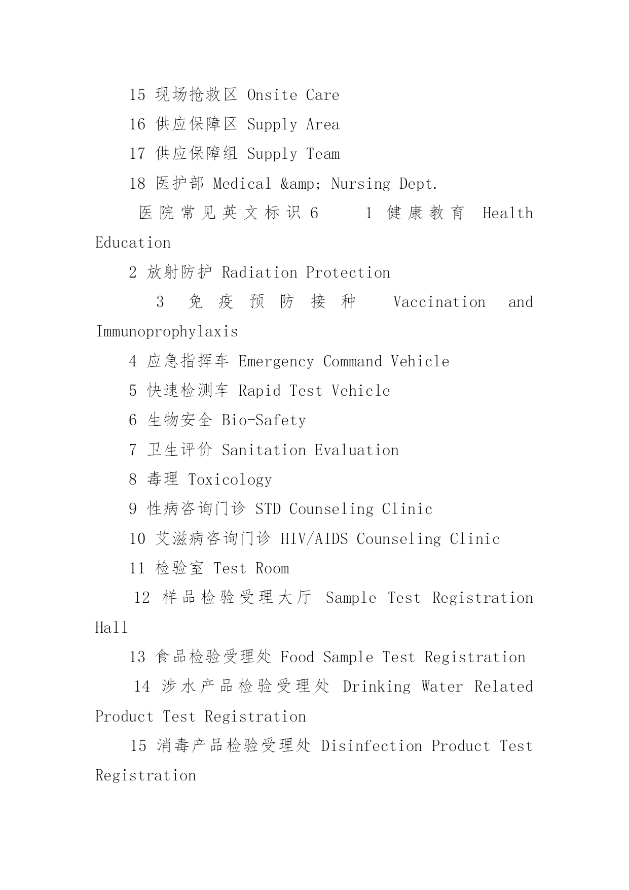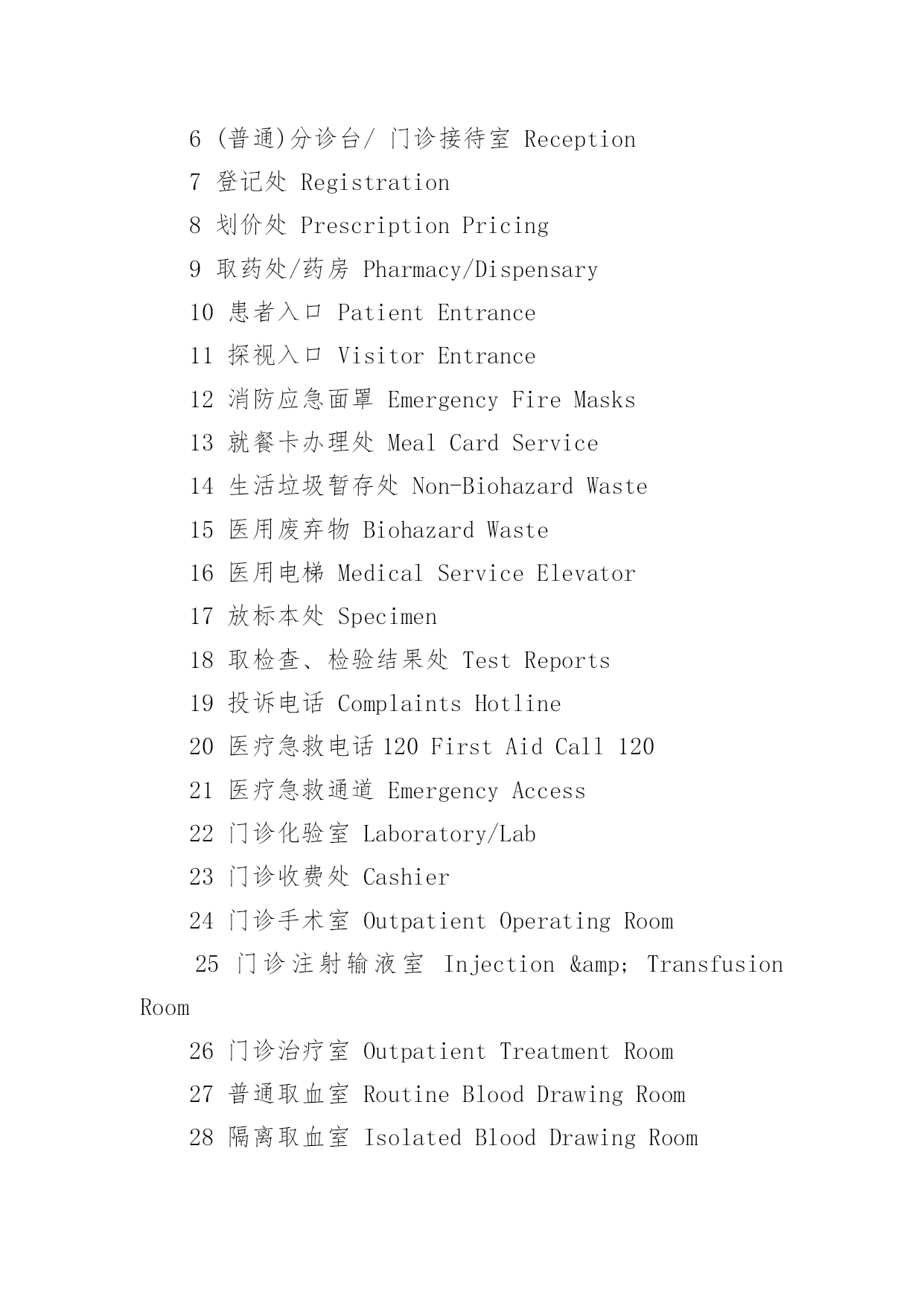 医院常见英文标识医院常见英文标识大全导语:医院是指以向人提供医疗护理服务为主要目的医疗机构。下面是YJBYS小编收集整理的医院常见英文标识,欢迎参考!医院常见英文标识11就诊区OutpatientArea2住院区InpatientArea3实验区ExperimentalArea4办公区AdministrativeArea5宿舍区StaffDormitories6清洁区CleanZone7半污染区Semi-ContaminatedZone8污染区ContaminatedZone9候诊区WaitingArea10男士止步FemaleOnly11患者止步StaffOnly12放射物品RadioactiveMaterials13当心射线Caution!Radiation14易燃物品InflammableMaterials15血液告急BloodDonorsNeeded16锐器!请注意Caution!SharpInstruments17有害气体!注意安全Caution!NoxiousGas18生物危险,请勿入内Biohazard!NoAdmittance19禁止吸烟、饮食、逗留NoSmoking,Eating,DrinkingorLoitering20严禁明火NoOpenFlame21亲友等候区VisitorWaitingArea22请关闭通讯工具PleaseTurnOffCellphones&Beepers23闭路电视监视区域ClosedCircuitTVinOperation24请保持安静/禁止喧哗QuietPlease25进入实验区,请穿好工作服ExperimentArea!WearWorkClothes26危险物品HazardousMaterials27剧毒物品PoisonousMaterials28夜间取血请按门铃PleasePresstheBellforBloodServiceatNight29请在诊室外候诊PleaseWaitOutsidetheConsultingRoom医院常见英文标识21门诊楼OutpatientBuilding2病房楼InpatientBuilding3收费处Cashier4挂号处Registration5(急诊)分诊台Triage6(普通)分诊台/门诊接待室Reception7登记处Registration8划价处PrescriptionPricing9取药处/药房Pharmacy/Dispensary10患者入口PatientEntrance11探视入口VisitorEntrance12消防应急面罩EmergencyFireMasks13就餐卡办理处MealCardService14生活垃圾暂存处Non-BiohazardWaste15医用废弃物BiohazardWaste16医用电梯MedicalServiceElevator17放标本处Specimen18取检查、检验结果处TestReports19投诉电话ComplaintsHotline20医疗急救电话120FirstAidCall12021医疗急救通道EmergencyAccess22门诊化验室Laboratory/Lab23门诊收费处Cashier24门诊手术室OutpatientOperatingRoom25门诊注射输液室Injection&TransfusionRoom26门诊治疗室OutpatientTreatmentRoom27普通取血室RoutineBloodDrawingRoom28隔离取血室IsolatedBloodDrawingRoom29隔离门诊IsolationClinic30特需门诊VIPClinic31介入科诊室InterventionClinic32举报的信箱/意见箱Suggestions&ComplaintsBox医院常见英文标识31牙片室DentalFilmRoom2换药室DressingRoom3发热筛查室FeverScreeningClinic4HBV携带者诊室HBVCarrierConsultingRoom5内科InternalMedicineDept./InternalMedicine6试表处TemperatureTaking医院常见英文标识47外科SurgeryDept./Surgery8外科抢救室/外科急诊室EmergencySurgeryRoom9烧伤门诊BurnClinic10泌尿科UrologyDept./Urology11妇科GynecologyDept./Gynecology12产科ObstetricsDept./Obstetrics13理疗室PhysicalTherapyRoom14儿科PediatricsDept./Pediatrics15耳鼻咽喉科E.