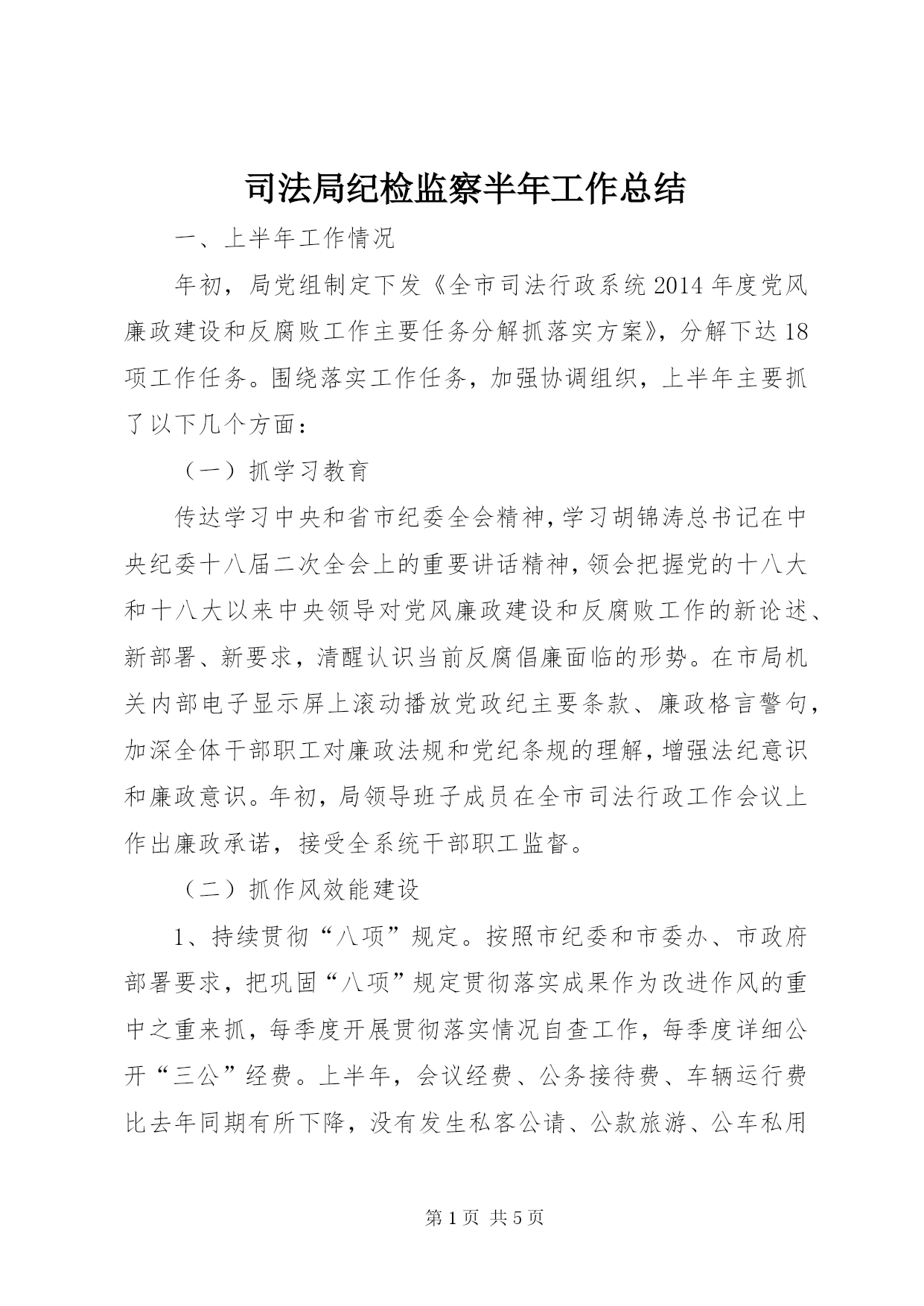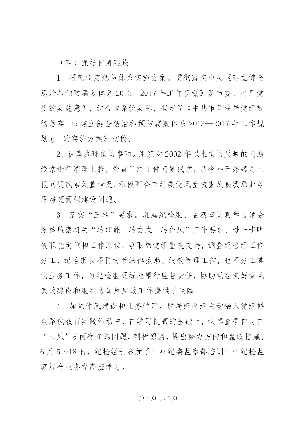 第PAGE\*Arabic\*MERGEFORMAT5页共NUMPAGES\*MERGEFORMAT5页司法局纪检监察半年工作总结一、上半年工作情况年初,局党组制定下发《全市司法行政系统2014年度党风廉政建设和反腐败工作主要任务分解抓落实方案》,分解下达18项工作任务。围绕落实工作任务,加强协调组织,上半年主要抓了以下几个方面:(一)抓学习教育传达学习中央和省市纪委全会精神,学习胡锦涛总书记在中央纪委十八届二次全会上的重要讲话精神,领会把握党的十八大和十八大以来中央领导对党风廉政建设和反腐败工作的新论述、新部署、新要求,清醒认识当前反腐倡廉面临的形势。在市局机关内部电子显示屏上滚动播放党政纪主要条款、廉政格言警句,加深全体干部职工对廉政法规和党纪条规的理解,增强法纪意识和廉政意识。年初,局领导班子成员在全市司法行政工作会议上作出廉政承诺,接受全系统干部职工监督。(二)抓作风效能建设1、持续贯彻“八项”规定。按照市纪委和市委办、市政府部署要求,把巩固“八项”规定贯彻落实成果作为改进作风的重中之重来抓,每季度开展贯彻落实情况自查工作,每季度详细公开“三公”经费。上半年,会议经费、公务接待费、车辆运行费比去年同期有所下降,没有发生私客公请、公款旅游、公车私用等违规行为。2、学习贯彻效能《条例》。以省人大颁布实施《省机关效能建设工作条例》为契机,采取在局机关电子显示屏滚动播放条例相关条款、发放《条例》及《效能建设制度解释》等学习资料、以科室为单位开展讨论、组织知识测试等多种方式,在全局上下营造学习氛围,增进干部职工对《条例》内容与规定的了解把握,增强贯彻执行《条例》、遵守效能规定的自觉性。组织各业务科室和直属单位,对照《条例》要求,对有关效能建设和工作制度进行梳理,局机关新修订了《发文管理实施办法》和《印章管理使用制度》2项制度。三都澳公证处启动上下班指纹签到签退制度,进一步规范考勤管理,继续实行办证绩效计分考核办法,奖优罚劣、奖勤罚懒,调动工作人员积极性、主动性和创造性。3、推行“马上就办”。结合司法行政职能职责,以法律服务行政许可审查为重点,全面梳理“马上就办”事项,梳理律师、司法鉴定执业申请审核、法律援助申请等12项“马上就办”事项,对外公开“马上就办”事项一览表,明确承办科室、承办人,公布联系电话。各承办科室按照办理时限要求,认真办理公开事项,没有发生拖延办理、被投诉的情况。同时,公证、法律援助窗口单位积极推行“上门服务”、“预约服务”、“绿色通道”等便民利民措施,履行办结时限承诺,为群众提供优质高效服务。及时做好司法行政系统投诉处理工作,第一时间反应,第一时间组织调查,做到有询必答、有诉必理、有查必果、有果必复。4、加强效能督检和绩效管理整改。组织力量定期不定期开展效能督查,适时提醒、督促干部职工遵守机关考勤制度和效能规定,克服纠正纪律松懈现象。针对2013年度绩效管理工作考评反馈的问题,认真分析整改,注重科学合理设置考核指标体系,注重落实科室工作责任,注重绩效过程管理和自评自查工作,努力发挥绩效管理推进司法行政事业发展的导向作用。(三)部署开展民主评议政风行风工作今年我局继续列入民主评议政风行风重点单位,根据市纠风办和省厅部署要求,研究确定以“推进社区矫正工作规范化”和“扩大法律援助覆盖面”为选题评议内容,制定下发了评议工作实施方案和选题评议方案。5月29日,召开全市司法行政系统民主评议政风行风工作视频会议,对评议工作进行深入动员,部署了各阶段各环节工作,提出明确要求,市、县两级司法机关及直属单位、乡镇(街道)司法所共400多人参加。目前,评议工作处于调查评议阶段,局机关和法律服务行业各单位正在开展自查自纠工作,采取问卷调查等多种方式,广泛征求意见和建议,查找政风行风方面存在问题与不足,为下一阶段整改落实提供依据。同时,我局是今年政风行风热线节目上线单位,制定了《市司法局2014年“政风行风热线”上线工作实施方案》,正在筹备做好上线工作。(四)抓好自身建设1、研究制定惩防体系实施方案。贯彻落实中央《建立健全惩治与预防腐败体系2013—2017年工作规划》及市委、省厅党委的实施意见,结合本系统实际,拟定了《中共市司法局党组贯彻落实lt;建立健全惩治和预防腐败体系2013—2017年工作规划gt;的实施方案》初稿。2、认真办理信访事项。组织对2002年以来信访反映的问题线索进行清理上报,处置了结1件问题线索,从今年开始每月上报问题线索处置情况。积极配合市纪委党风室核查反映我局业务用房超面积建设问题。3、落实“三转”要求。驻局纪检组、监察室认真学习领会纪检监察机关“转职能、转方式、转作风”工作要求,进一步明确职能定位和工作站位。争取局党组重视支持,调整纪检组工作分工,纪检组长不再协管法律援助、绩效管理
