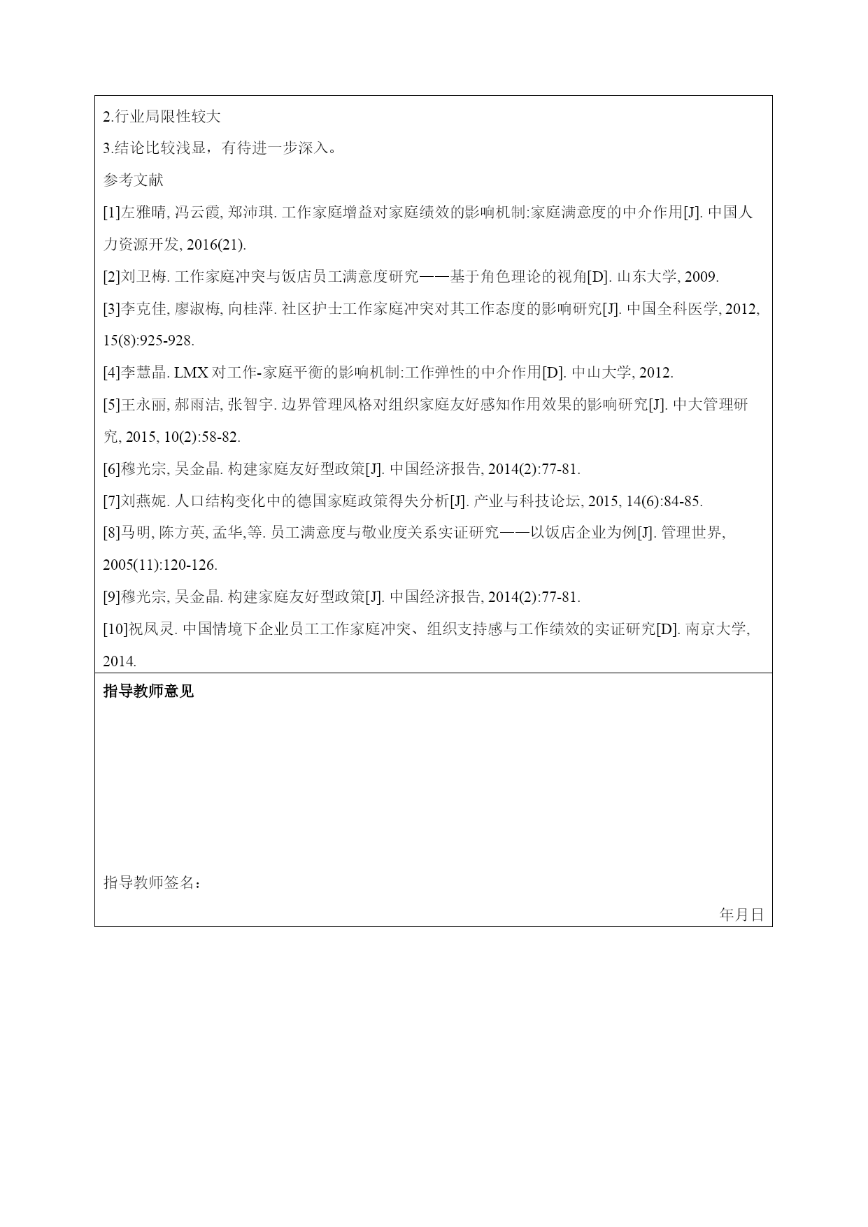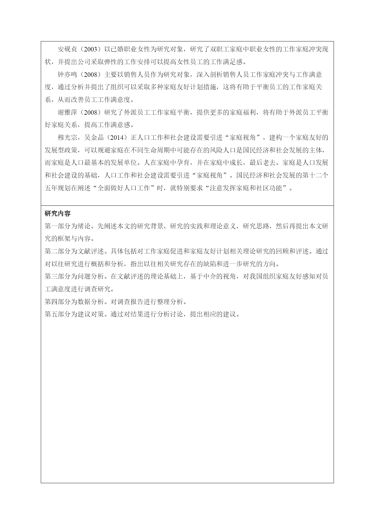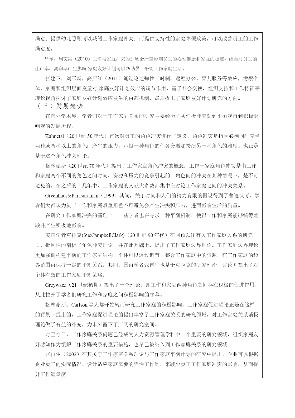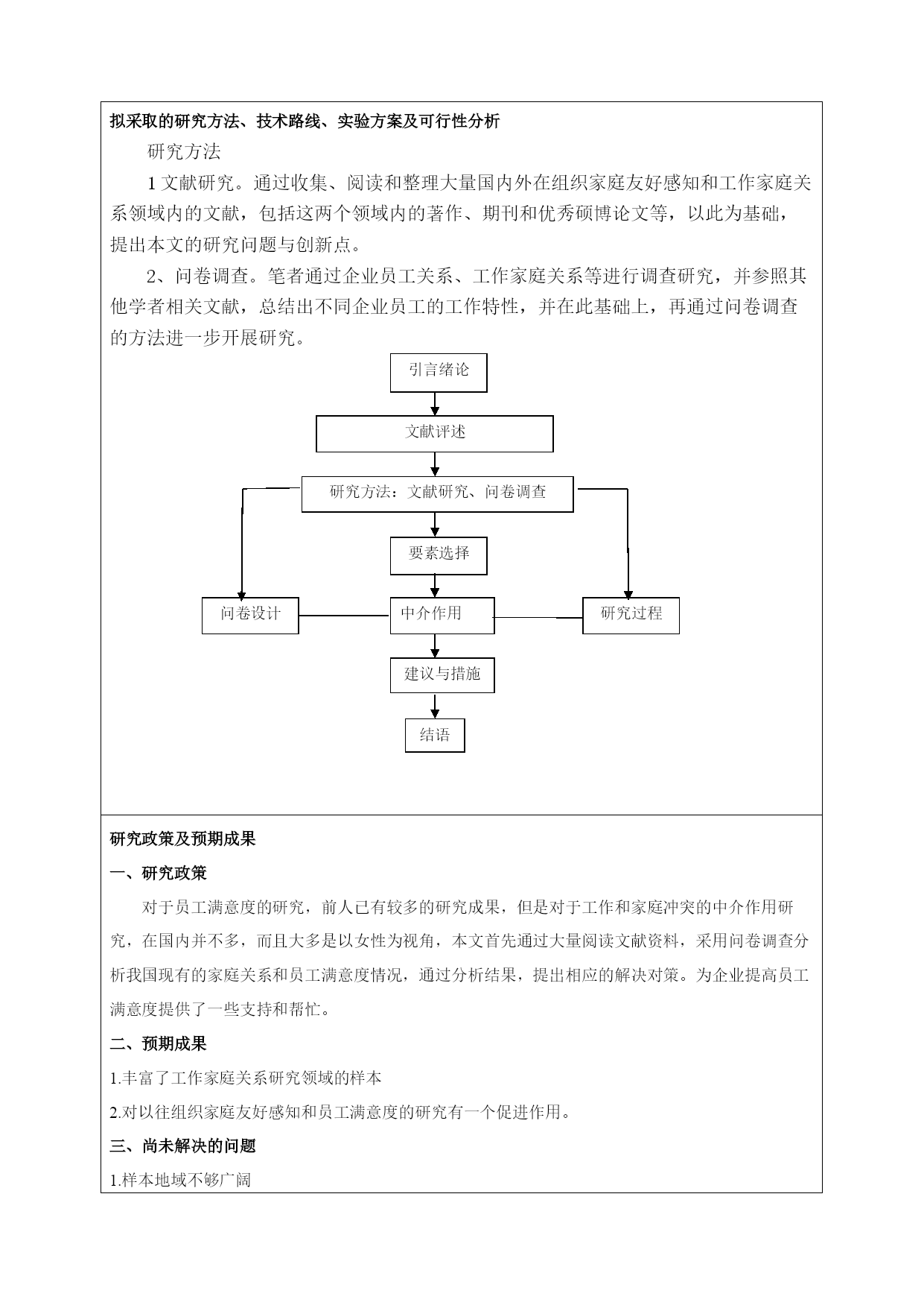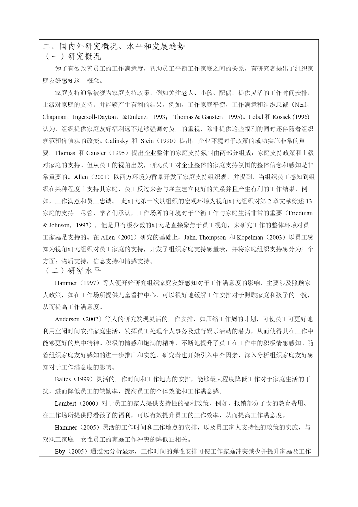 本科毕业论文(设计)开题报告书题目组织家庭友好感知对工作满意度的影响——工作家庭冲突的中介作用姓名学号专业指导教师职称学位课题来源科学依据(包括课题的科学意义;国内外研究概况、水平和发展趋势;应用前景等)一、课题的科学意义(理论、实践意义)工作和家庭是生活中的两个重要方面。传统上,男性与女性的分工很明确,男性承担主要的工作任务,而女性则承担主要的家庭职责。但是,随着社会经济的不断发展,越来越多的女性走上了工作岗位,双职工家庭已经逐渐成为社会主流,家庭的结构、家庭中夫妻双方所承担的任务以及家庭价值观都逐渐地发生了较大的变化。为了应对激烈的市场竞争,企业对员工的要求日益提高,员工为了在激烈的竞争中脱颖而出并保持竞争优势,则必须要花更多的时间和精力在工作上。工作时间的延长、工作压力的增加,不可避免的增加了双职工承担家庭任务的艰巨性,这也使得其工作与家庭之间的矛盾不断激化,工作满意度亦随之降低。为了有效缓解员工工作家庭之间的冲突及其影响,改善员工工作满意度,学者们对于上述问题进行了系统研究,指出组织家庭友好感知将有助工作满意度的改善,并通过系列的理论及实证研究来探寻组织家庭友好感知对于工作满意度的影响路径。理论意义:本研究丰富了组织家庭友好感知影响工作满意度的研究领域。本研究通过工作家庭冲突的中介的作用,系统的研究了组织家庭友好感知对于工作满意度的影响过程关于组织家庭友好感知对工作满意度的影响研究,目前国外的学者关注和研究的比较多,其成果是基于国外发展环境而得出的,而国内对于该领域的研究尚处于起步阶段。在国内,探讨组织家庭友好感知对于工作满意度的影响,将进一步丰富该领域的研究,由于中国不同的文化背景和社会体制,男性女性在工作和家庭中的不同分工和价值观念,都会充实该领域的研究,具有一定的理论意义。实践意义:关注员工工作家庭关系,制定恰当的组织家庭友好感知本研究更加细致的分析和探寻了组织家庭友好感知对于工作满意度的影响路径,通过分析工作家庭冲突的中介的作用,意在帮助企业在实施组织家庭友好感知时,充分把握并发挥中介因素的作用,促进企业加强沟通、增进宣传,并根据员工工作家庭关系的实际情况制定出更为恰当的福利政策,以最终提升组织家庭友好感知的实际效果,创新企业组织家庭友好感知的制度和实践,提升员工工作满意度与积极性,提高员工稳定性。二、国内外研究概况、水平和发展趋势(一)研究概况为了有效改善员工的工作满意度,帮助员工平衡工作家庭之间的关系,有研究者提出了组织家庭友好感知这一概念。家庭支持通常被视为家庭支持政策,例如关注老人、小孩、配偶,提供灵活的工作时间安排,上级对家庭的支持,并能够产生有利的结果,例如,工作家庭平衡,工作满意和组织忠诚(Neal,Chapman,Ingersoll-Dayton,&Emlenz,1993;Thomas&Ganster,1995)。Lobel和Kossek(1996)认为,组织提供家庭友好福利远不足够强调对员工的重视,除非提供这些福利的同时还伴随着组织规范和价值观的改变。Galinsky和Stein(1990)提出,企业环境对于政策的成功实施非常的重要。Thomas和Ganster(1995)提出企业整体的家庭支持氛围由两部分组成:家庭支持政策和上级对家庭的支持。但从员工的视角出发,研究员工对企业整体的家庭支持氛围的整体信念和感知是非常重要的。Allen(2001)以西方环境为背景开发了家庭支持组织观,并提到,当组织员工感知到组织在某种程度上支持其家庭,员工反过来会与雇主建立良好的关系并且产生有利的工作结果,例如,工作满意和员工忠诚。此研究第一次以组织的宏观环境为视角研究组织对第2章文献综述13家庭的支持。尽管,学者们承认,工作场所的环境对于平衡工作与家庭生活非常的重要(Friedman&Johnson,1997),但是只有极少数的研究是直接聚焦于员工视角,来研究工作的整体环境对员工家庭是支持的。在Allen(2001)研究的基础上,Jahn,Thompson和Kopelman(2003)以员工感知为视角研究组织对员工家庭的支持,开发了组织家庭支持感量表,并将家庭组织支持感分为三个方面:物质支持,信息支持和情感支持。(二)研究水平Hammer(1997)等人便开始研究组织家庭友好感知对于工作满意度的影响,主要涉及照顾家人政策,如在工作场所提供儿童看护中心,可以很好地缓解工作安排对于照顾家庭和孩子的干扰,从而提高工作满意度。Anderson(2002)等人的研究发现灵活的工作安排,如压缩工作周的计划,可使员工可更好地利用空闲时间安排家庭生活,发挥员工处理个人事务及进行娱乐活动的潜力,从而使得其在工作中能够更好的集中精神。积极的情感和饱满的精神,不断地提升了员工在工作中的积极情感感知。随