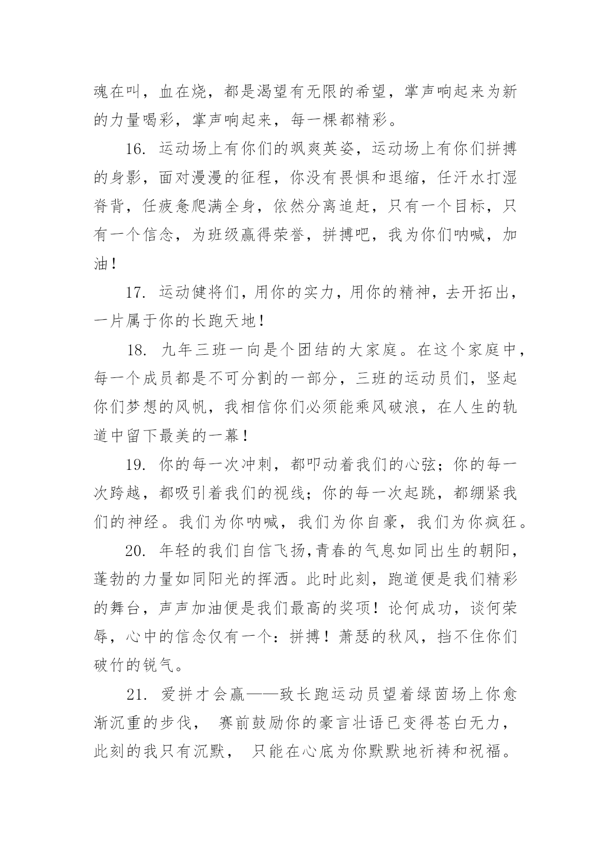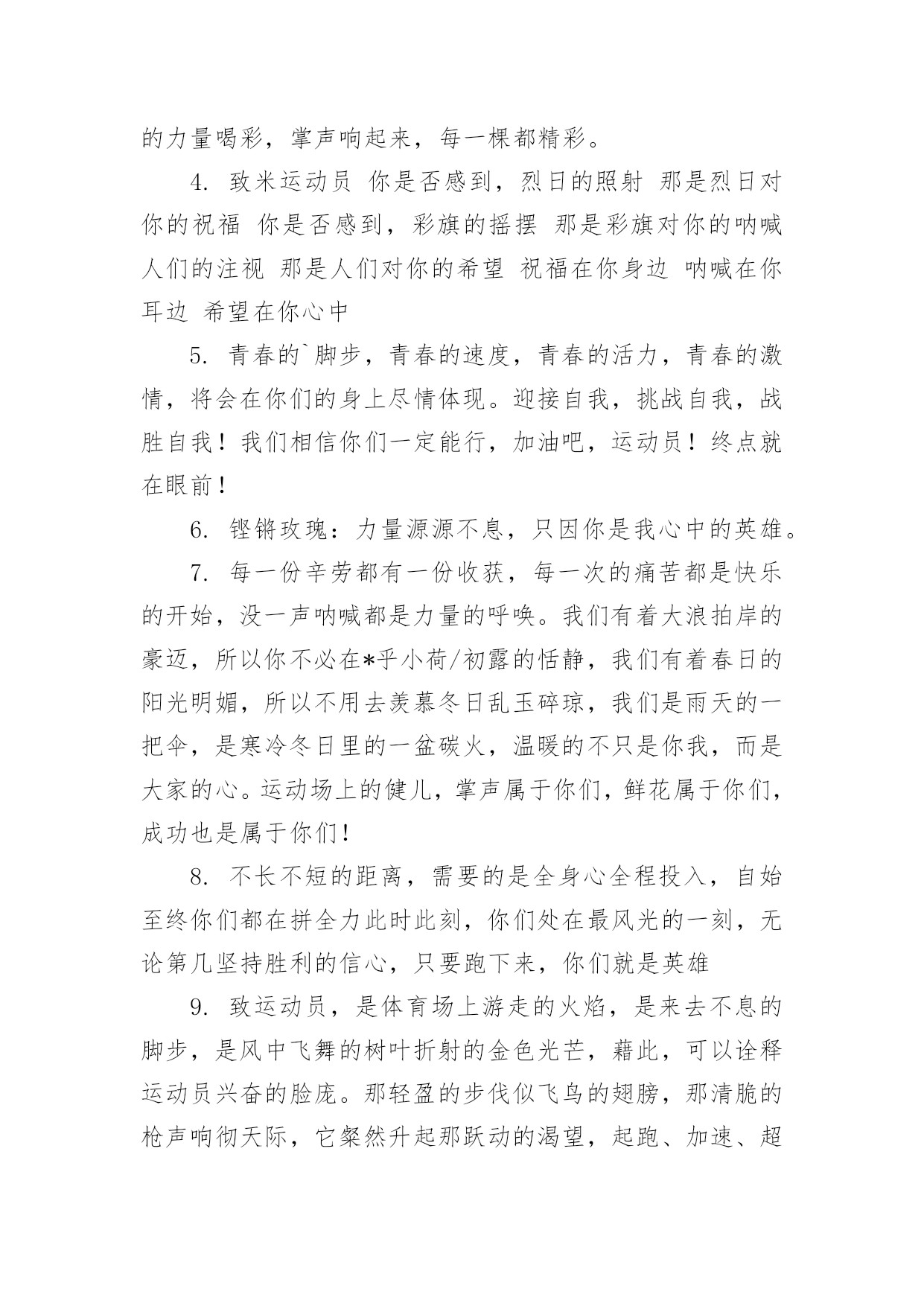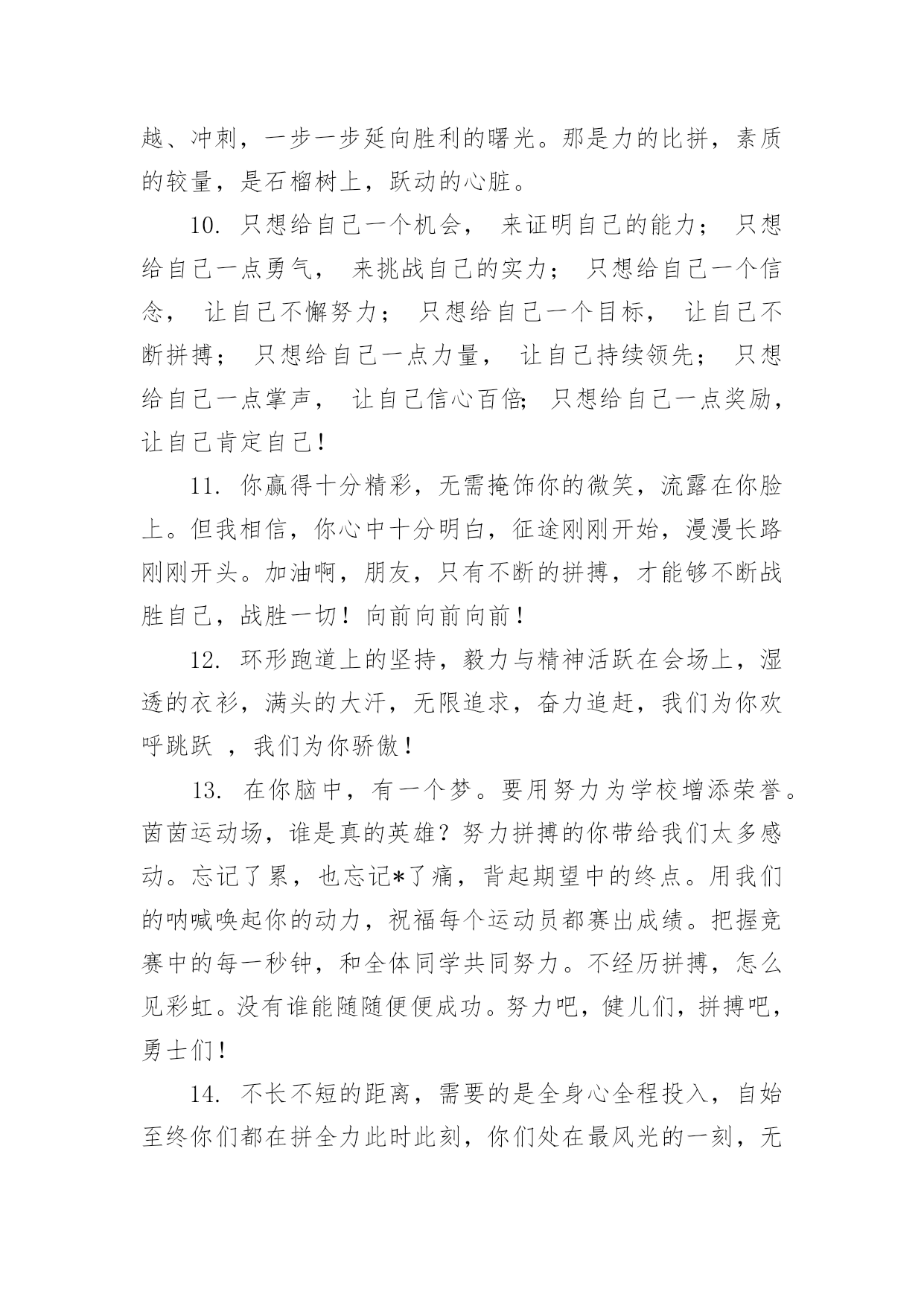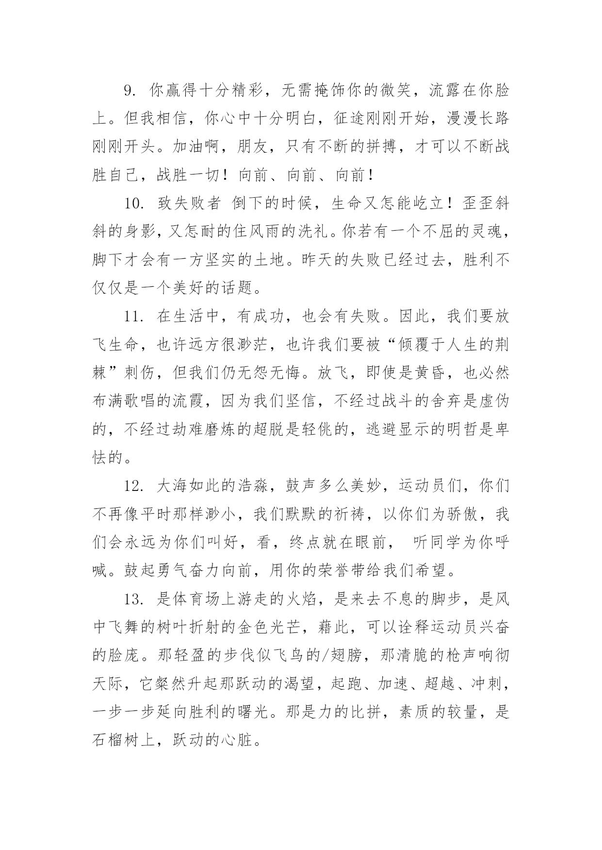 校园春季运动会加油稿在社会一步步向前发展的今天,能够利用到加油稿的场合越来越多,借助加油稿可以表达对对方的鼓励和支持。你写加油稿时总是无从下笔?以下是小编收集整理的校园春季运动会加油稿,仅供参考,希望能够帮助到大家。校园春季运动会加油稿11.你是体育宝座上的一颗灿烂夺目的珍珠,你是在蓝天中展翅飞翔的雏鹰。不要怕失败,不要怕冷落,无论何时,我们以你为荣。2.好情绪会让枯萎的花朵绽放,好情绪会让没有期望踏出一条新路来,好情绪会让你骤然绽放一种新面容,别不相信好情绪有时会创造奇迹,鼓起勇气树立信心放平心态,去努力找出,命中注定的本来就该属于你的那一份果实,让好情绪陪伴我们一生。3.亲爱的健儿们,你们要充满自信。比赛中没有挡风的墙,没有遮风的伞,也没有撑船的帆,更没有拉船的纤。事在人为,人定胜天。原你们养精蓄锐,对充满爱意的世界说“我自信,我拼搏,我会赢。4.在今天的赛场上,我只是个场边的看客。我用眼睛见证了赛场上的是非成败,用心灵感受了运动员的喜怒哀乐。他坚持跑完全程,我学到了坚持的可贵,他摔倒了再站起来,我学会了不怕失败的勇气。场上每一个点滴,都如此的震撼我的心灵。在今天的赛场上,我只是个场边的看客,但我学到了很多5.也许流星并不少见,但它燃烧的刹那,留给人间最美丽的回忆!也许笑脸并不少见,但胜利的喜悦,总会留给世界精彩的一瞬!是的,那些曾经美妙的东西只有短短的一瞬间,但那却把最辉煌的一刻留给了人间。胜利,是每个人所追求的,胜利的喜悦,是胜利与重新开始的转折,胜利是新的开始!6.可以出现在比赛场上,在我认为是一件极为了不起的事,身边是一个个强大的竞争对手,谁不会恐惧?但我仍会默默对自己说“我能行!”微笑喝彩,我都不会废弃,为实现那生命中不可缺少的目的.!了不起啊,了不起。7.是体育场上游走的火焰,是来去不息的脚步,是风中飞舞的树叶折射的金色光芒,藉此,可以诠释运动员兴奋的脸庞。那轻盈的步伐似飞鸟的翅膀,那清脆的枪声响彻天际,它粲然升起那跃动的渴望,起跑、加速、超越、冲刺,一步一步延向胜利的曙光。那是力的比拼,素质的较量,是石榴树上,跃动的心脏。8.在你脑中,有一个梦。要用努力为学院增添荣誉。茵茵运动场,谁是真的英雄努力拼搏的你带给我们太多感动。忘记了累,也忘记了痛,背起期望中的终点。用我们的呐喊唤起你的动力,祝福每个运动员都赛出成绩。把握竞赛中的每一秒钟,和全体同学共同努力。不经历拼搏,怎样见彩虹。没有谁能随随便便成功。努力吧,健儿们,拼搏吧,勇士们!9.你赢得十分精彩,无需掩饰你的微笑,流露在你脸上。但我相信,你心中十分明白,征途刚刚开始,漫漫长路刚刚开头。加油啊,朋友,只有不断的拼搏,才可以不断战胜自己,战胜一切!向前、向前、向前!10.致失败者倒下的时候,生命又怎能屹立!歪歪斜斜的身影,又怎耐的住风雨的洗礼。你若有一个不屈的灵魂,脚下才会有一方坚实的土地。昨天的失败已经过去,胜利不仅仅是一个美好的话题。11.在生活中,有成功,也会有失败。因此,我们要放飞生命,也许远方很渺茫,也许我们要被“倾覆于人生的荆棘”刺伤,但我们仍无怨无悔。放飞,即使是黄昏,也必然布满歌唱的流霞,因为我们坚信,不经过战斗的舍弃是虚伪的,不经过劫难磨炼的超脱是轻佻的,逃避显示的明哲是卑怯的。12.大海如此的浩淼,鼓声多么美妙,运动员们,你们不再像平时那样渺小,我们默默的祈祷,以你们为骄傲,我们会永远为你们叫好,看,终点就在眼前,听同学为你呼喊。鼓起勇气奋力向前,用你的荣誉带给我们希望。13.是体育场上游走的火焰,是来去不息的脚步,是风中飞舞的树叶折射的金色光芒,藉此,可以诠释运动员兴奋的脸庞。那轻盈的步伐似飞鸟的/翅膀,那清脆的枪声响彻天际,它粲然升起那跃动的渴望,起跑、加速、超越、冲刺,一步一步延向胜利的曙光。那是力的比拼,素质的较量,是石榴树上,跃动的心脏。14.这是速度与毅力的接力,这是期望与祈盼的接力,时间在这里凝固,几分几秒也变得如此漫长。千百双眼睛注视着你那矫健的身影,近了,近了,你可曾听到那山呼海啸般的加油声?近了,近了,前方就是终点,加油啊,运动员,成功和失败就在转瞬之间。15.你是运动场的心脏,跳动梦想;你是漫长路的精神,Ji励辉煌;你们是将上下求索的人!风为你加油,云为你助兴,坚定,执着,耐力与希望,在延伸的白色跑道中点点凝聚!力量,信念,拼搏与奋斗,在遥远的终点线上渐渐明亮!时代的强音正在你的脚下踏响。校园春季运动会加油稿21.深深的呼吸,等待你的是艰难的1500米。相信胜利会属于你们。但在这征途上,需要你勇敢的心去面对。我们在为你加油,你是否听到了*我们发自/心中的呐喊?困难和胜利都在向你招手,去呀,快去呀,不要犹豫。快去击败困难、快去夺取胜利!相信你会送给我们一个汗水浸湿的微笑!2.青春的脚步,青春的速度,青春的活力,青春的