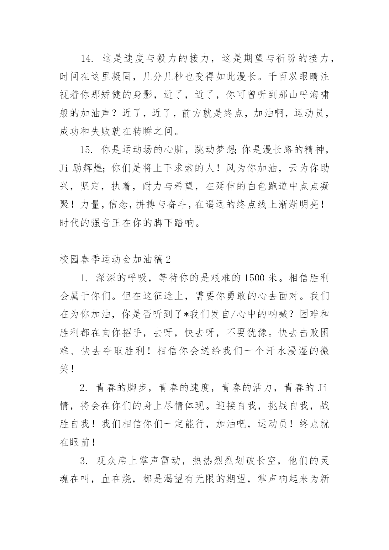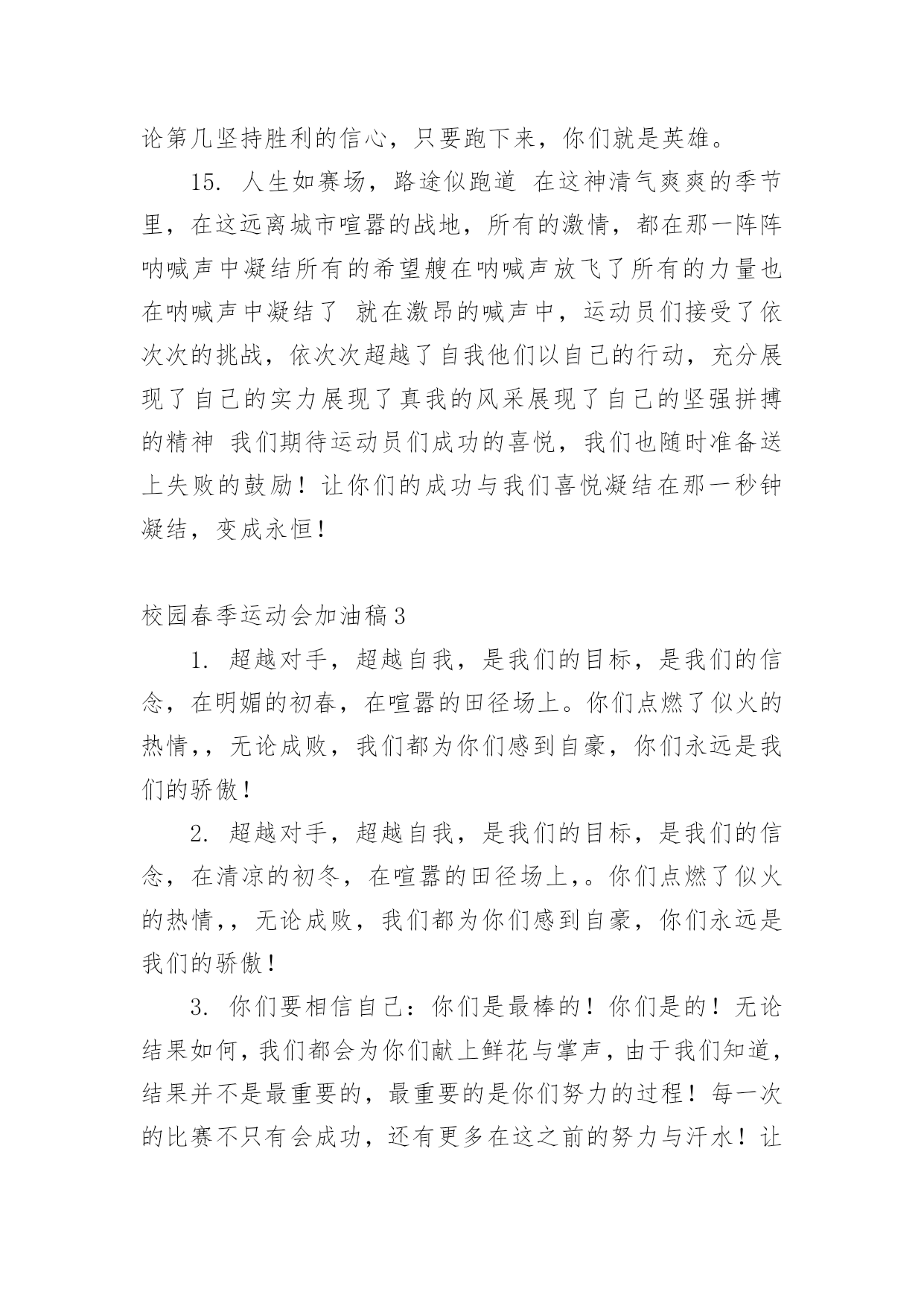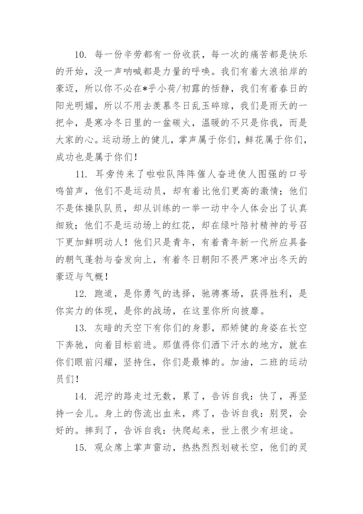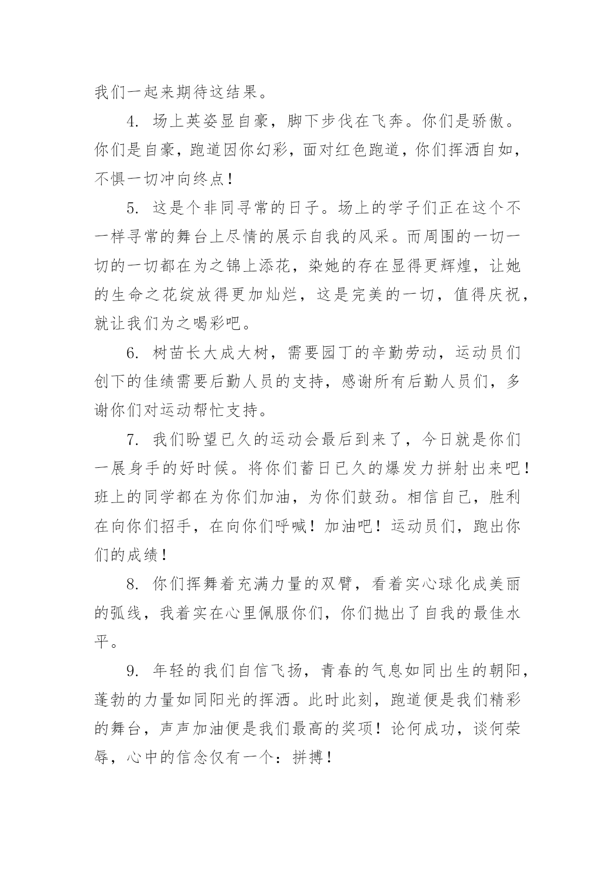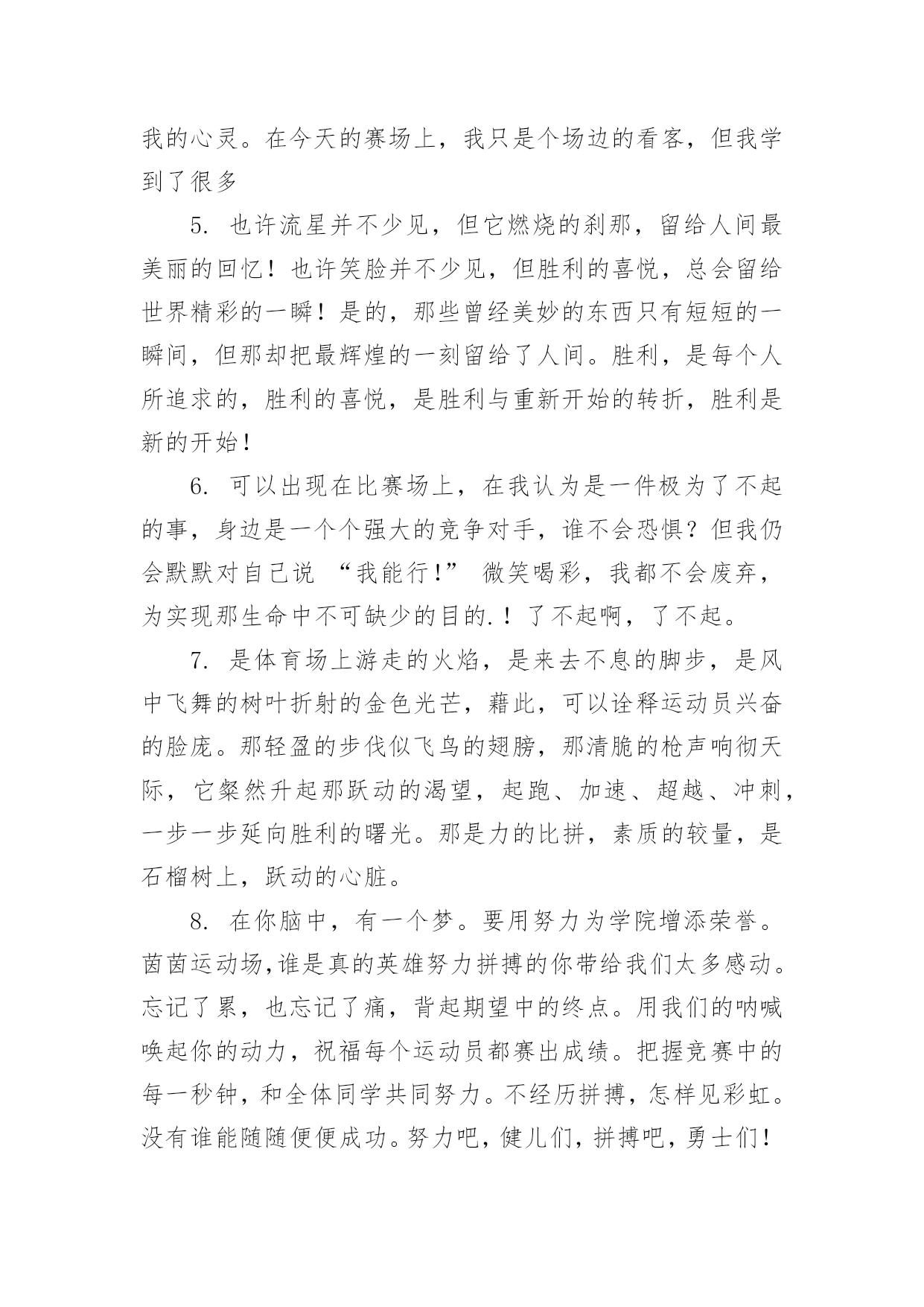 校园春季运动会加油稿在社会一步步向前发展的今天,能够利用到加油稿的场合越来越多,借助加油稿可以表达对对方的鼓励和支持。你写加油稿时总是无从下笔?以下是小编收集整理的校园春季运动会加油稿,仅供参考,希望能够帮助到大家。校园春季运动会加油稿11.你是体育宝座上的一颗灿烂夺目的珍珠,你是在蓝天中展翅飞翔的雏鹰。不要怕失败,不要怕冷落,无论何时,我们以你为荣。2.好情绪会让枯萎的花朵绽放,好情绪会让没有期望踏出一条新路来,好情绪会让你骤然绽放一种新面容,别不相信好情绪有时会创造奇迹,鼓起勇气树立信心放平心态,去努力找出,命中注定的本来就该属于你的那一份果实,让好情绪陪伴我们一生。3.亲爱的健儿们,你们要充满自信。比赛中没有挡风的墙,没有遮风的伞,也没有撑船的帆,更没有拉船的纤。事在人为,人定胜天。原你们养精蓄锐,对充满爱意的世界说“我自信,我拼搏,我会赢。4.在今天的赛场上,我只是个场边的看客。我用眼睛见证了赛场上的是非成败,用心灵感受了运动员的喜怒哀乐。他坚持跑完全程,我学到了坚持的可贵,他摔倒了再站起来,我学会了不怕失败的勇气。场上每一个点滴,都如此的震撼我的心灵。在今天的赛场上,我只是个场边的看客,但我学到了很多5.也许流星并不少见,但它燃烧的刹那,留给人间最美丽的回忆!也许笑脸并不少见,但胜利的喜悦,总会留给世界精彩的一瞬!是的,那些曾经美妙的东西只有短短的一瞬间,但那却把最辉煌的一刻留给了人间。胜利,是每个人所追求的,胜利的喜悦,是胜利与重新开始的转折,胜利是新的开始!6.可以出现在比赛场上,在我认为是一件极为了不起的事,身边是一个个强大的竞争对手,谁不会恐惧?但我仍会默默对自己说“我能行!”微笑喝彩,我都不会废弃,为实现那生命中不可缺少的目的.!了不起啊,了不起。7.是体育场上游走的火焰,是来去不息的脚步,是风中飞舞的树叶折射的金色光芒,藉此,可以诠释运动员兴奋的脸庞。那轻盈的步伐似飞鸟的翅膀,那清脆的枪声响彻天际,它粲然升起那跃动的渴望,起跑、加速、超越、冲刺,一步一步延向胜利的曙光。那是力的比拼,素质的较量,是石榴树上,跃动的心脏。8.在你脑中,有一个梦。要用努力为学院增添荣誉。茵茵运动场,谁是真的英雄努力拼搏的你带给我们太多感动。忘记了累,也忘记了痛,背起期望中的终点。用我们的呐喊唤起你的动力,祝福每个运动员都赛出成绩。把握竞赛中的每一秒钟,和全体同学共同努力。不经历拼搏,怎样见彩虹。没有谁能随随便便成功。努力吧,健儿们,拼搏吧,勇士们!9.你赢得十分精彩,无需掩饰你的微笑,流露在你脸上。但我相信,你心中十分明白,征途刚刚开始,漫漫长路刚刚开头。加油啊,朋友,只有不断的拼搏,才可以不断战胜自己,战胜一切!向前、向前、向前!10.致失败者倒下的时候,生命又怎能屹立!歪歪斜斜的身影,又怎耐的住风雨的洗礼。你若有一个不屈的灵魂,脚下才会有一方坚实的土地。昨天的失败已经过去,胜利不仅仅是一个美好的话题。11.在生活中,有成功,也会有失败。因此,我们要放飞生命,也许远方很渺茫,也许我们要被“倾覆于人生的荆棘”刺伤,但我们仍无怨无悔。放飞,即使是黄昏,也必然布满歌唱的流霞,因为我们坚信,不经过战斗的舍弃是虚伪的,不经过劫难磨炼的超脱是轻佻的,逃避显示的明哲是卑怯的。12.大海如此的浩淼,鼓声多么美妙,运动员们,你们不再像平时那样渺小,我们默默的祈祷,以你们为骄傲,我们会永远为你们叫好,看,终点就在眼前,听同学为你呼喊。鼓起勇气奋力向前,用你的荣誉带给我们希望。13.是体育场上游走的火焰,是来去不息的脚步,是风中飞舞的树叶折射的金色光芒,藉此,可以诠释运动员兴奋的脸庞。那轻盈的步伐似飞鸟的/翅膀,那清脆的枪声响彻天际,它粲然升起那跃动的渴望,起跑、加速、超越、冲刺,一步一步延向胜利的曙光。那是力的比拼,素质的较量,是石榴树上,跃动的心脏。14.这是速度与毅力的接力,这是期望与祈盼的接力,时间在这里凝固,几分几秒也变得如此漫长。千百双眼睛注视着你那矫健的身影,近了,近了,你可曾听到那山呼海啸般的加油声?近了,近了,前方就是终点,加油啊,运动员,成功和失败就在转瞬之间。15.你是运动场的心脏,跳动梦想;你是漫长路的精神,Ji励辉煌;你们是将上下求索的人!风为你加油,云为你助兴,坚定,执着,耐力与希望,在延伸的白色跑道中点点凝聚!力量,信念,拼搏与奋斗,在遥远的终点线上渐渐明亮!时代的强音正在你的脚下踏响。校园春季运动会加油稿21.深深的呼吸,等待你的是艰难的1500米。相信胜利会属于你们。但在这征途上,需要你勇敢的心去面对。我们在为你加油,你是否听到了*我们发自/心中的呐喊?困难和胜利都在向你招手,去呀,快去呀,不要犹豫。快去击败困难、快去夺取胜利!相信你会送给我们一个汗水浸湿的微笑!2.青春的脚步,青春的速度,青春的活力,青春的