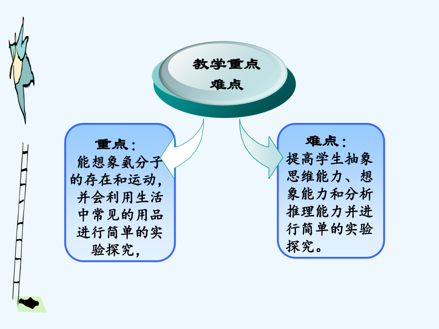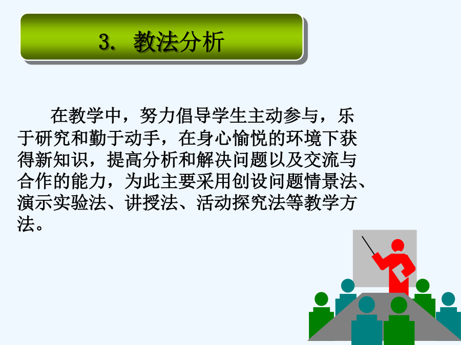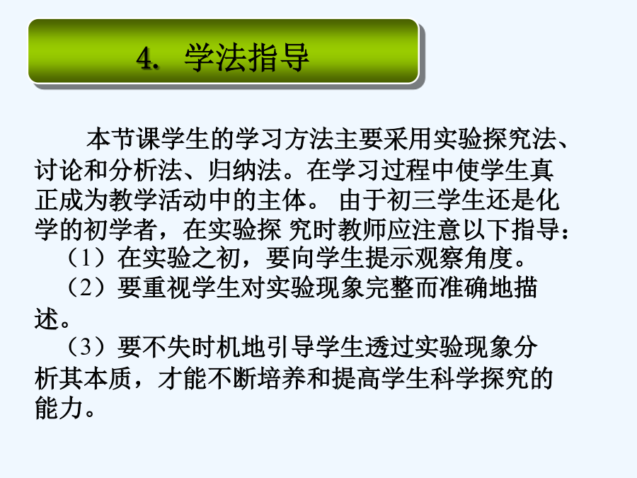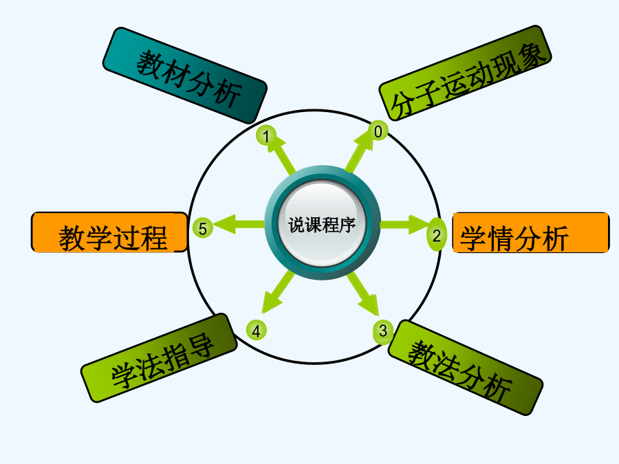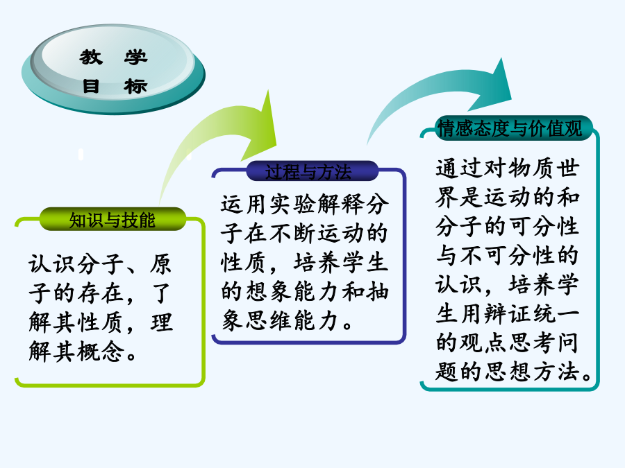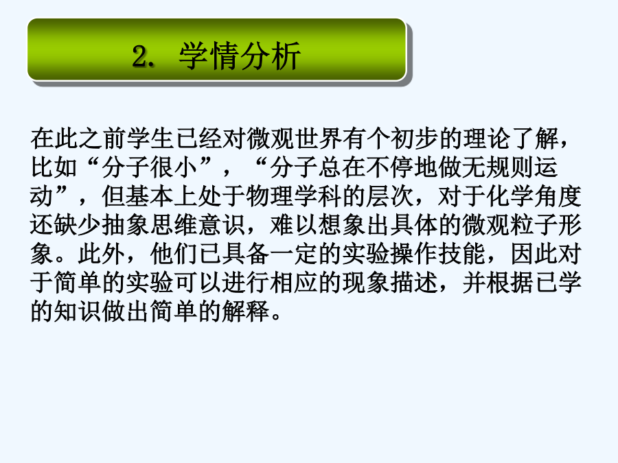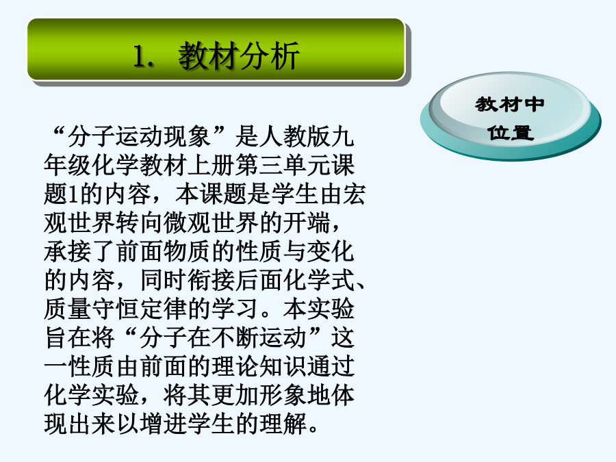 分子运动说课在此之前学生已经对微观世界有个初步的理论了解,比如“分子很小”,“分子总在不停地做无规则运动”,但基本上处于物理学科的层次,对于化学角度还缺少抽象思维意识,难以想象出具体的微观粒子形象。此外,他们已具备一定的实验操作技能,因此对于简单的实验可以进行相应的现象描述,并根据已学的知识做出简单的解释。在教学中,努力倡导学生主动参与,乐于研究和勤于动手,在身心愉悦的环境下获得新知识,提高分析和解决问题以及交流与合作的能力,为此主要采用创设问题情景法、演示实验法、讲授法、活动探究法等教学方法。大家应该也有点累了,稍作休息本节课学生的学习方法主要采用实验探究法、讨论和分析法、归纳法。在学习过程中使学生真正成为教学活动中的主体。由于初三学生还是化学的初学者,在实验探究时教师应注意以下指导:(1)在实验之初,要向学生提示观察角度。(2)要重视学生对实验现象完整而准确地描述。(3)要不失时机地引导学生透过实验现象分析其本质,才能不断培养和提高学生科学探究的能力。5.教学过程1、向盛有20ml蒸馏水的烧杯中加入5-6滴酚酞溶液,搅拌均匀,观察溶液的颜色。1、氨气是一种有强烈刺激性气味的物质,浓氨水具有挥发性,放置在敞口的烧杯中会使教室弥漫一股难闻的刺激性气味,这样会造成一定的环境污染。2、原实验药品用烧杯盛放,用量较大,会造成一定的浪费。3、该实验不容易对比出温度对分子运动速率的影响。二、实验过程:1、将喷有酚酞试液的滤纸花用细线系住固定在可乐瓶的中上部,盖上瓶盖,然后在瓶身底部用注射器注入微量的浓氨水,很快处于瓶子中下部的白色滤纸花变成红色。三、本实验改进和创新:教学反思