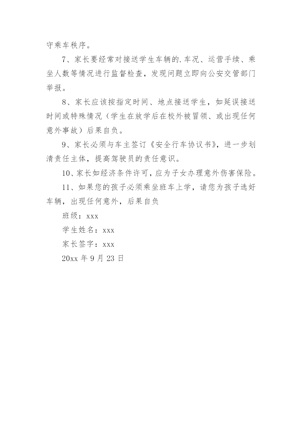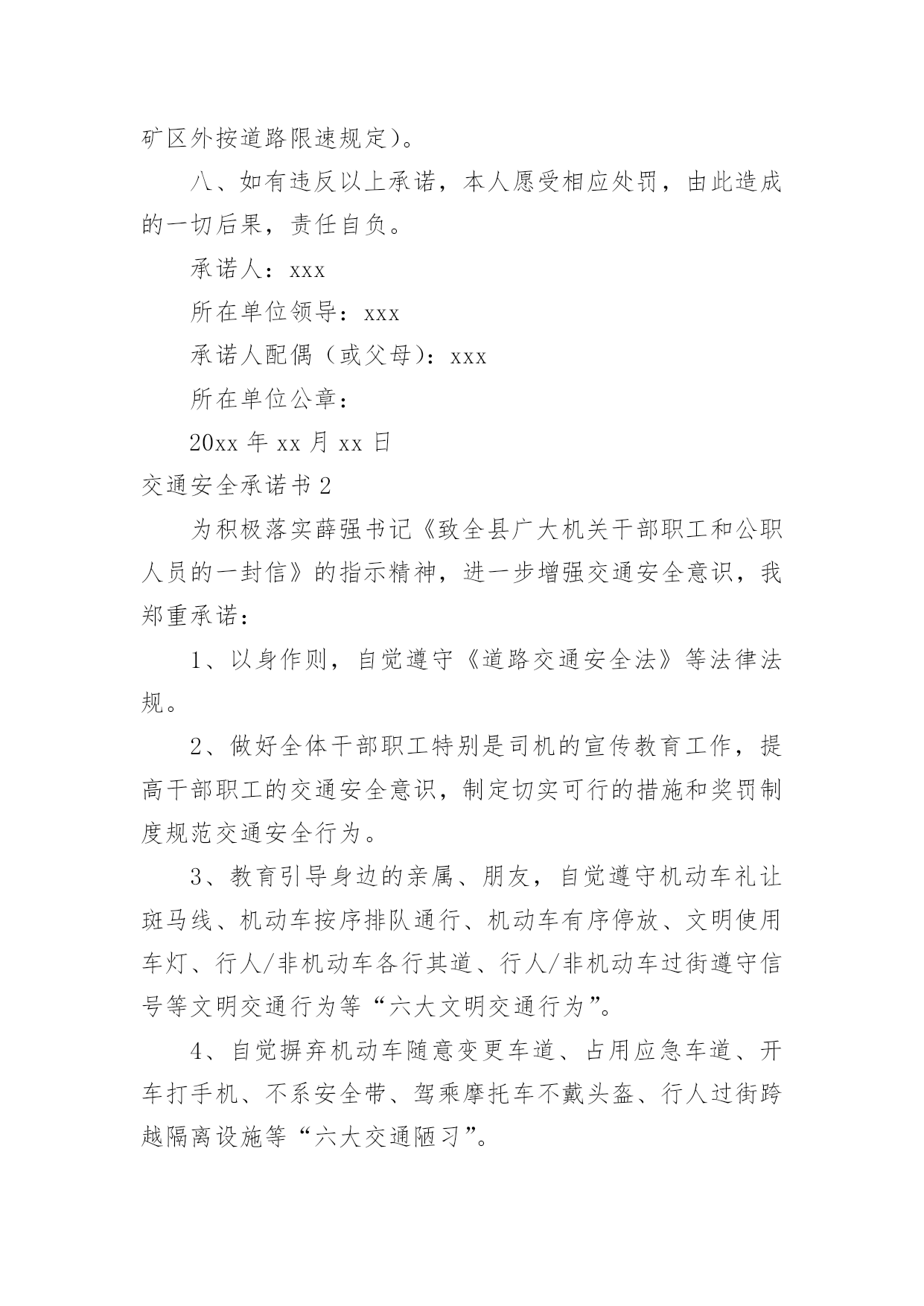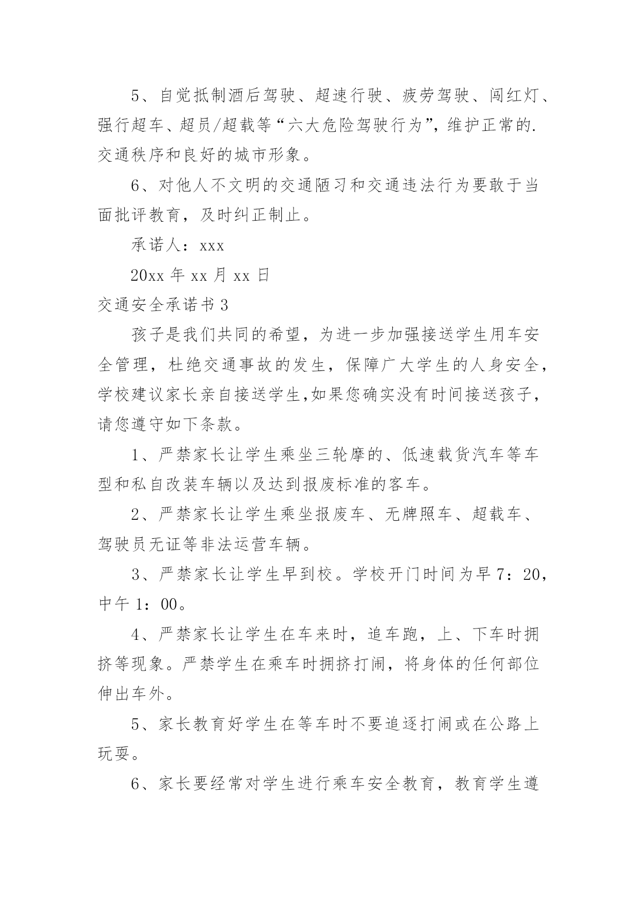 交通安全承诺书交通安全承诺书在社会一步步向前发展的今天,我们使用上承诺书的情况与日俱增,相比于口头承诺,承诺书的约束力更强。你所见过的承诺书是什么样的呢?以下是小编帮大家整理的交通安全承诺书,欢迎大家分享。交通安全承诺书1为提高行车交通安全意识,避免交通事故发生,保护自身生命安全,维护供应站正常生产秩序,本人特做以下郑重承诺,并严格遵守:一、自觉遵守道路交通安全法规,按照行车操作规范安全驾驶、文明驾驶。二、上班期间未经单位领导允许,不擅自行车离站。三、有车职工不搭载职工上下班,不拼车上下班。无车职工上下班往返应乘坐正规交通车辆。四、职工驾驶机动车辆应证件齐全,有车职工不得将车辆交给无驾驶证的人员驾驶。五、不酒后驾驶机动车辆,坚决做到“动酒不动车,动车不动酒”。六、不在疲劳状态下驾驶机动车辆,不开“英雄车”、“赌气车”,不在雨、雪、雾等恶劣天气下驾驶机动车辆。七、不超速行驶(矿区内车辆限速15公里/每小时,矿区外按道路限速规定)。八、如有违反以上承诺,本人愿受相应处罚,由此造成的一切后果,责任自负。承诺人:xxx所在单位领导:xxx承诺人配偶(或父母):xxx所在单位公章:20xx年xx月xx日交通安全承诺书2为积极落实薛强书记《致全县广大机关干部职工和公职人员的一封信》的指示精神,进一步增强交通安全意识,我郑重承诺:1、以身作则,自觉遵守《道路交通安全法》等法律法规。2、做好全体干部职工特别是司机的宣传教育工作,提高干部职工的交通安全意识,制定切实可行的措施和奖罚制度规范交通安全行为。3、教育引导身边的亲属、朋友,自觉遵守机动车礼让斑马线、机动车按序排队通行、机动车有序停放、文明使用车灯、行人/非机动车各行其道、行人/非机动车过街遵守信号等文明交通行为等“六大文明交通行为”。4、自觉摒弃机动车随意变更车道、占用应急车道、开车打手机、不系安全带、驾乘摩托车不戴头盔、行人过街跨越隔离设施等“六大交通陋习”。5、自觉抵制酒后驾驶、超速行驶、疲劳驾驶、闯红灯、强行超车、超员/超载等“六大危险驾驶行为”,维护正常的.交通秩序和良好的城市形象。6、对他人不文明的交通陋习和交通违法行为要敢于当面批评教育,及时纠正制止。承诺人:xxx20xx年xx月xx日交通安全承诺书3孩子是我们共同的希望,为进一步加强接送学生用车安全管理,杜绝交通事故的发生,保障广大学生的人身安全,学校建议家长亲自接送学生,如果您确实没有时间接送孩子,请您遵守如下条款。1、严禁家长让学生乘坐三轮摩的、低速载货汽车等车型和私自改装车辆以及达到报废标准的客车。2、严禁家长让学生乘坐报废车、无牌照车、超载车、驾驶员无证等非法运营车辆。3、严禁家长让学生早到校。学校开门时间为早7:20,中午1:00。4、严禁家长让学生在车来时,追车跑,上、下车时拥挤等现象。严禁学生在乘车时拥挤打闹,将身体的任何部位伸出车外。5、家长教育好学生在等车时不要追逐打闹或在公路上玩耍。6、家长要经常对学生进行乘车安全教育,教育学生遵守乘车秩序。7、家长要经常对接送学生车辆的.车况、运营手续、乘坐人数等情况进行监督检查,发现问题立即向公安交管部门举报。8、家长应该按指定时间、地点接送学生,如延误接送时间或特殊情况(学生在放学后在校外被冒领、或出现任何意外事故)后果自负。9、家长必须与车主签订《安全行车协议书》,进一步划清责任主体,提高驾驶员的责任意识。10、家长如经济条件许可,应为子女办理意外伤害保险。11、如果您的孩子必须乘坐班车上学,请您为孩子选好车辆,出现任何意外,后果自负班级:xxx学生姓名:xxx家长签字:xxx20xx年9月23日