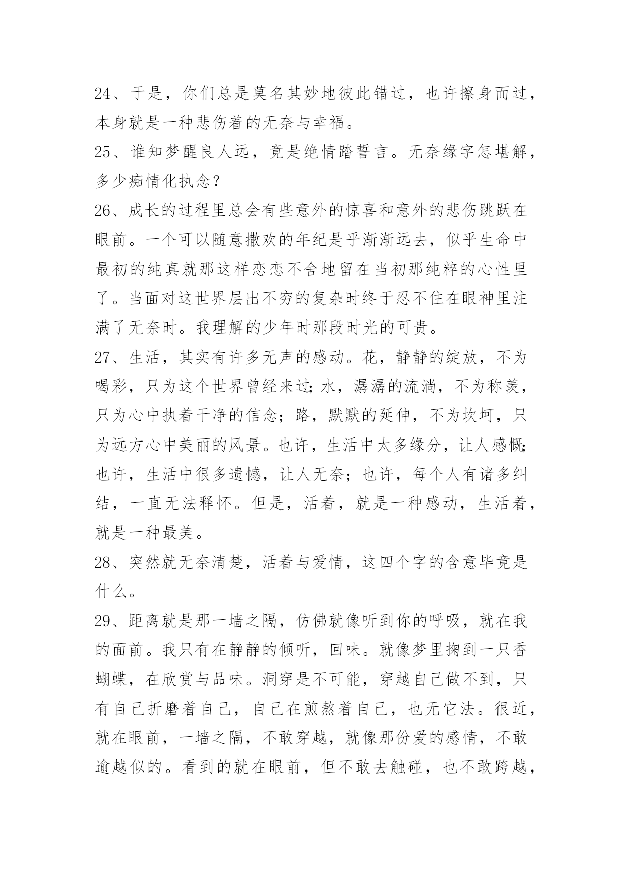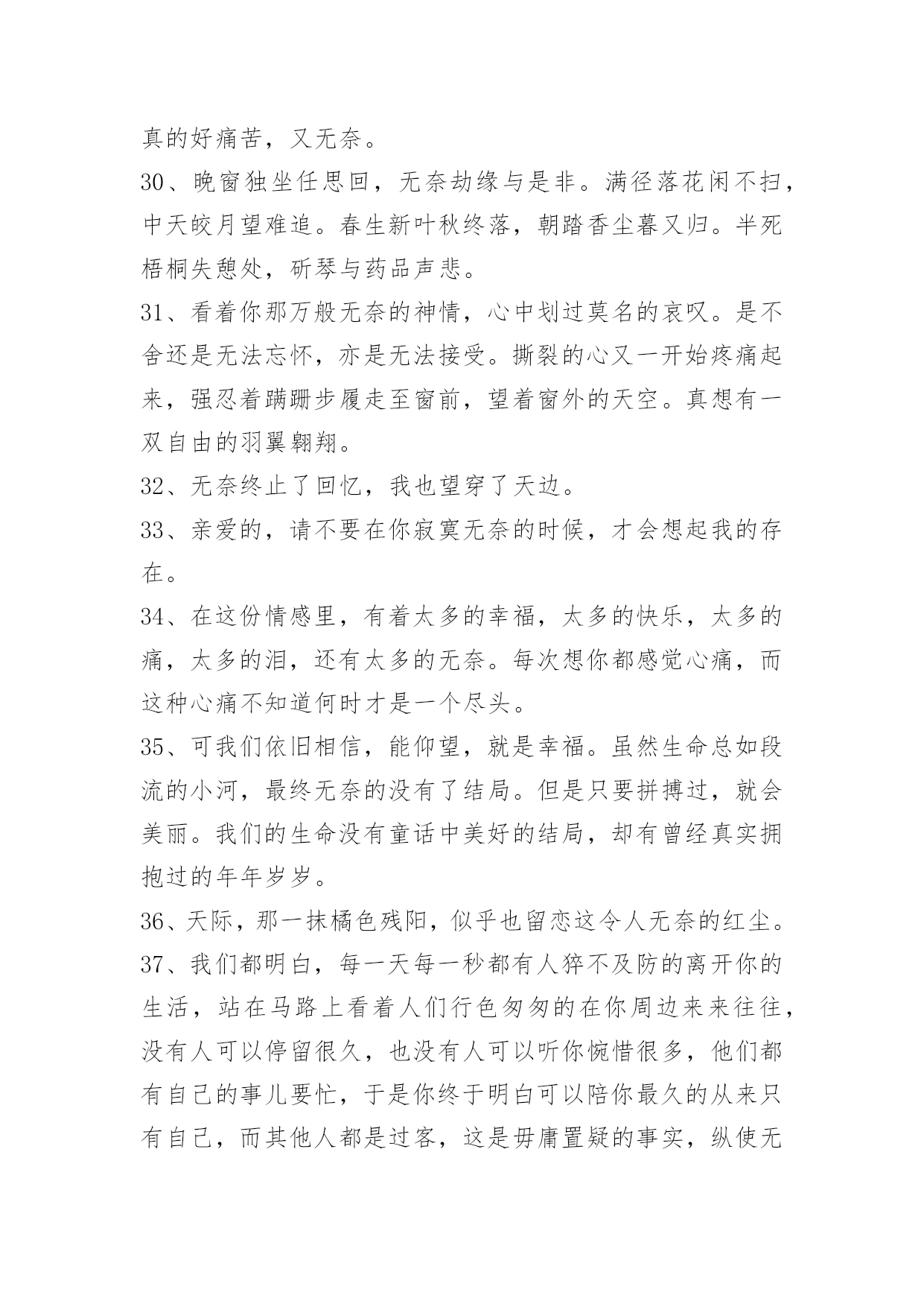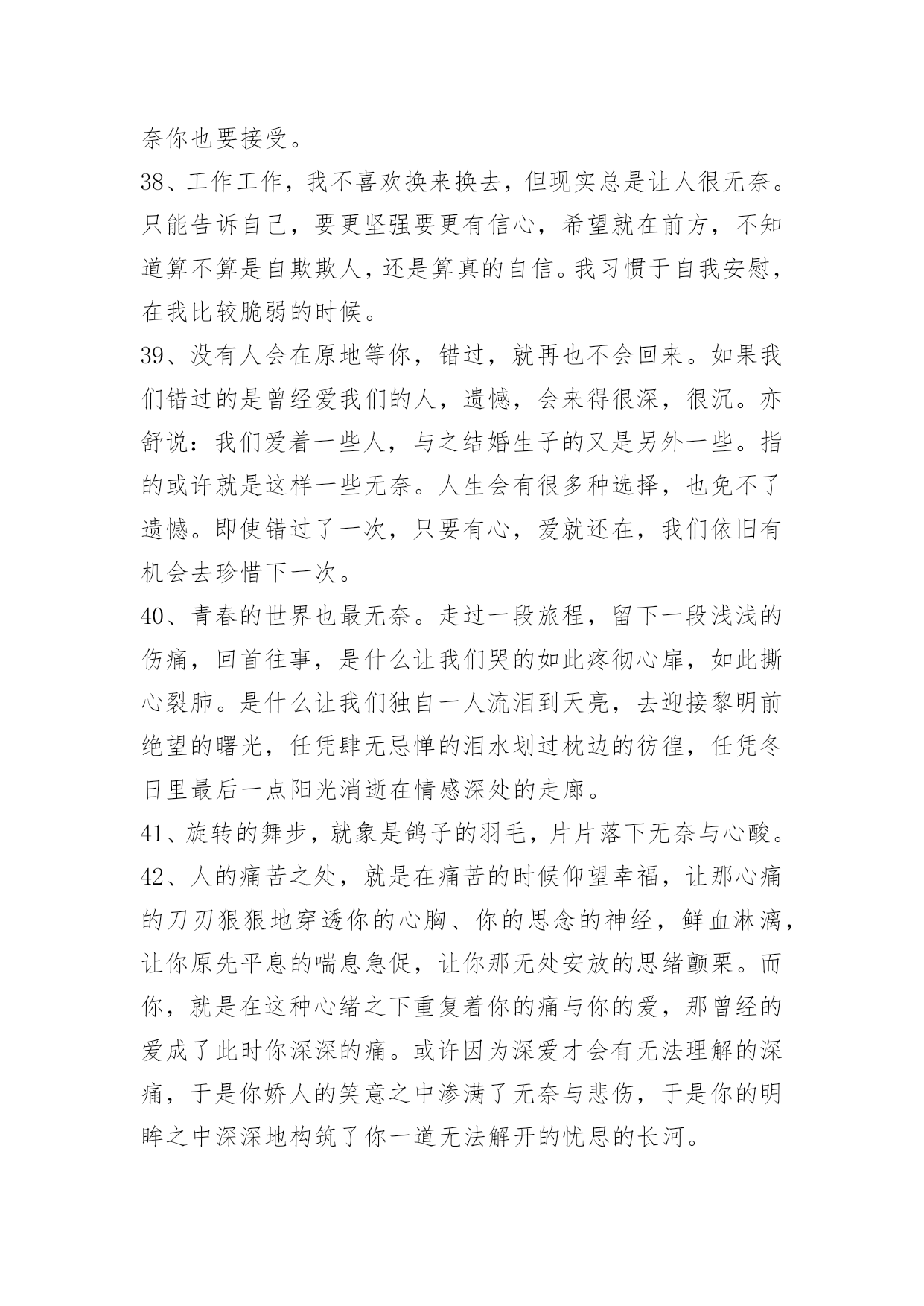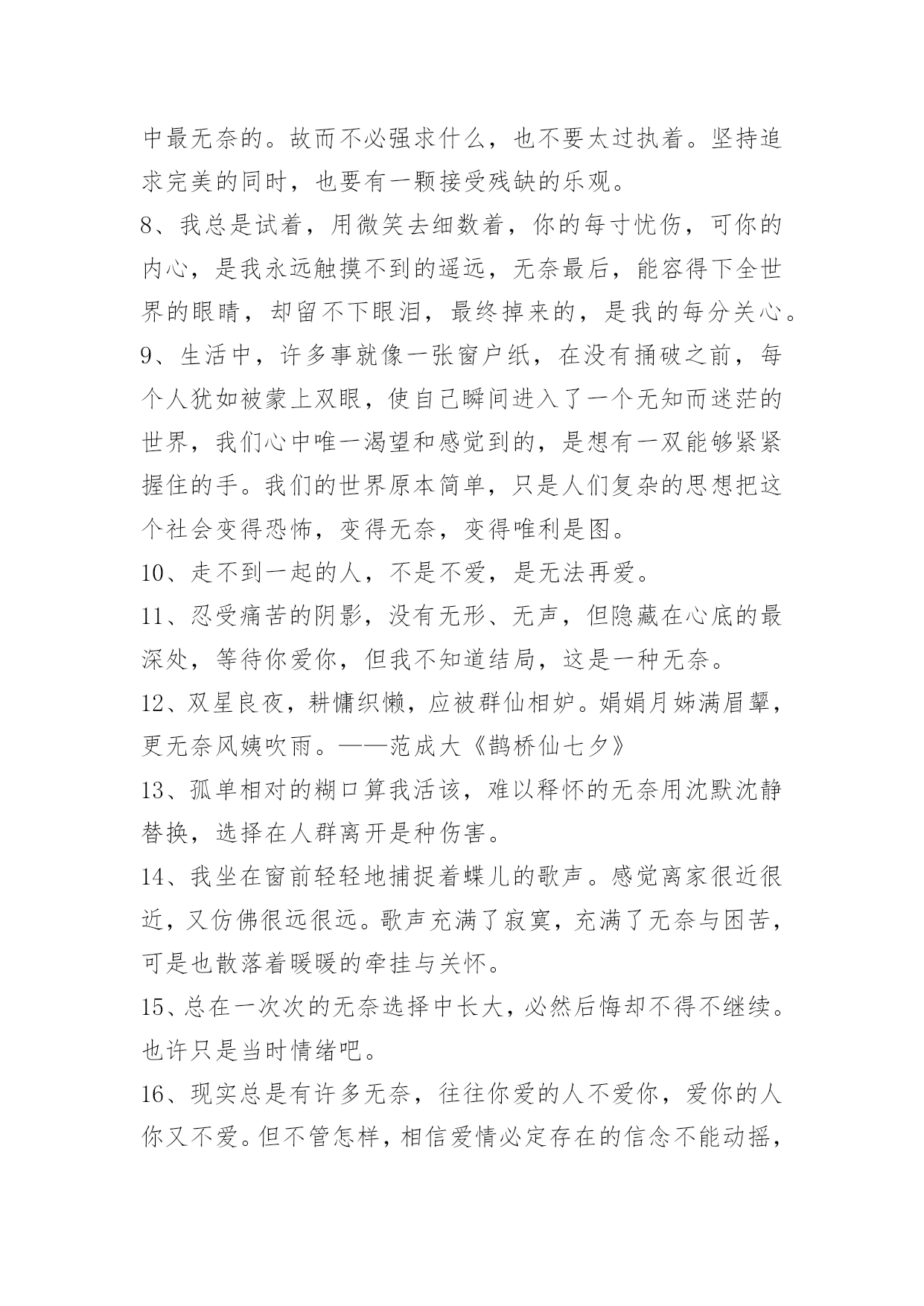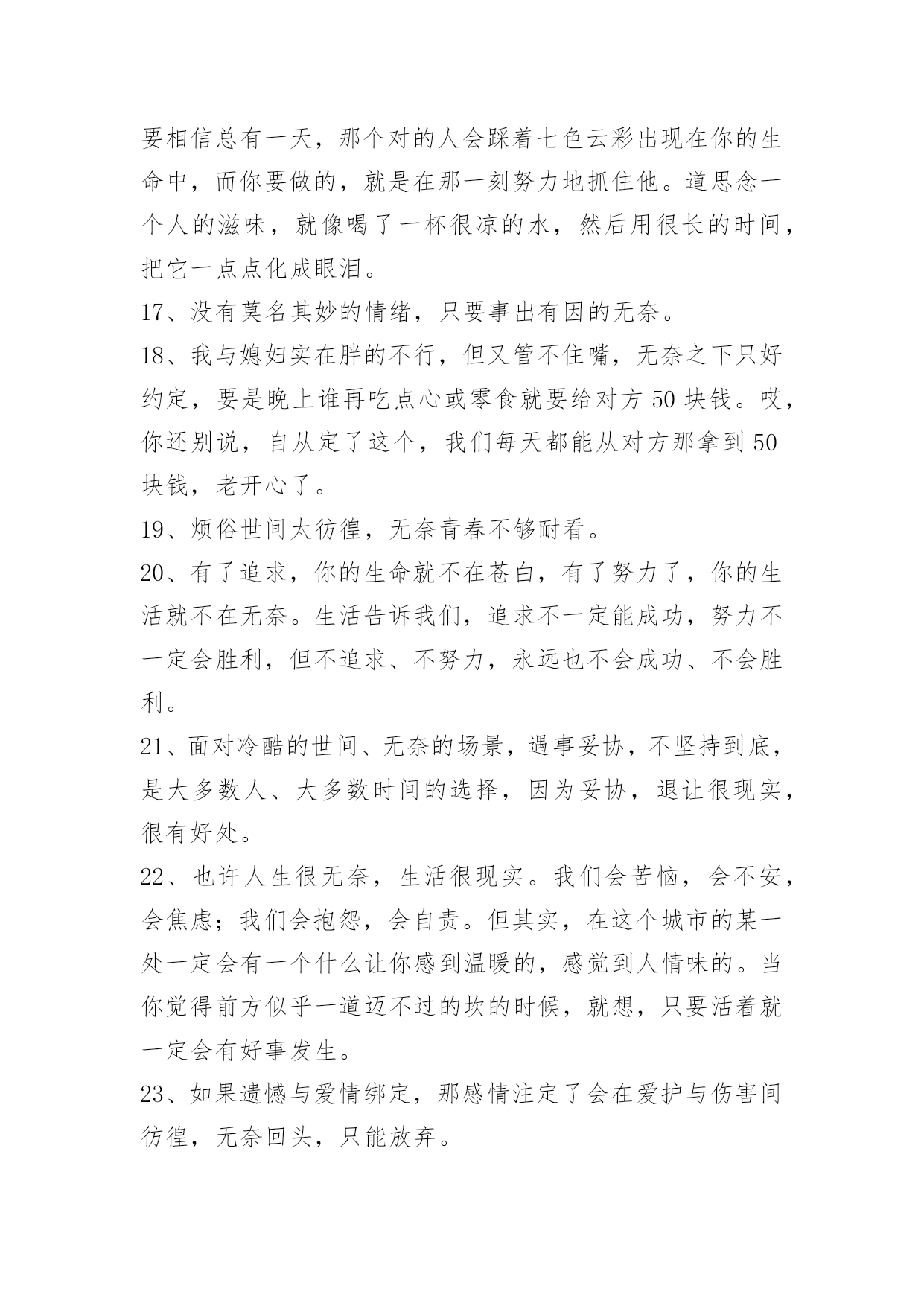 形容无奈的句子53条【推荐】形容无奈的句子集合53条再见了我的爱,舍不得也要离开,这就是无奈。下面是小编给各位读者分享的形容无奈的句子53条,欢迎大家分享。1、曾经,疑惑着自己的下一步应该往哪里走,是否会有将来的自己来指点迷津,走出那条迷失的小路。当自己磕磕碰碰,一路从迷失中走了出来,才发现自己早已经错失了太多。这是多么的辛酸与无奈。2、千疮百孔的心脆弱得再也经不起痛入骨髓的折磨,于是无奈的放了,也放自己一条生路,把我们的曾经凝结成一幅画,深深地刻在脑海里,看着,想着,可是不会再做画中人。3、人生总是无奈,生活总是无情。如果生活是一条单行道,就请你从此走在我的前面,让我时时可以看到你;人们往往为了逃避一个错误,而去犯另外一个错误。既然很多错误无法回避,何必让悔恨埋葬你的人生呢?你与其逃来逃去还不如去面对一个,勇敢的去面对,成就你人生的辉煌。4、人们就像在呆板的实际生活中渴望虚构的艺术那样,在这无奈的现实中梦想一片净土、一种完美的时间。5、看到分开时那种无奈的表情,真心难过。6、有些说不出的陌生,荡然而存。7、从内心而发的从容淡定,才是真正的简单。人生总是有成功也有失败,有相聚也有离散,又何必苛求太多。没有谁能够得天独厚,一生随心。许多事情不能两全其美,是人生中最无奈的。故而不必强求什么,也不要太过执着。坚持追求完美的同时,也要有一颗接受残缺的乐观。8、我总是试着,用微笑去细数着,你的每寸忧伤,可你的内心,是我永远触摸不到的遥远,无奈最后,能容得下全世界的眼睛,却留不下眼泪,最终掉来的,是我的每分关心。9、生活中,许多事就像一张窗户纸,在没有捅破之前,每个人犹如被蒙上双眼,使自己瞬间进入了一个无知而迷茫的世界,我们心中唯一渴望和感觉到的,是想有一双能够紧紧握住的手。我们的世界原本简单,只是人们复杂的思想把这个社会变得恐怖,变得无奈,变得唯利是图。10、走不到一起的人,不是不爱,是无法再爱。11、忍受痛苦的阴影,没有无形、无声,但隐藏在心底的最深处,等待你爱你,但我不知道结局,这是一种无奈。12、双星良夜,耕慵织懒,应被群仙相妒。娟娟月姊满眉颦,更无奈风姨吹雨。——范成大《鹊桥仙七夕》13、孤单相对的糊口算我活该,难以释怀的无奈用沈默沈静替换,选择在人群离开是种伤害。14、我坐在窗前轻轻地捕捉着蝶儿的歌声。感觉离家很近很近,又仿佛很远很远。歌声充满了寂寞,充满了无奈与困苦,可是也散落着暖暖的牵挂与关怀。15、总在一次次的无奈选择中长大,必然后悔却不得不继续。也许只是当时情绪吧。16、现实总是有许多无奈,往往你爱的人不爱你,爱你的人你又不爱。但不管怎样,相信爱情必定存在的信念不能动摇,要相信总有一天,那个对的人会踩着七色云彩出现在你的生命中,而你要做的,就是在那一刻努力地抓住他。道思念一个人的滋味,就像喝了一杯很凉的水,然后用很长的时间,把它一点点化成眼泪。17、没有莫名其妙的情绪,只要事出有因的无奈。18、我与媳妇实在胖的不行,但又管不住嘴,无奈之下只好约定,要是晚上谁再吃点心或零食就要给对方50块钱。哎,你还别说,自从定了这个,我们每天都能从对方那拿到50块钱,老开心了。19、烦俗世间太彷徨,无奈青春不够耐看。20、有了追求,你的生命就不在苍白,有了努力了,你的生活就不在无奈。生活告诉我们,追求不一定能成功,努力不一定会胜利,但不追求、不努力,永远也不会成功、不会胜利。21、面对冷酷的世间、无奈的场景,遇事妥协,不坚持到底,是大多数人、大多数时间的选择,因为妥协,退让很现实,很有好处。22、也许人生很无奈,生活很现实。我们会苦恼,会不安,会焦虑;我们会抱怨,会自责。但其实,在这个城市的某一处一定会有一个什么让你感到温暖的,感觉到人情味的。当你觉得前方似乎一道迈不过的坎的时候,就想,只要活着就一定会有好事发生。23、如果遗憾与爱情绑定,那感情注定了会在爱护与伤害间彷徨,无奈回头,只能放弃。24、于是,你们总是莫名其妙地彼此错过,也许擦身而过,本身就是一种悲伤着的无奈与幸福。25、谁知梦醒良人远,竟是绝情踏誓言。无奈缘字怎堪解,多少痴情化执念?26、成长的过程里总会有些意外的惊喜和意外的悲伤跳跃在眼前。一个可以随意撒欢的年纪是乎渐渐远去,似乎生命中最初的纯真就那这样恋恋不舍地留在当初那纯粹的心性里了。当面对这世界层出不穷的复杂时终于忍不住在眼神里注满了无奈时。我理解的少年时那段时光的可贵。27、生活,其实有许多无声的感动。花,静静的绽放,不为喝彩,只为这个世界曾经来过;水,潺潺的流淌,不为称羡,只为心中执着干净的信念;路,默默的延伸,不为坎坷,只为远方心中美丽的风景。也许,生活中太多缘分,让人感慨;也许,生活中很多遗憾,让人无奈;也许,每个人有诸多纠结,一直无法释怀。但是,活着,就是一种感动,生活着,就是一种最美。28、突然就无