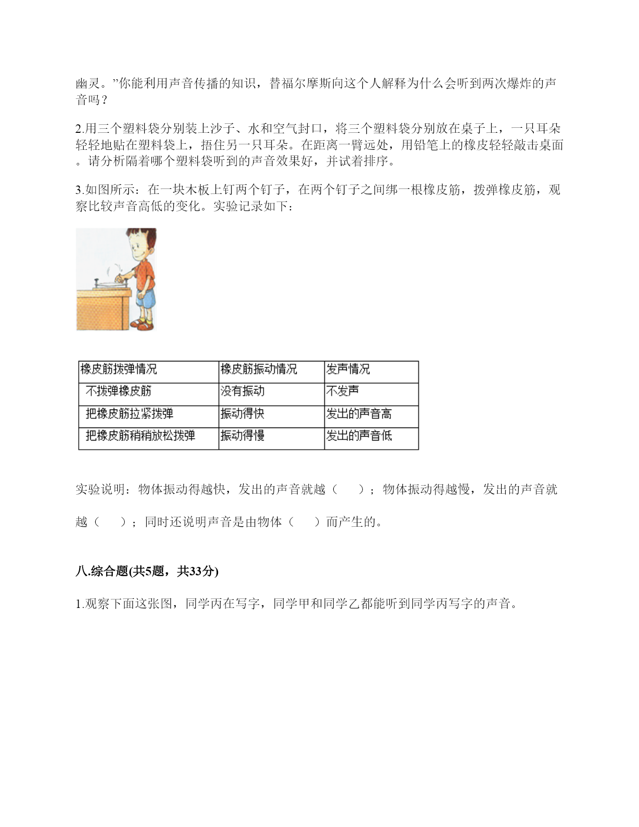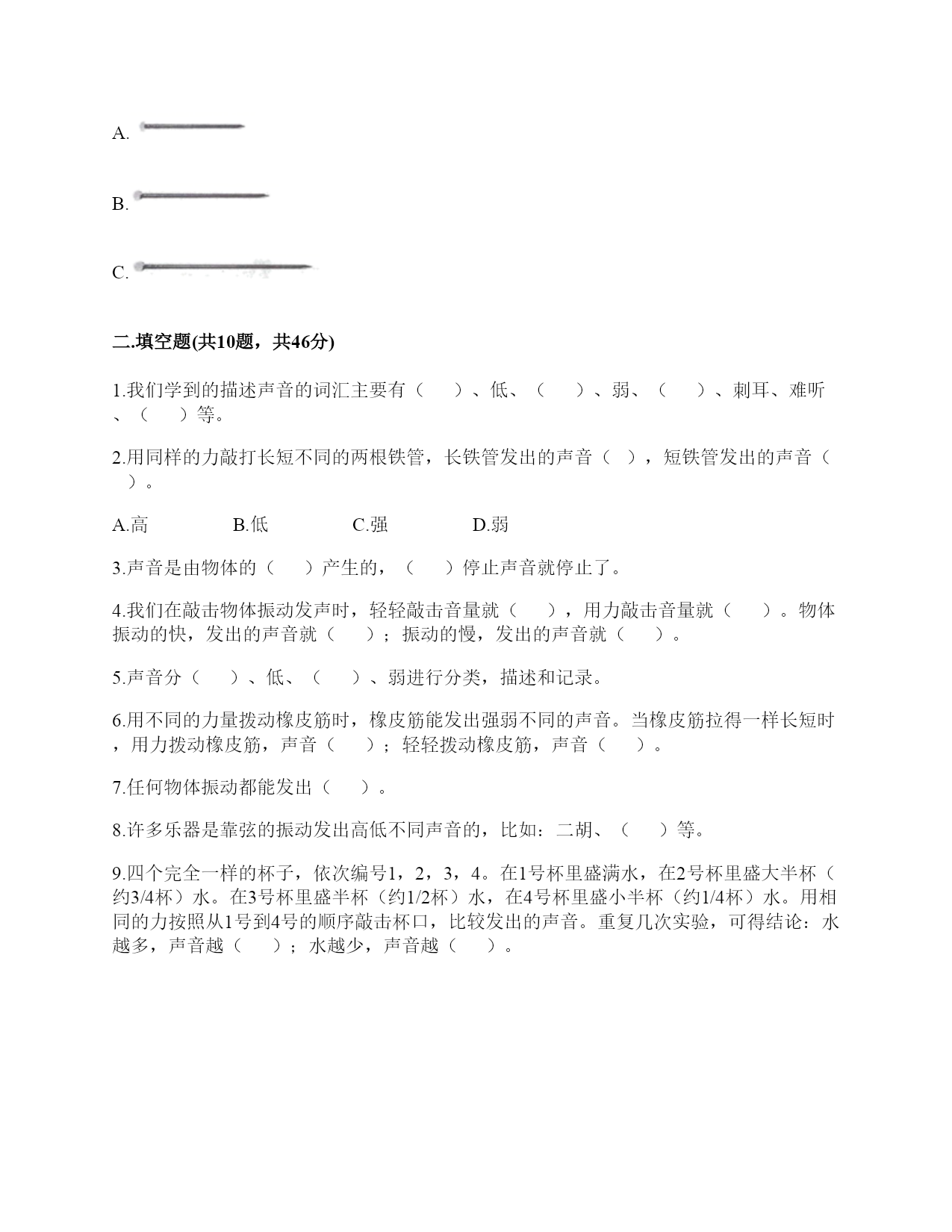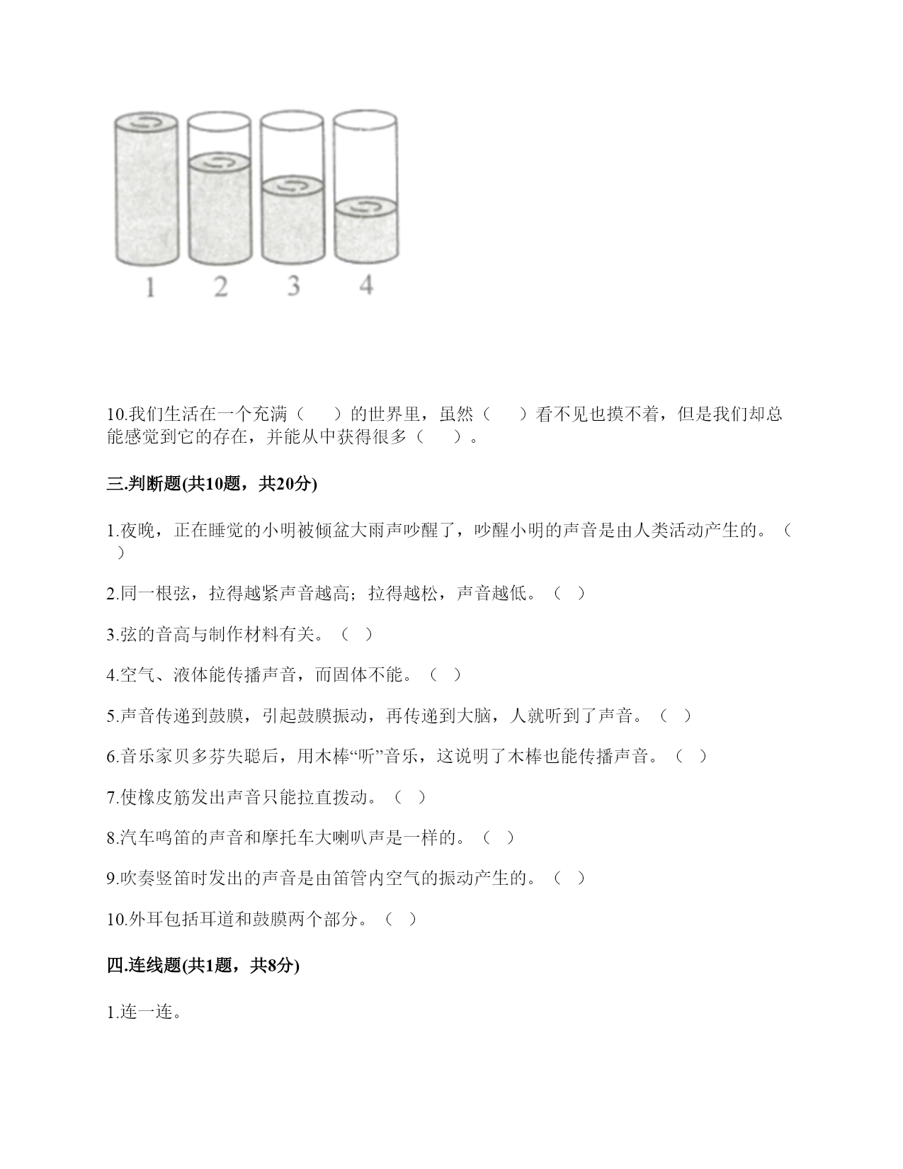 小学科学《声音》练习题一.选择题(共10题,共20分)1.写字的声音可以通过()传播到紧贴在桌面上的耳朵里。A.纸B.笔C.桌面2.我们耳朵里的()即使是轻微的声音,它都会产生振动。A.听小骨B.鼓膜C.耳蜗3.用力弯曲钢尺,钢尺没有发出声音,是因为钢尺()。A.没有受到力B.没有振动C.弯曲幅度不够4.钢尺一部分伸出桌边外,其他部分固定在桌面上。用木块压它在桌外部分顶端并让它滑过。尺端被压下2厘米时即滑过,与被压下5厘米时即滑过发出的声音()。A.强弱不同,频率相同B.频率不同,强弱相同C.频率、强弱都不同5.调节电视遥控器上的“音量按钮”改变的是声音的()。A.强弱B.高低C.以上都是6.()属于自然界的声音。A.风吹树叶的声音B.汽车鸣笛的声音C.炒菜的声音7.下列关于声音的说法,错误的是()。A.拉开一根弹性绳子就会有声音B.拨动塑料尺会发出声音C.声音是由物体振动产生的8.用拨动的方法使钢尺发声的实验,下列做法中正确的是()。A.边做实验,边大声讨论B.不用分工合作,看着同学完成就可以了C.钢尺的一端要用力压住9.当我们把玻璃钟罩里的空气逐渐抽掉,钟罩跟里的铃声()。A.越来越响B.越来越小C.不变10.敲击下图三根铁钉,发出声音最高的是()。A.B.C.二.填空题(共10题,共46分)1.我们学到的描述声音的词汇主要有()、低、()、弱、()、刺耳、难听、()等。2.用同样的力敲打长短不同的两根铁管,长铁管发出的声音(),短铁管发出的声音()。A.高B.低C.强D.弱3.声音是由物体的()产生的,()停止声音就停止了。4.我们在敲击物体振动发声时,轻轻敲击音量就(),用力敲击音量就()。物体振动的快,发出的声音就();振动的慢,发出的声音就()。5.声音分()、低、()、弱进行分类,描述和记录。6.用不同的力量拨动橡皮筋时,橡皮筋能发出强弱不同的声音。当橡皮筋拉得一样长短时,用力拨动橡皮筋,声音();轻轻拨动橡皮筋,声音()。7.任何物体振动都能发出()。8.许多乐器是靠弦的振动发出高低不同声音的,比如:二胡、()等。9.四个完全一样的杯子,依次编号1,2,3,4。在1号杯里盛满水,在2号杯里盛大半杯(约3/4杯)水。在3号杯里盛半杯(约1/2杯)水,在4号杯里盛小半杯(约1/4杯)水。用相同的力按照从1号到4号的顺序敲击杯口,比较发出的声音。重复几次实验,可得结论:水越多,声音越();水越少,声音越()。10.我们生活在一个充满()的世界里,虽然()看不见也摸不着,但是我们却总能感觉到它的存在,并能从中获得很多()。三.判断题(共10题,共20分)1.夜晚,正在睡觉的小明被倾盆大雨声吵醒了,吵醒小明的声音是由人类活动产生的。()2.同一根弦,拉得越紧声音越高;拉得越松,声音越低。()3.弦的音高与制作材料有关。()4.空气、液体能传播声音,而固体不能。()5.声音传递到鼓膜,引起鼓膜振动,再传递到大脑,人就听到了声音。()6.音乐家贝多芬失聪后,用木棒“听”音乐,这说明了木棒也能传播声音。()7.使橡皮筋发出声音只能拉直拨动。()8.汽车鸣笛的声音和摩托车大喇叭声是一样的。()9.吹奏竖笛时发出的声音是由笛管内空气的振动产生的。()10.外耳包括耳道和鼓膜两个部分。()四.连线题(共1题,共8分)1.连一连。拨动拉得较紧的橡皮筋听到的声音高拨动拉得较松的橡皮筋用力敲击锣听到的声音低轻轻敲击锣鼓皮振动得快听到的声音强鼓皮振动得慢弹拨伸出桌面距离长的尺子听到的声音弱弹拨伸出桌面距离短的尺子五.填表题(共2题,共24分)1.猜想:声音强弱与物体振动幅度有关,振幅越大,声音越();物体振幅越小,声音越()。实验器材:钢尺,桌子改变的条件:()不改变的条件:()填写表格。实验结论是什么?2.完成声音强弱与振动物体的关系记录表。六.简答题(共5题,共27分)1.声音在传播的过程中借助了什么物质?2.停止敲锣后,在一段时间内还能听到锣声,这是为什么?3.为什么说“一个巴掌拍不响”?4.想一想,上课时坐在教室里能听到哪些声音?坐在教室里能听到的声音有?5.宇航员在太空中工作时,需要借助电子通信设备才能进行沟通,为什么?七.材料题(共3题,共19分)1.某一天,有一个人找到福尔摩斯,说他碰上了幽灵。福尔摩斯觉得很好奇,就问他到底是怎么回事。乘客说:“我乘坐的客轮触礁沉没了,幸好我会游泳,才没有沉下云。就当我在水下朝求救生艇游云的时候,突然听见一声巨响,我连忙从水里出来向沉船方向看去,结果又传来一声巨响。可是后来所有人都说只听到了一声巨响。你说我是不是遇到幽灵了?”福尔摩斯想了想