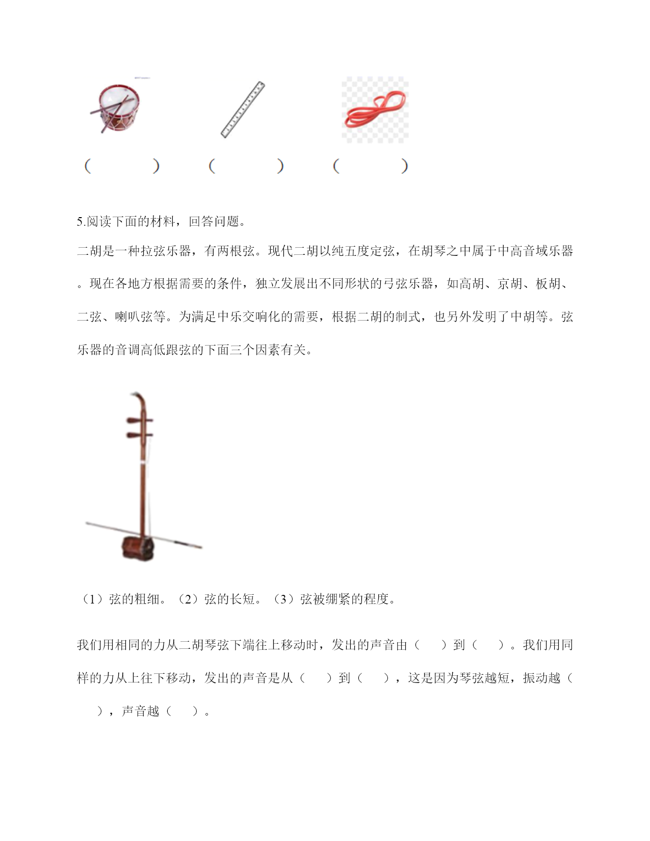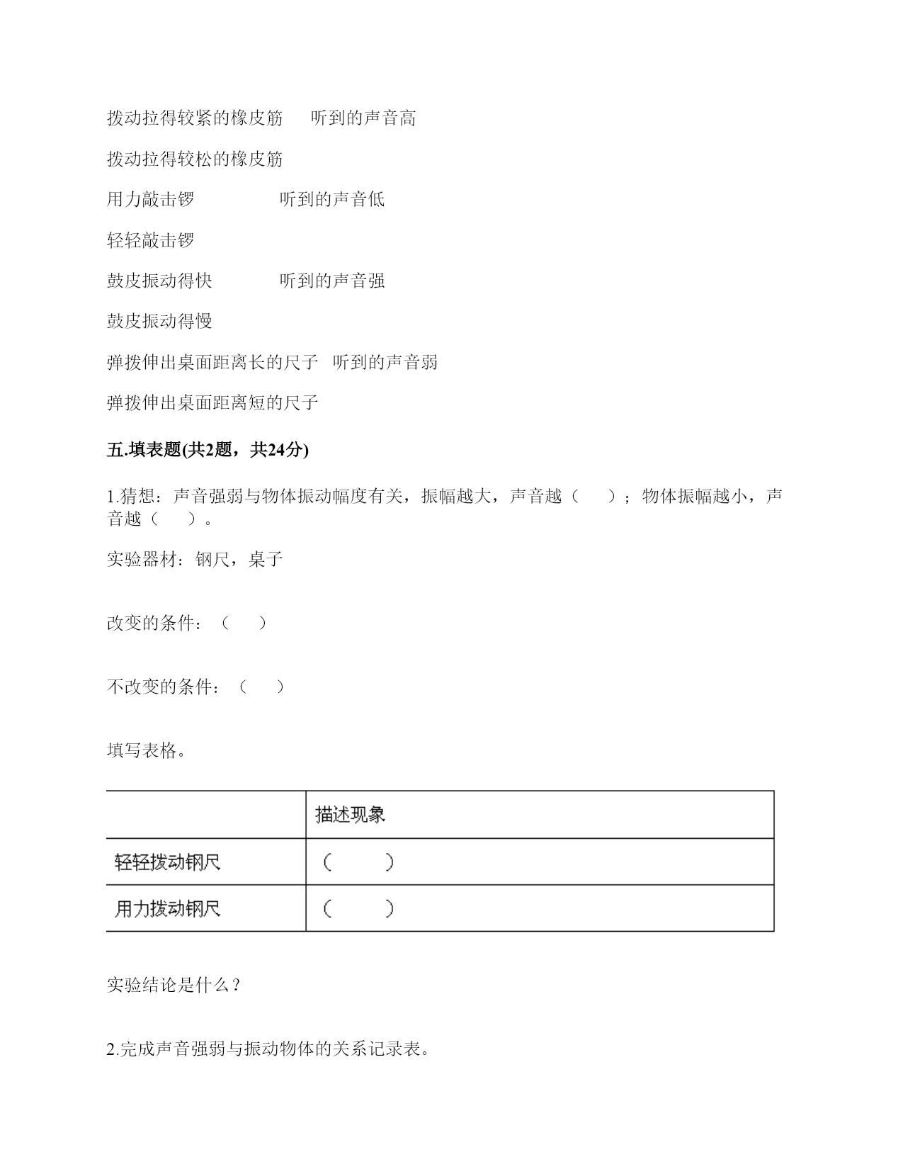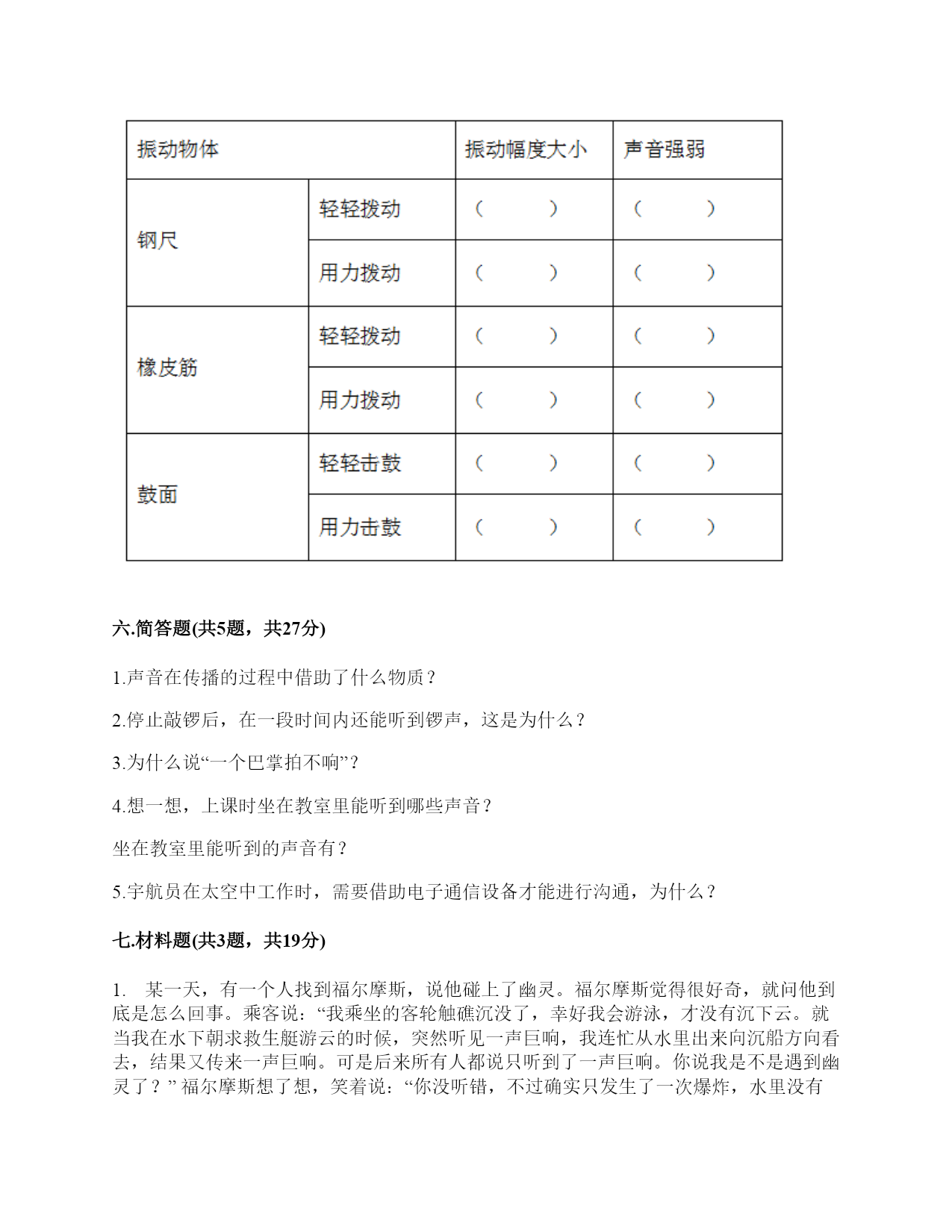 小学科学《声音》练习题一.选择题(共10题,共20分)1.写字的声音可以通过()传播到紧贴在桌面上的耳朵里。A.纸B.笔C.桌面2.我们耳朵里的()即使是轻微的声音,它都会产生振动。A.听小骨B.鼓膜C.耳蜗3.用力弯曲钢尺,钢尺没有发出声音,是因为钢尺()。A.没有受到力B.没有振动C.弯曲幅度不够4.钢尺一部分伸出桌边外,其他部分固定在桌面上。用木块压它在桌外部分顶端并让它滑过。尺端被压下2厘米时即滑过,与被压下5厘米时即滑过发出的声音()。A.强弱不同,频率相同B.频率不同,强弱相同C.频率、强弱都不同5.调节电视遥控器上的“音量按钮”改变的是声音的()。A.强弱B.高低C.以上都是6.()属于自然界的声音。A.风吹树叶的声音B.汽车鸣笛的声音C.炒菜的声音7.下列关于声音的说法,错误的是()。A.拉开一根弹性绳子就会有声音B.拨动塑料尺会发出声音C.声音是由物体振动产生的8.用拨动的方法使钢尺发声的实验,下列做法中正确的是()。A.边做实验,边大声讨论B.不用分工合作,看着同学完成就可以了C.钢尺的一端要用力压住9.当我们把玻璃钟罩里的空气逐渐抽掉,钟罩跟里的铃声()。A.越来越响B.越来越小C.不变10.敲击下图三根铁钉,发出声音最高的是()。A.B.C.二.填空题(共10题,共46分)1.我们学到的描述声音的词汇主要有()、低、()、弱、()、刺耳、难听、()等。2.用同样的力敲打长短不同的两根铁管,长铁管发出的声音(),短铁管发出的声音()。A.高B.低C.强D.弱3.声音是由物体的()产生的,()停止声音就停止了。4.我们在敲击物体振动发声时,轻轻敲击音量就(),用力敲击音量就()。物体振动的快,发出的声音就();振动的慢,发出的声音就()。5.声音分()、低、()、弱进行分类,描述和记录。6.用不同的力量拨动橡皮筋时,橡皮筋能发出强弱不同的声音。当橡皮筋拉得一样长短时,用力拨动橡皮筋,声音();轻轻拨动橡皮筋,声音()。7.任何物体振动都能发出()。8.许多乐器是靠弦的振动发出高低不同声音的,比如:二胡、()等。9.四个完全一样的杯子,依次编号1,2,3,4。在1号杯里盛满水,在2号杯里盛大半杯(约3/4杯)水。在3号杯里盛半杯(约1/2杯)水,在4号杯里盛小半杯(约1/4杯)水。用相同的力按照从1号到4号的顺序敲击杯口,比较发出的声音。重复几次实验,可得结论:水越多,声音越();水越少,声音越()。10.我们生活在一个充满()的世界里,虽然()看不见也摸不着,但是我们却总能感觉到它的存在,并能从中获得很多()。三.判断题(共10题,共20分)1.夜晚,正在睡觉的小明被倾盆大雨声吵醒了,吵醒小明的声音是由人类活动产生的。()2.同一根弦,拉得越紧声音越高;拉得越松,声音越低。()3.弦的音高与制作材料有关。()4.空气、液体能传播声音,而固体不能。()5.声音传递到鼓膜,引起鼓膜振动,再传递到大脑,人就听到了声音。()6.音乐家贝多芬失聪后,用木棒“听”音乐,这说明了木棒也能传播声音。()7.使橡皮筋发出声音只能拉直拨动。()8.汽车鸣笛的声音和摩托车大喇叭声是一样的。()9.吹奏竖笛时发出的声音是由笛管内空气的振动产生的。()10.外耳包括耳道和鼓膜两个部分。()四.连线题(共1题,共8分)1.连一连。拨动拉得较紧的橡皮筋听到的声音高拨动拉得较松的橡皮筋用力敲击锣听到的声音低轻轻敲击锣鼓皮振动得快听到的声音强鼓皮振动得慢弹拨伸出桌面距离长的尺子听到的声音弱弹拨伸出桌面距离短的尺子五.填表题(共2题,共24分)1.猜想:声音强弱与物体振动幅度有关,振幅越大,声音越();物体振幅越小,声音越()。实验器材:钢尺,桌子改变的条件:()不改变的条件:()填写表格。实验结论是什么?2.完成声音强弱与振动物体的关系记录表。六.简答题(共5题,共27分)1.声音在传播的过程中借助了什么物质?2.停止敲锣后,在一段时间内还能听到锣声,这是为什么?3.为什么说“一个巴掌拍不响”?4.想一想,上课时坐在教室里能听到哪些声音?坐在教室里能听到的声音有?5.宇航员在太空中工作时,需要借助电子通信设备才能进行沟通,为什么?七.材料题(共3题,共19分)1.某一天,有一个人找到福尔摩斯,说他碰上了幽灵。福尔摩斯觉得很好奇,就问他到底是怎么回事。乘客说:“我乘坐的客轮触礁沉没了,幸好我会游泳,才没有沉下云。就当我在水下朝求救生艇游云的时候,突然听见一声巨响,我连忙从水里出来向沉船方向看去,结果又传来一声巨响。可是后来所有人都说只听到了一声巨响。你说我是不是遇到幽灵了?”福尔摩斯想了想