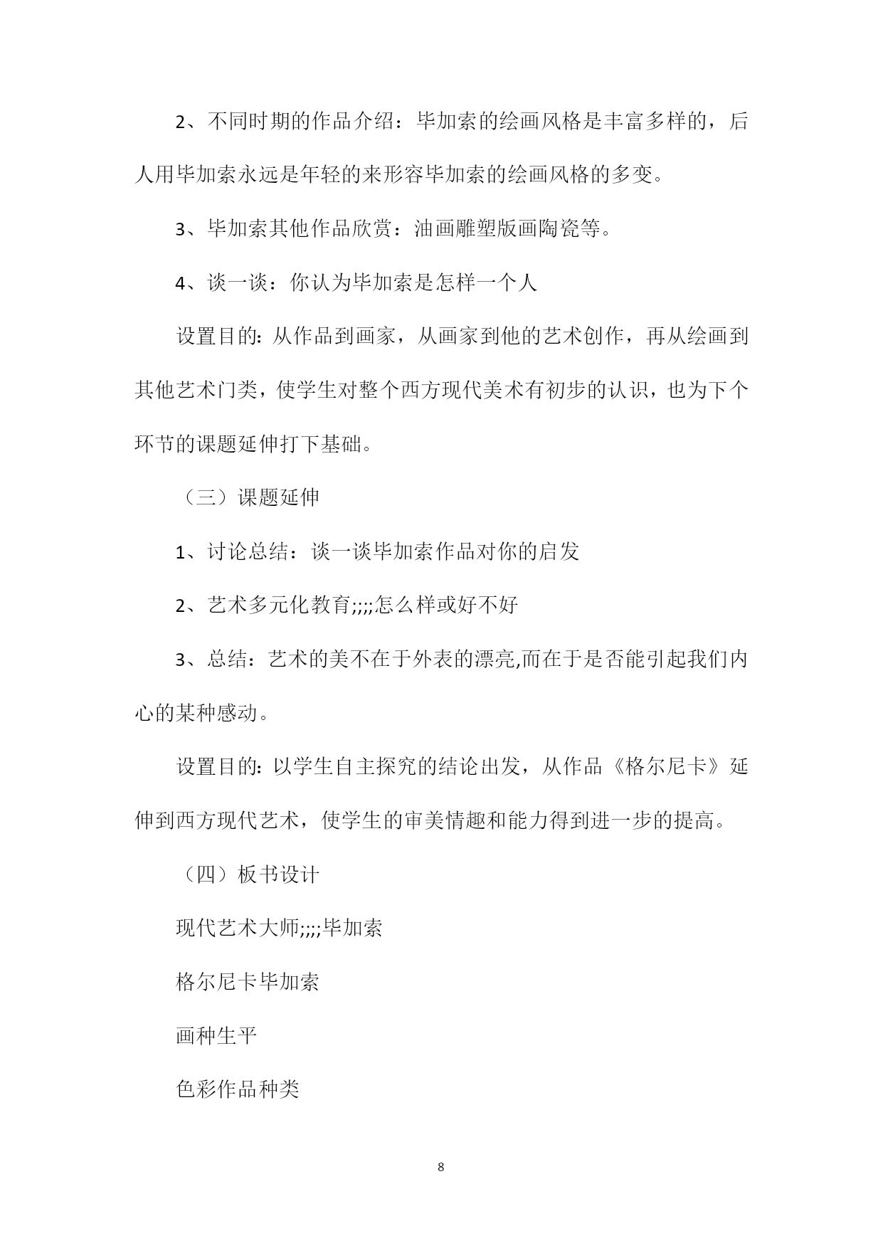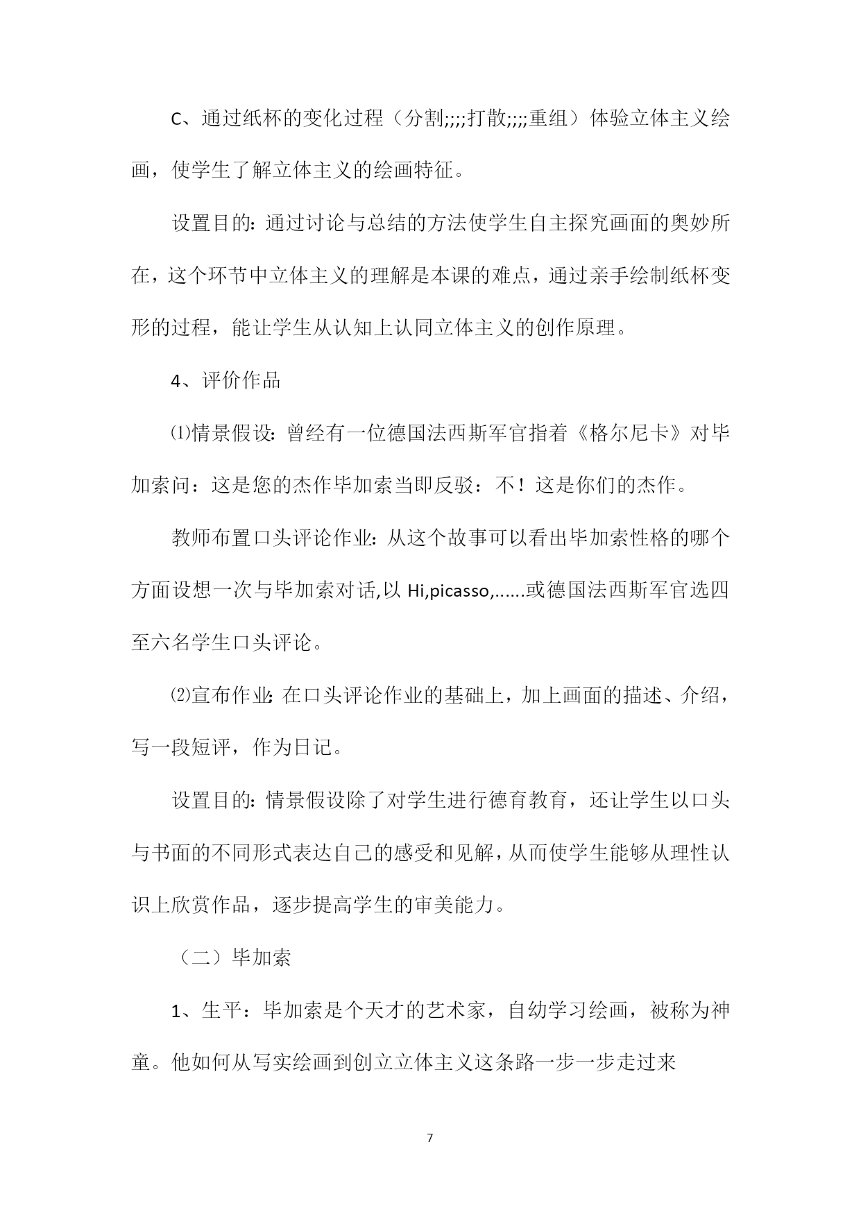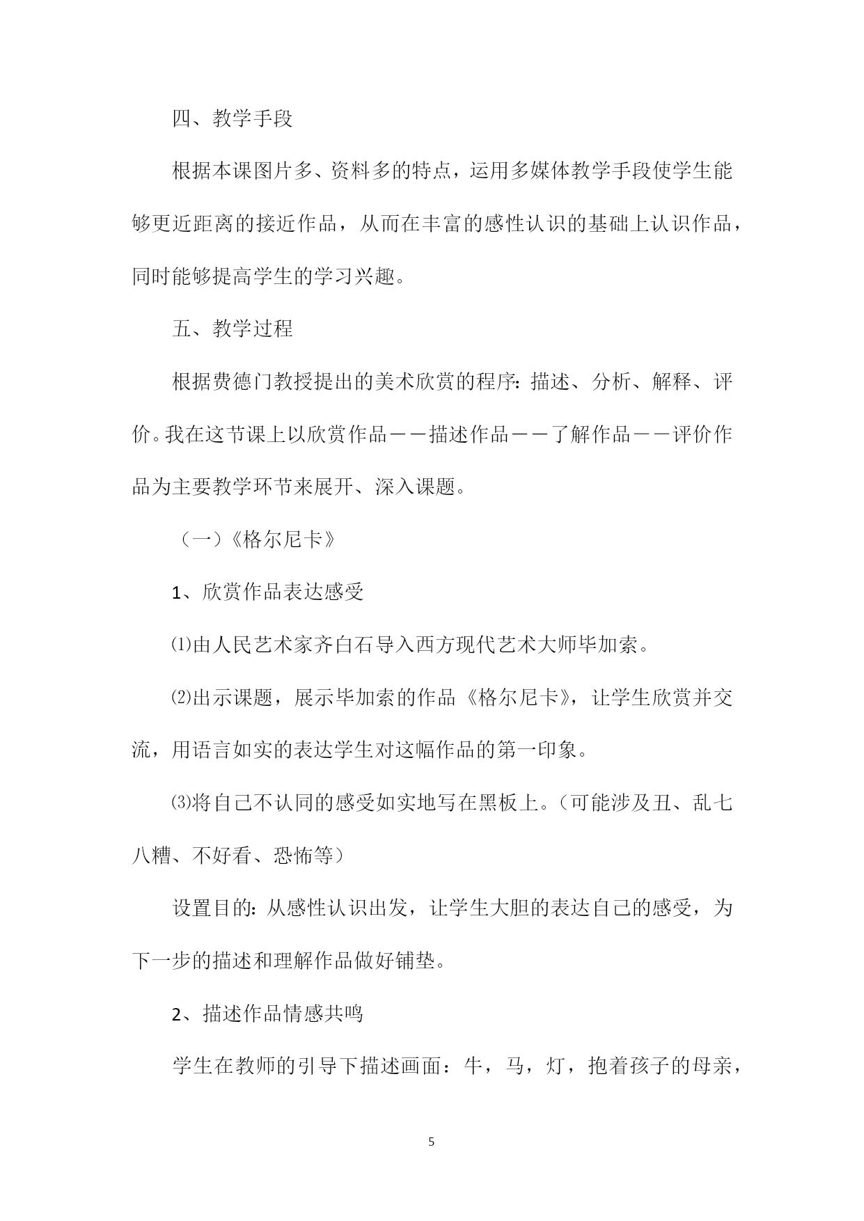 PAGEPAGE9《蚕姑娘》教学设计我说课的内容是人民美术出版社教材第13册中的第七课《现代艺术大师毕加索;;;;毕加索》一课。下面,我着重从教材分析、教学方法、学法指导、教学手段、教学过程五个方面来谈谈我对本课的教学设计。一、教材分析1、内容、地位、作用本课是知识传授与欣赏评述融为一体的综合课,主要是通过对毕加索生平事迹的介绍和作品欣赏,使学生理解毕加索的艺术主张、艺术表现形式和特点。在对西方现代艺术多元化大背景的了解下,重点突出毕加索的立体主义。本课将以油画图片欣赏和学生的分析回答为主线,教科书的引导讲解为辅,让学生感受美的同时向他们提供美术欣赏的学习方法,提高学生的学习兴趣和欣赏水平。2、教学目标根据《美术教学大纲》和教材的要求,本着提高学生艺术感知能力和审美辨别能力,使学生了解西方现代艺术思路,确定本课的教学目标为:①.知识目标:以画家毕加索的作品《格尔尼卡》为突破口,多角度欣赏西方现代绘画的艺术表现形式和内容特点。②.能力目标:开拓学生的审美视野,逐步提高学生的视觉感受能力,掌握运用语言和文字表达自己的感受和认识的基本方法。③.情感目标:培养学生热爱和平以及对世界多元文化宽容和尊重的情感。设置目的:通过对《格尔尼卡》这副作品的赏析,增长艺术知识,陶冶审美情操,提高学生对西方现代绘画作品的欣赏能力。3、教学重点、难点重点:欣赏毕加索的作品《格尔尼卡》,感受西方现代艺术,使学生从艺术形式和现实意义上认识《格尔尼卡》的价值,并以此培养学生对世界多元文化宽容和尊重的情感。难点:通过本节课的学习活动,提高学生对西方现代绘画的理解能力和欣赏水平,尤其对于现代绘画中的立体主义是学生理解上最难掌握的。设置目的:鉴于《格尔尼卡》这幅作品在西方现代绘画中的重要地位,故而能够做到使学生能够真正了解这幅作品也就等于在他们面前打开了一扇走进西方现代艺术的大门,所以本课的重点和难点都在这幅作品里。二、教法运用教师作为教学过程的主导者,根据教材选择合理有效的教学方法十分重要。合理有效的教学方法不仅能吸引学生的注意力、激发学生的学习兴趣,而且能使教学达到事半功倍的效果。为顺利实现教学目标,以实例为线索,充分动用教具,不断采用欣赏,启发、归纳相结合的教学方法。在实例的引导下,调动学生的积极性和自觉性,由感性认识上升到理性认识,使每个学生都能参加到动脑的积极思维中,真正做到面向全体。做法如下:1、情境再现法在本课教学中,由于欣赏的绘画内容与形式比较难以理解,如果像传统的欣赏课老师讲学生听的方式这样的方式进行讲解,可能会造成学生学习兴趣缺乏,所以我运用了多次的情景模拟和再现,使学生能够在这样形象生动的过程中感受作品,在情感上达到和作品的共鸣。2、德育渗透法教育部副部长王湛在《建立具有中国特色的基础教育课程体系》一文中指出各门课程之间要结合自身特点,对学生渗透德育教育。所以我在本课中,在欣赏作品的同时运用德育渗透的方法对学生进行和平主义的思德教育。三、学法指导我国著名教育家叶圣陶曾说过:教师教任何功课,lsquo;讲rsquo;都是为了达到用不着lsquo;讲rsquo;,lsquo;教rsquo;都是为了达到用不着lsquo;教rsquo;。叶圣陶的这一句话一针见血的指出了教师的重要任务不仅要让学生通过学习掌握知识,更重要的是要让学生掌握学习的方法。因此,对于学生的学法指导在教学中显得尤其重要。我的做法是:1、自主探究学习法霍姆林斯基说过:在人的心灵深处都有一种根深蒂固的需要,这就是希望自己是一个发现者、研究者、探索者。而在儿童的精神世界中,这种需要特别强烈。因此,在教学中,我运用探究式学习方法培养学生自主学习能力,训练学生发现问题、解决问题的能力。本课充分体现了教为主导,学为主体,学生在教师的引导下以讨论;;;;总结,再讨论;;;;再总结的方式对作品进行赏析。2、合作交流法学习活动中,让学生通过相互交流,大胆表达自己的想法与见解,目的是给学生之间提供不同的学习对象,听取不同的看法,分享彼此的经验,拓宽学生思路,达成教学目标。四、教学手段根据本课图片多、资料多的特点,运用多媒体教学手段使学生能够更近距离的接近作品,从而在丰富的感性认识的基础上认识作品,同时能够提高学生的学习兴趣。五、教学过程根据费德门教授提出的美术欣赏的程序:描述、分析、解释、评价。我在这节课上以欣赏作品――描述作品――了解作品--评价作品为主要教学环节来展开、深入课题。(一)《格尔尼卡》1、欣赏作品表达感受⑴由人民艺术家齐白石导入西方现代艺术大师毕加索。⑵出示课题,展示毕加索的作品《格尔尼卡》,让学生欣赏并交流,用语言如实的表达学生对这幅作品的第一印象。⑶将自己不认同的感受如实