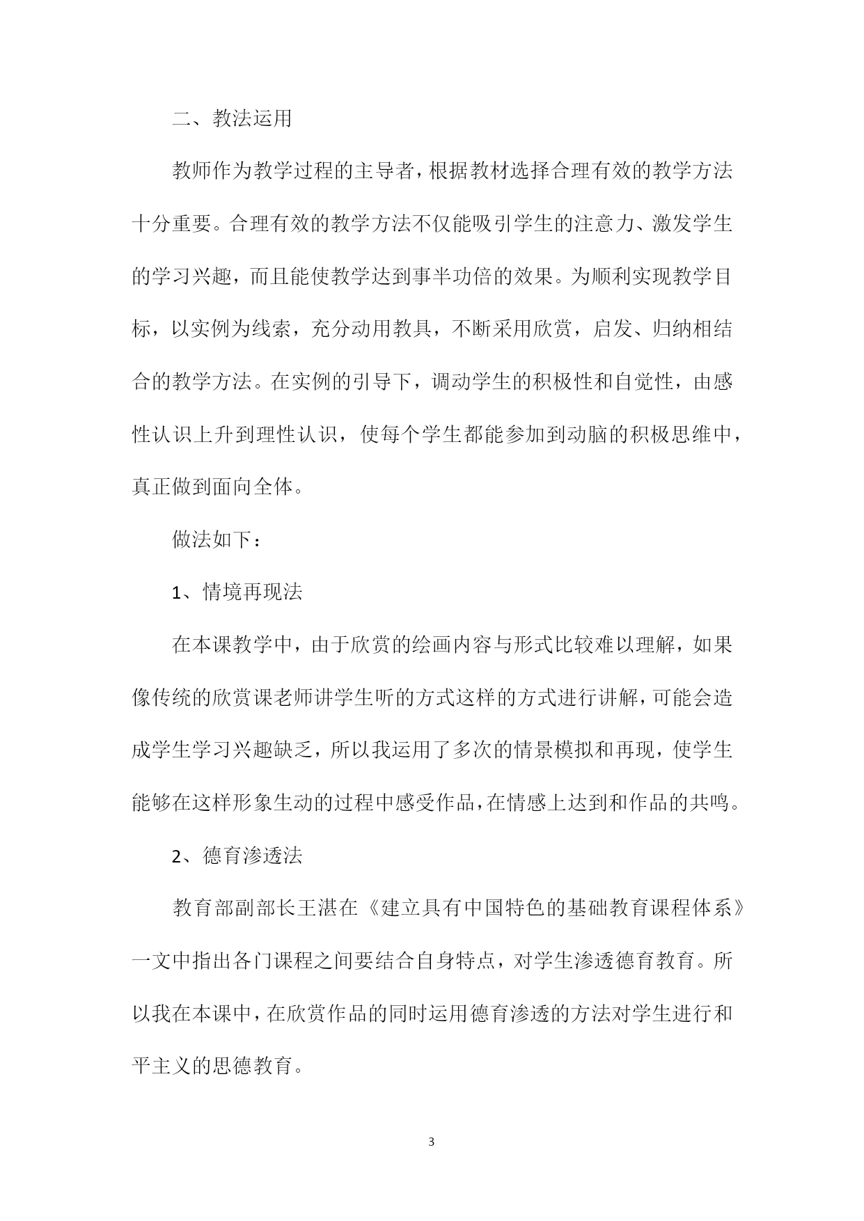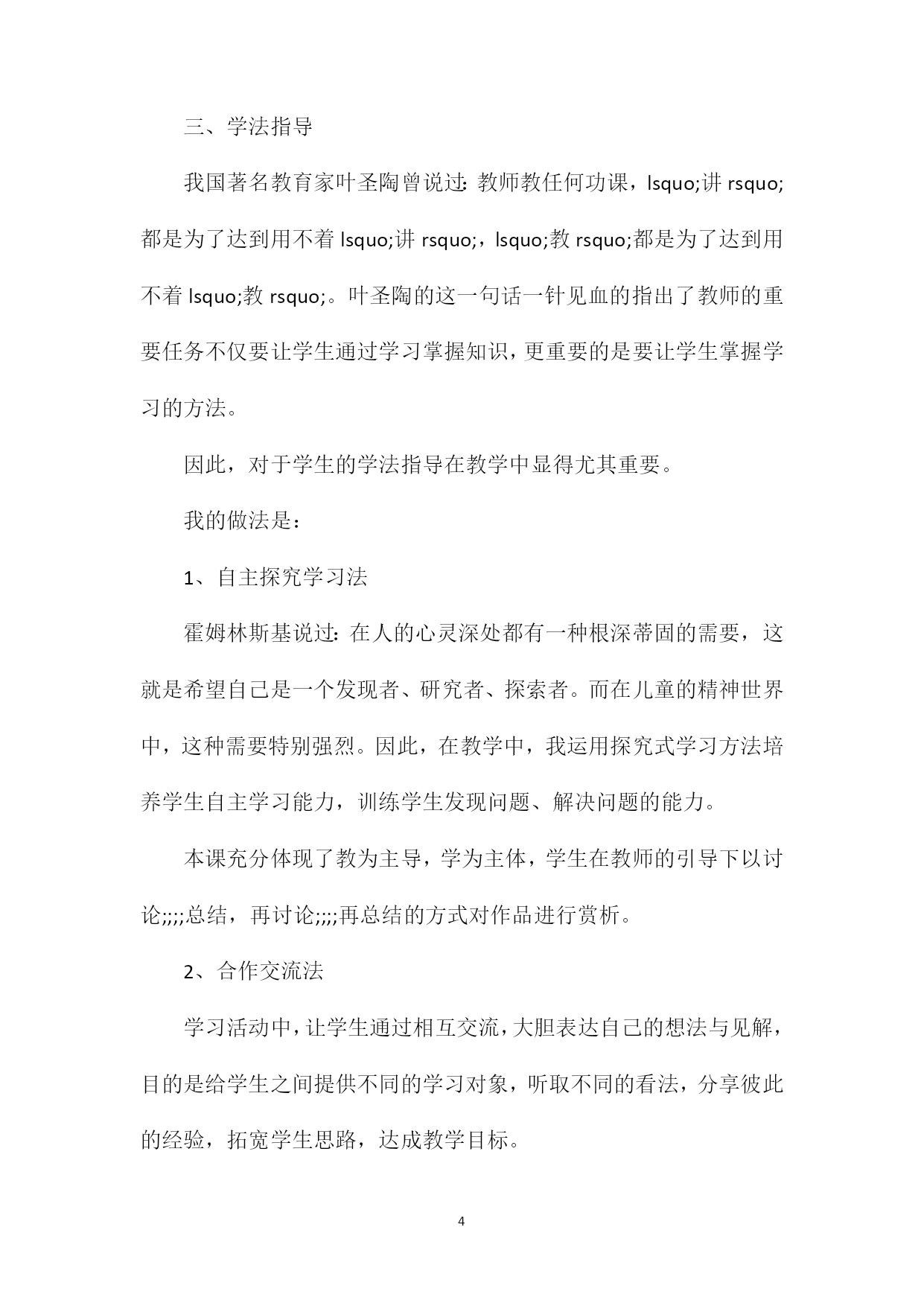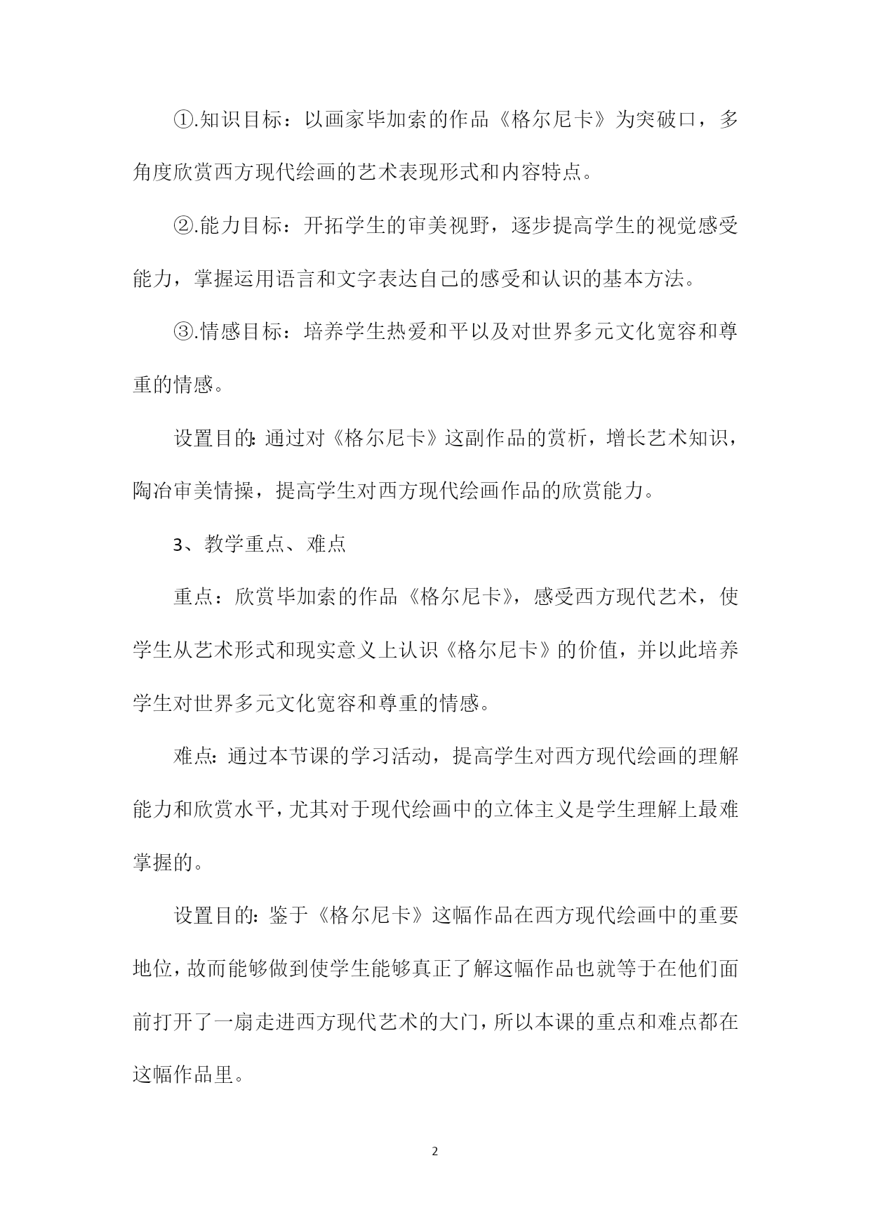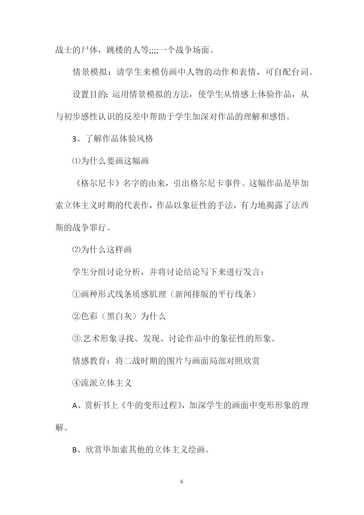 PAGEPAGE9《蚕姑娘》教学设计我说课的内容是人民美术出版社教材第13册中的第七课《现代艺术大师毕加索;;;;毕加索》一课。下面,我着重从教材分析、教学方法、学法指导、教学手段、教学过程五个方面来谈谈我对本课的教学设计。一、教材分析1、内容、地位、作用本课是知识传授与欣赏评述融为一体的综合课,主要是通过对毕加索生平事迹的介绍和作品欣赏,使学生理解毕加索的艺术主张、艺术表现形式和特点。在对西方现代艺术多元化大背景的了解下,重点突出毕加索的立体主义。本课将以油画图片欣赏和学生的分析回答为主线,教科书的引导讲解为辅,让学生感受美的同时向他们提供美术欣赏的学习方法,提高学生的学习兴趣和欣赏水平。2、教学目标根据《美术教学大纲》和教材的要求,本着提高学生艺术感知能力和审美辨别能力,使学生了解西方现代艺术思路,确定本课的教学目标为:①.知识目标:以画家毕加索的作品《格尔尼卡》为突破口,多角度欣赏西方现代绘画的艺术表现形式和内容特点。②.能力目标:开拓学生的审美视野,逐步提高学生的视觉感受能力,掌握运用语言和文字表达自己的感受和认识的基本方法。③.情感目标:培养学生热爱和平以及对世界多元文化宽容和尊重的情感。设置目的:通过对《格尔尼卡》这副作品的赏析,增长艺术知识,陶冶审美情操,提高学生对西方现代绘画作品的欣赏能力。3、教学重点、难点重点:欣赏毕加索的作品《格尔尼卡》,感受西方现代艺术,使学生从艺术形式和现实意义上认识《格尔尼卡》的价值,并以此培养学生对世界多元文化宽容和尊重的情感。难点:通过本节课的学习活动,提高学生对西方现代绘画的理解能力和欣赏水平,尤其对于现代绘画中的立体主义是学生理解上最难掌握的。设置目的:鉴于《格尔尼卡》这幅作品在西方现代绘画中的重要地位,故而能够做到使学生能够真正了解这幅作品也就等于在他们面前打开了一扇走进西方现代艺术的大门,所以本课的重点和难点都在这幅作品里。二、教法运用教师作为教学过程的主导者,根据教材选择合理有效的教学方法十分重要。合理有效的教学方法不仅能吸引学生的注意力、激发学生的学习兴趣,而且能使教学达到事半功倍的效果。为顺利实现教学目标,以实例为线索,充分动用教具,不断采用欣赏,启发、归纳相结合的教学方法。在实例的引导下,调动学生的积极性和自觉性,由感性认识上升到理性认识,使每个学生都能参加到动脑的积极思维中,真正做到面向全体。做法如下:1、情境再现法在本课教学中,由于欣赏的绘画内容与形式比较难以理解,如果像传统的欣赏课老师讲学生听的方式这样的方式进行讲解,可能会造成学生学习兴趣缺乏,所以我运用了多次的情景模拟和再现,使学生能够在这样形象生动的过程中感受作品,在情感上达到和作品的共鸣。2、德育渗透法教育部副部长王湛在《建立具有中国特色的基础教育课程体系》一文中指出各门课程之间要结合自身特点,对学生渗透德育教育。所以我在本课中,在欣赏作品的同时运用德育渗透的方法对学生进行和平主义的思德教育。三、学法指导我国著名教育家叶圣陶曾说过:教师教任何功课,lsquo;讲rsquo;都是为了达到用不着lsquo;讲rsquo;,lsquo;教rsquo;都是为了达到用不着lsquo;教rsquo;。叶圣陶的这一句话一针见血的指出了教师的重要任务不仅要让学生通过学习掌握知识,更重要的是要让学生掌握学习的方法。因此,对于学生的学法指导在教学中显得尤其重要。我的做法是:1、自主探究学习法霍姆林斯基说过:在人的心灵深处都有一种根深蒂固的需要,这就是希望自己是一个发现者、研究者、探索者。而在儿童的精神世界中,这种需要特别强烈。因此,在教学中,我运用探究式学习方法培养学生自主学习能力,训练学生发现问题、解决问题的能力。本课充分体现了教为主导,学为主体,学生在教师的引导下以讨论;;;;总结,再讨论;;;;再总结的方式对作品进行赏析。2、合作交流法学习活动中,让学生通过相互交流,大胆表达自己的想法与见解,目的是给学生之间提供不同的学习对象,听取不同的看法,分享彼此的经验,拓宽学生思路,达成教学目标。四、教学手段根据本课图片多、资料多的特点,运用多媒体教学手段使学生能够更近距离的接近作品,从而在丰富的感性认识的基础上认识作品,同时能够提高学生的学习兴趣。五、教学过程根据费德门教授提出的美术欣赏的程序:描述、分析、解释、评价。我在这节课上以欣赏作品――描述作品――了解作品--评价作品为主要教学环节来展开、深入课题。(一)《格尔尼卡》1、欣赏作品表达感受⑴由人民艺术家齐白石导入西方现代艺术大师毕加索。⑵出示课题,展示毕加索的作品《格尔尼卡》,让学生欣赏并交流,用语言如实的表达学生对这幅作品的第一印象。⑶将自己不认同的感受如实