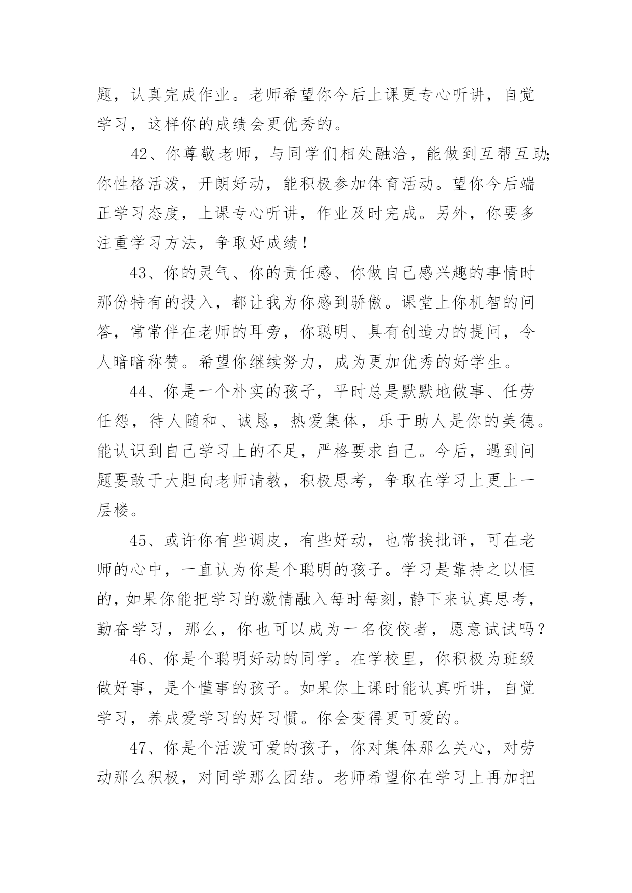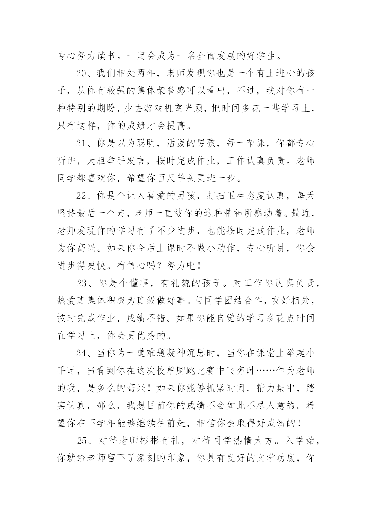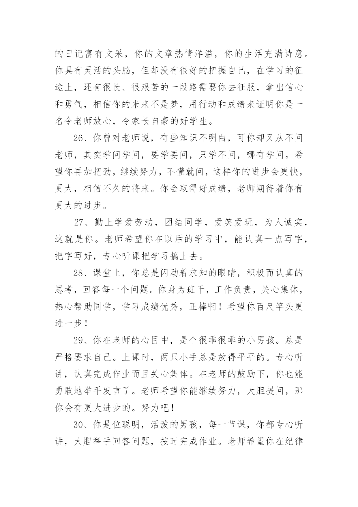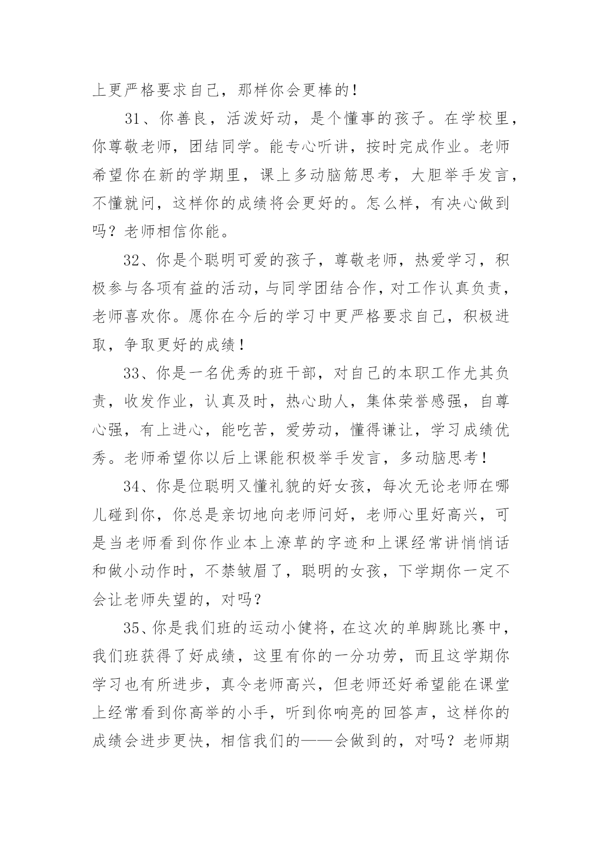 期末教师评语期末教师评语无论是在学校还是在社会中,大家都写过评语,肯定对各类评语都很熟悉吧,评语于细微之处肯定被评价对象的进步,鼓励其自信。那么你有真正了解过评语吗?下面是小编为大家收集的期末教师评语,仅供参考,大家一起来看看吧。期末教师评语11、你其实很聪明,这学期,老师很高兴看到你不再那么贪吃,校门口的小摊前没有你的身影了。如果你上课能专心听讲、独立完成作业、有错及时改正,相信你会进步的。老师期待着你的进步。2、你是一个勤劳,善良的孩子,老师很喜欢你。只要你能找到适合于自己的学习方法,相信你会进步的。老师希望你加油,赶上来。3、你为人诚实,是一个活泼可爱的好孩子。你能遵守课堂纪律,按时完成作业,字迹工整。今后上课若能积极发言,多开动脑筋,做一个勤奋好学、踏实上进的好学生,这样老师和同学会更加喜欢你!4、你听说过这样一句话吗?“天下无难事,只怕有心人”相信只要你也向班上其他同学一样勤奋学习,你的成绩一定会进步的,你有信心做到吗?老师期待着你的进步。5、你是个性格极其内向的孩子。你并不比别人差,只因你老是闭着嘴不说话。为什么总是那么胆小?缺乏自信,你已失掉了不少成功的机会。老师希望你以后大胆些,主动些,你会进步的,能做到吗?6、你性格活泼开朗,尊敬老师,团结同学,待人有礼,自觉遵守校规校纪,爱好体育锻炼。学习上你有一定自觉性,但我总觉得你上课注意力少集中。希望你严格要求自己,能坚定信心,持之以恒,有迎难而上的勇气,不断改进学习方法,争取学习成绩有突破。7、你为人正直诚恳,尊敬老师,团结同学,关心班集体,待人有礼,作业认真,书写工整,如能更加大胆一点就更好了。希望你今后不断充实和完善自己,多向优秀的同学学习,取长补短,争取在学习上跃上一个新台阶。8、你聪明伶俐,思维敏捷,优美的文字令老师赞叹!同学们也羡慕你。但不知为什么,你的心里似乎找不对集体的位置。似乎总有同学来打你的“小报告”。并且,老师很难在你身上找到那样那我们每个同学都相当重要的东西——上进心。假如你能纠正你的这些不良态度,老师相信,你将是最棒的!努力吧!9、你是一位天真活泼可爱的孩子,可是不知道为什么,每次你都会玩得忘了时间,上下课、放学后都一样。每当老师看到你那双充满了表现欲的眼睛,总不免替你感到惋惜,只要你上课认真听讲,回家认真完成作业,老师相信,你一定能够在老师面前表现出一个完美的你!加油吧!10、你是一个聪明机灵的小男孩,只是课堂上自由散漫,从不完成作业,字迹潦草,成绩不理想,老师知道你并不愚笨,只是对学习缺少信心。贪玩占用了你很多时间,爱玩虽不是缺点,可是贪玩却会影响你的进步。希望你在学习上多下点功夫。我相信你定能取得好成绩,你说对吗?11、每当看到你那着扫帚在教室里忙碌的身影我总是看在眼里,喜在心里,多好的学生!——,你的学习基础是差了一些,但你不要有太多压力,不必提心吊胆,也不要灰心,“世上无难事,只怕有心人”,只要你学习专心些、勤奋些、细心些,不懂就问。你的成绩会赶上来的。自信些,老师、家长、同学都在关心你、支持你!等你的好消息噢!12、遇见老师,你能主动问好,和同学你能和睦相处。课堂上,有时你也能专心听讲,积极举手回答问题,按时完成作业。老师希望你能坚持听好每一节课,争做一名优秀的学生。13、你是个懂事有礼貌的孩子,在学校里,你尊敬老师团结同学,积极为班级做好事。希望你在今后的学习中专心听讲,自觉遵守纪律,认真学习争取更好的成绩。14、你是个聪明、直爽的女孩,上课发言积极,对待他人热情友好,但也常常不自觉地流露出一些小毛病:课堂上的心不在焉、学习上的平平淡淡。每当看到你作业的质量有了显著的提高,老师就为你感到高兴。愿你扬长避短,勤奋学习,争做全面发展的好学生!15、你在老师的心目中,是个很乖很乖的小男孩。总是严格要求自己。上课时,两只小手总是放得平平的。专心听讲,认真完成作业且热爱公物。在老师的鼓励下,你的发言也积极了。但最近,你染上了个坏习惯,那就是粗心。老师希望你把它扔掉,你能做到吗?做一个让老师更喜欢的学生,努力吧!16、黑亮的眼睛,透射出你的机灵;你喜欢开动脑筋思考问题,有一定的分析能力。你尊敬老师,团结同学,关心班集体,待人有礼,能认真听从老师的教导,有较强的集体荣誉感。如果你能在学习上下苦功夫,多思多问,你的成绩一定会突飞猛进!17、一开学老师就发现你的作业干净又整齐,你的字清秀又漂亮,看你的作业真是一种享受。你做事认真,责任心强,关心集体,任劳任怨,是老师的得力助手。运动场上更有你矫健的身姿,为班级增添了荣誉。天才出自勤奋,希望你在新学期里严格要求自己,你的聪明加上勤奋好学令你不断成功。18、老师真为你高兴,因为这个学期里,你懂事了许多。比以前守纪律了,爱学习了,老师渴望看见你端端正正坐在教室里自觉学习的身影啊,你能做到吗?19、见