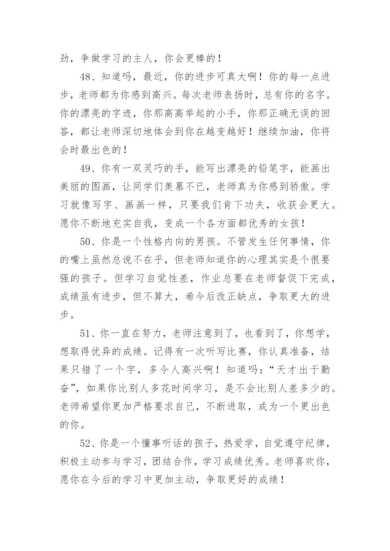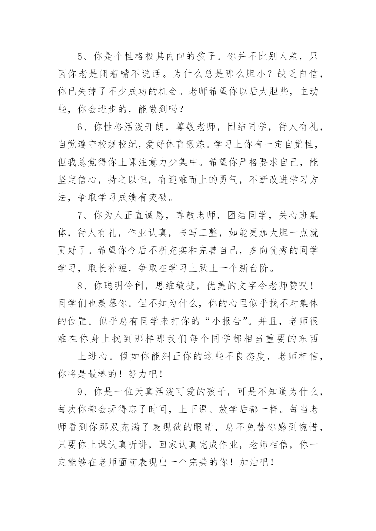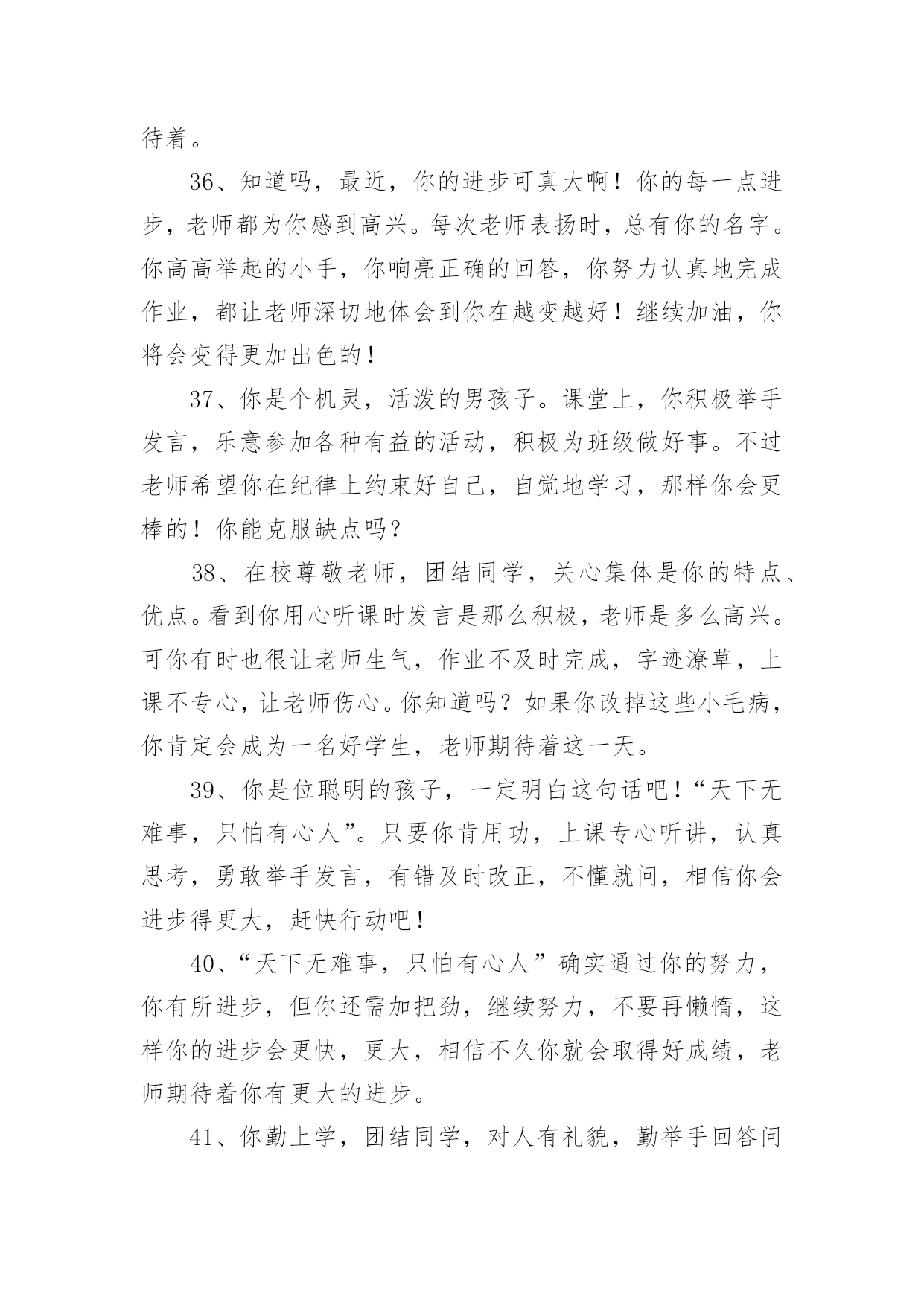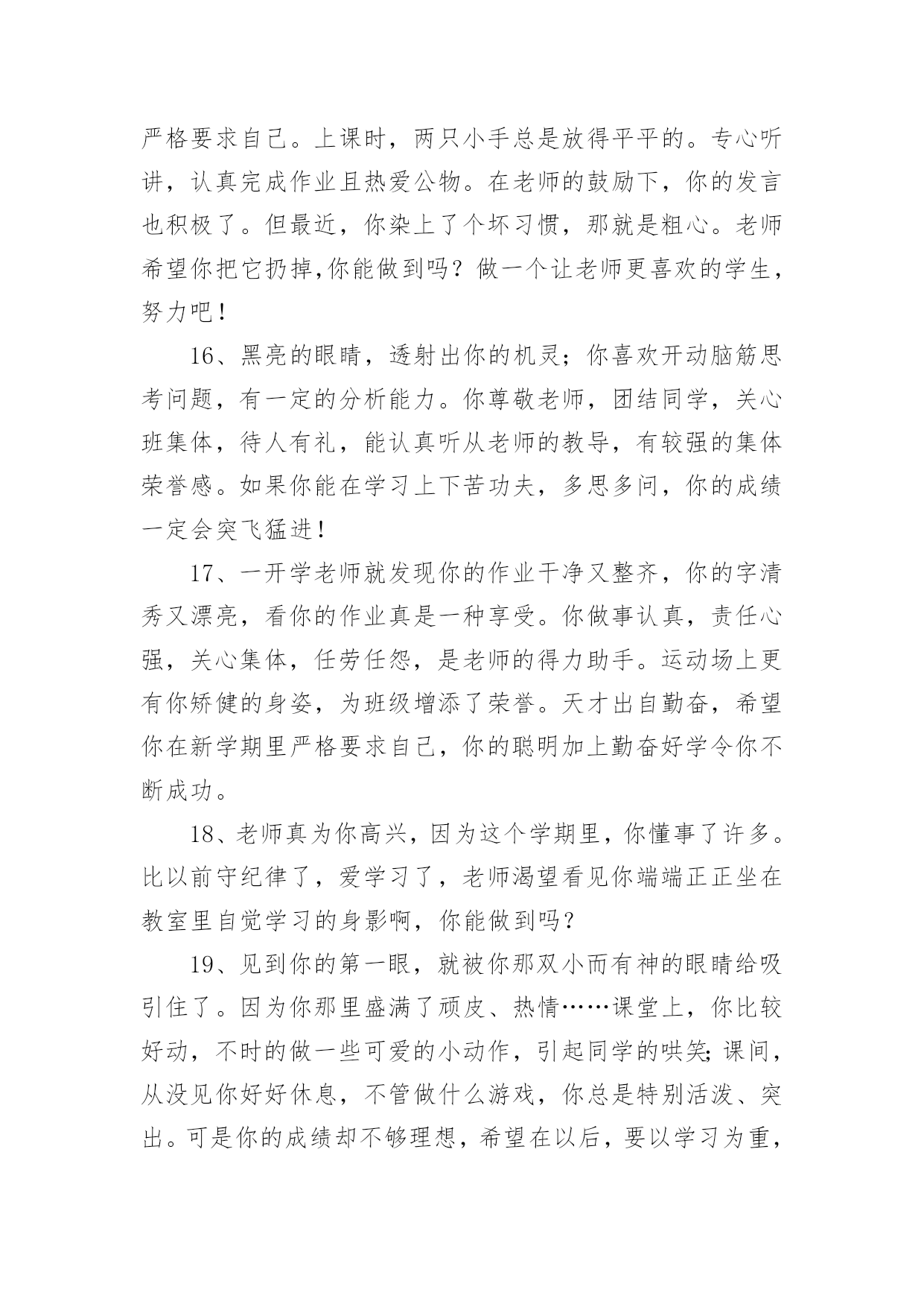 期末教师评语期末教师评语无论是在学校还是在社会中,大家都写过评语,肯定对各类评语都很熟悉吧,评语于细微之处肯定被评价对象的进步,鼓励其自信。那么你有真正了解过评语吗?下面是小编为大家收集的期末教师评语,仅供参考,大家一起来看看吧。期末教师评语11、你其实很聪明,这学期,老师很高兴看到你不再那么贪吃,校门口的小摊前没有你的身影了。如果你上课能专心听讲、独立完成作业、有错及时改正,相信你会进步的。老师期待着你的进步。2、你是一个勤劳,善良的孩子,老师很喜欢你。只要你能找到适合于自己的学习方法,相信你会进步的。老师希望你加油,赶上来。3、你为人诚实,是一个活泼可爱的好孩子。你能遵守课堂纪律,按时完成作业,字迹工整。今后上课若能积极发言,多开动脑筋,做一个勤奋好学、踏实上进的好学生,这样老师和同学会更加喜欢你!4、你听说过这样一句话吗?“天下无难事,只怕有心人”相信只要你也向班上其他同学一样勤奋学习,你的成绩一定会进步的,你有信心做到吗?老师期待着你的进步。5、你是个性格极其内向的孩子。你并不比别人差,只因你老是闭着嘴不说话。为什么总是那么胆小?缺乏自信,你已失掉了不少成功的机会。老师希望你以后大胆些,主动些,你会进步的,能做到吗?6、你性格活泼开朗,尊敬老师,团结同学,待人有礼,自觉遵守校规校纪,爱好体育锻炼。学习上你有一定自觉性,但我总觉得你上课注意力少集中。希望你严格要求自己,能坚定信心,持之以恒,有迎难而上的勇气,不断改进学习方法,争取学习成绩有突破。7、你为人正直诚恳,尊敬老师,团结同学,关心班集体,待人有礼,作业认真,书写工整,如能更加大胆一点就更好了。希望你今后不断充实和完善自己,多向优秀的同学学习,取长补短,争取在学习上跃上一个新台阶。8、你聪明伶俐,思维敏捷,优美的文字令老师赞叹!同学们也羡慕你。但不知为什么,你的心里似乎找不对集体的位置。似乎总有同学来打你的“小报告”。并且,老师很难在你身上找到那样那我们每个同学都相当重要的东西——上进心。假如你能纠正你的这些不良态度,老师相信,你将是最棒的!努力吧!9、你是一位天真活泼可爱的孩子,可是不知道为什么,每次你都会玩得忘了时间,上下课、放学后都一样。每当老师看到你那双充满了表现欲的眼睛,总不免替你感到惋惜,只要你上课认真听讲,回家认真完成作业,老师相信,你一定能够在老师面前表现出一个完美的你!加油吧!10、你是一个聪明机灵的小男孩,只是课堂上自由散漫,从不完成作业,字迹潦草,成绩不理想,老师知道你并不愚笨,只是对学习缺少信心。贪玩占用了你很多时间,爱玩虽不是缺点,可是贪玩却会影响你的进步。希望你在学习上多下点功夫。我相信你定能取得好成绩,你说对吗?11、每当看到你那着扫帚在教室里忙碌的身影我总是看在眼里,喜在心里,多好的学生!——,你的学习基础是差了一些,但你不要有太多压力,不必提心吊胆,也不要灰心,“世上无难事,只怕有心人”,只要你学习专心些、勤奋些、细心些,不懂就问。你的成绩会赶上来的。自信些,老师、家长、同学都在关心你、支持你!等你的好消息噢!12、遇见老师,你能主动问好,和同学你能和睦相处。课堂上,有时你也能专心听讲,积极举手回答问题,按时完成作业。老师希望你能坚持听好每一节课,争做一名优秀的学生。13、你是个懂事有礼貌的孩子,在学校里,你尊敬老师团结同学,积极为班级做好事。希望你在今后的学习中专心听讲,自觉遵守纪律,认真学习争取更好的成绩。14、你是个聪明、直爽的女孩,上课发言积极,对待他人热情友好,但也常常不自觉地流露出一些小毛病:课堂上的心不在焉、学习上的平平淡淡。每当看到你作业的质量有了显著的提高,老师就为你感到高兴。愿你扬长避短,勤奋学习,争做全面发展的好学生!15、你在老师的心目中,是个很乖很乖的小男孩。总是严格要求自己。上课时,两只小手总是放得平平的。专心听讲,认真完成作业且热爱公物。在老师的鼓励下,你的发言也积极了。但最近,你染上了个坏习惯,那就是粗心。老师希望你把它扔掉,你能做到吗?做一个让老师更喜欢的学生,努力吧!16、黑亮的眼睛,透射出你的机灵;你喜欢开动脑筋思考问题,有一定的分析能力。你尊敬老师,团结同学,关心班集体,待人有礼,能认真听从老师的教导,有较强的集体荣誉感。如果你能在学习上下苦功夫,多思多问,你的成绩一定会突飞猛进!17、一开学老师就发现你的作业干净又整齐,你的字清秀又漂亮,看你的作业真是一种享受。你做事认真,责任心强,关心集体,任劳任怨,是老师的得力助手。运动场上更有你矫健的身姿,为班级增添了荣誉。天才出自勤奋,希望你在新学期里严格要求自己,你的聪明加上勤奋好学令你不断成功。18、老师真为你高兴,因为这个学期里,你懂事了许多。比以前守纪律了,爱学习了,老师渴望看见你端端正正坐在教室里自觉学习的身影啊,你能做到吗?19、见